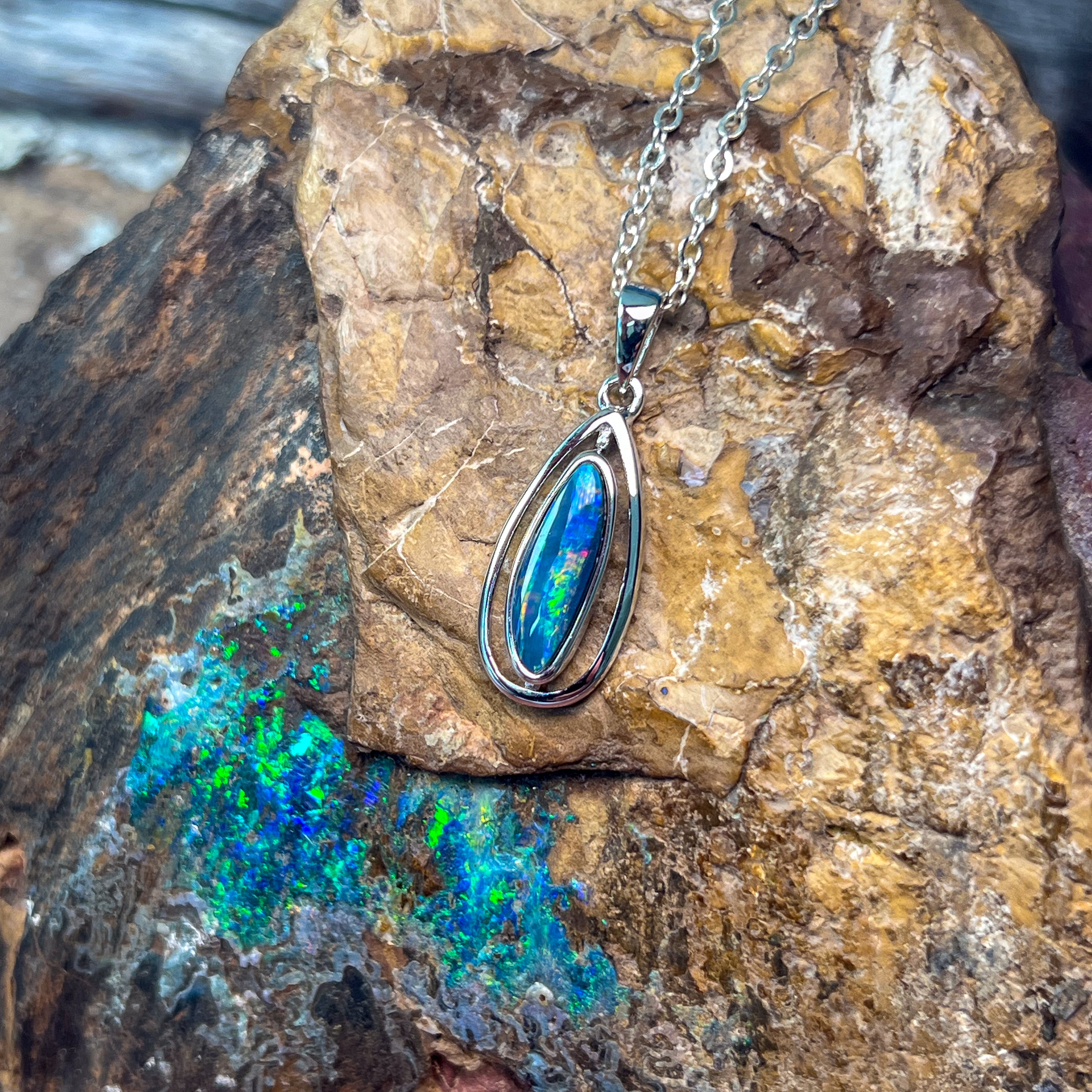 Sterling Silver Pear shape cut out design Opal doublet Blue Green pendant