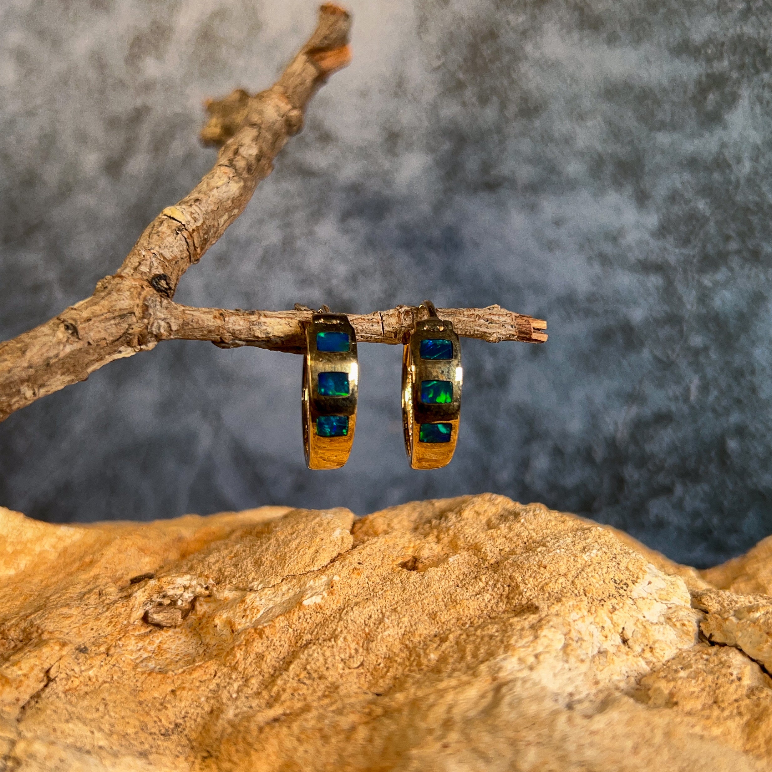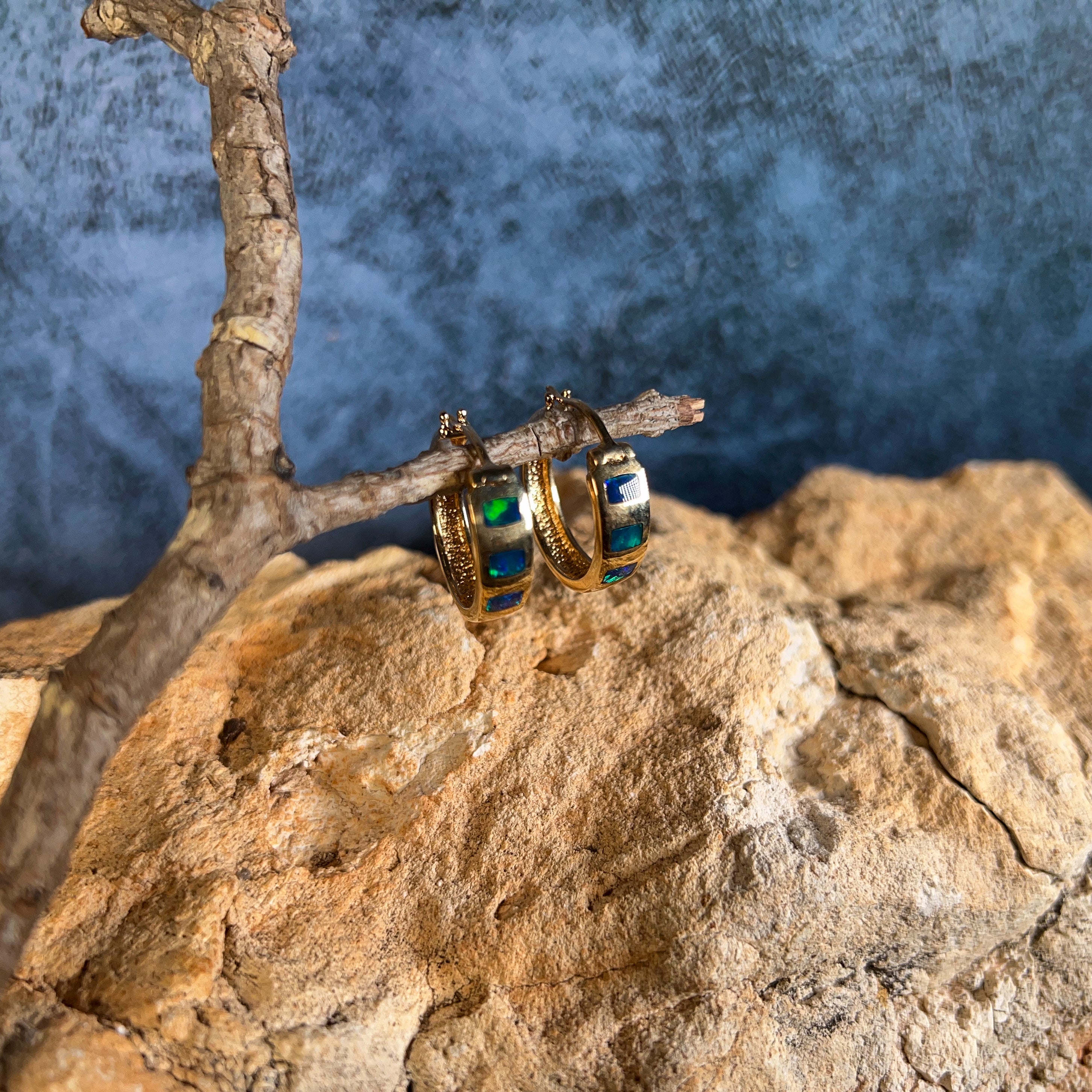 14kt Yellow Gold hoop inlay Opal earrings