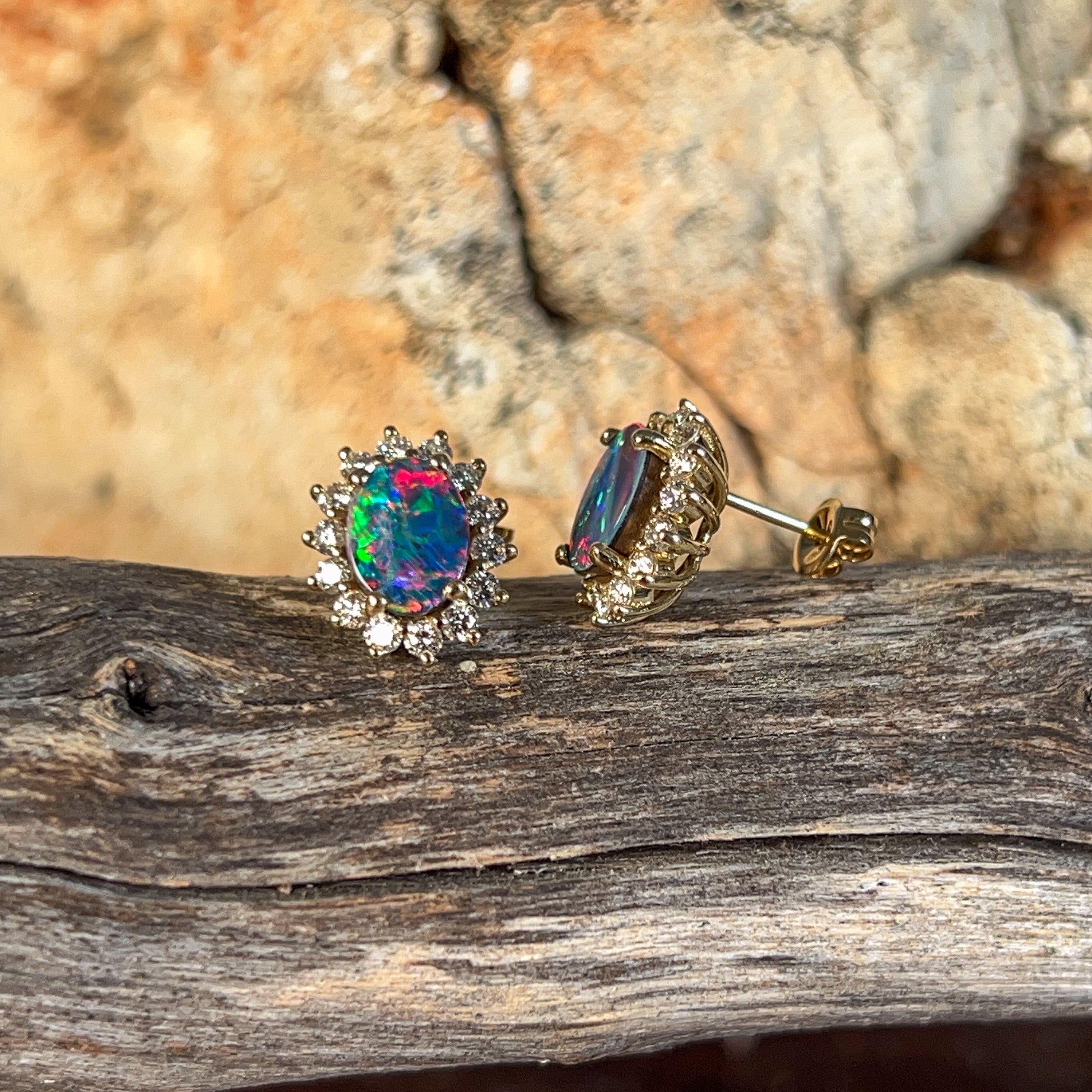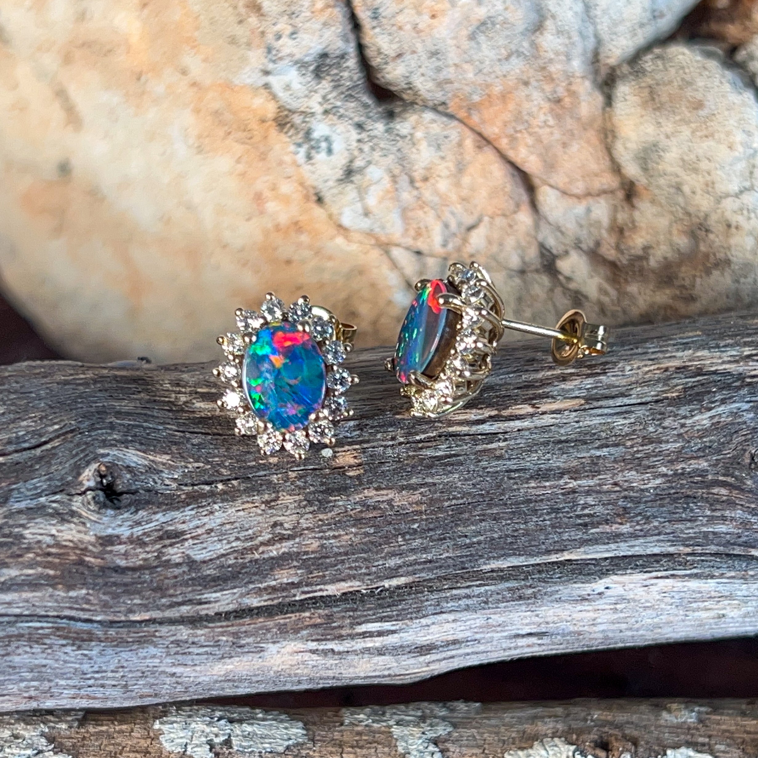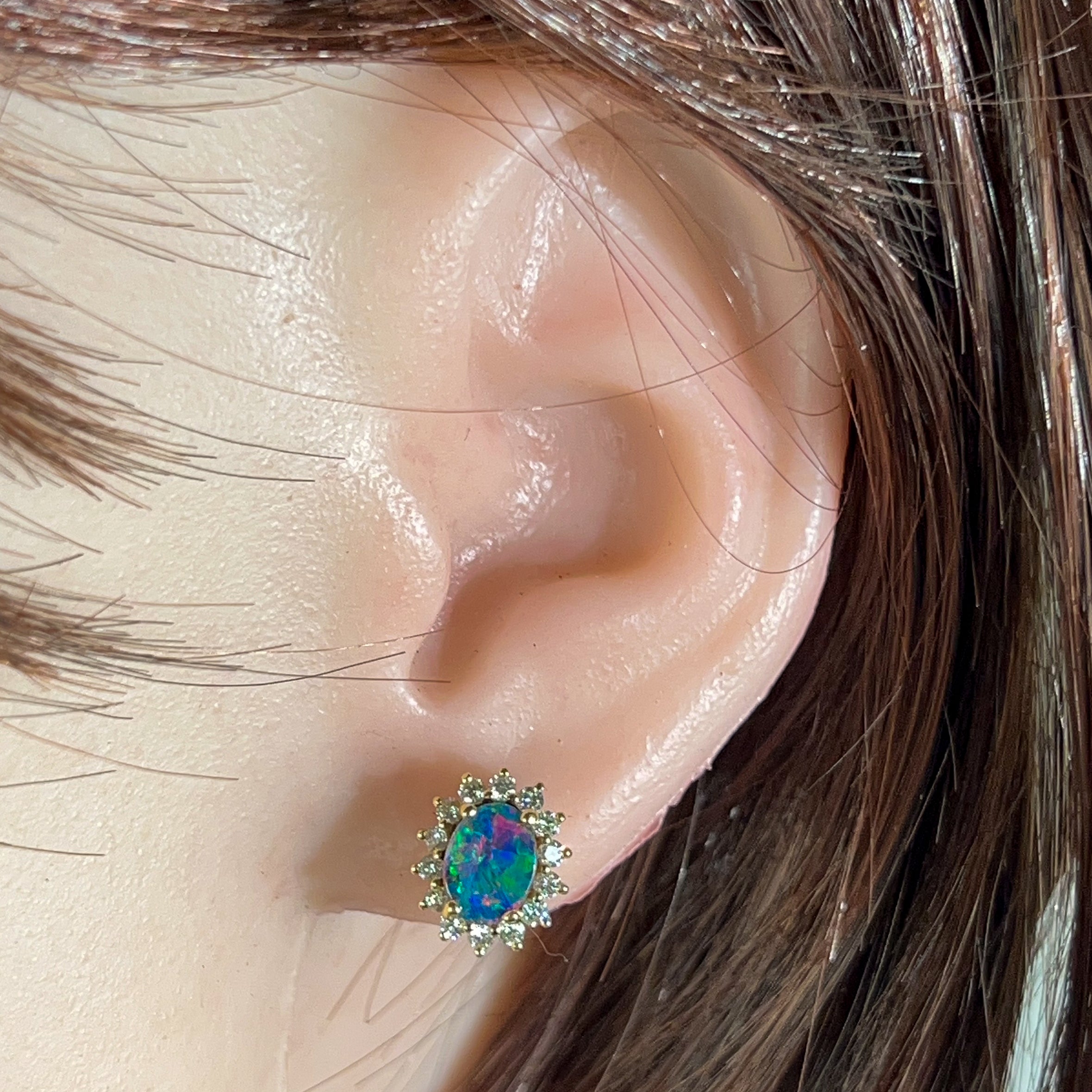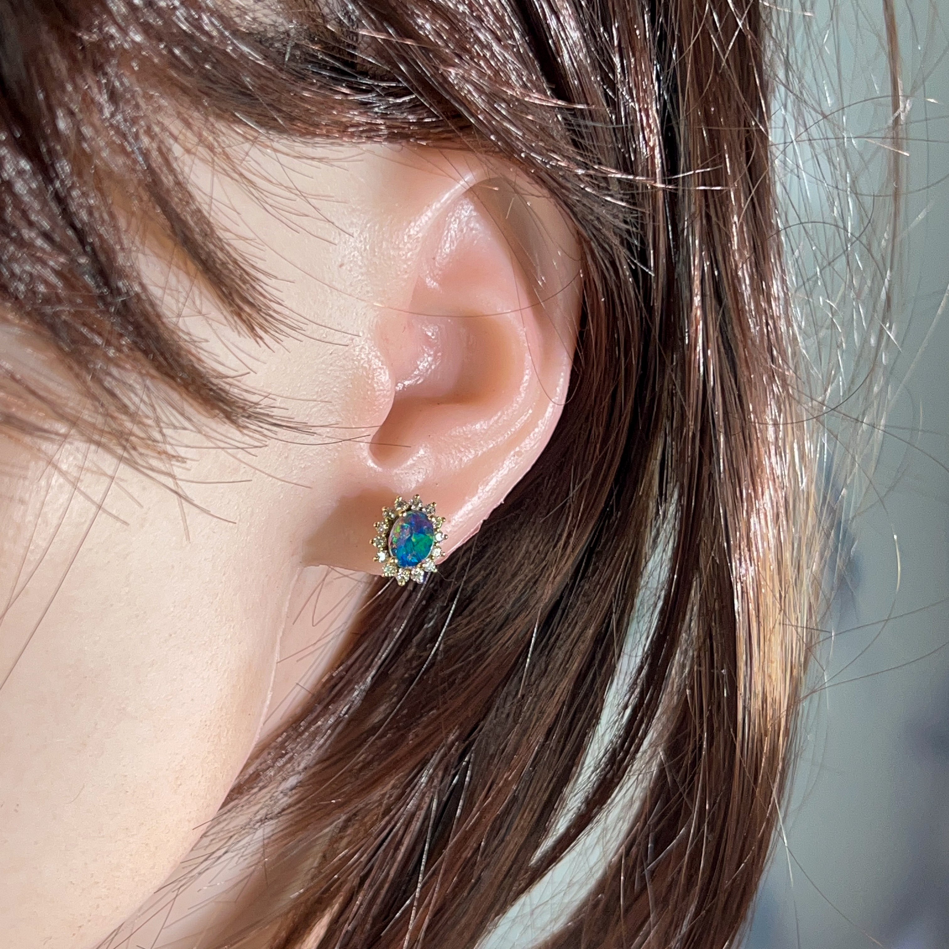 18kt Yellow Gold Opal and diamond cluster earring studs