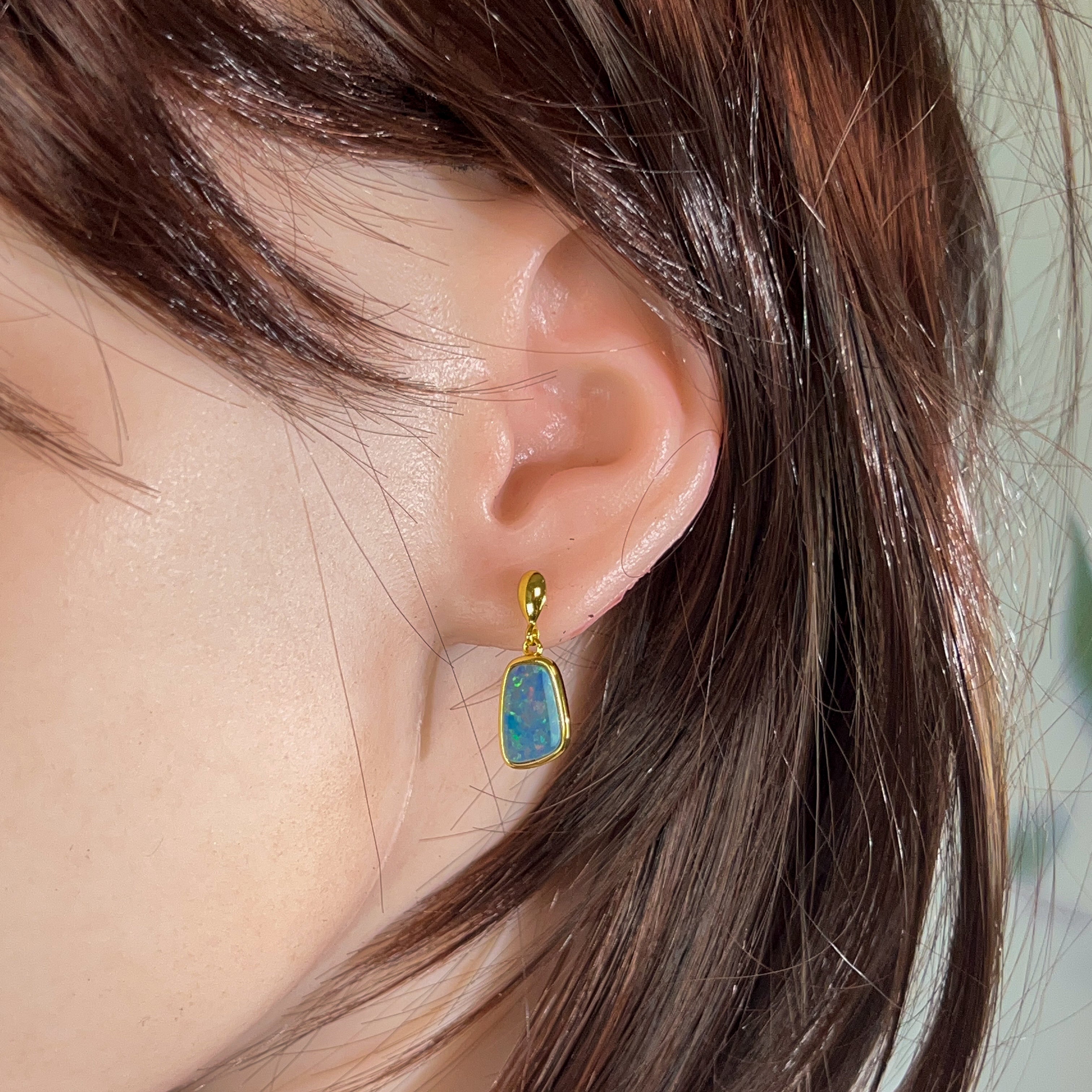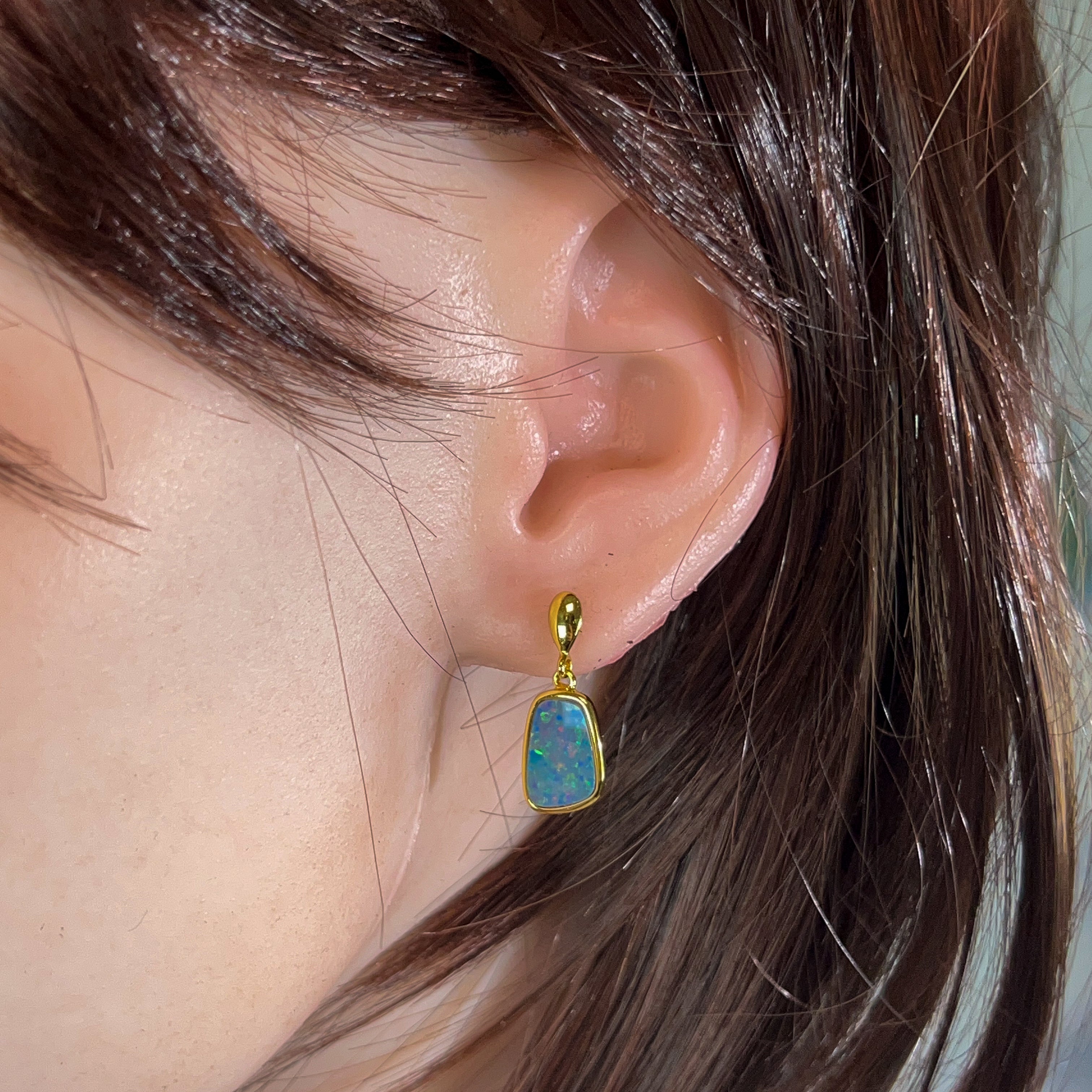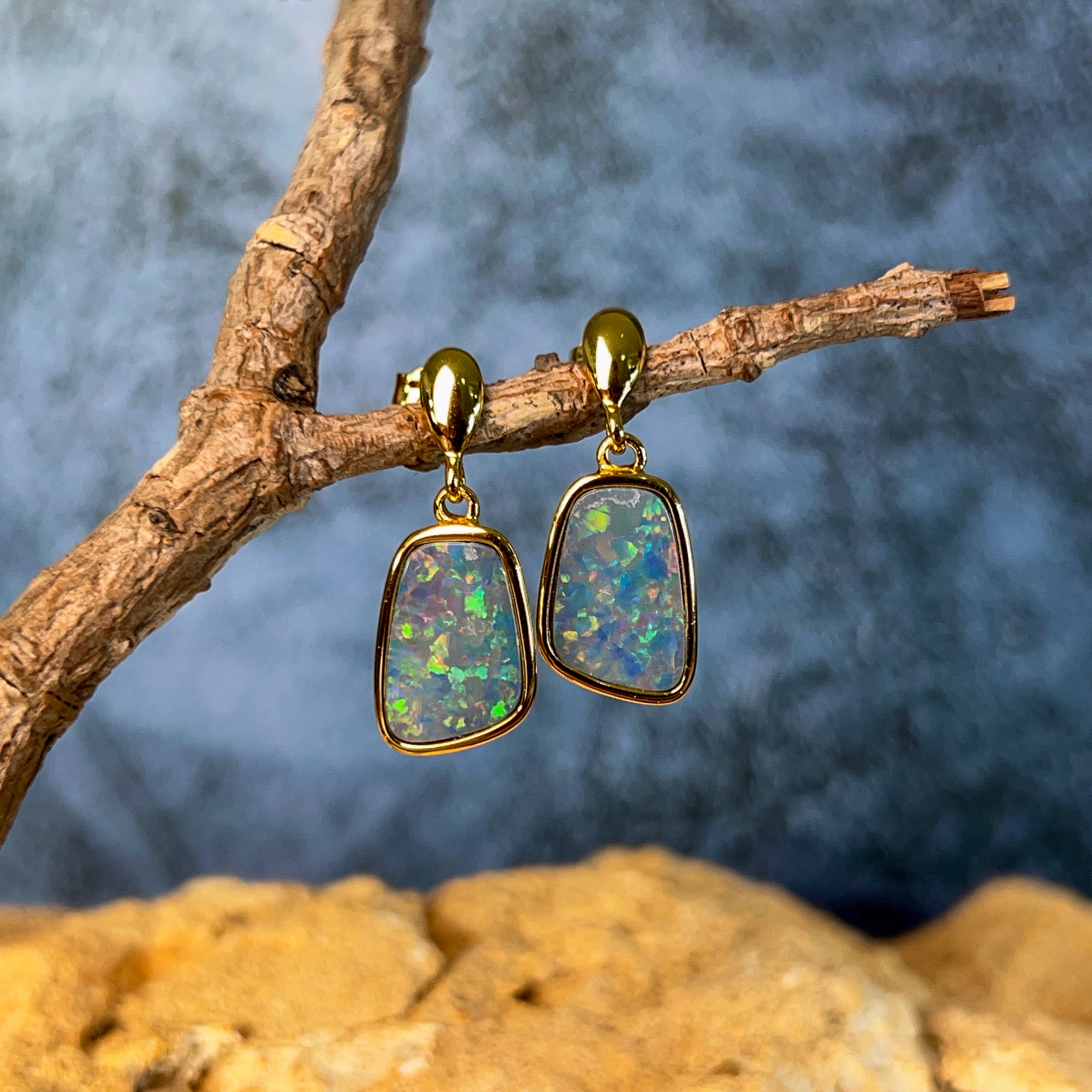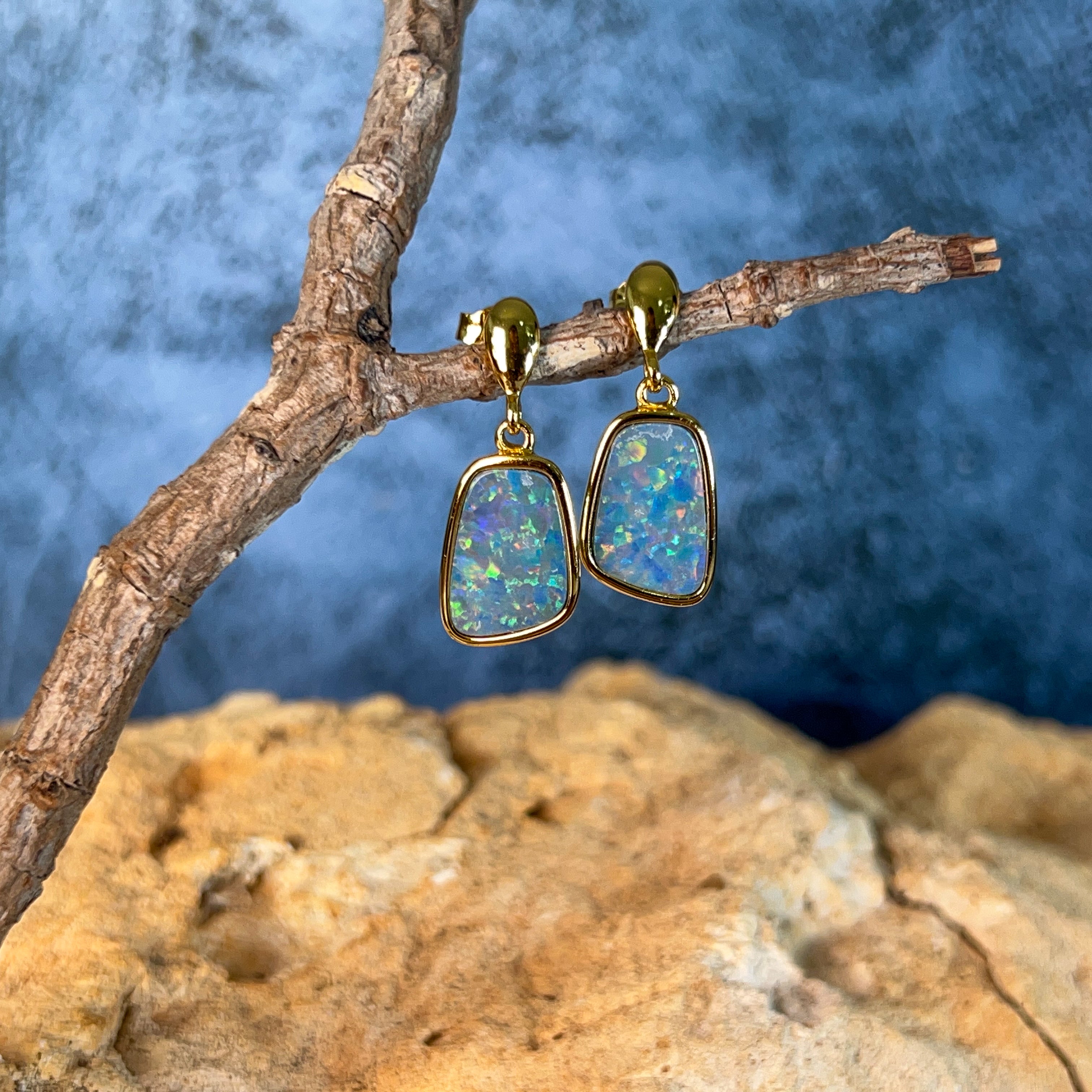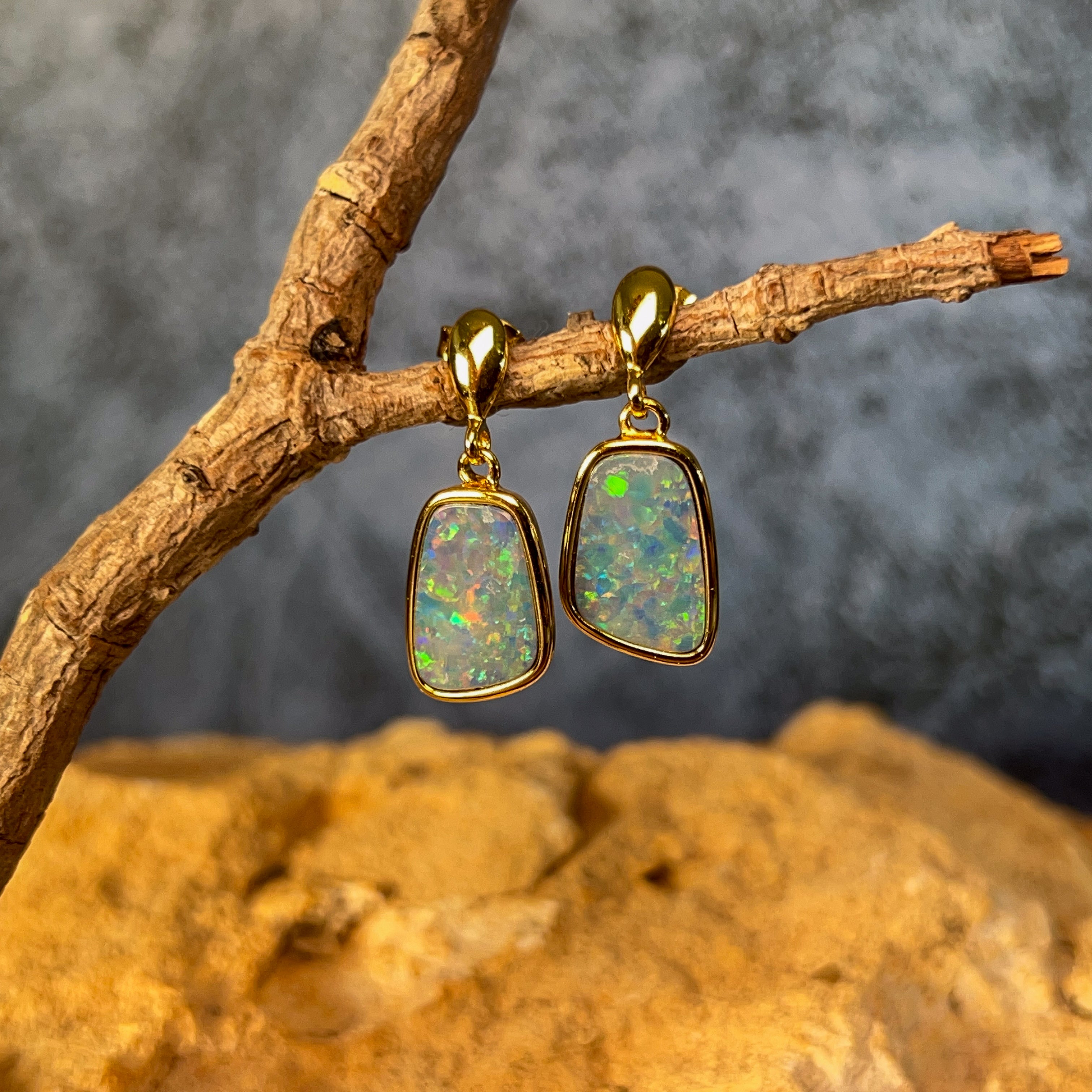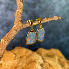 Elevate your everyday elegance with these stunning gold-plated silver opal doublet earrings. Featuring captivating 13x9mm opals that dance with mesmerizing colour and light, these dangling beauties offer the perfect balance of sophistication and movement. The warm gold plating complements the opal's natural play-of-colour, creating a luxurious look that transitions seamlessly from day to night. Lightweight and comfortable for extended wear, these earrings make an unforgettable statement piece that celebrates the timeless allure of genuine opal gemstones.