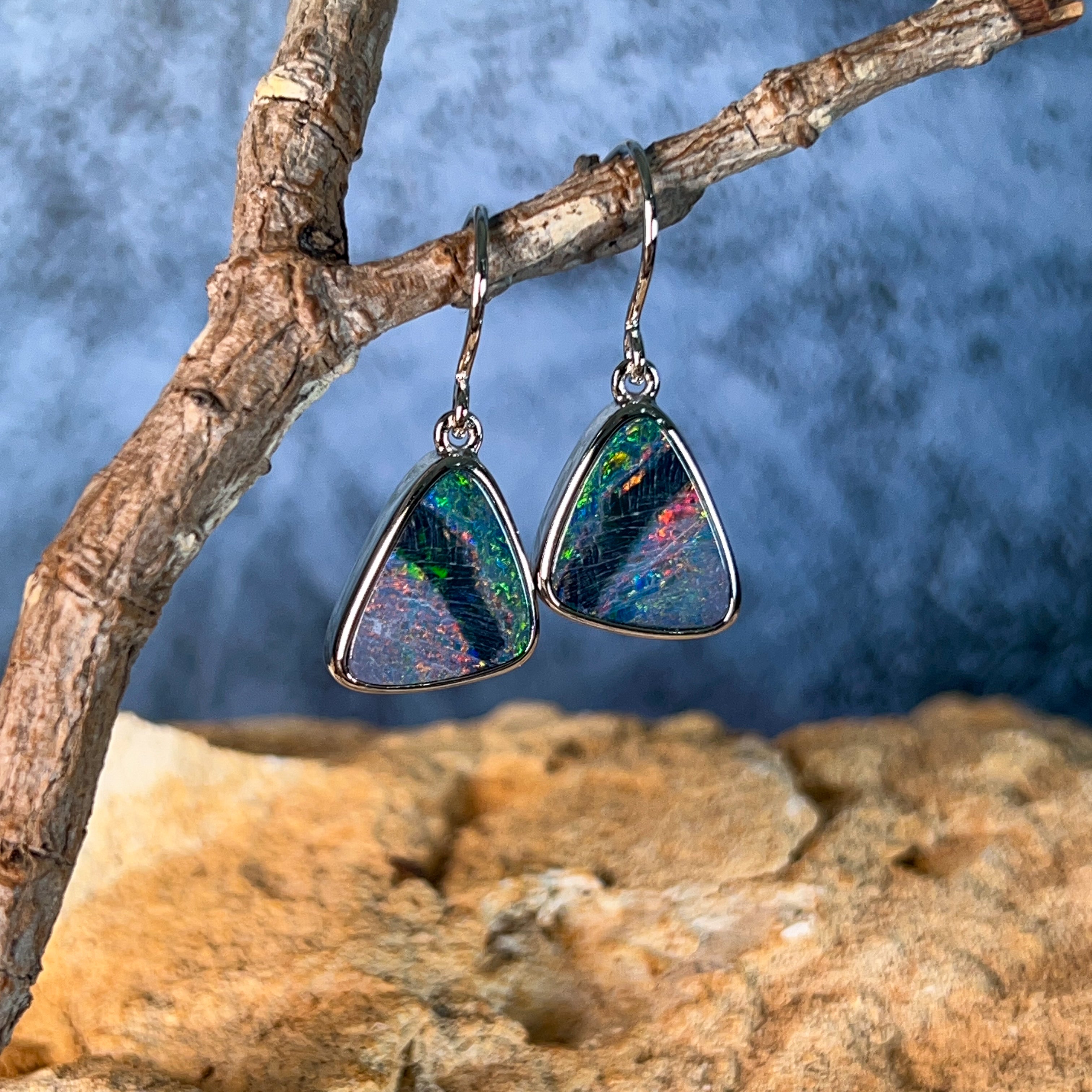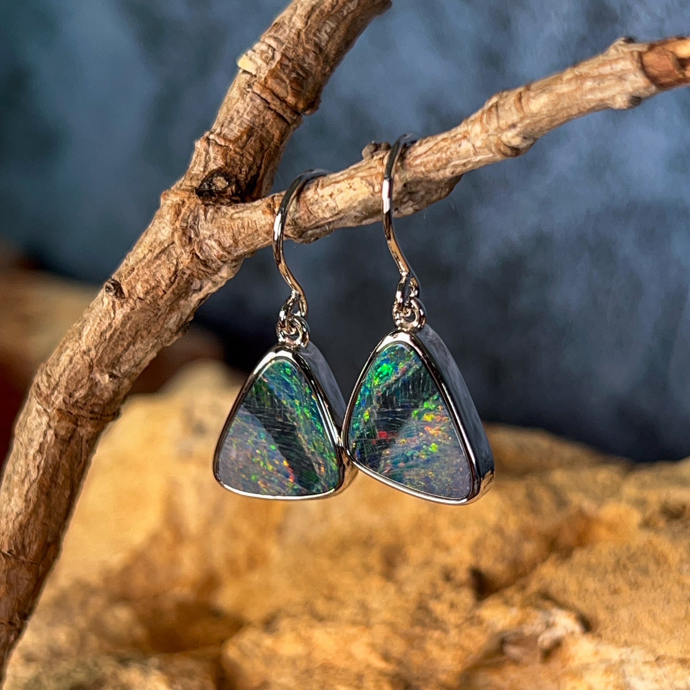 Elevate your everyday elegance with these stunning sterling silver triangle opal doublet earrings. Featuring 5.38 carats of mesmerising opal, each piece showcases nature's most captivating play of colour in a contemporary geometric design. The lightweight dangling style moves gracefully with you, while the premium sterling silver setting ensures lasting durability and timeless appeal. Perfect for those who appreciate modern sophistication with a touch of natural wonder. A versatile addition to any jewellery collection that effortlessly transitions from day to night.