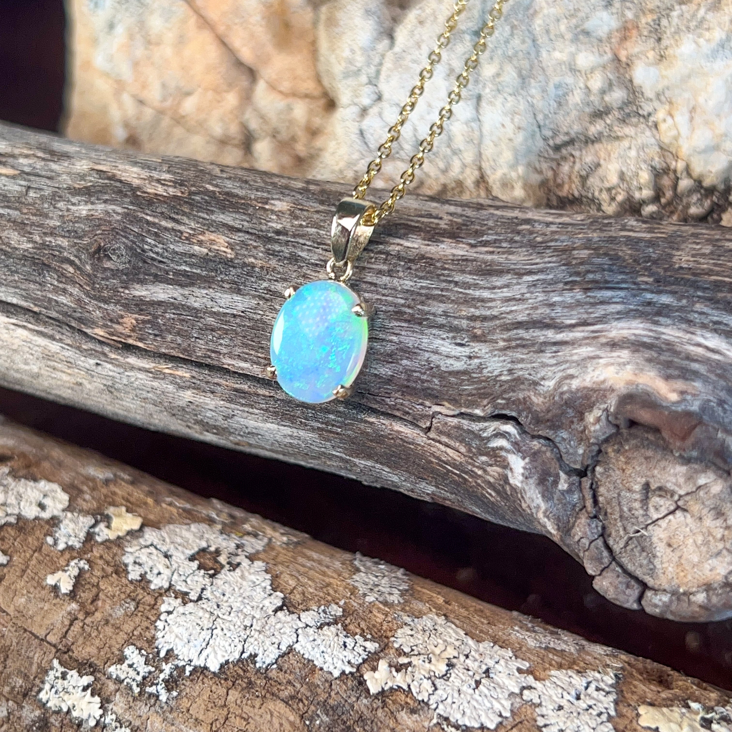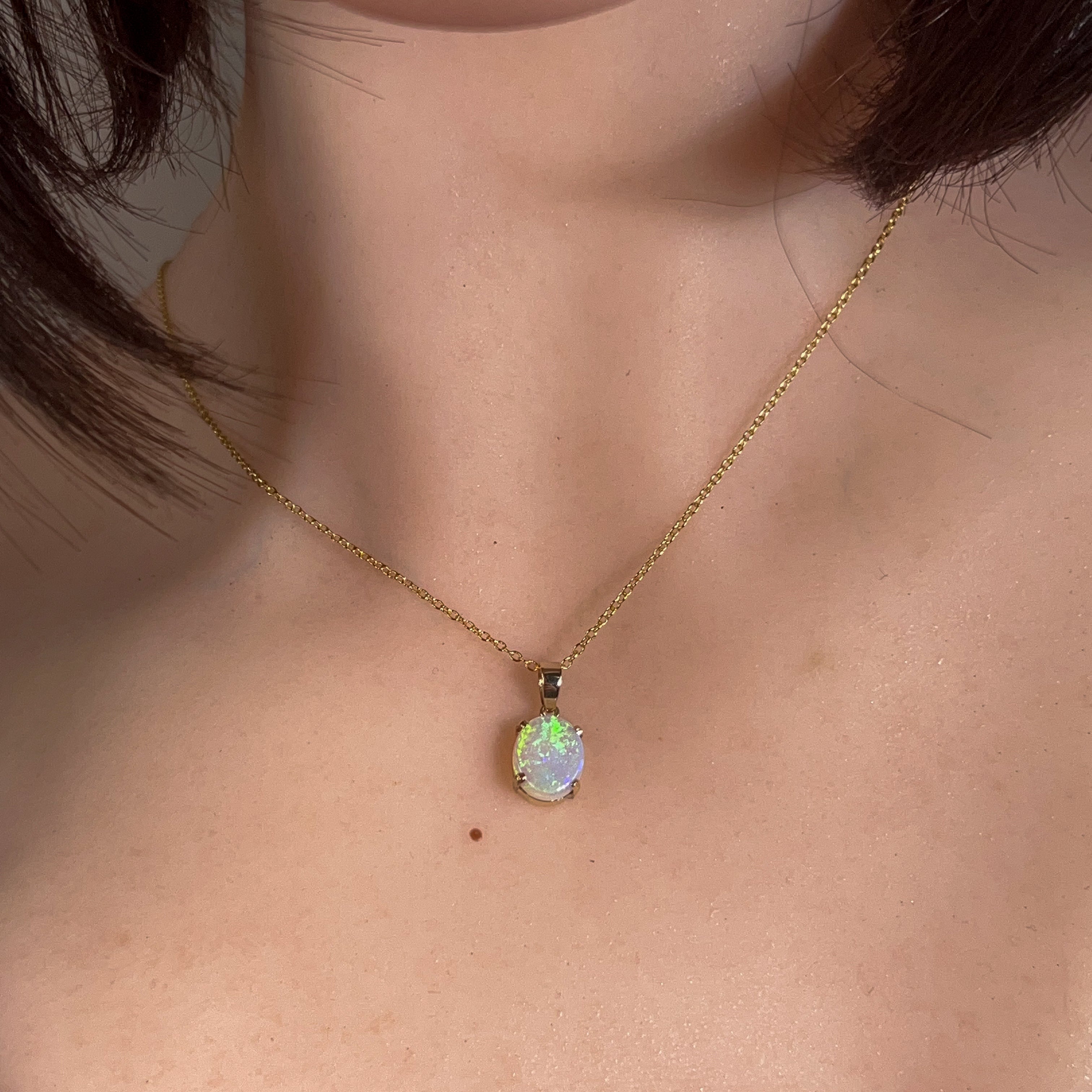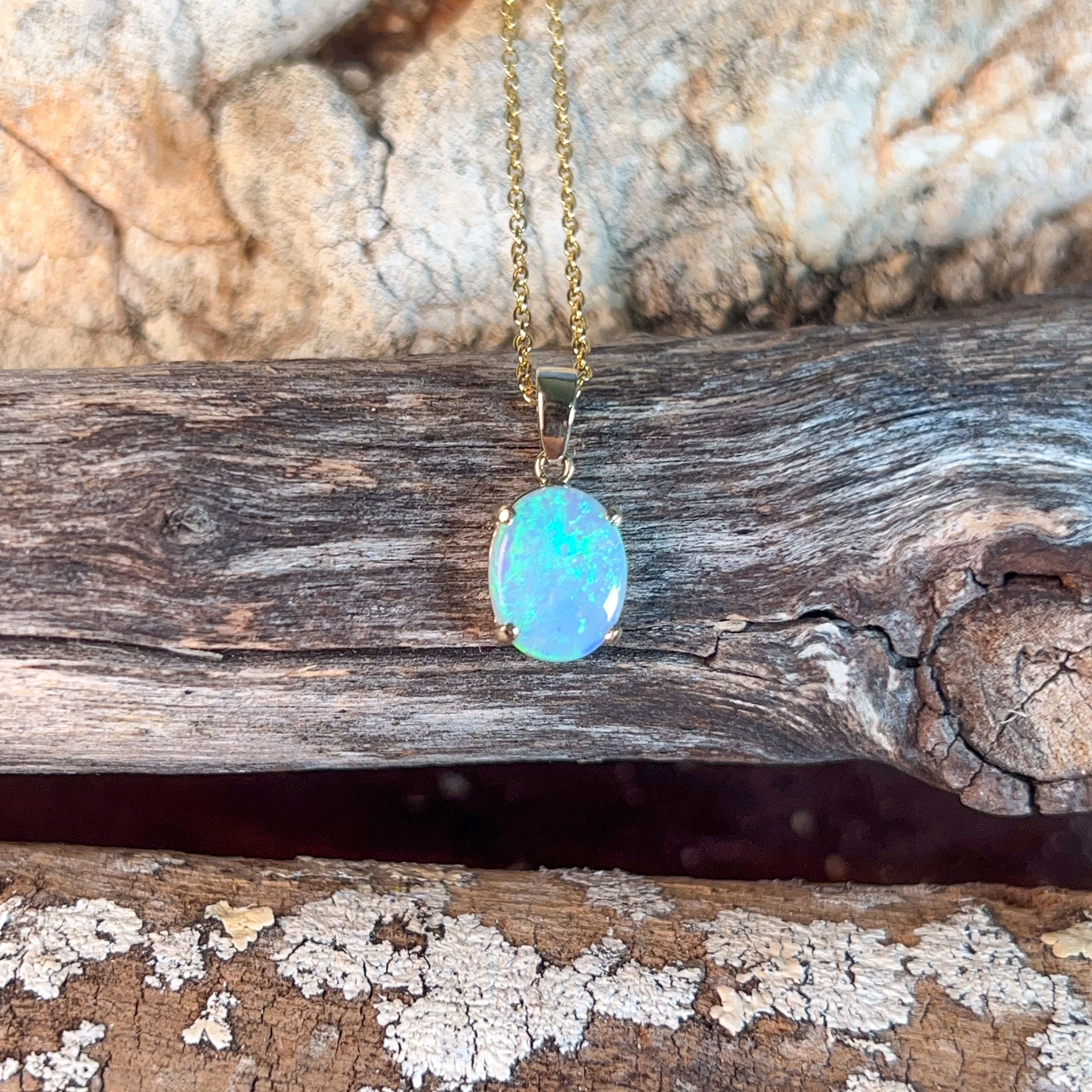 Wear a slice of Australian magic around your neck! This stunning 14kt yellow gold pendant showcases a radiant 10x8mm crystal opal that dances with mesmerizing flashes of colour. The timeless design lets your opal take centre stage, while the warm gold frame adds elegance and sophistication. Perfect for everyday sparkle or special occasions, this classic beauty captures the natural wonder of one of Earth's most enchanting gemstones. A true masterpiece that'll have everyone asking where you found it.