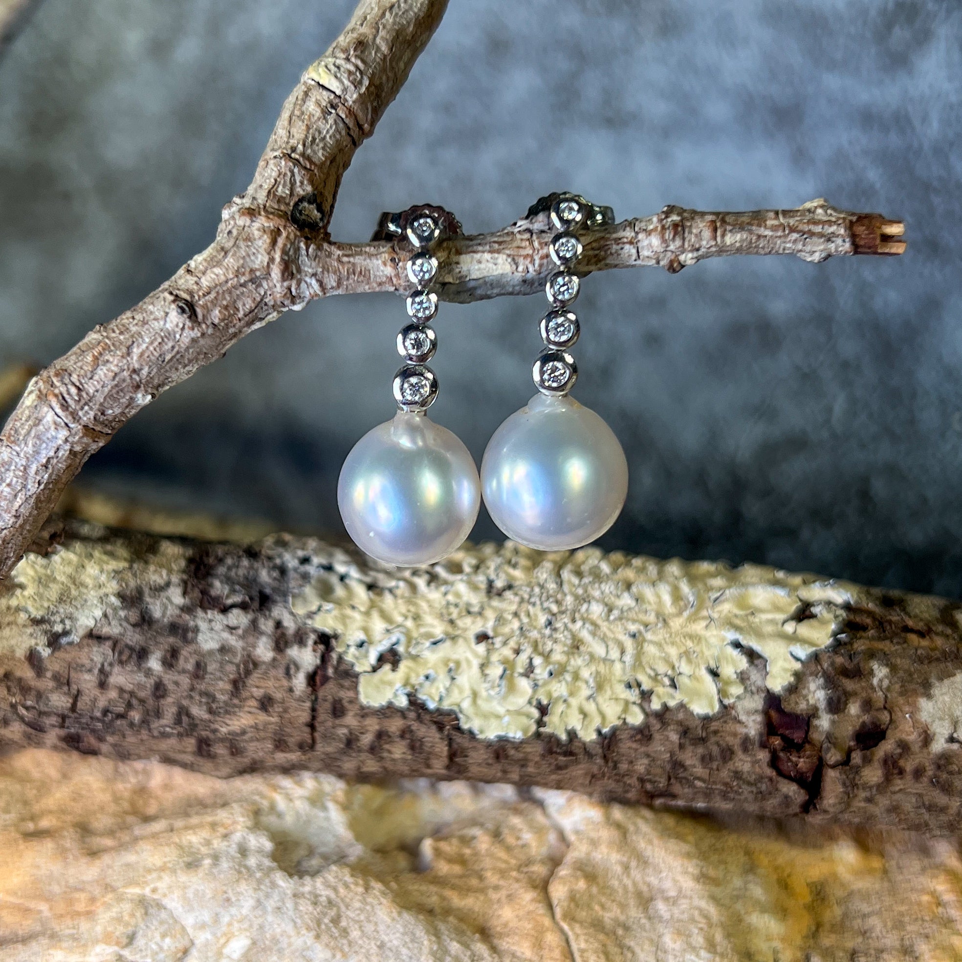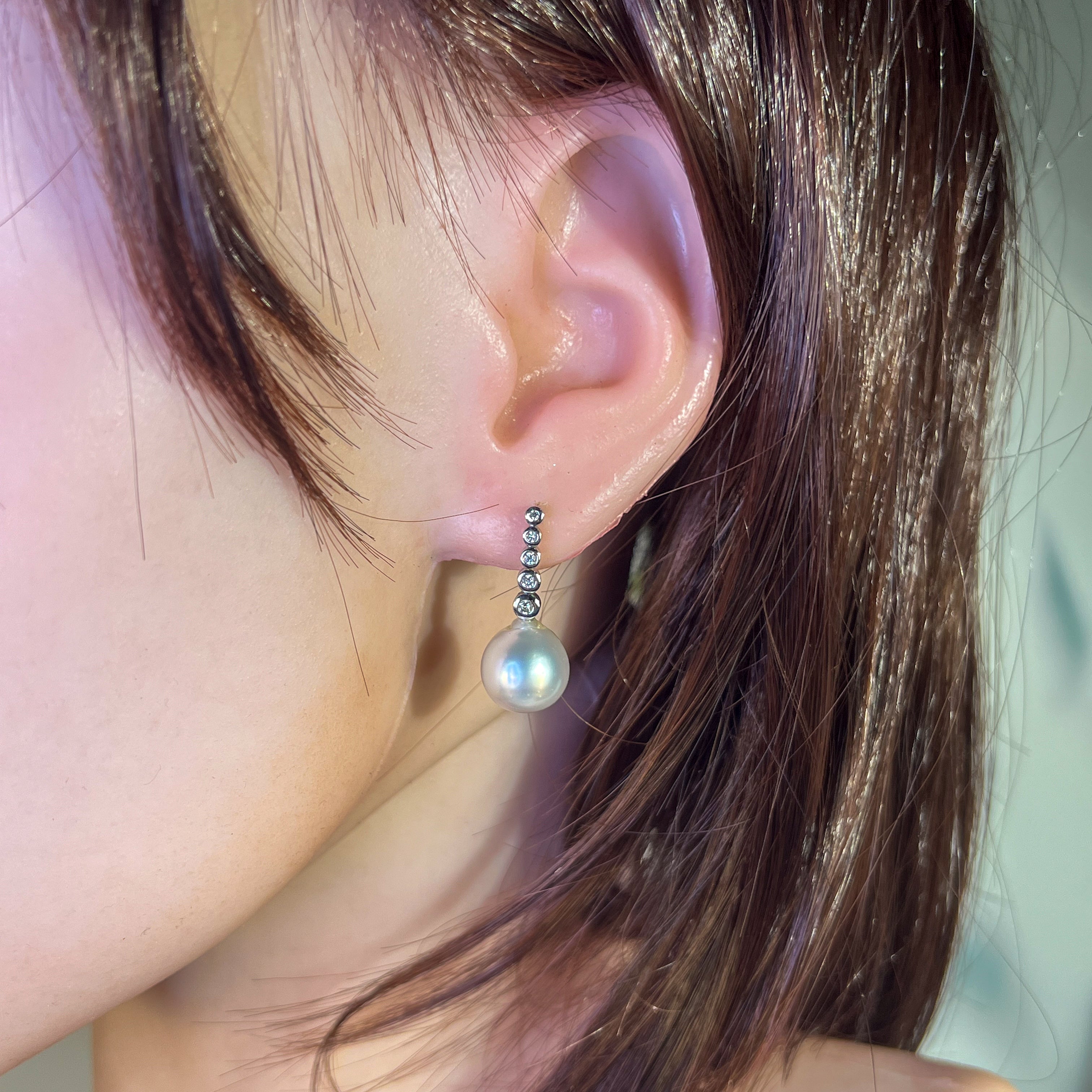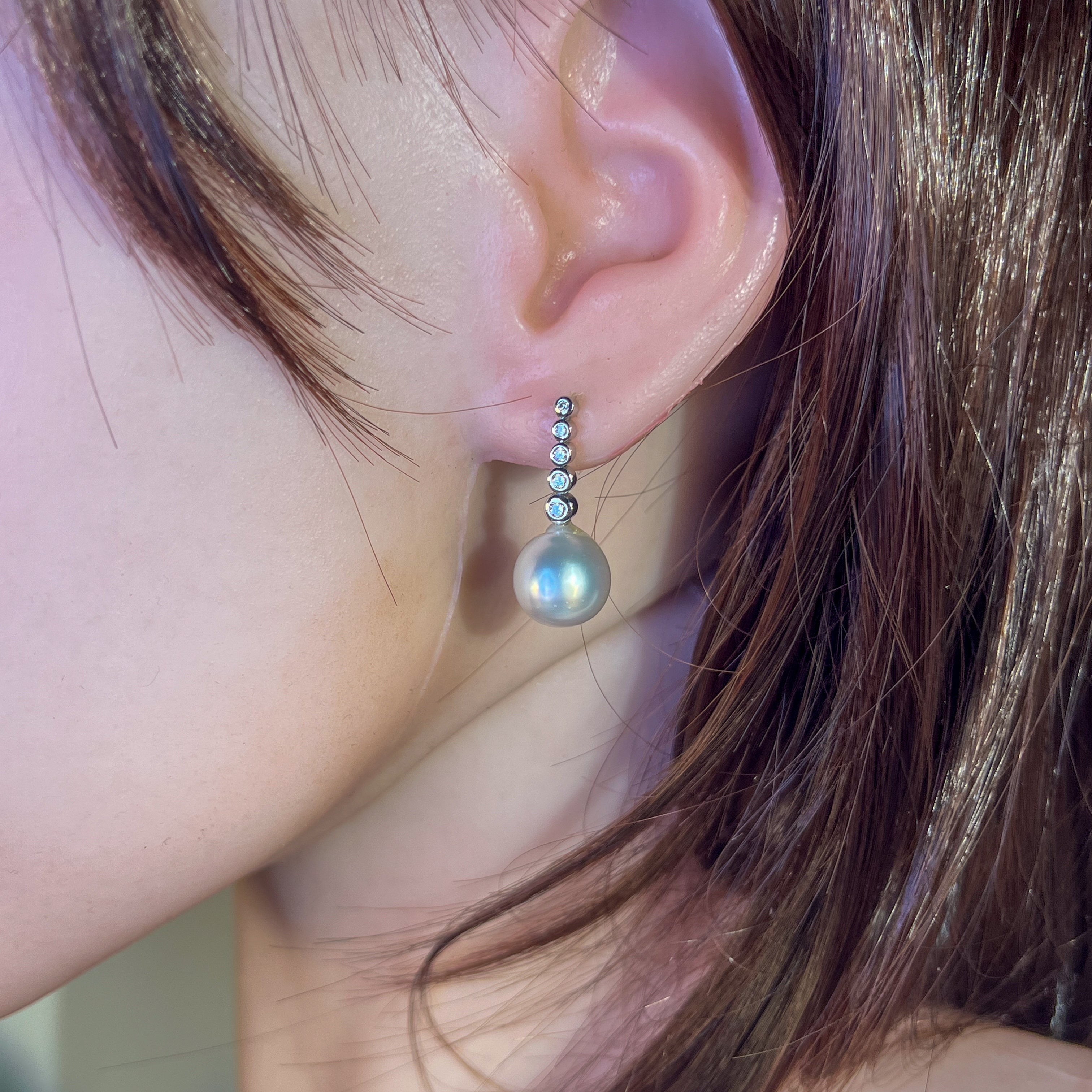 18kt White Gold long earring drop style South Sea Pearls 11mm with diamonds