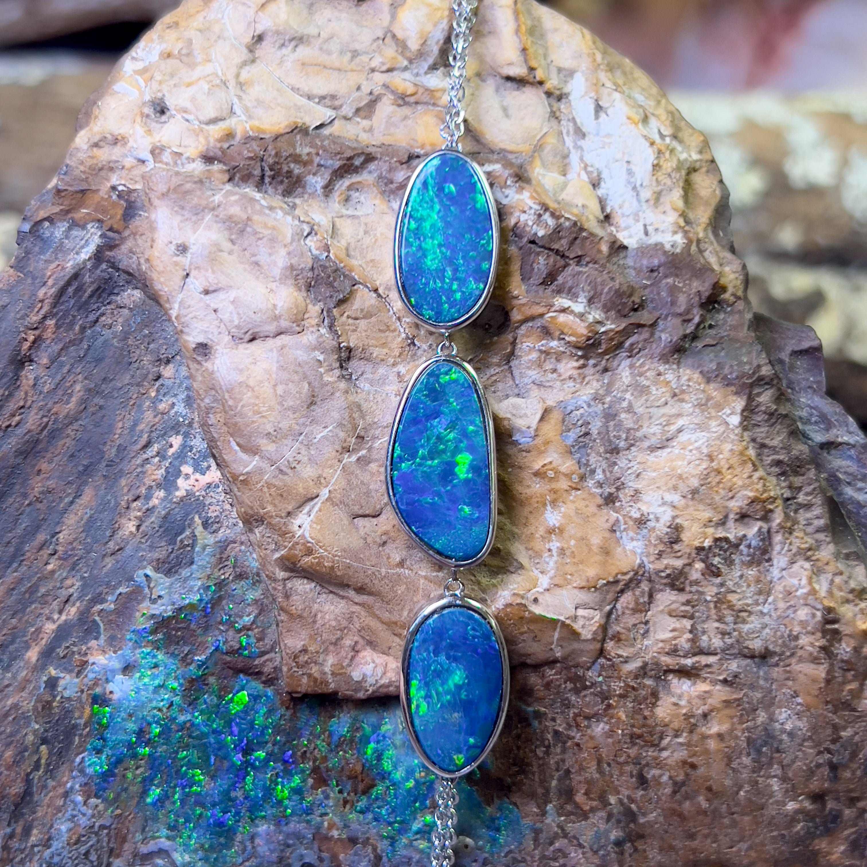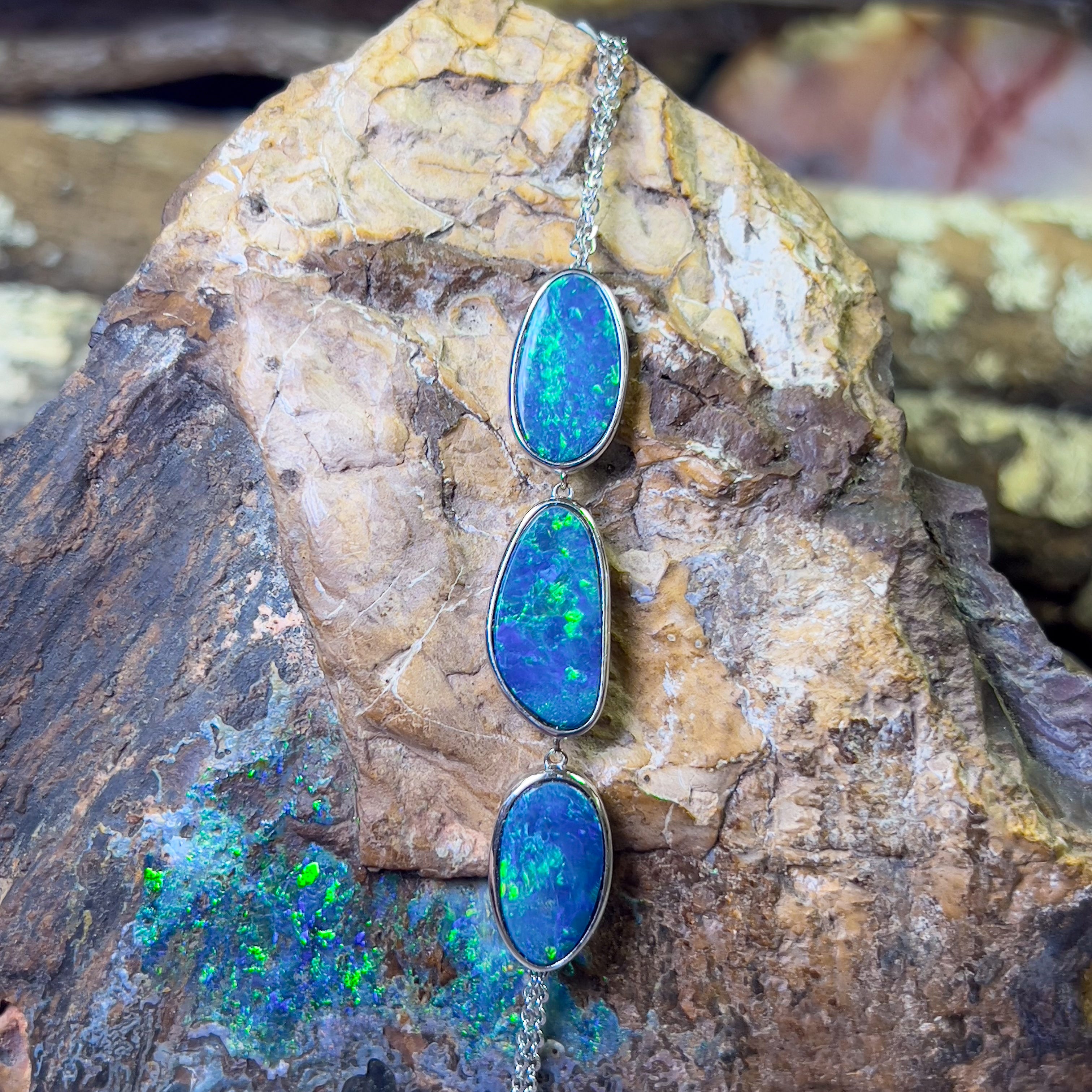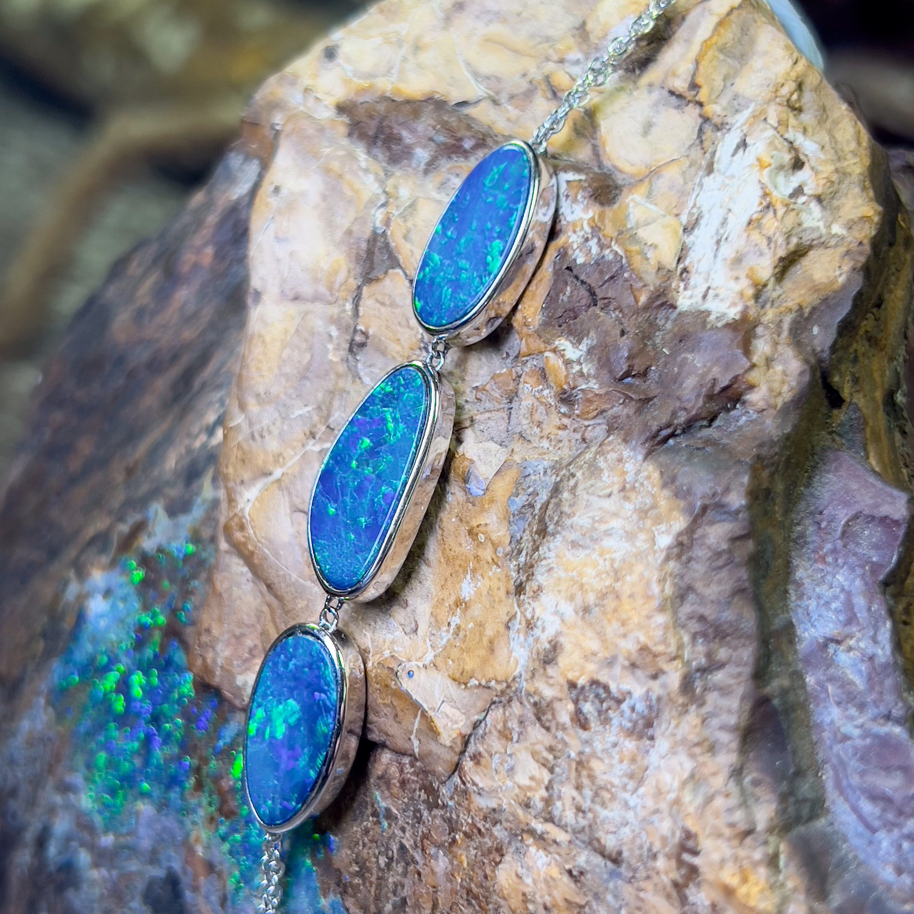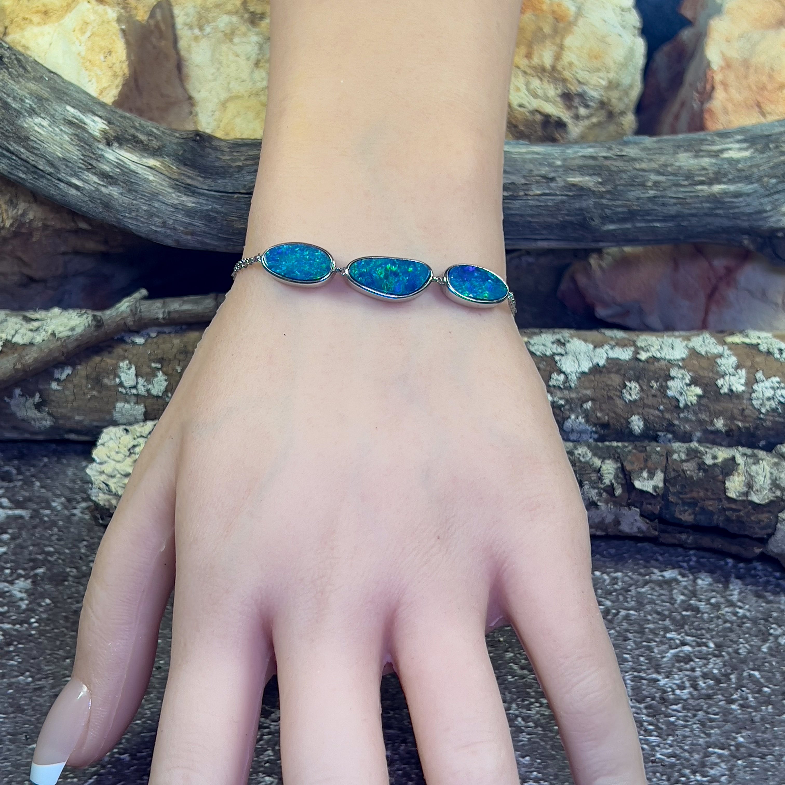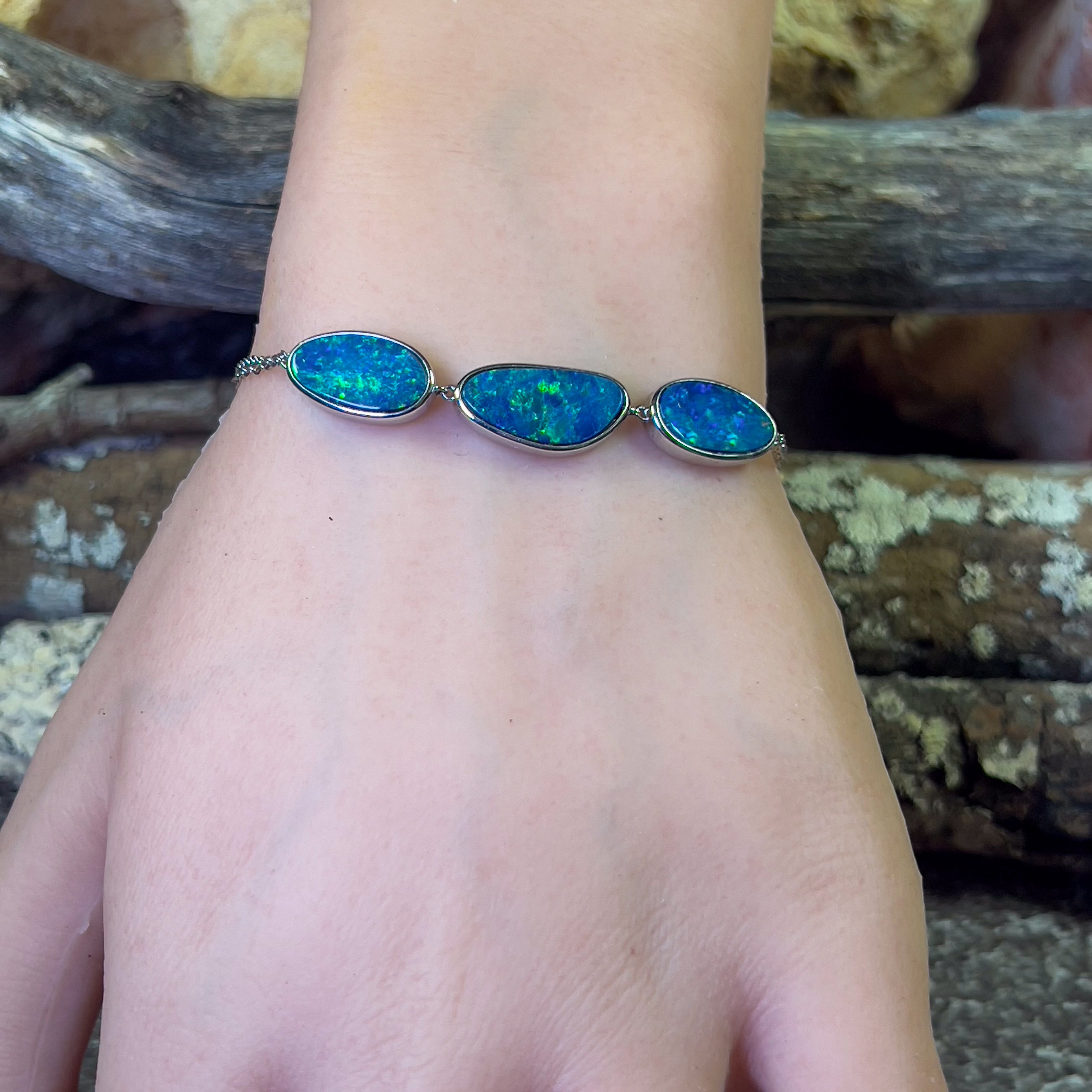 14kt White gold 3 freeform Blue Green Opal doublet bracelet