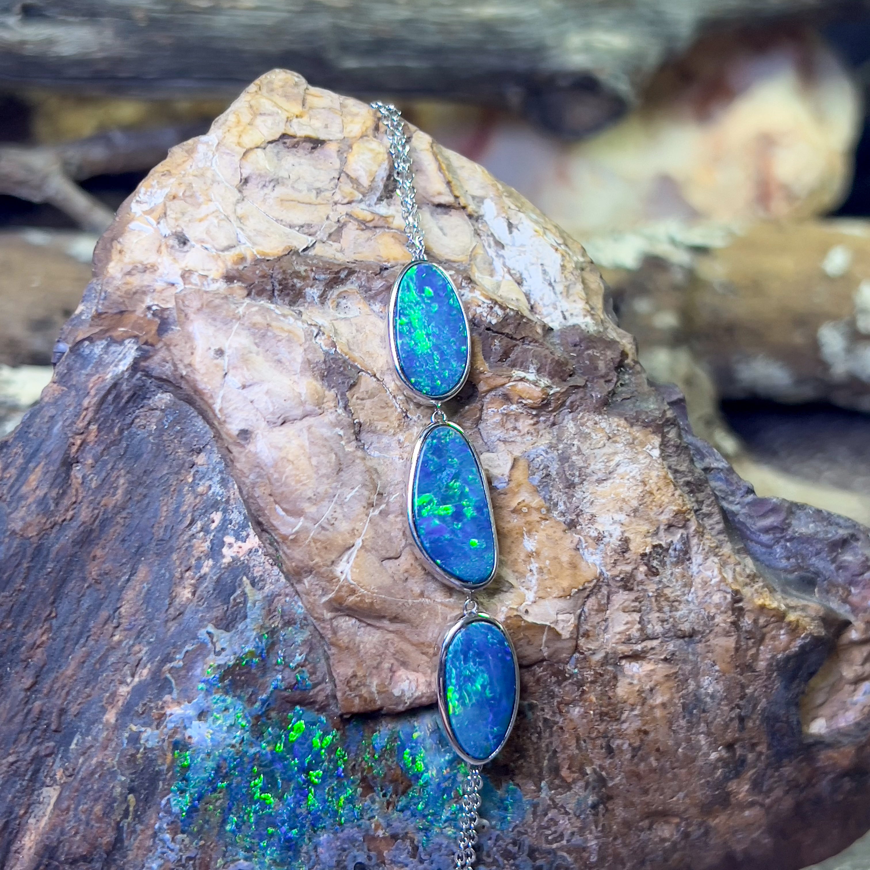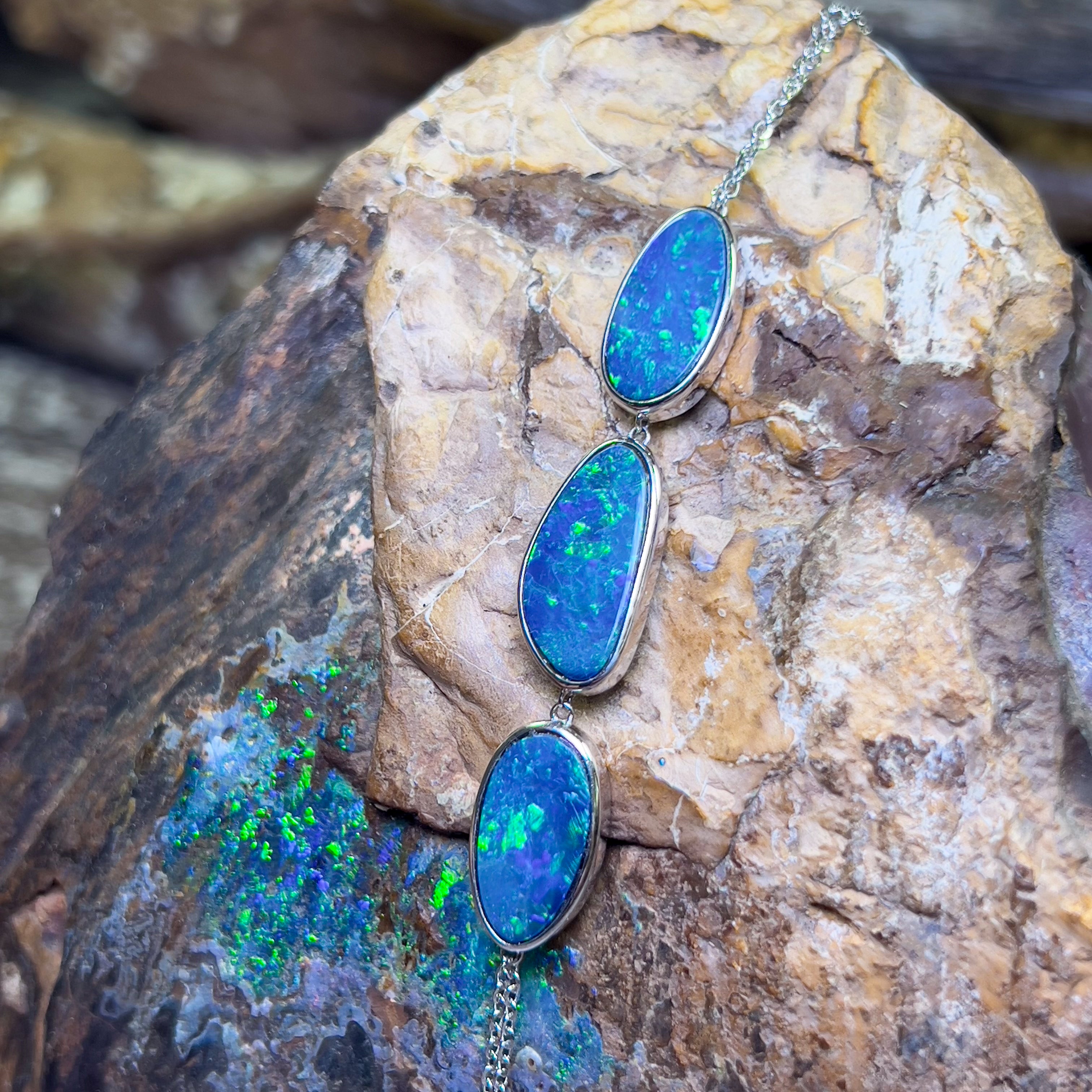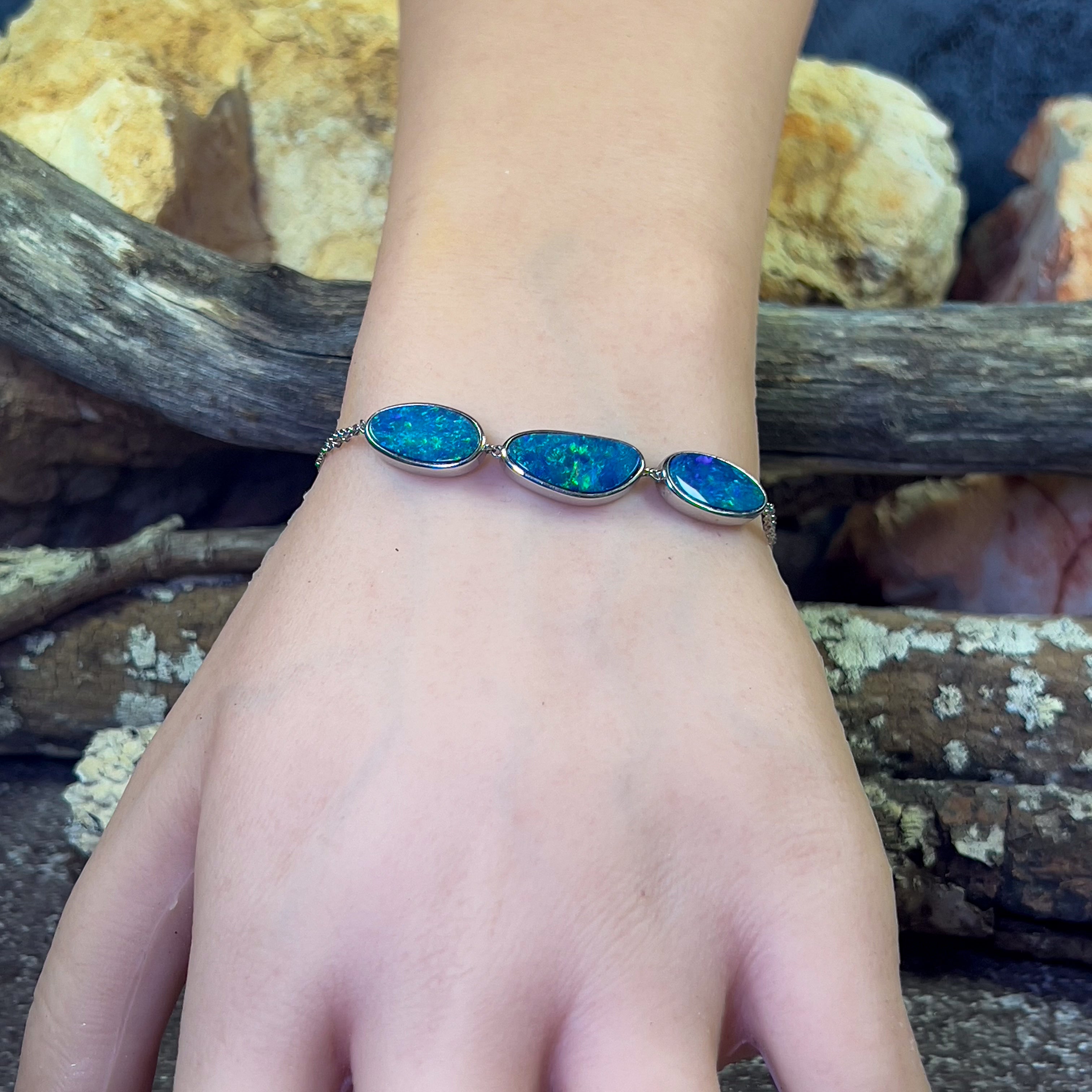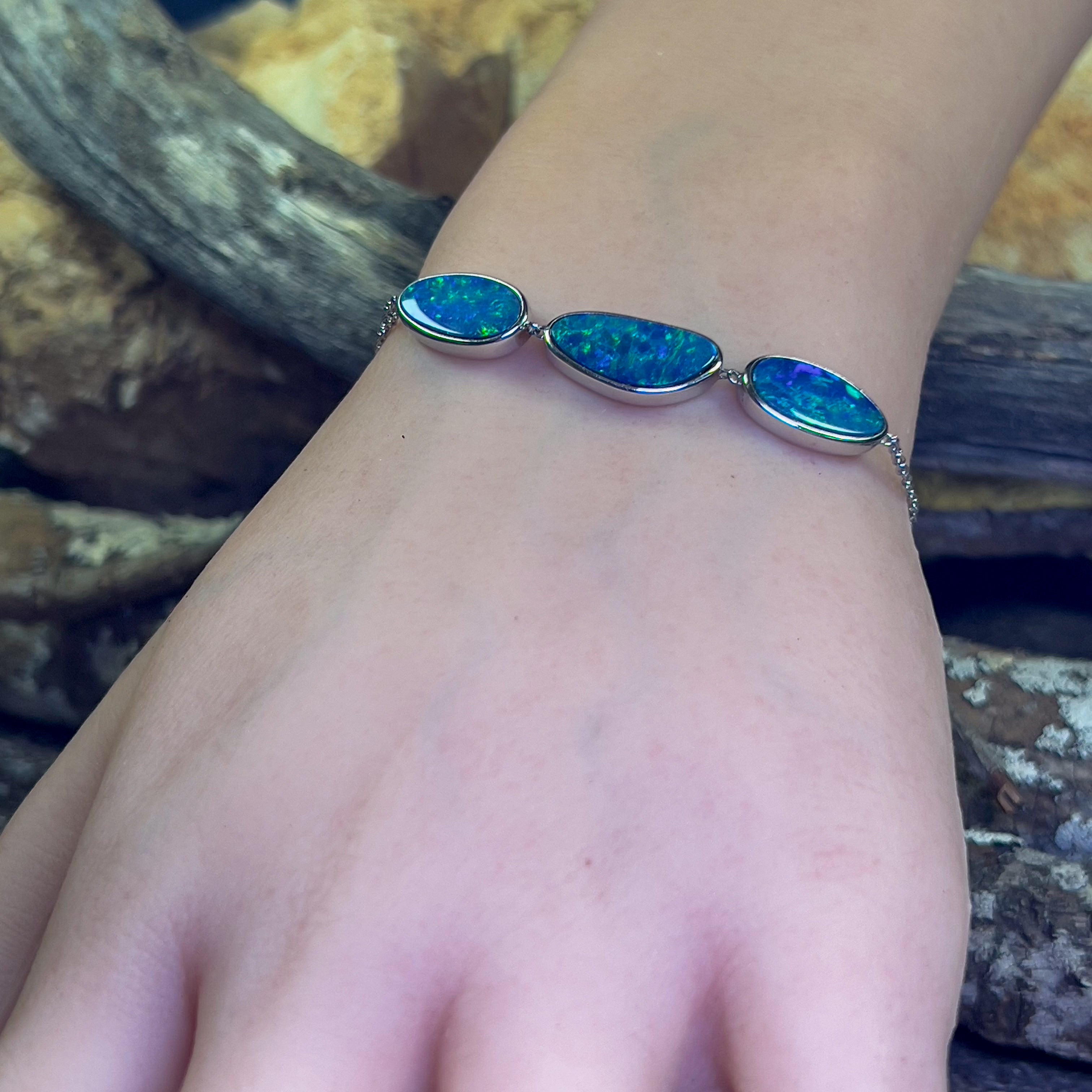 Add a pop of color to your wrist with our 14kt white gold bracelet featuring 3 stunning freeform Blue Green Opal doublets. Vibrant and unique, this bracelet is a statement piece that is sure to turn heads. Perfect for adding a touch of personality to any outfit.