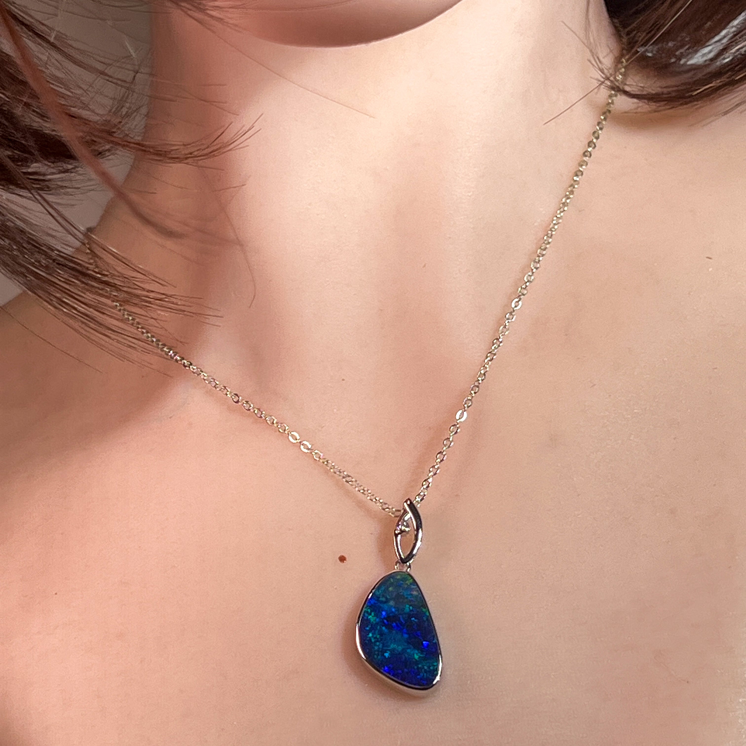 Elevate your style with this stunning 14kt white gold pendant featuring a large, blue-green opal doublet in a unique triangle shape. Its vibrant colors catch the light beautifully, making it a captivating centerpiece for any outfit. Crafted with quality and elegance, this pendant offers a timeless accessory that enhances your look with a touch of sophistication and natural beauty. Perfect for those who appreciate distinctive, eye-catching jewelry.