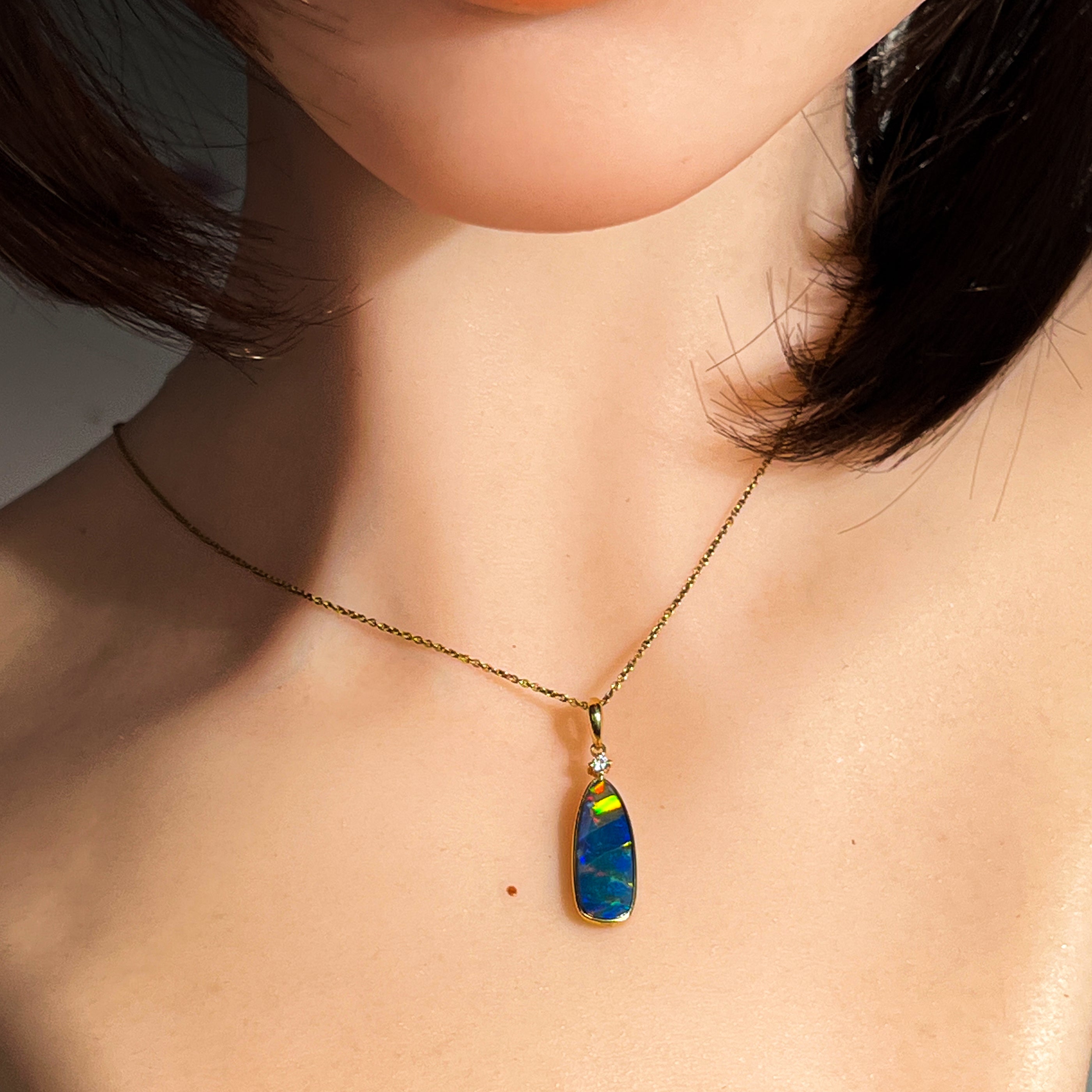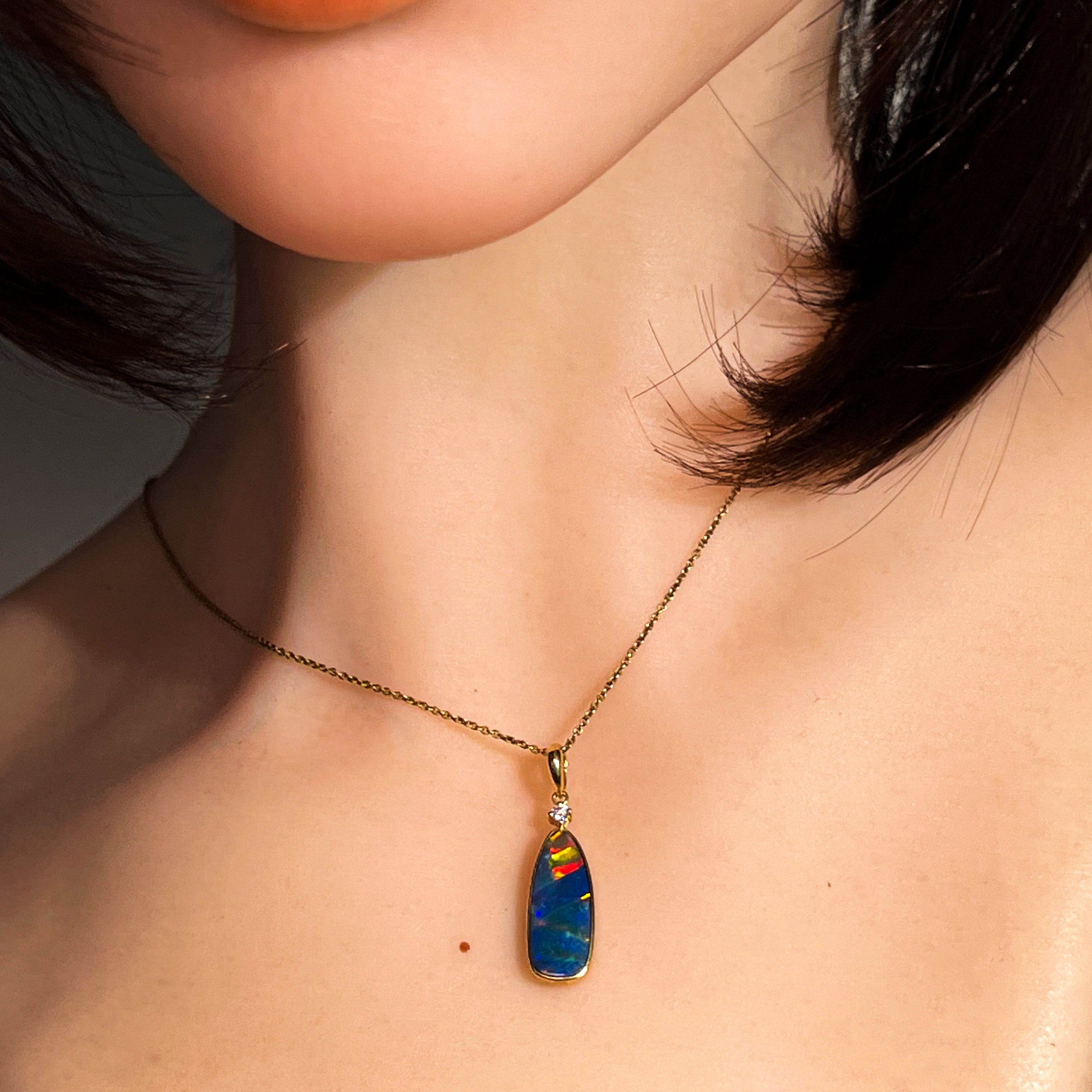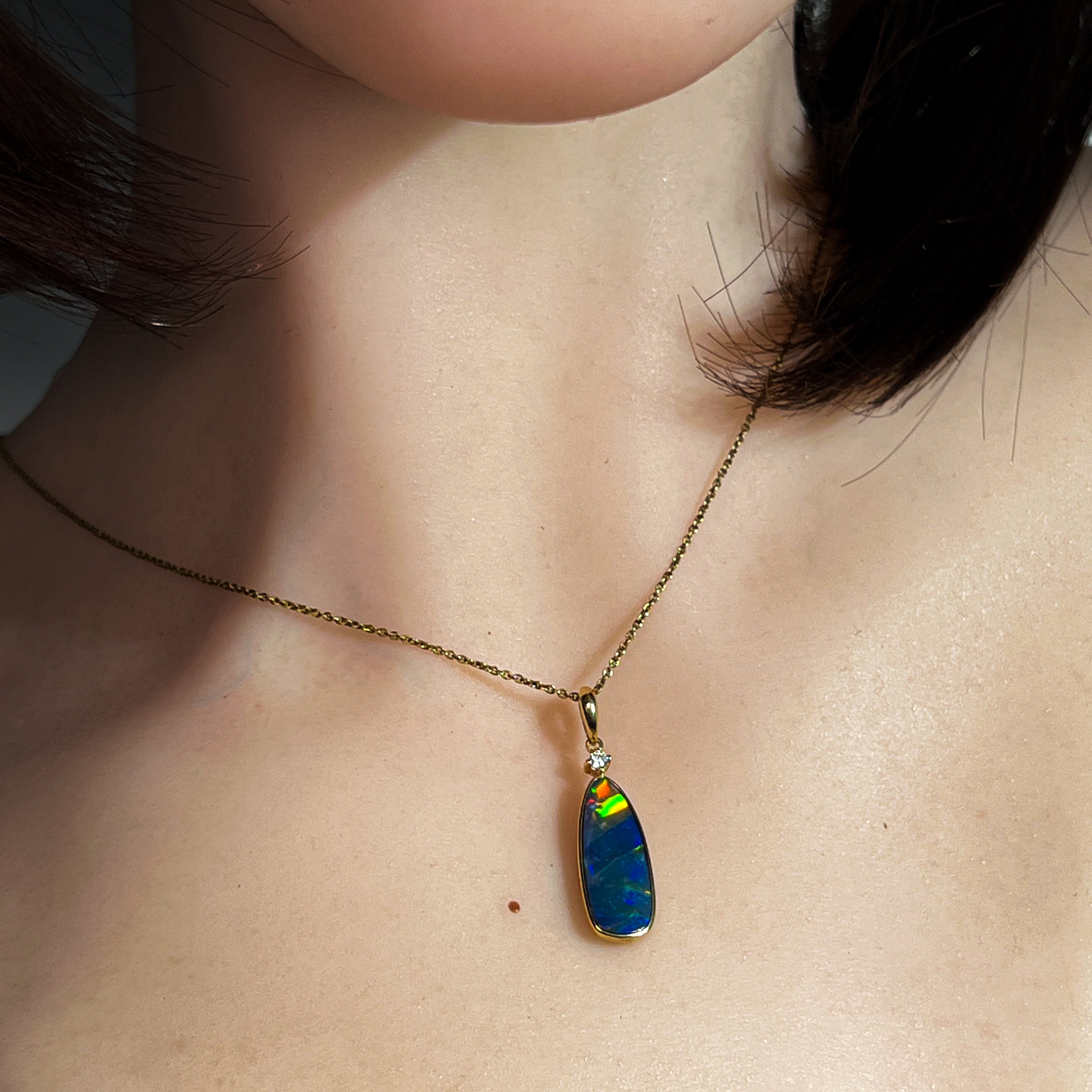 Experience the ultimate beauty with our 14kt Yellow Gold drop style Opal doublet pendant, featuring a stunning rainbow color. Elevate your style with this unique and elegant piece, accented with sparkling diamonds. A must-have for any jewelry collection.