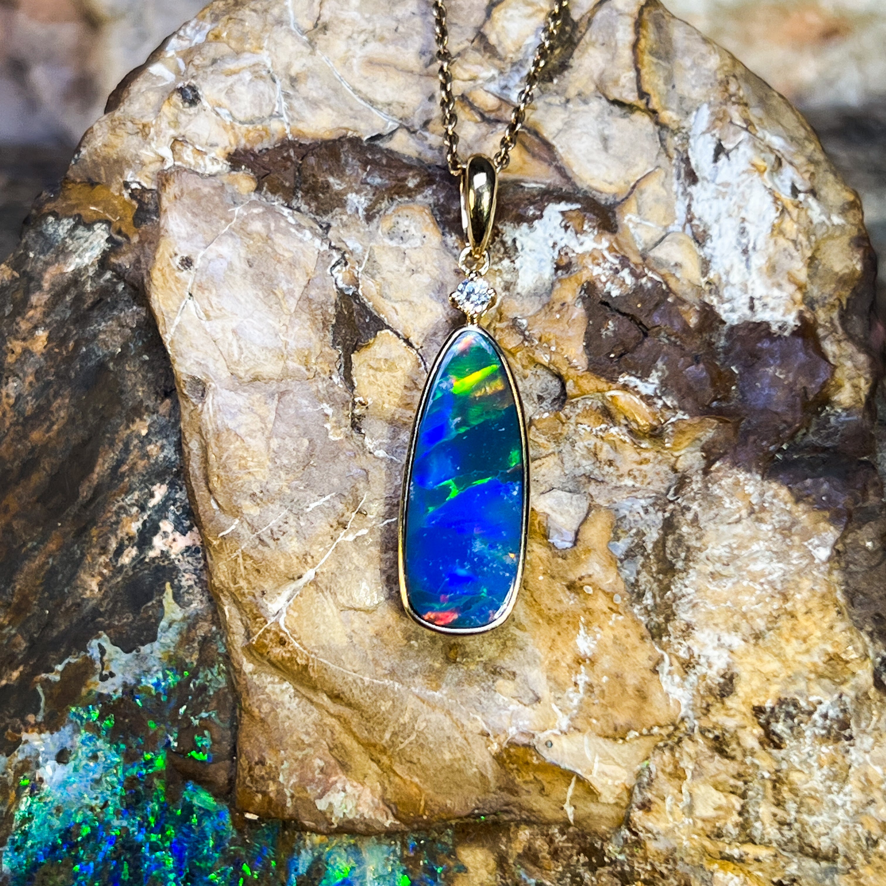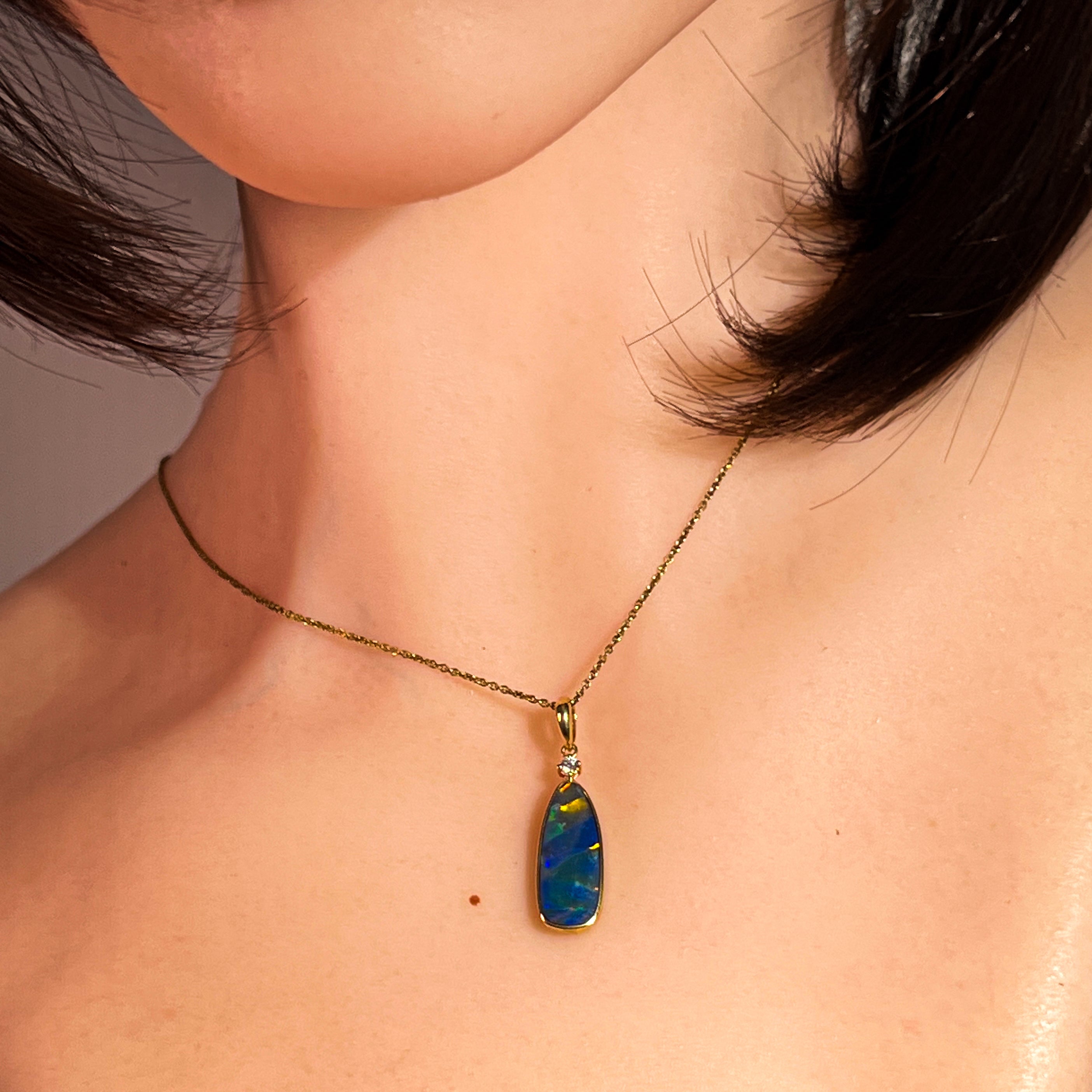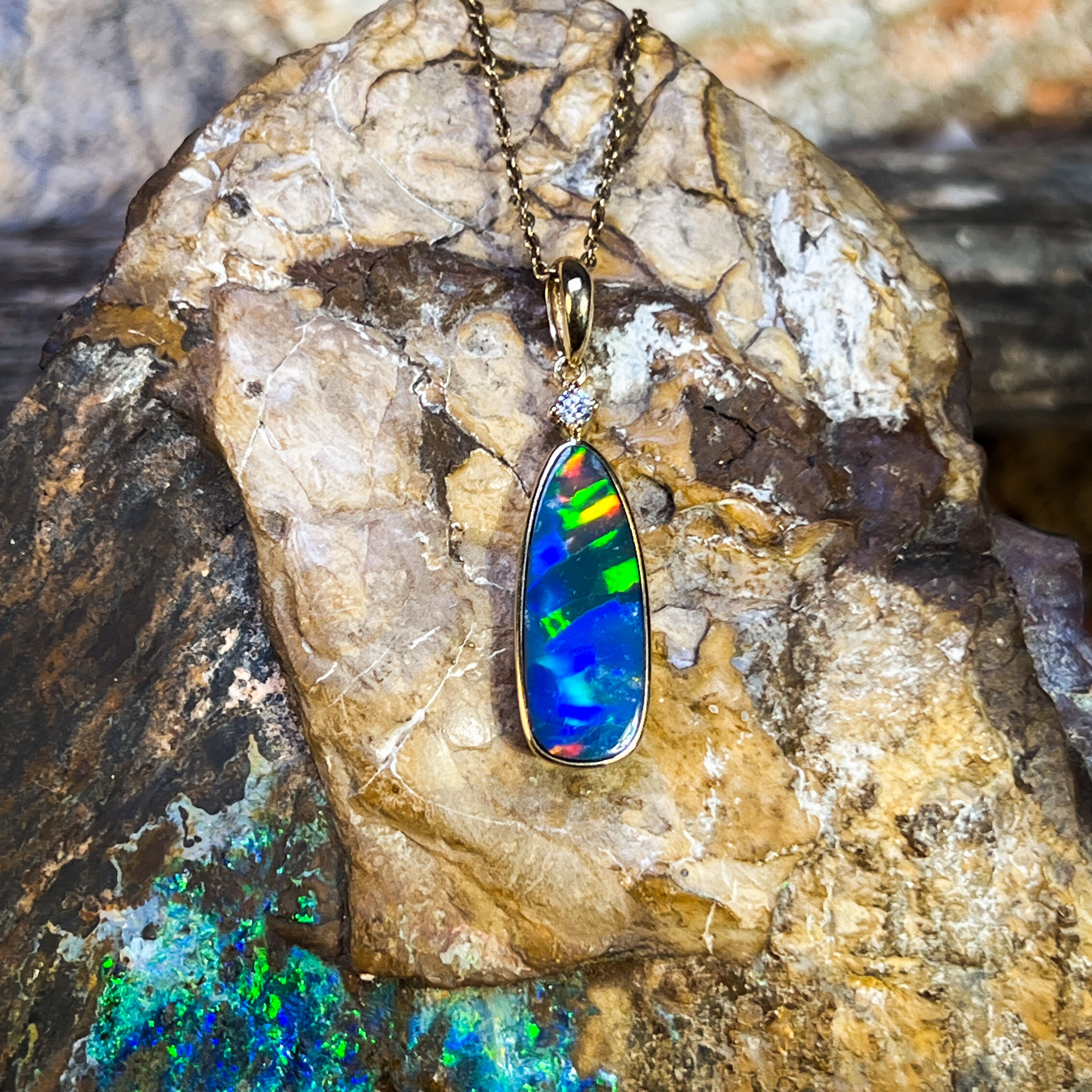 Experience the ultimate beauty with our 14kt Yellow Gold drop style Opal doublet pendant, featuring a stunning rainbow color. Elevate your style with this unique and elegant piece, accented with sparkling diamonds. A must-have for any jewelry collection.