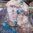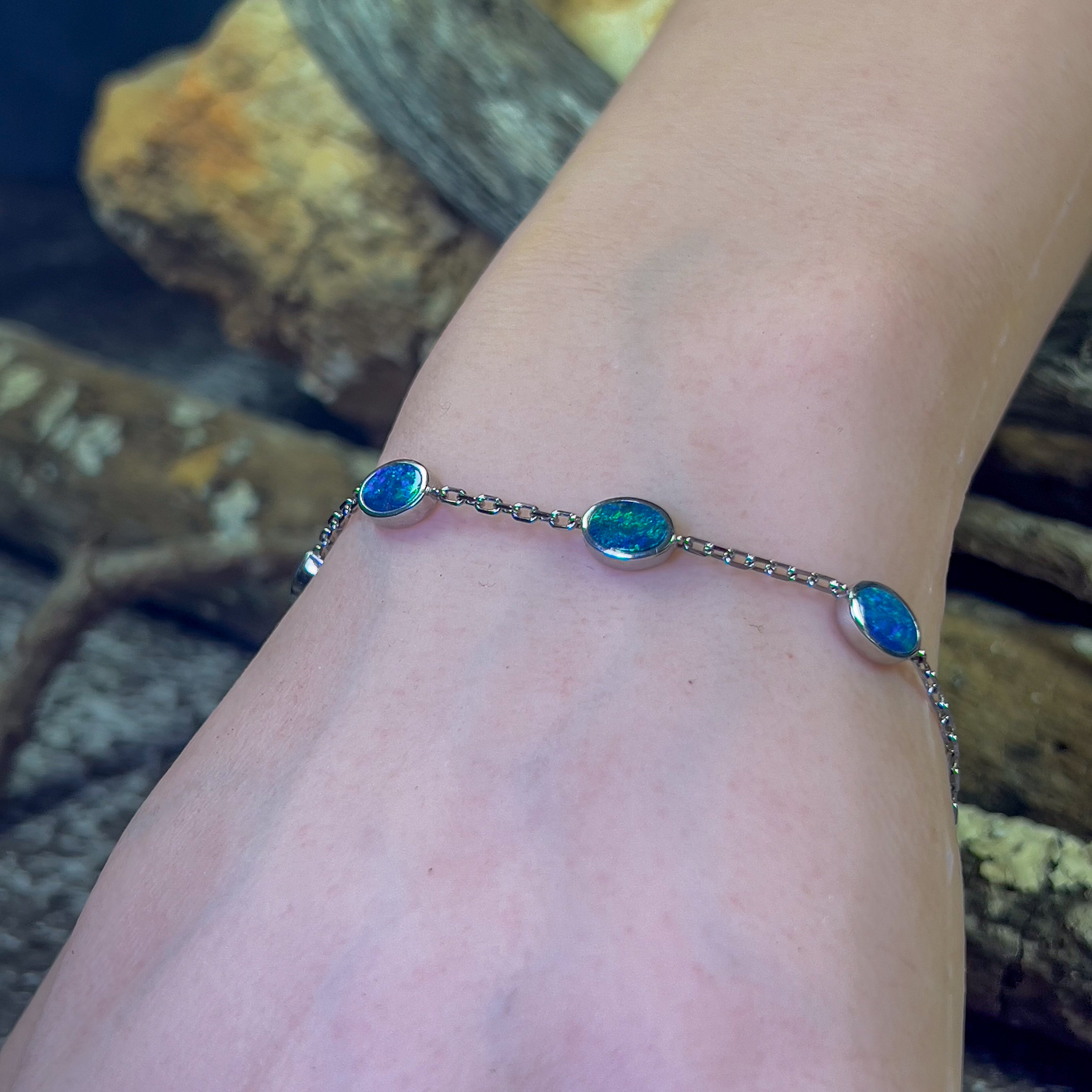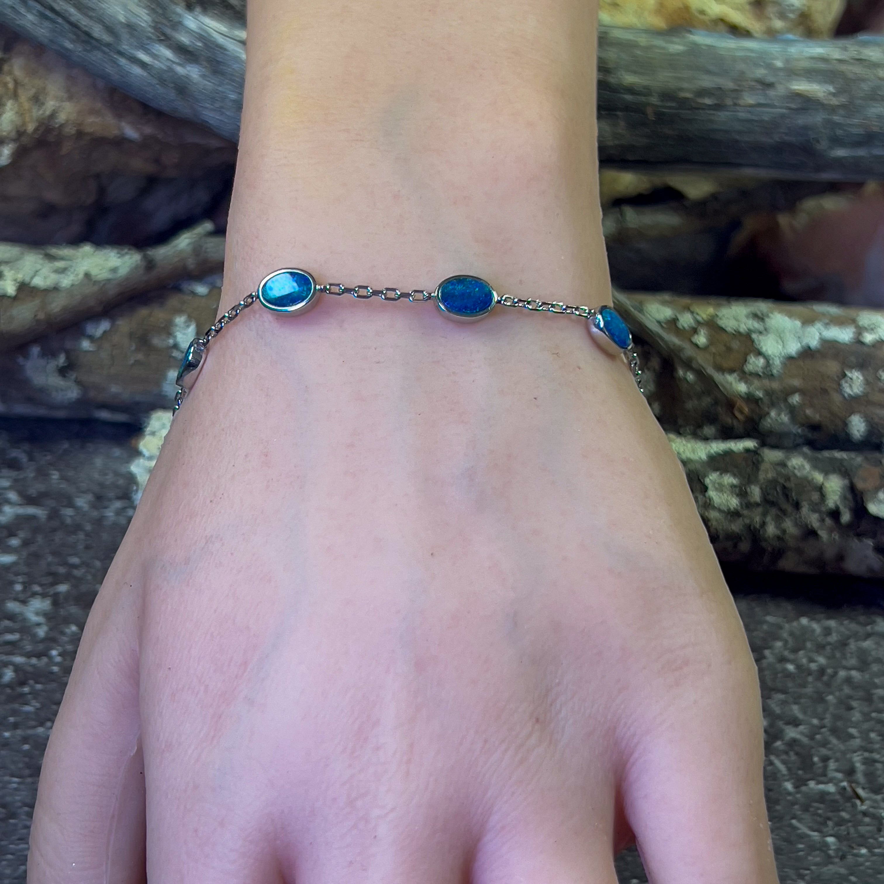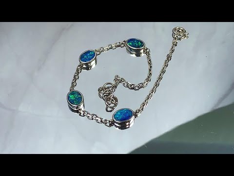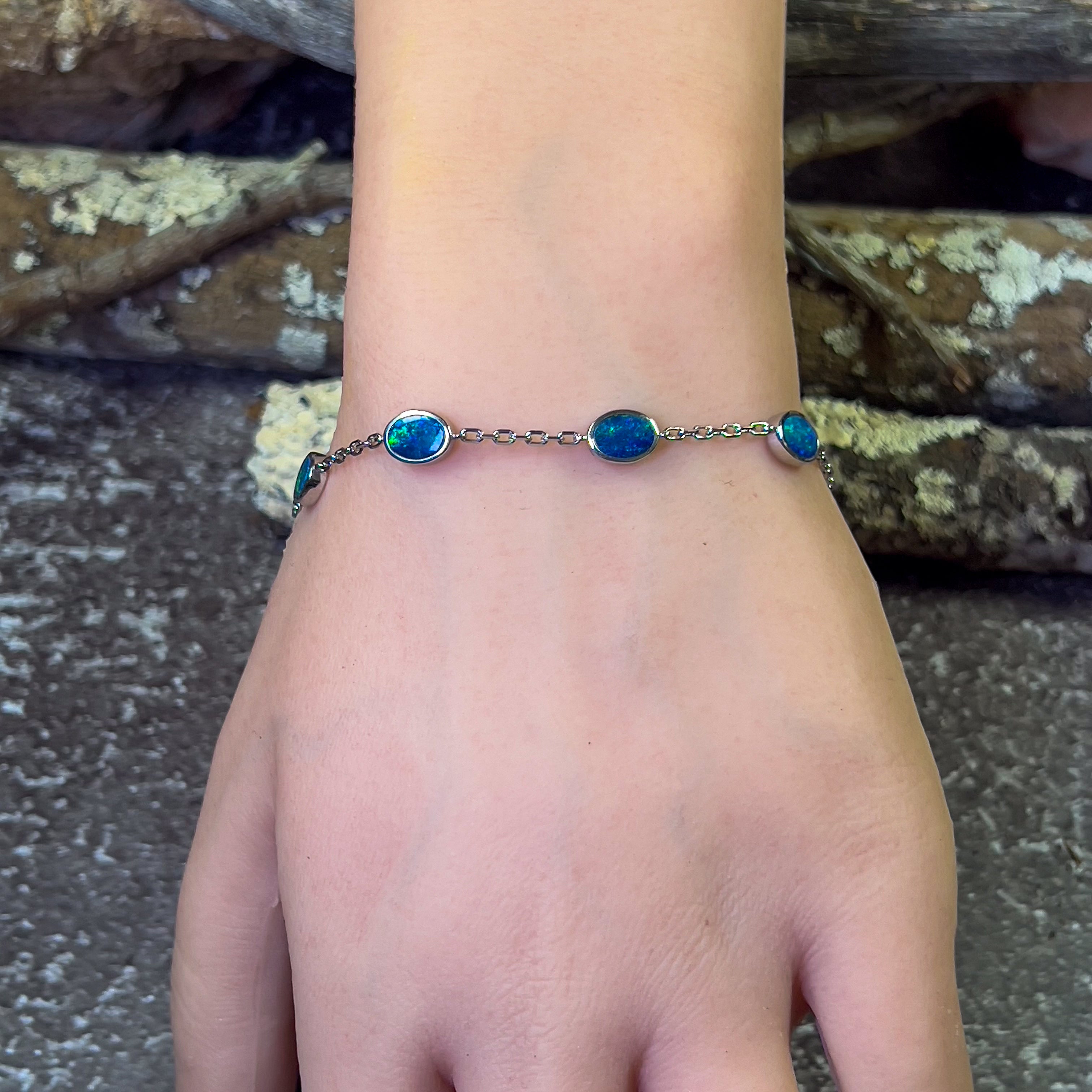 Experience the breathtaking beauty of our 18kt White Gold Blue Green Opal doublet bracelet. Featuring spaced set opals, this bracelet is a must-have for any jewelry lover. The opals are carefully placed to create a stunning and unique design, making this bracelet a true statement piece. Enhance any outfit with the iridescent hues of blue and green in this exquisite bracelet.