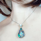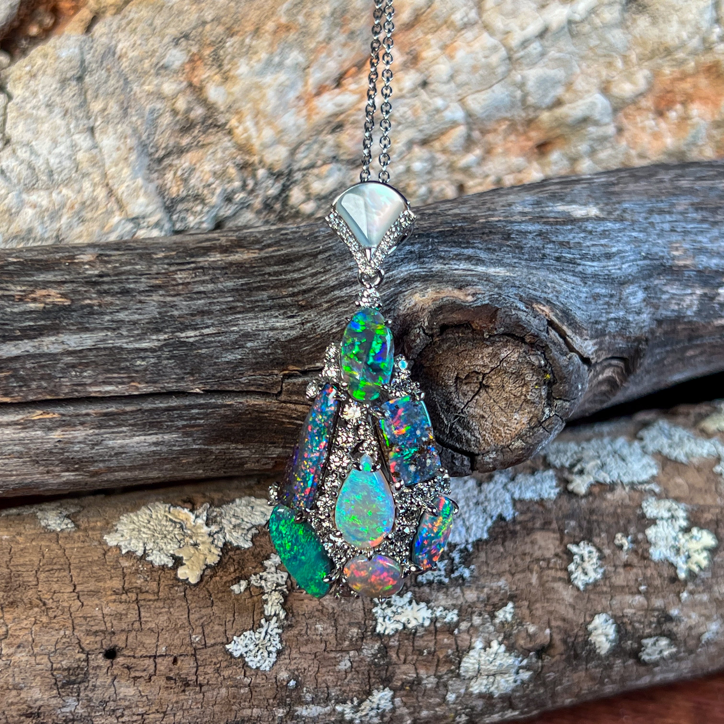 This exquisite 18kt white gold pendant showcases a stunning freeform opal drop as its captivating centrepiece, complemented by lustrous mother of pearl and sparkling diamonds in a sophisticated cluster design. Each piece is a one-of-a-kind statement that celebrates the natural beauty and iridescent play of colour unique to Australian opals. Perfect for those who appreciate fine craftsmanship and desire jewellery that truly stands out, this pendant transforms any occasion into an elegant affair while serving as a conversation-starting treasure you'll treasure for years to come.