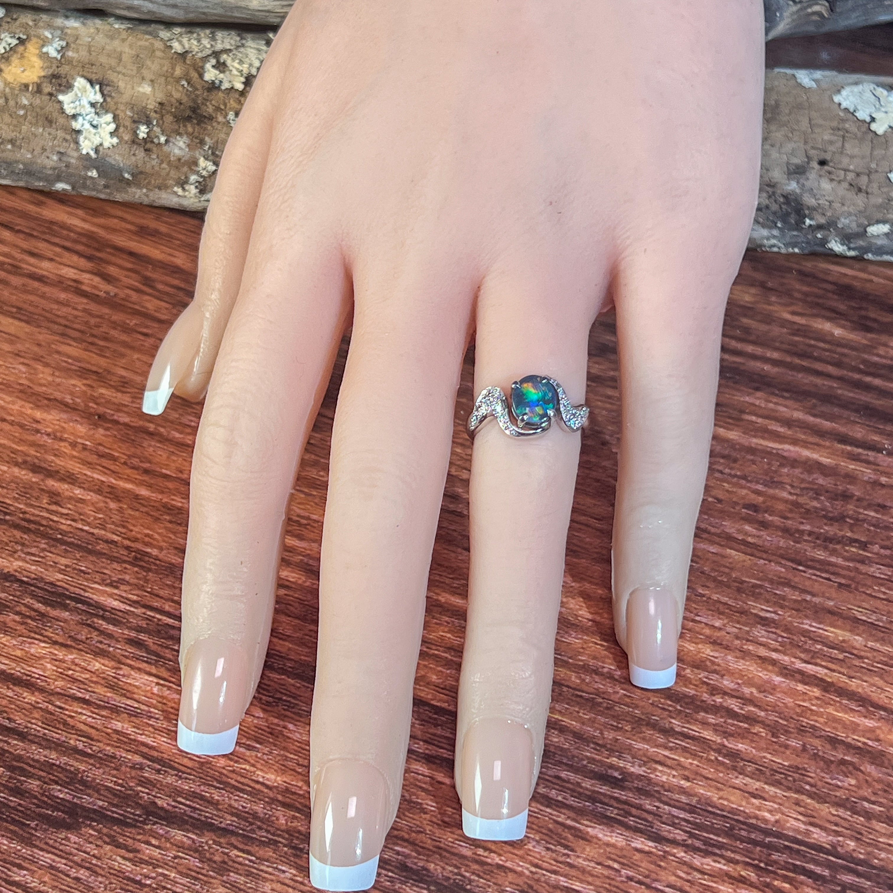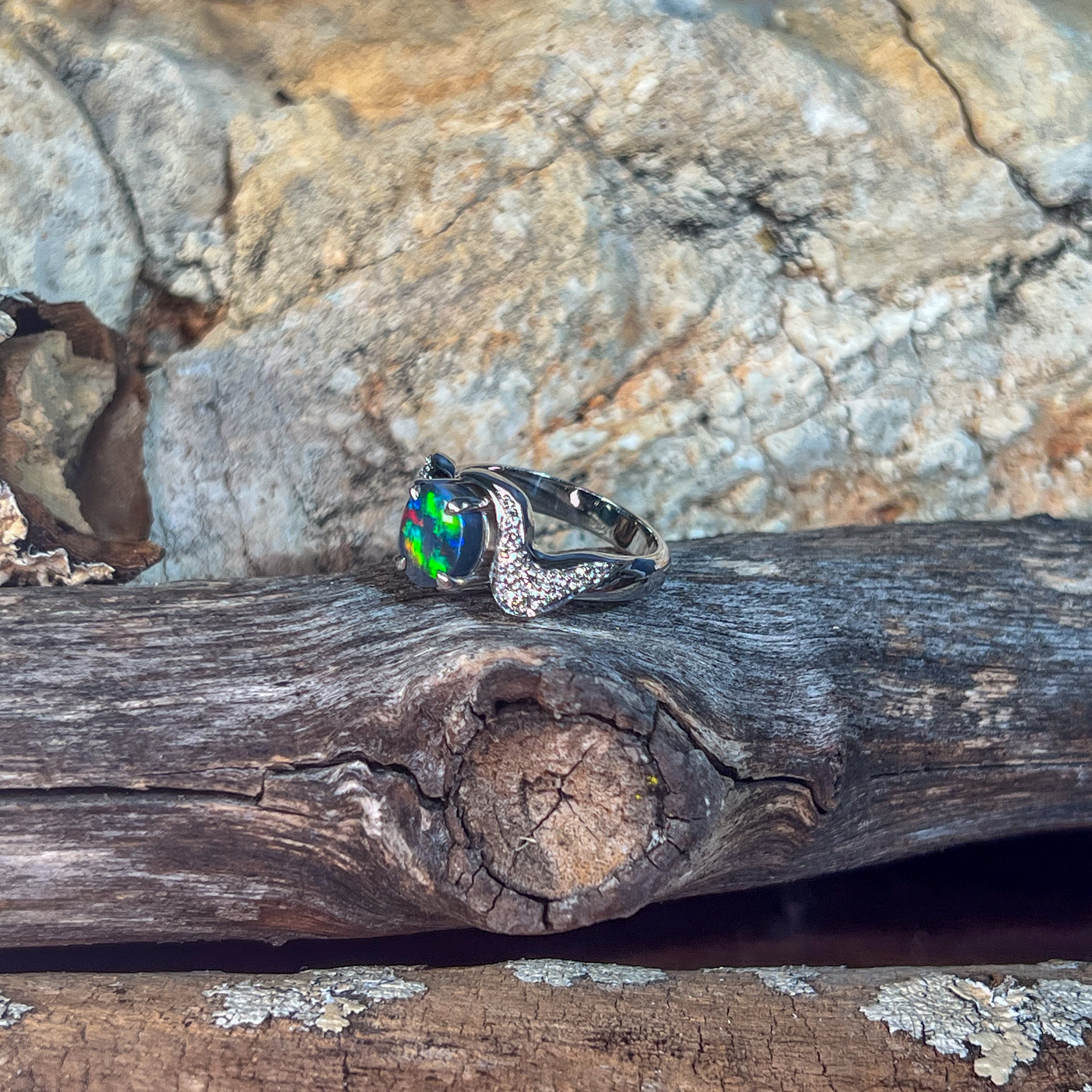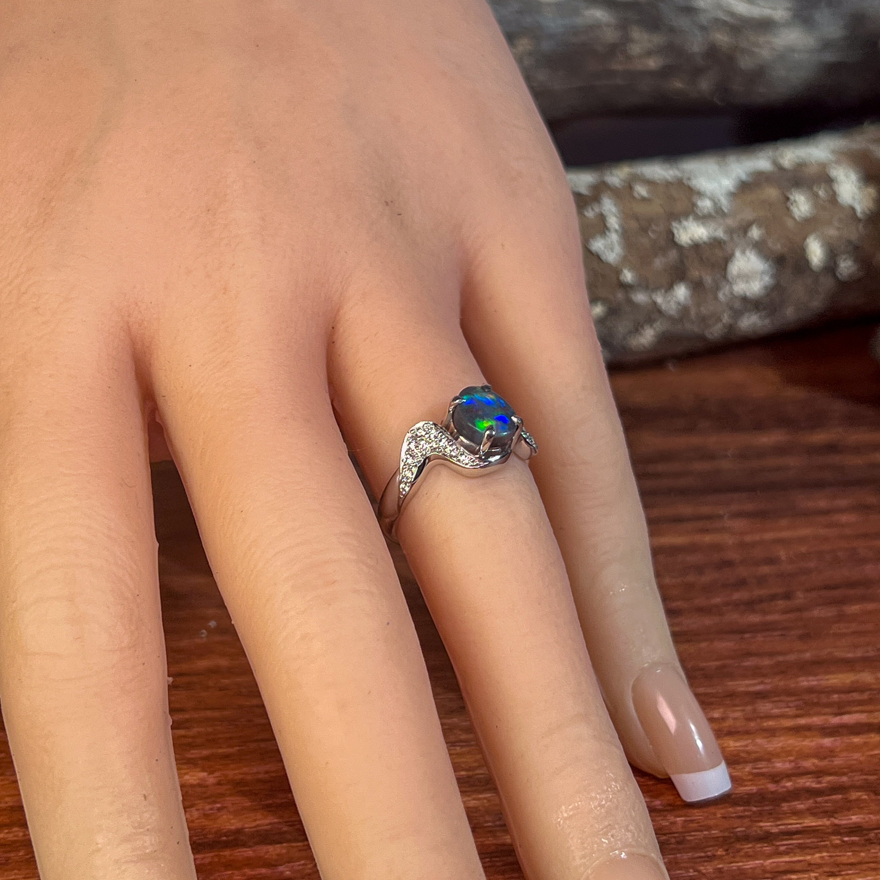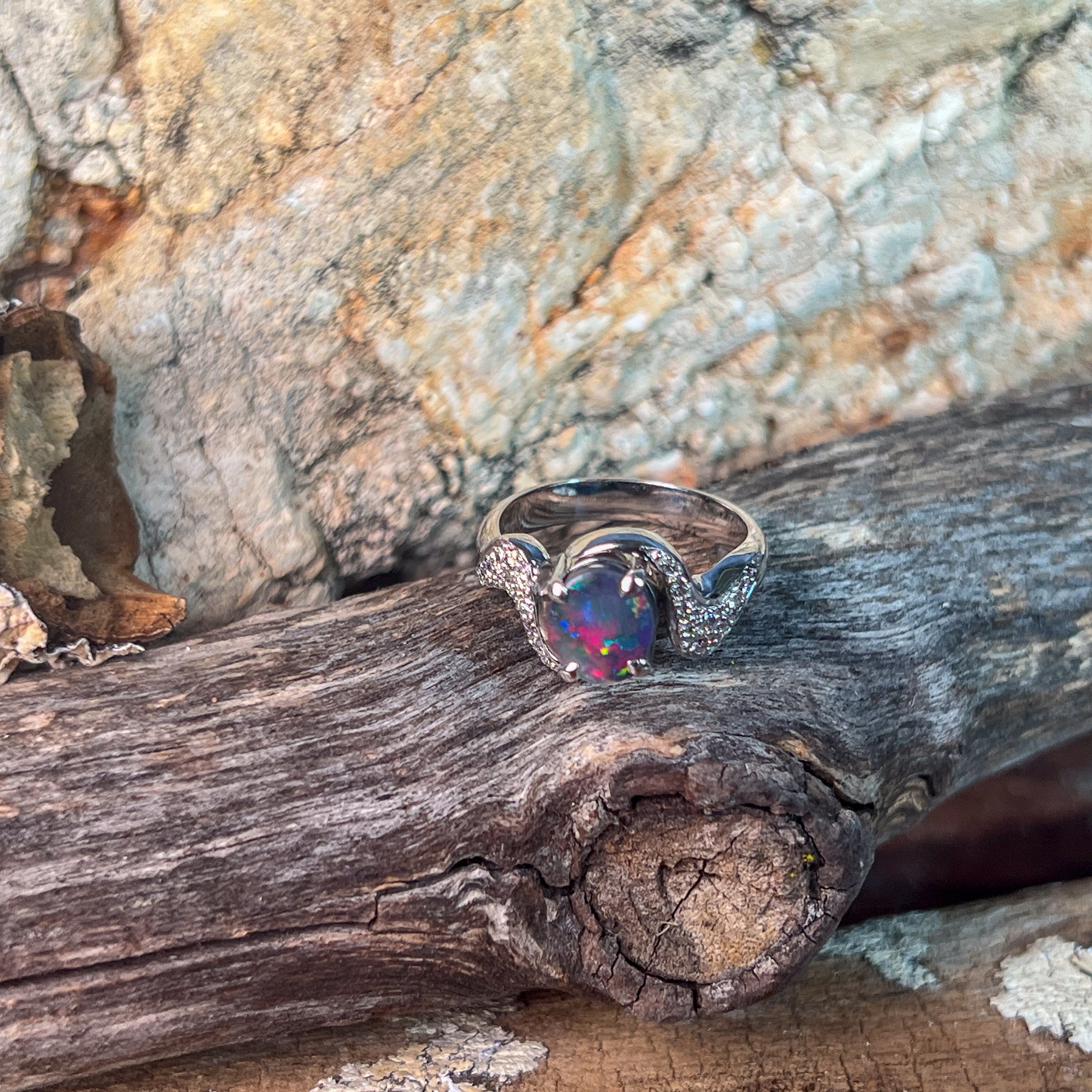 Fall in love with this exquisite 18kt White Gold curved band Black Opal and diamond ring! Crafted with a stunning opal stone, this engagement ring combines classic elegance with a unique touch. The perfect symbol of your love and commitment, this ring will surely take her breath away. Limited quantities available.