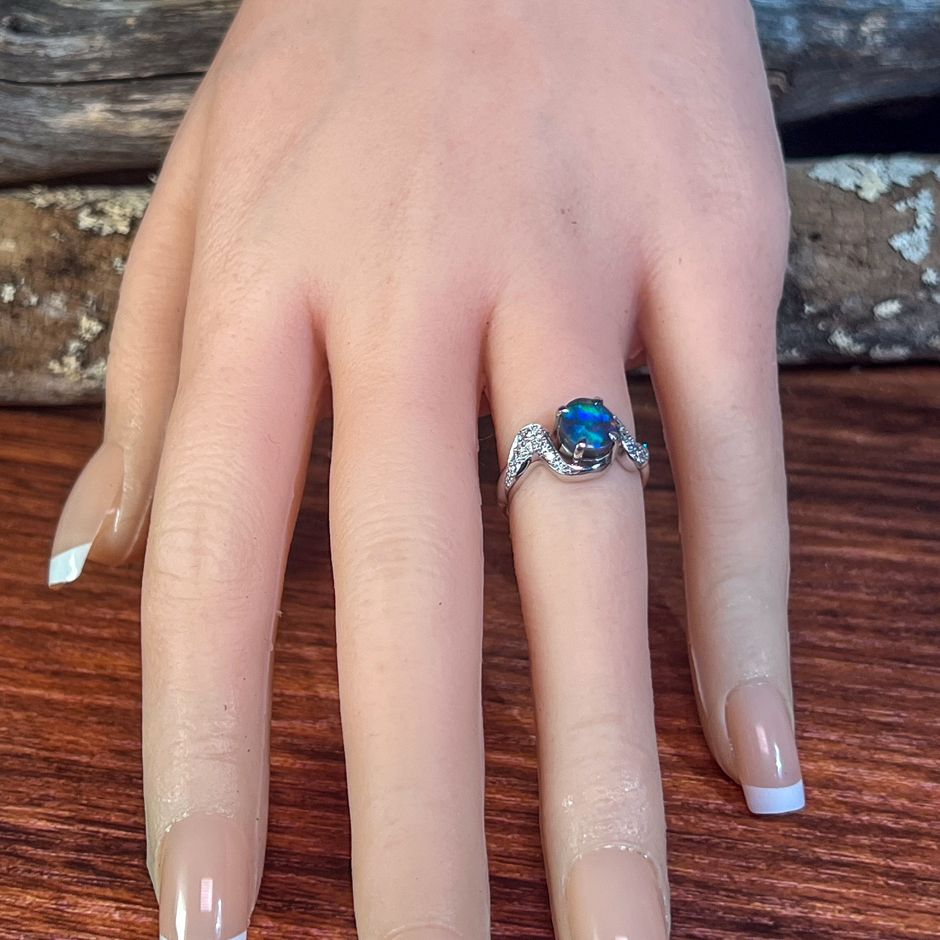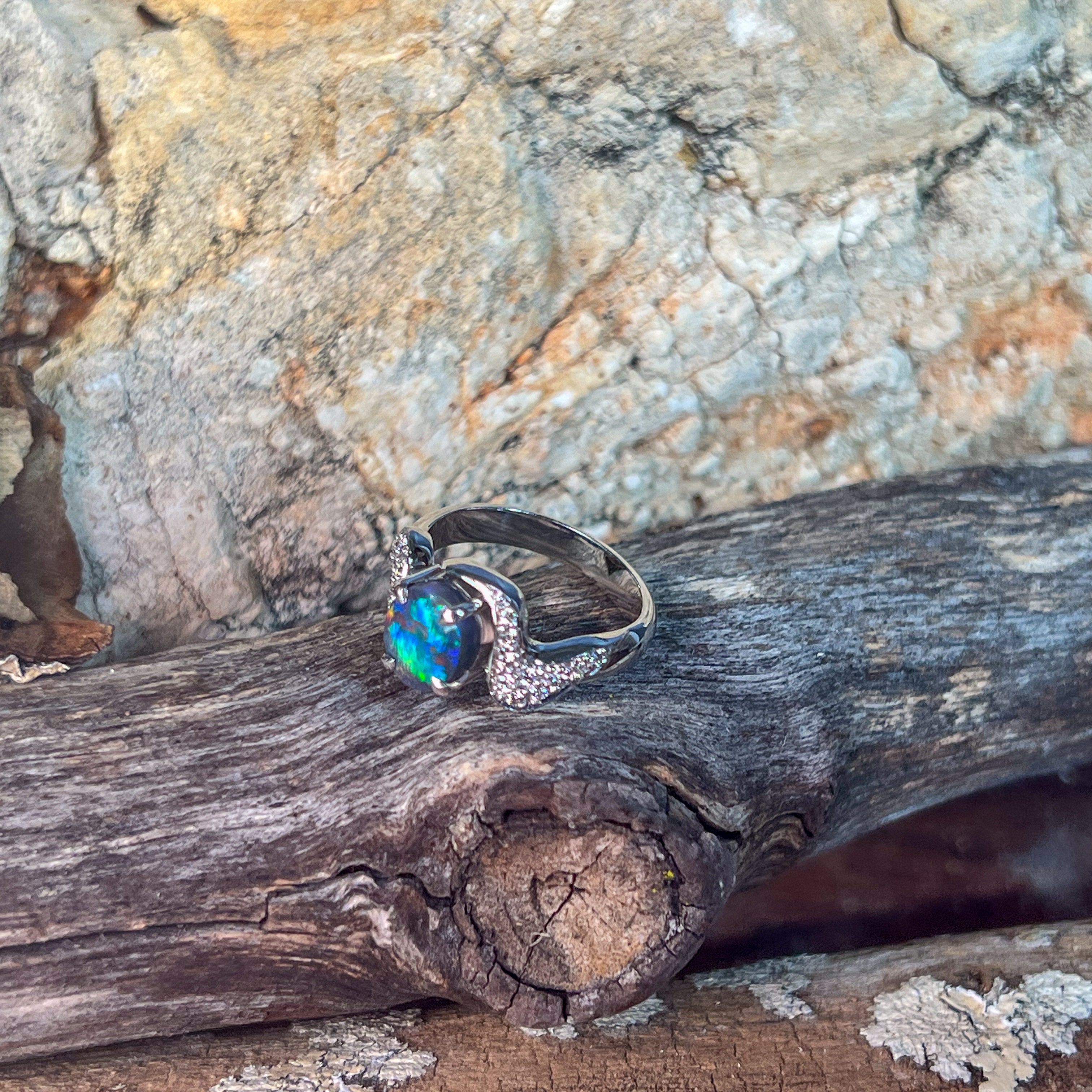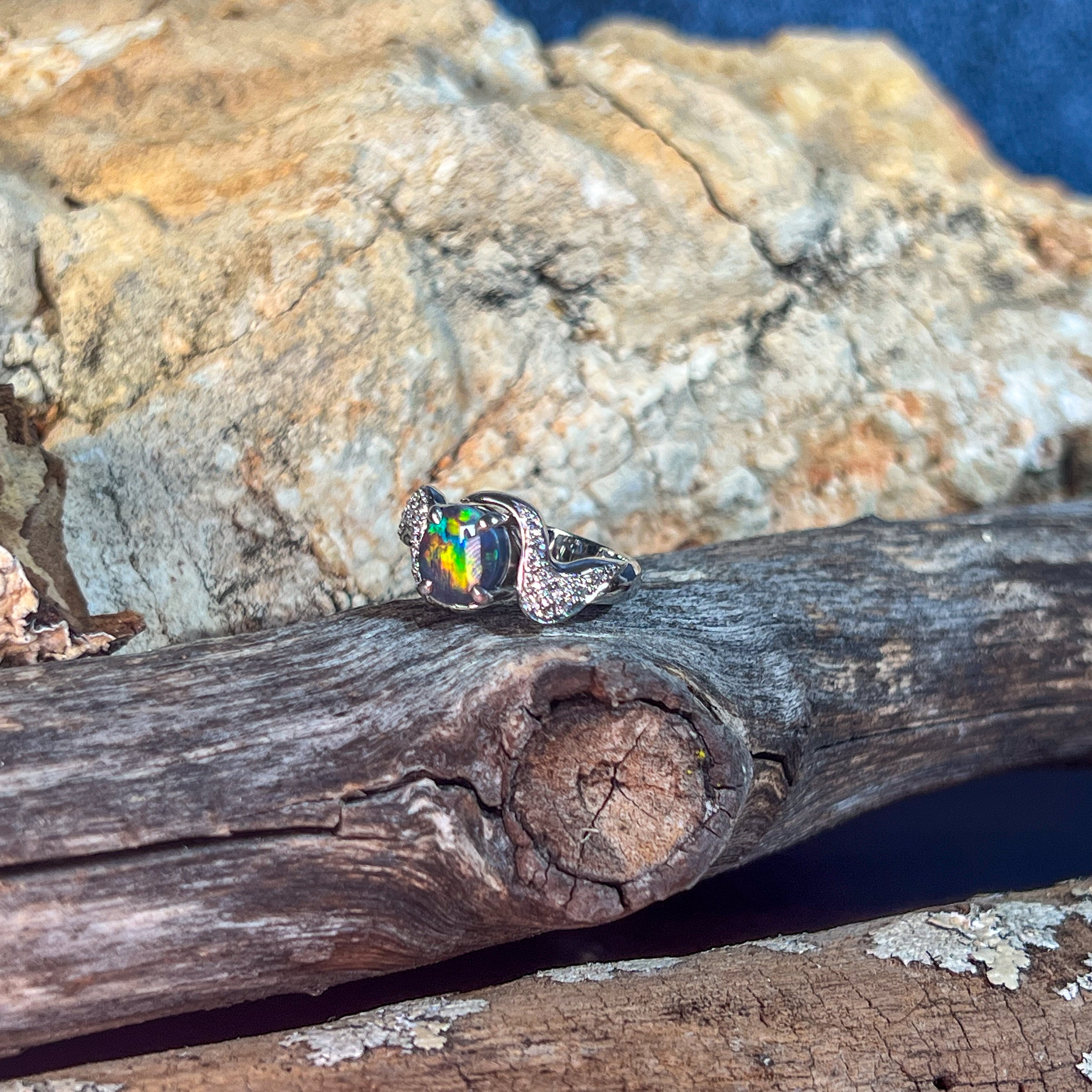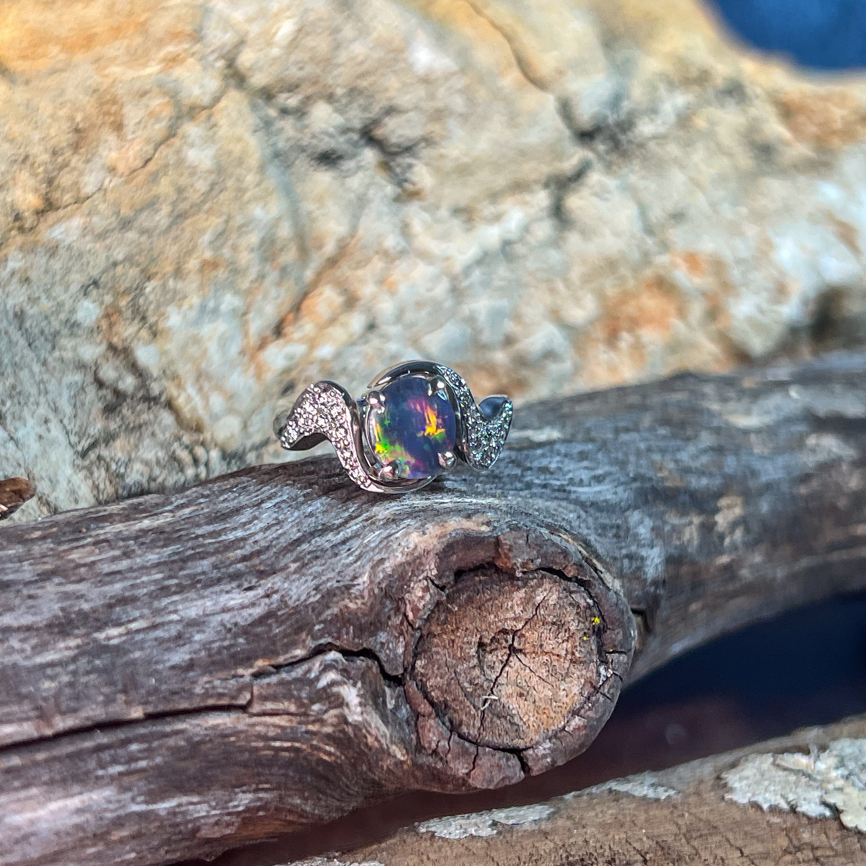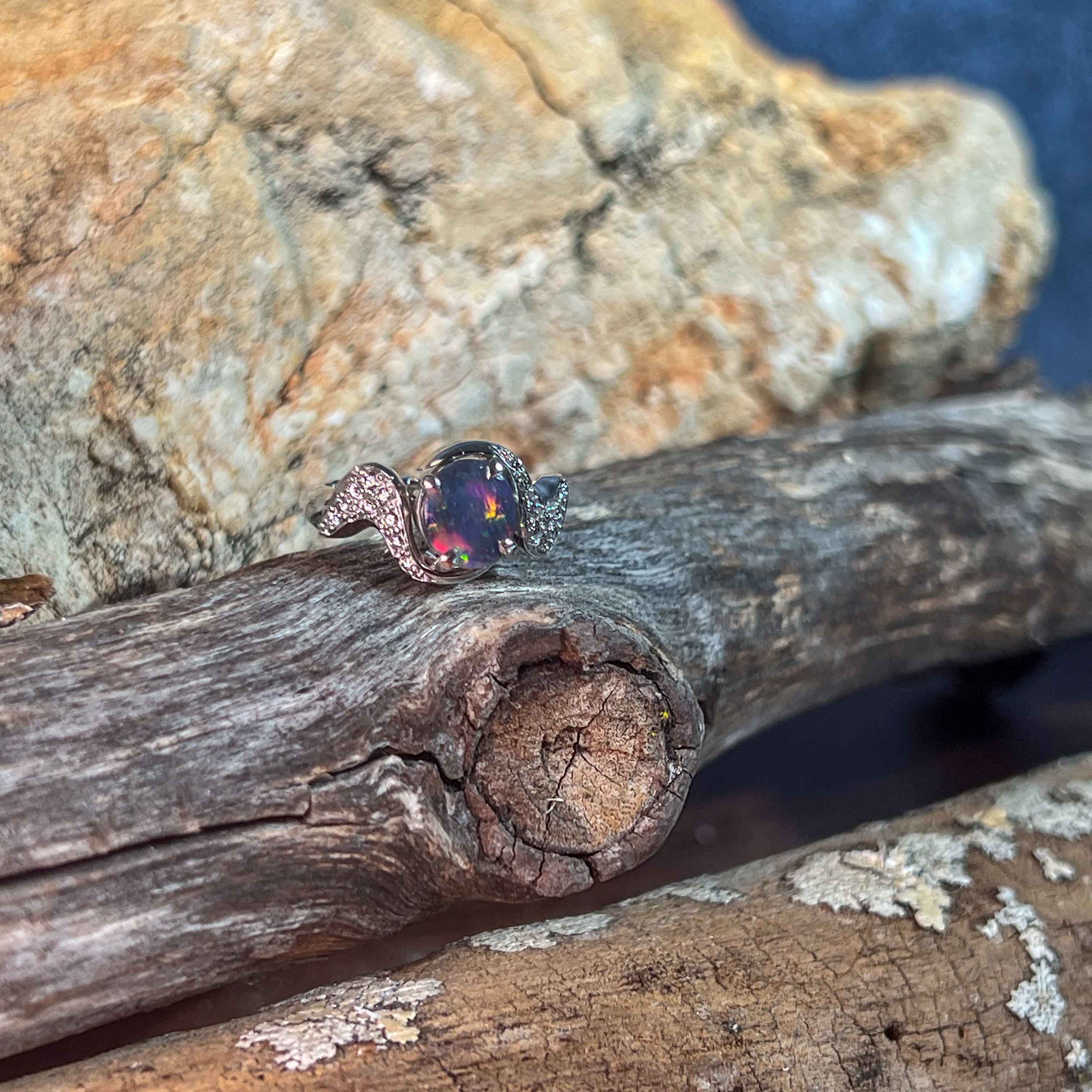 Fall in love with this exquisite 18kt White Gold curved band Black Opal and diamond ring! Crafted with a stunning opal stone, this engagement ring combines classic elegance with a unique touch. The perfect symbol of your love and commitment, this ring will surely take her breath away. Limited quantities available.