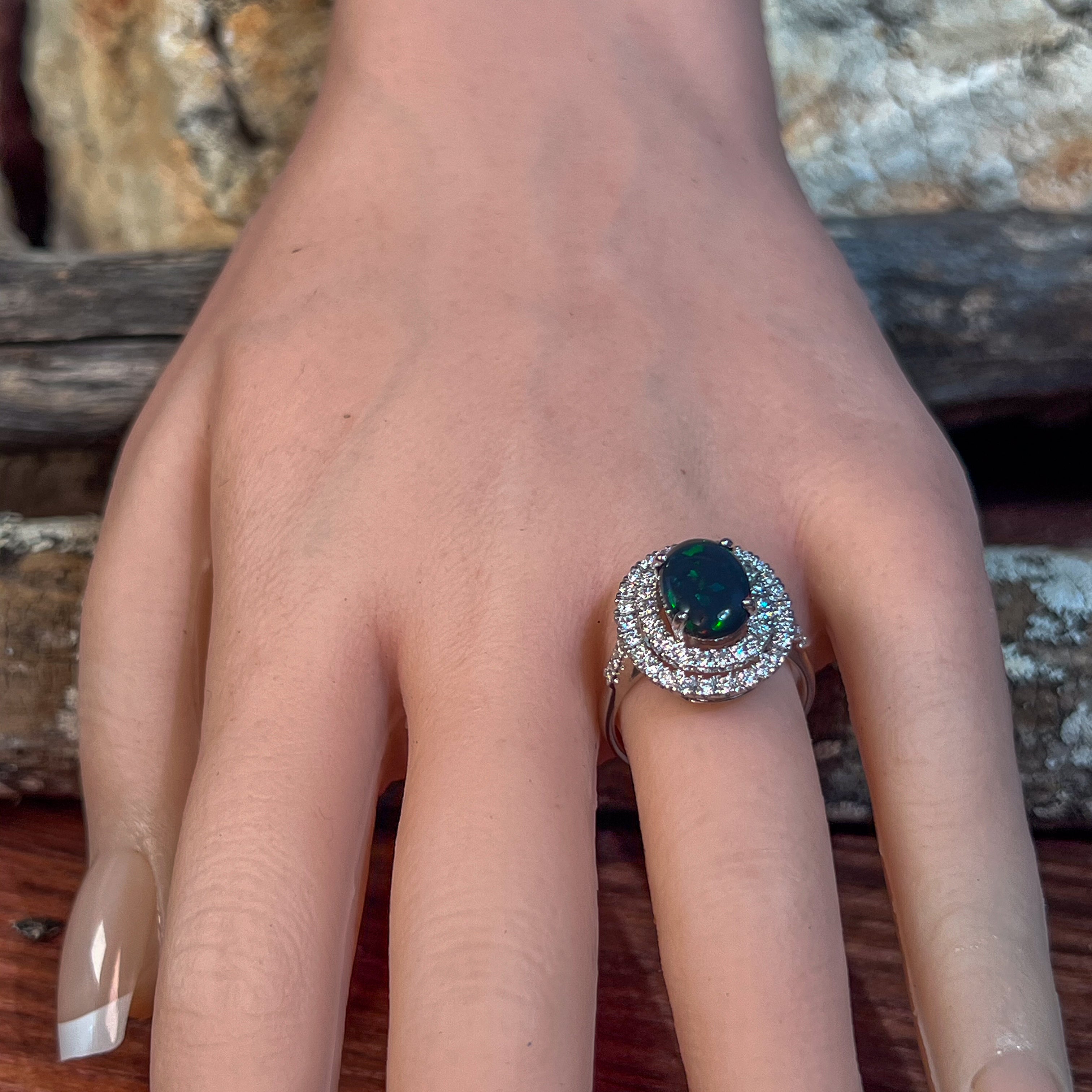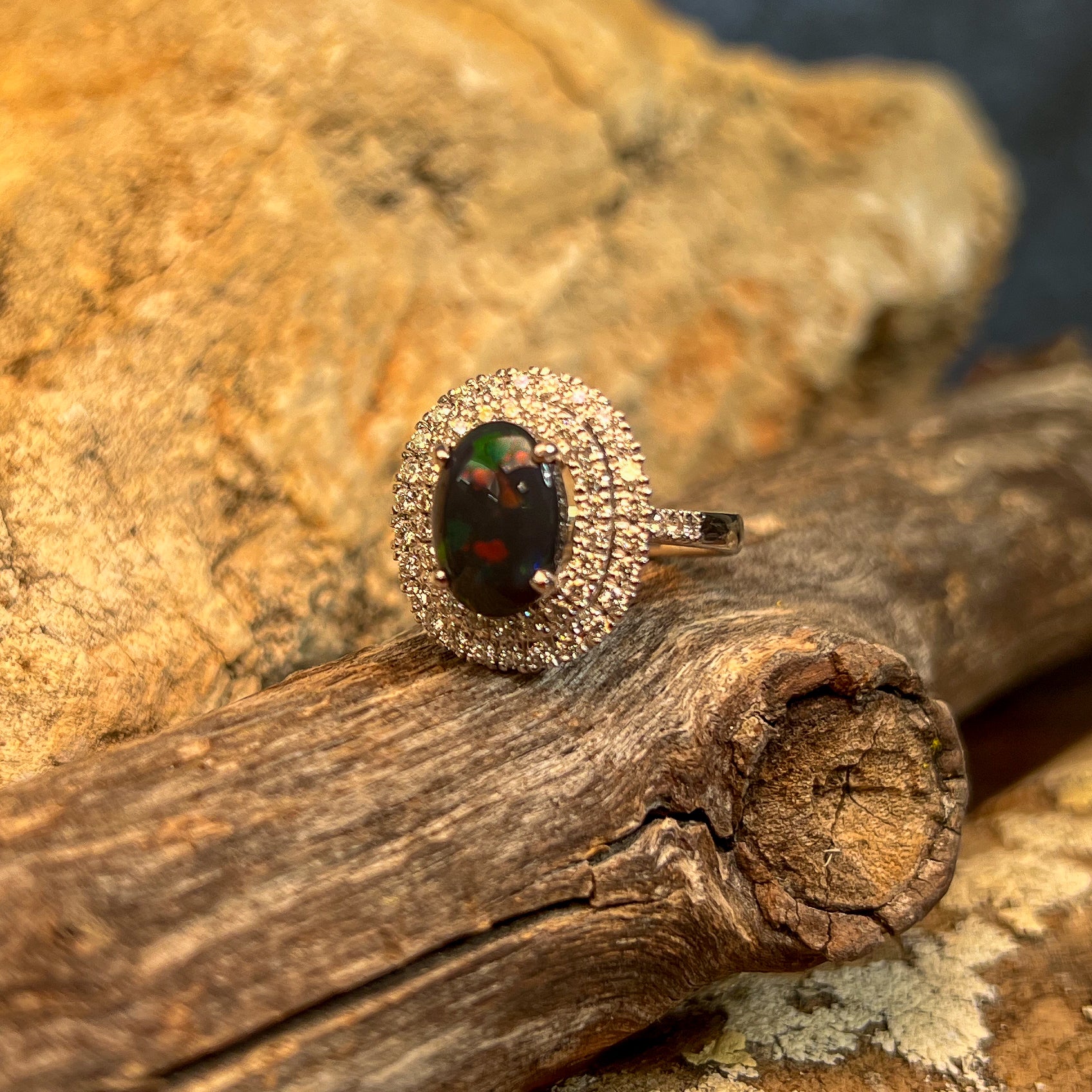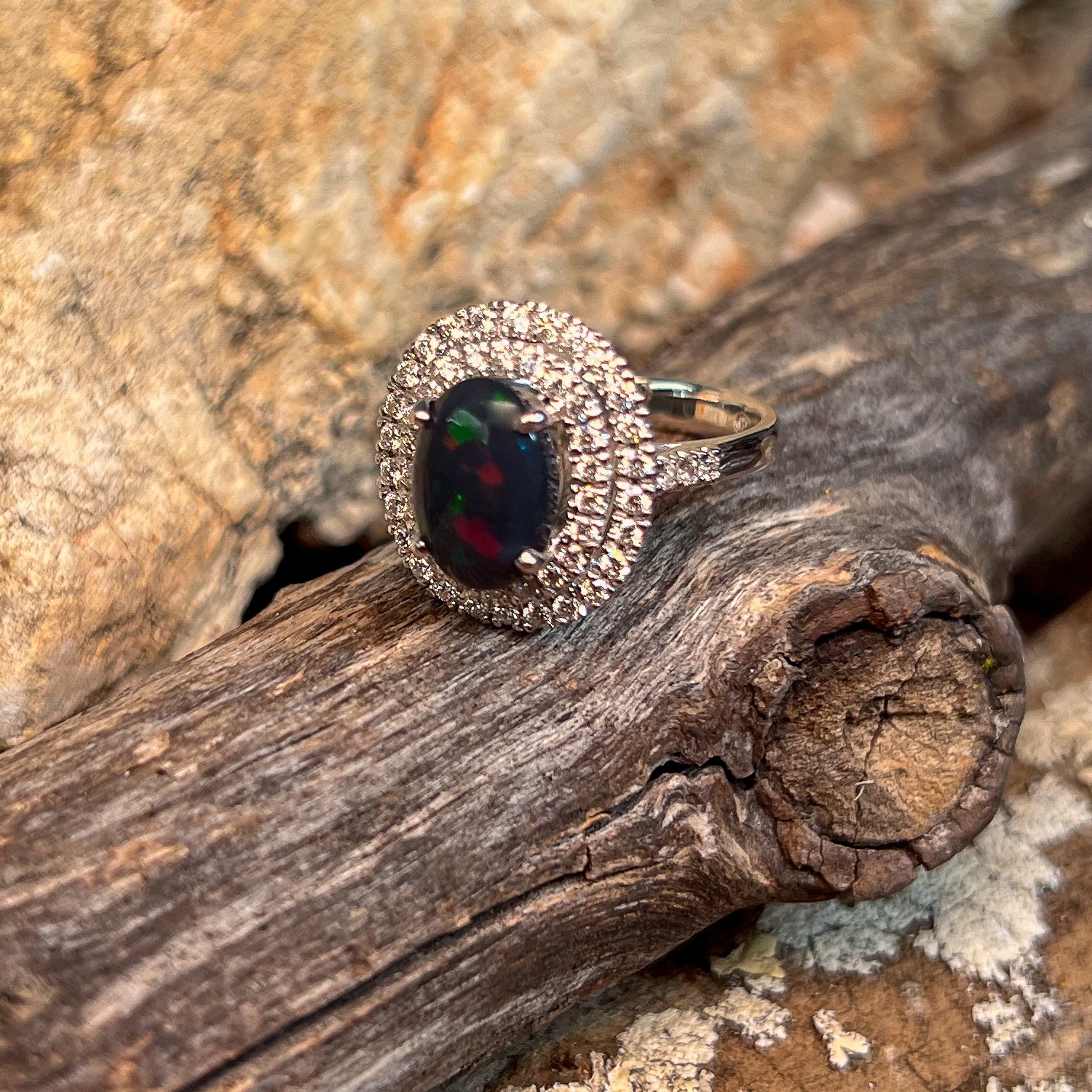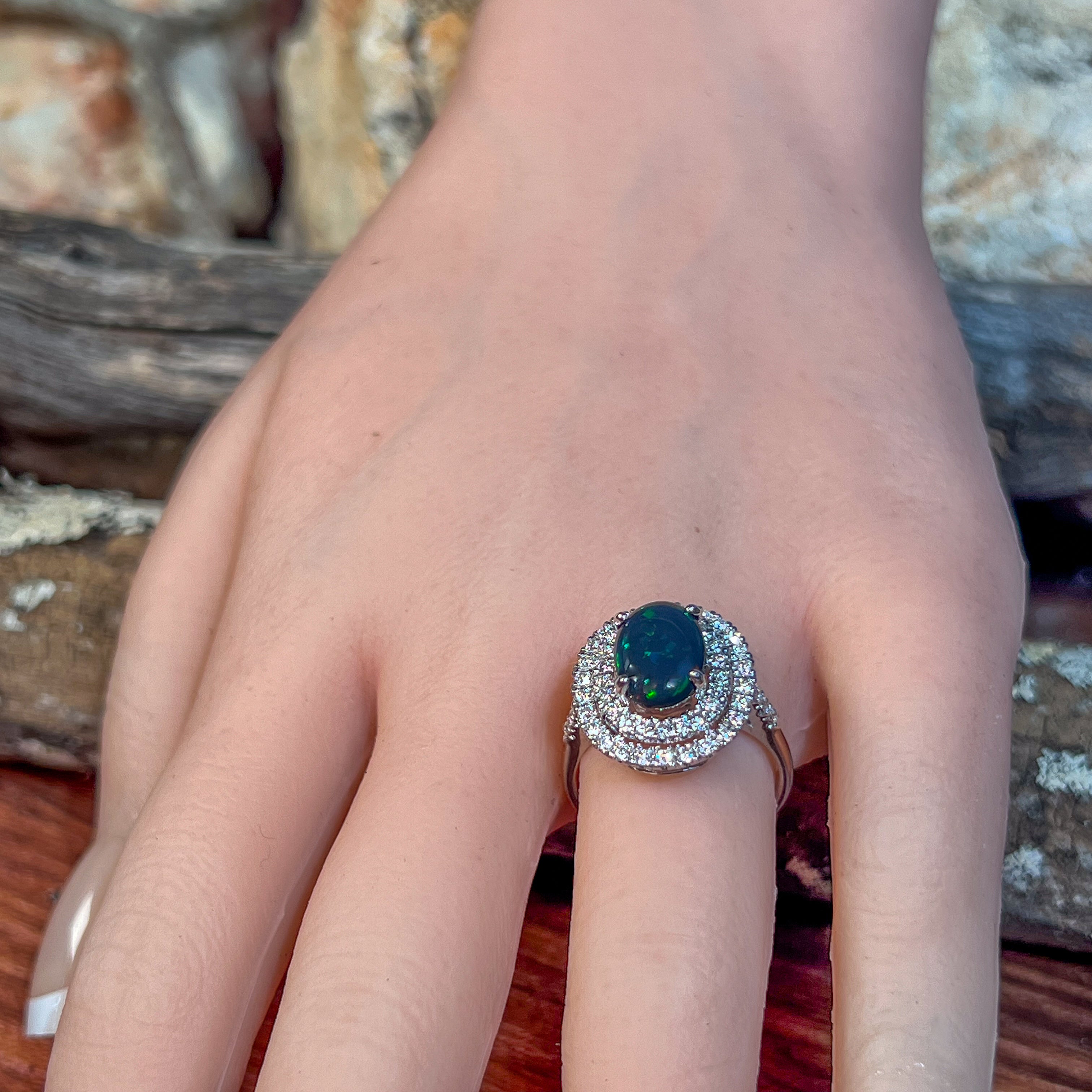 18kt White Gold double halo Black Opal and diamond ring