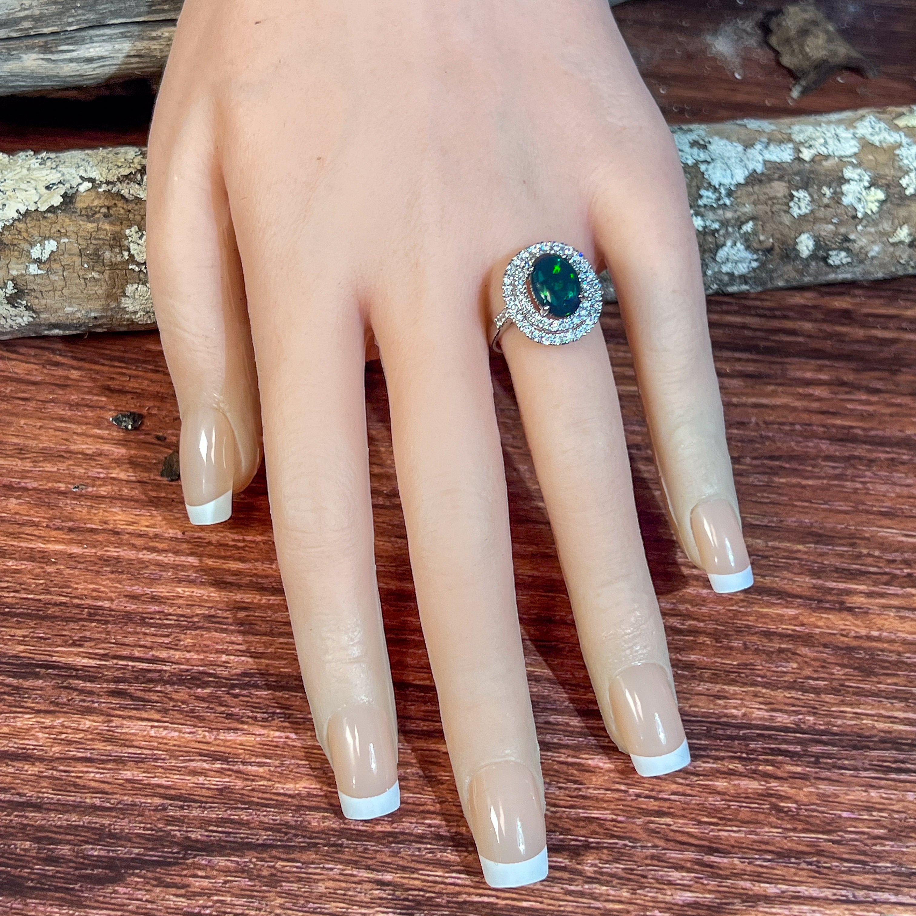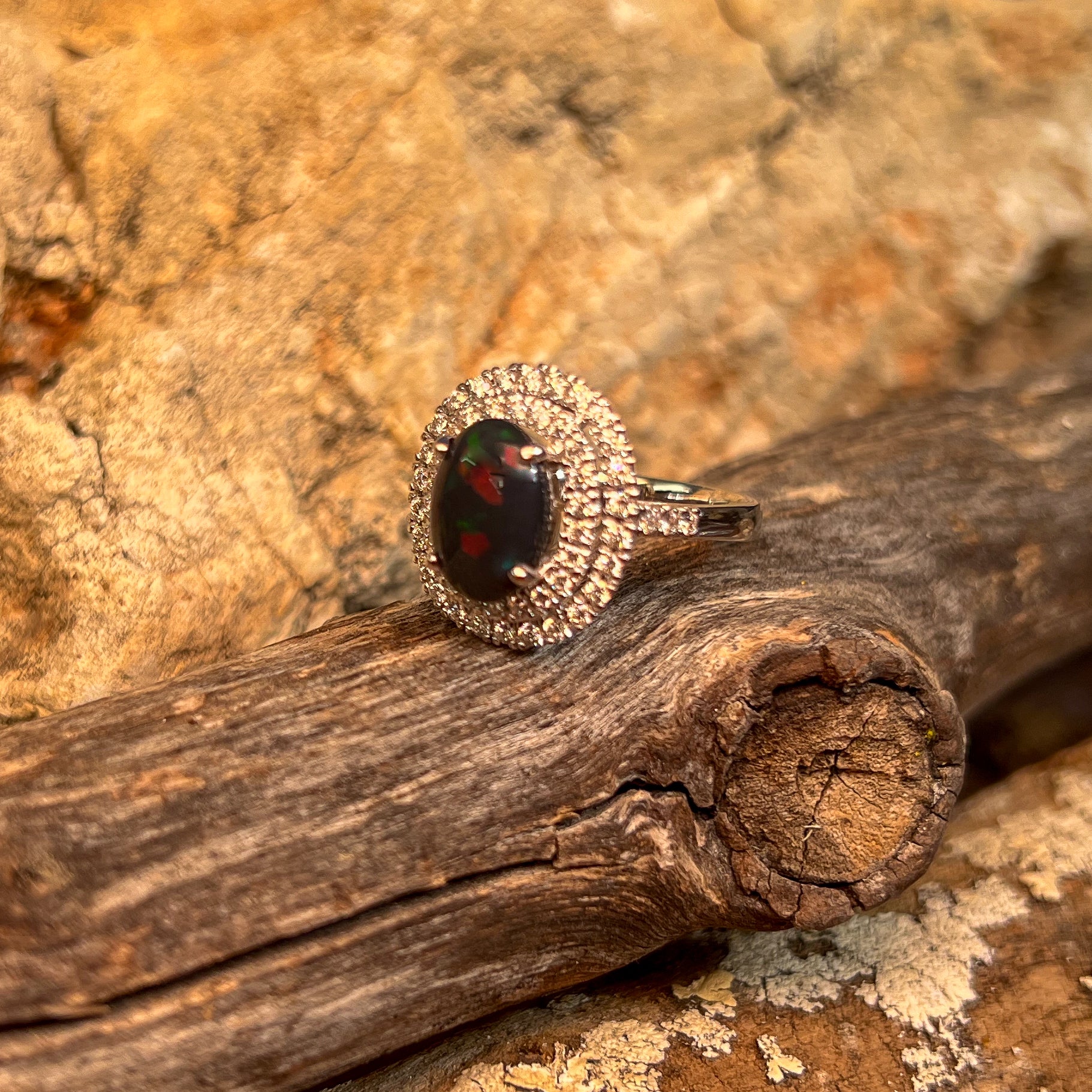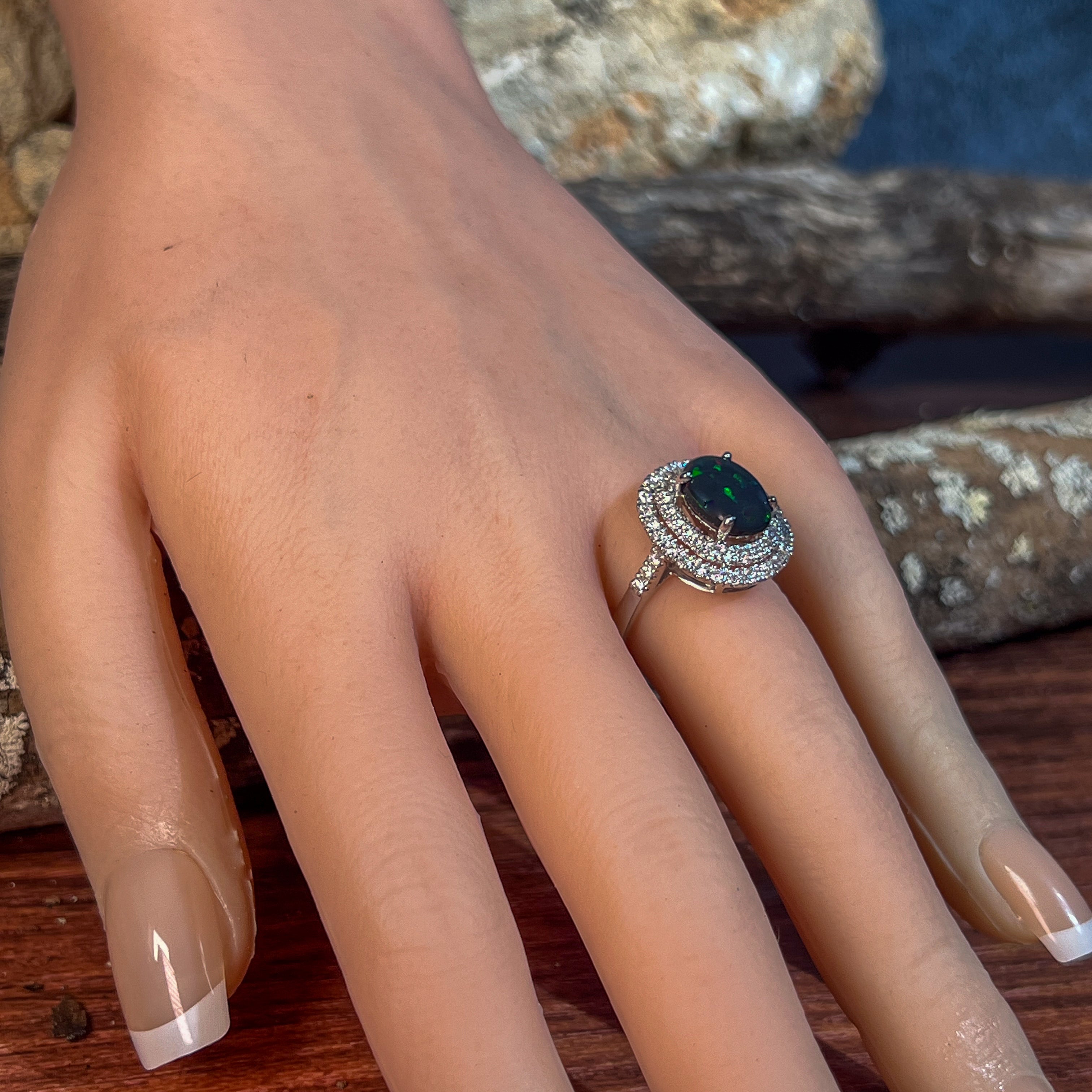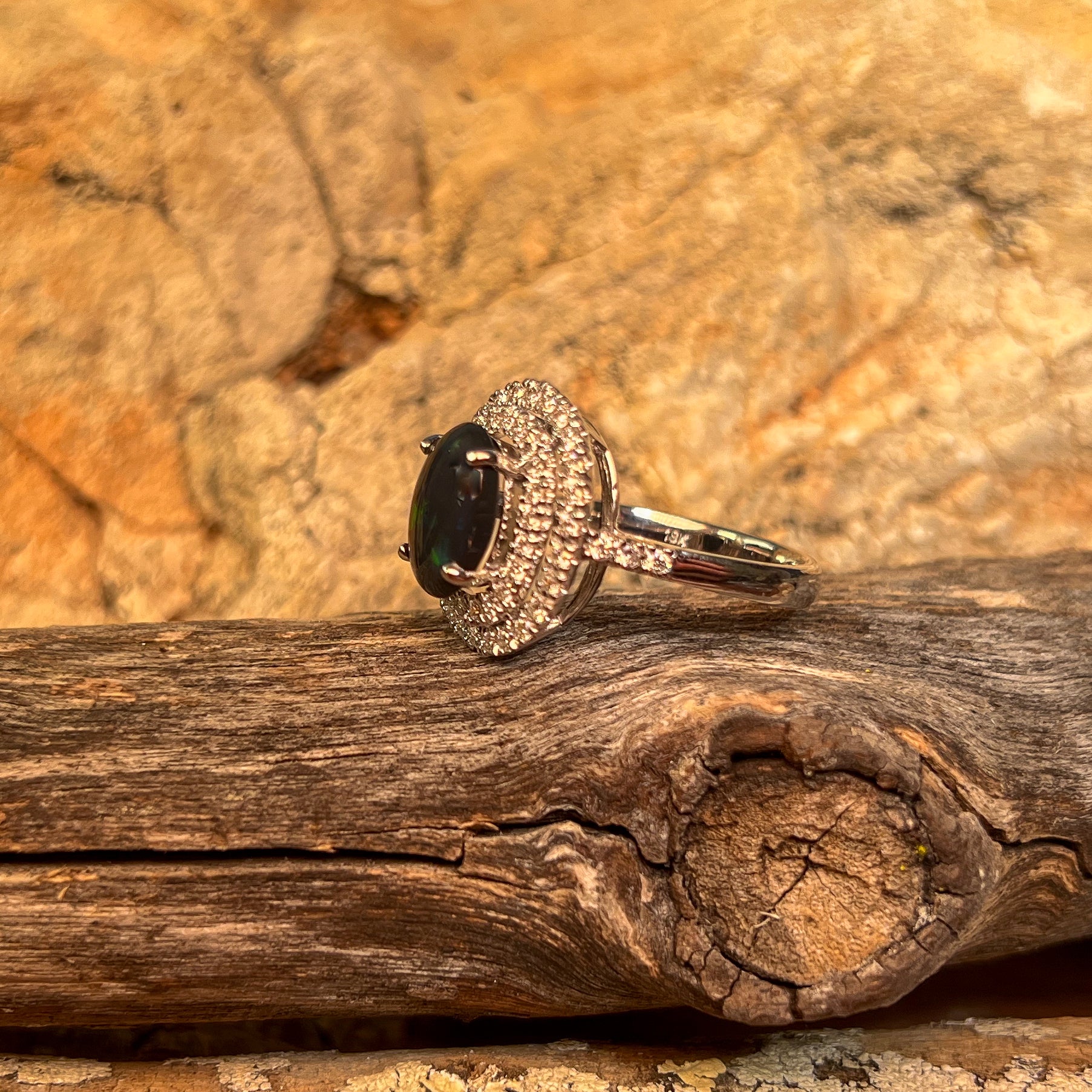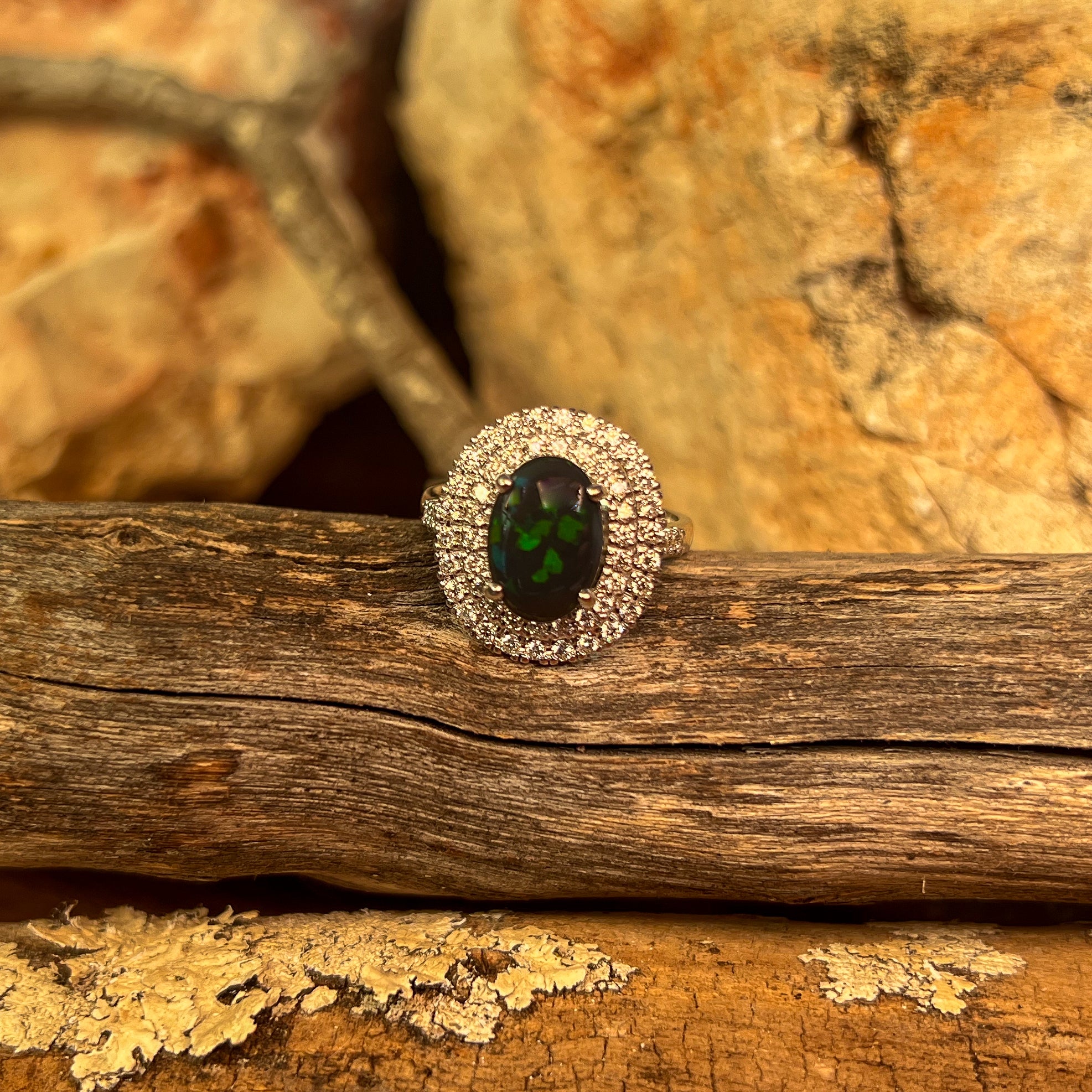 18kt White Gold double halo Black Opal and diamond ring
