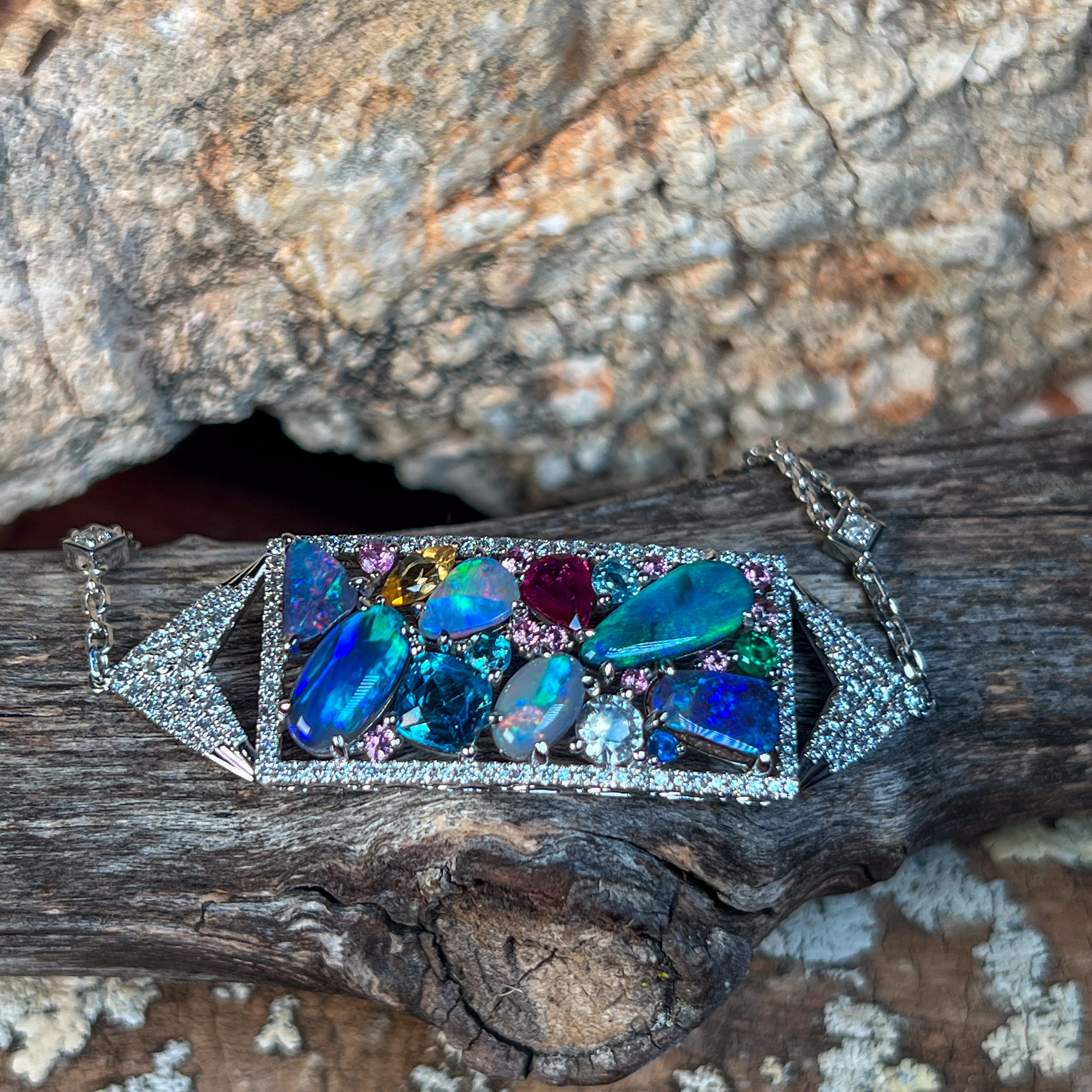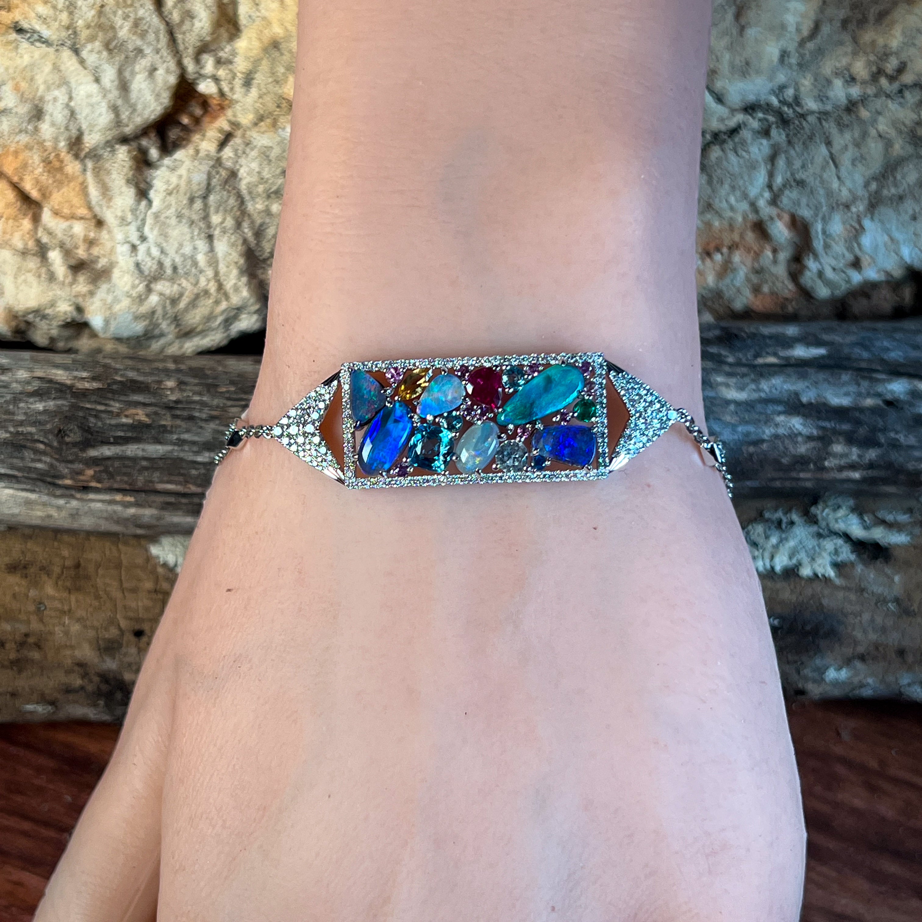 Celebrate the magic of Sydney's iconic fireworks with this stunning 18kt white gold bracelet, featuring vibrant opals and colour gems that sparkle like the night sky. Each stone is expertly set to capture the brilliance and movement of New Year's Eve celebrations, making it the perfect statement piece for ringing in fresh beginnings. Whether you're watching from the Harbour or dancing into the new year, this designer bracelet adds elegance and glamour to your festive moments. A timeless keepsake that transforms any occasion into something truly unforgettable.