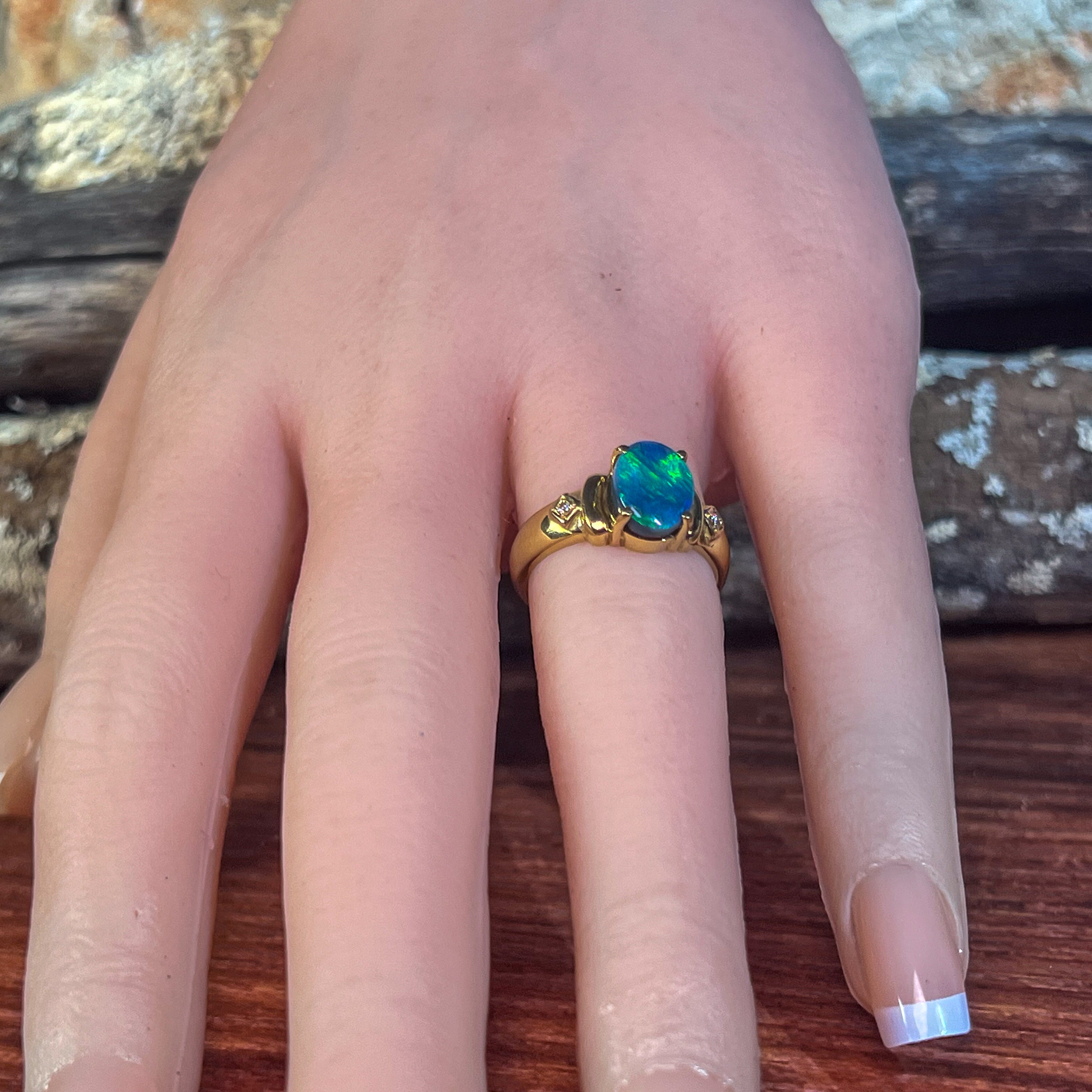 Get ready to mesmerize with this 18kt yellow gold ring featuring a beautiful 1.52ct black opal with a striking green stripe pattern. Two dazzling diamonds add the perfect touch of sparkle. Whether it's an engagement or an everyday accessory, this ring is sure to make a statement.