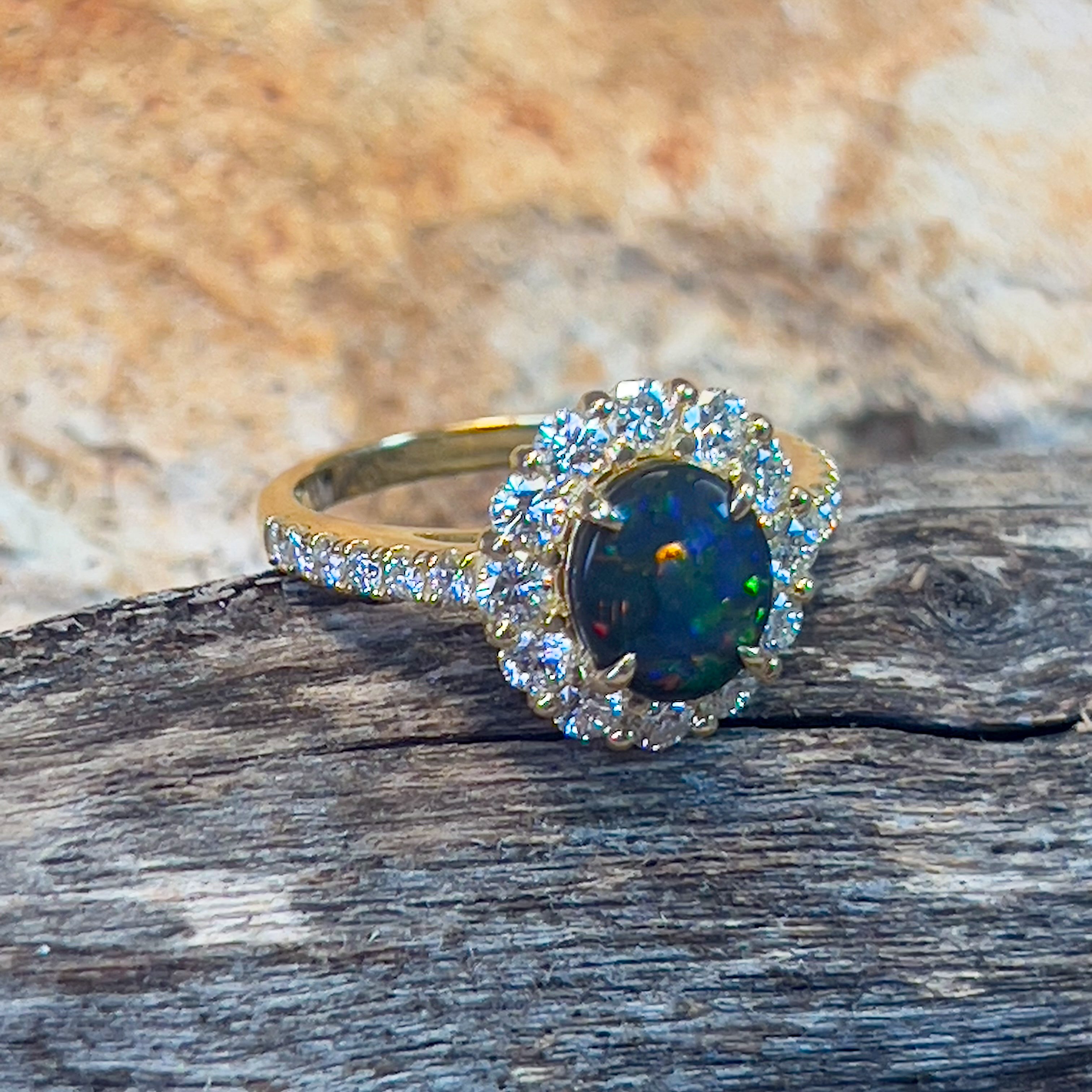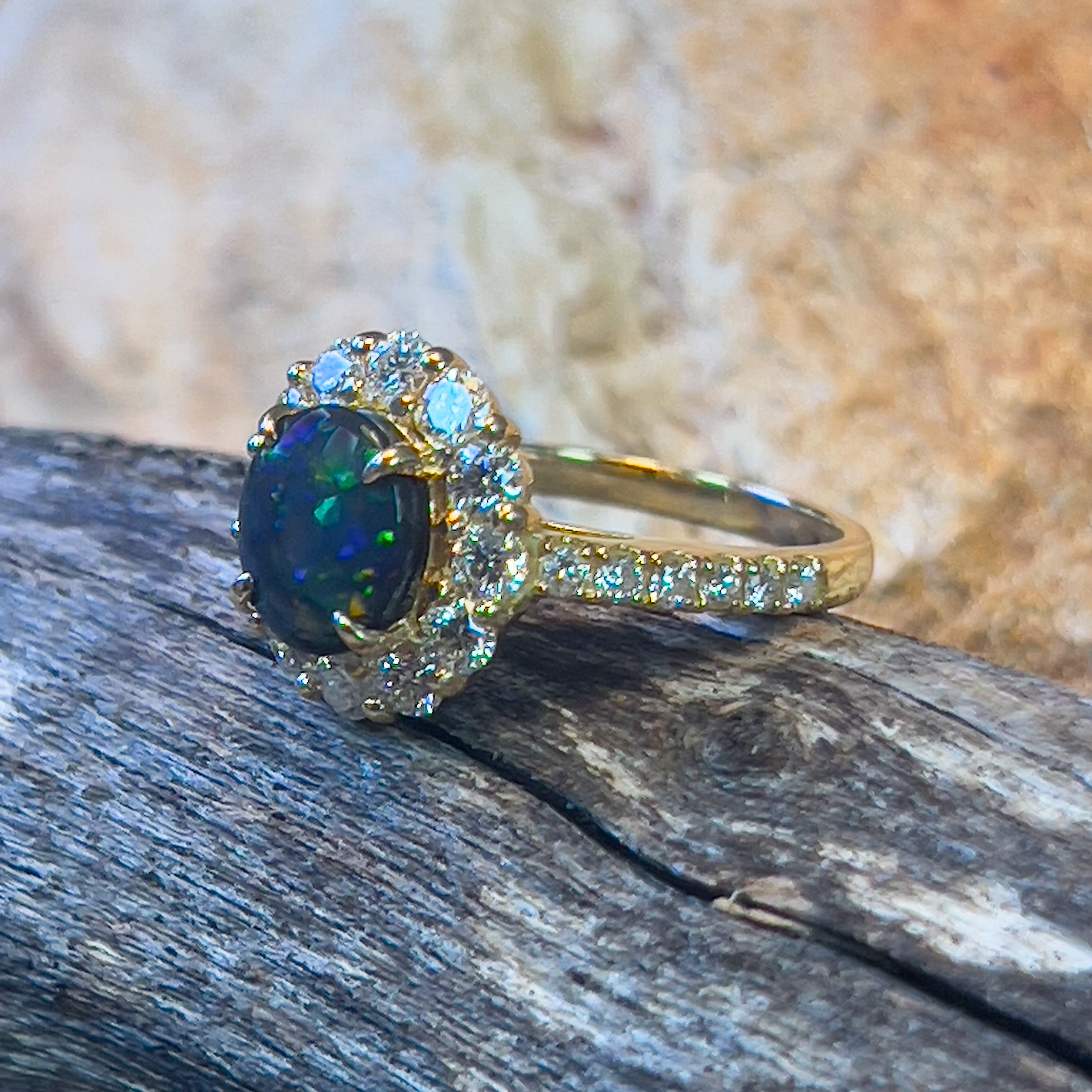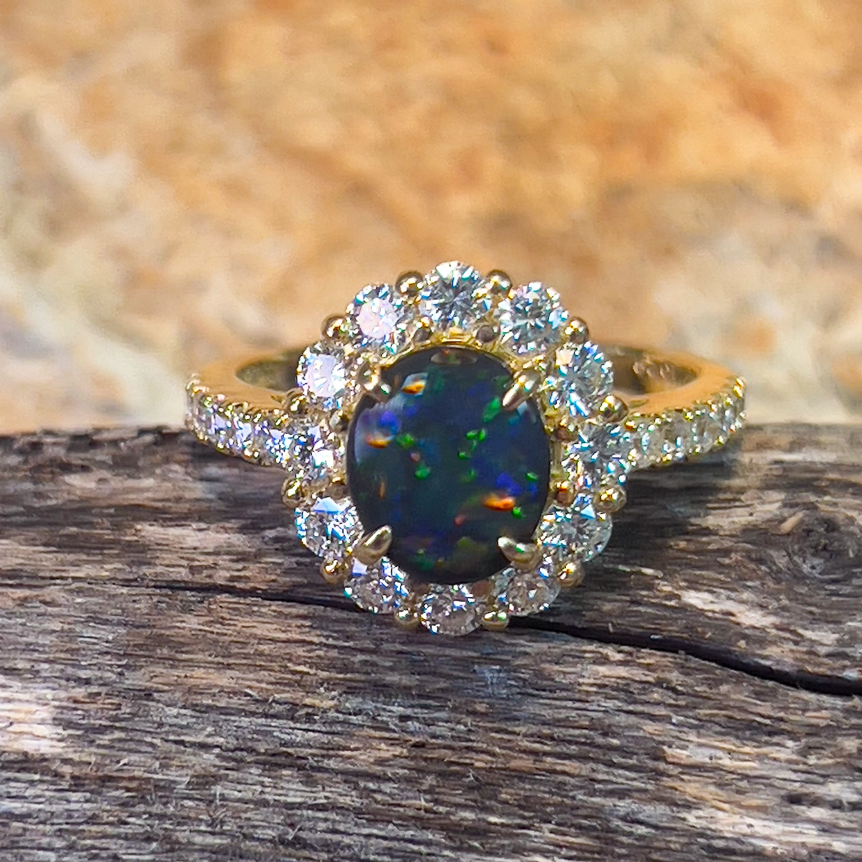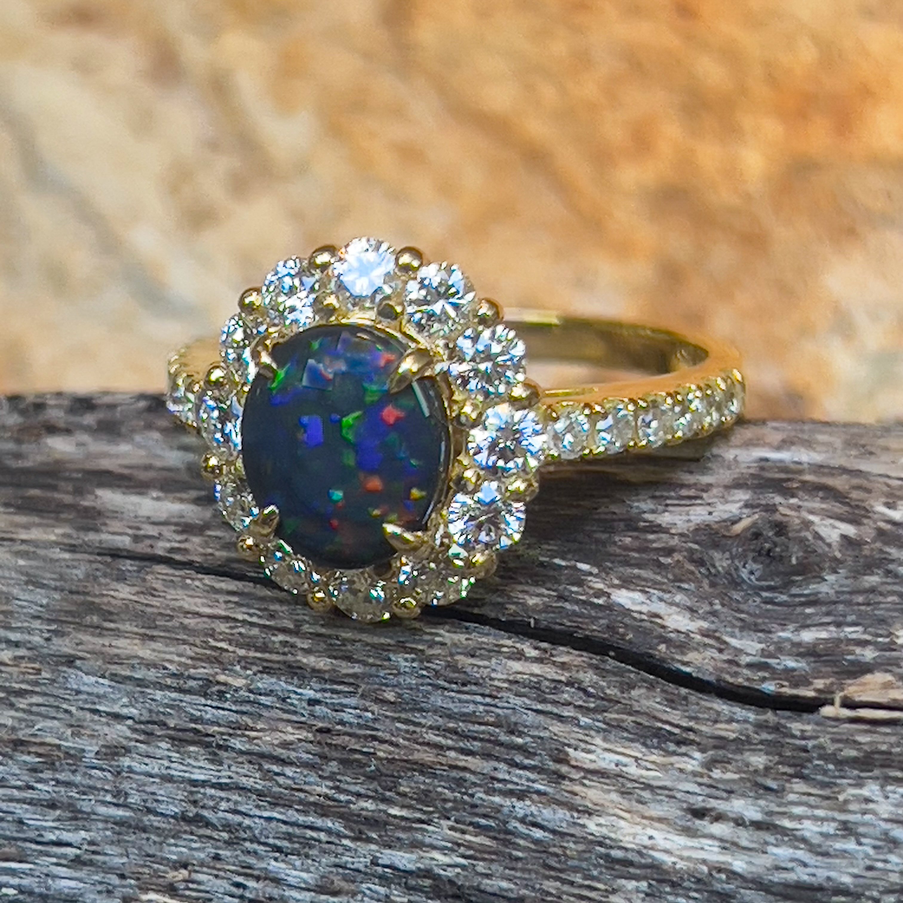 18kt Yellow Gold cluster ring Black Opal 1.03 Diamonds 0.88ct