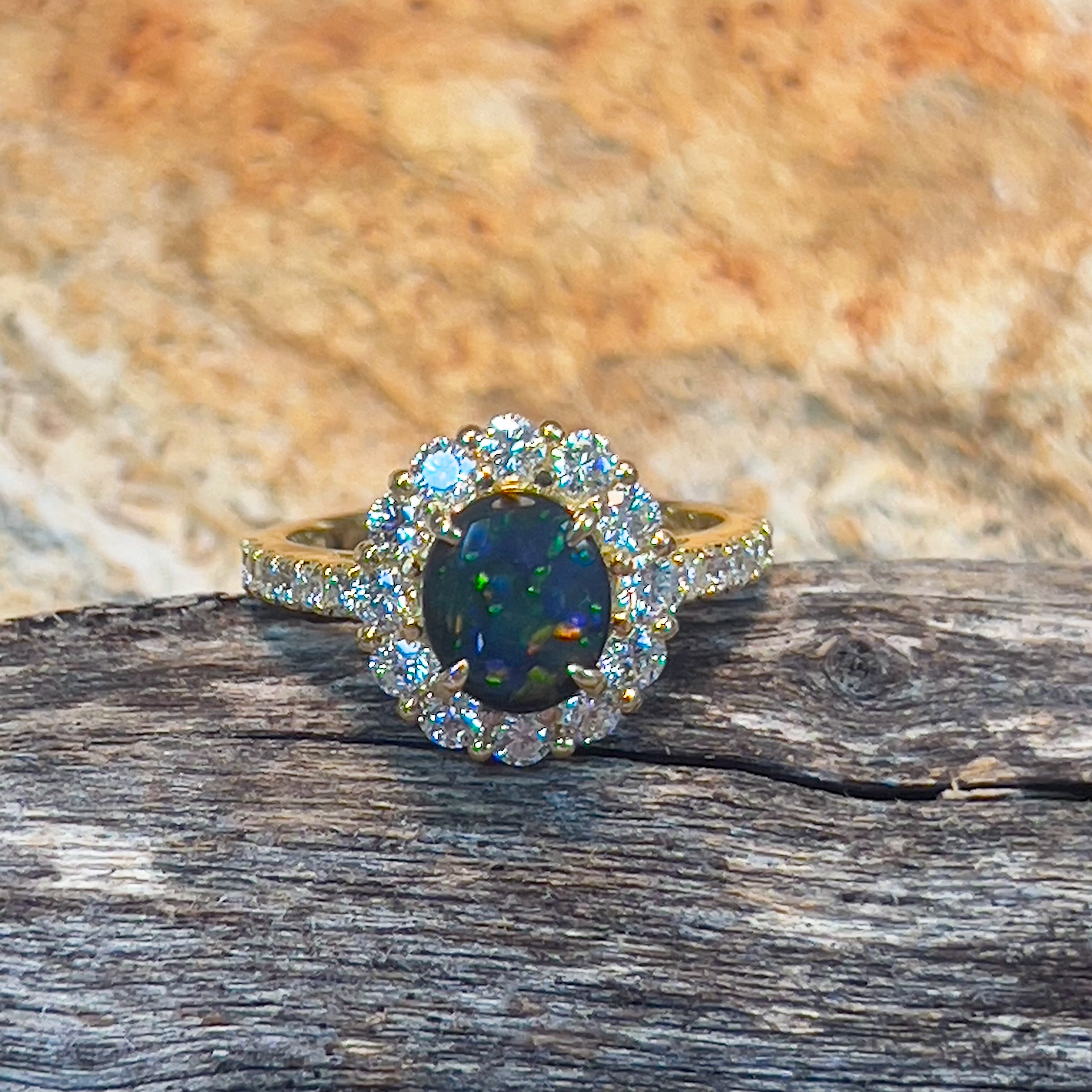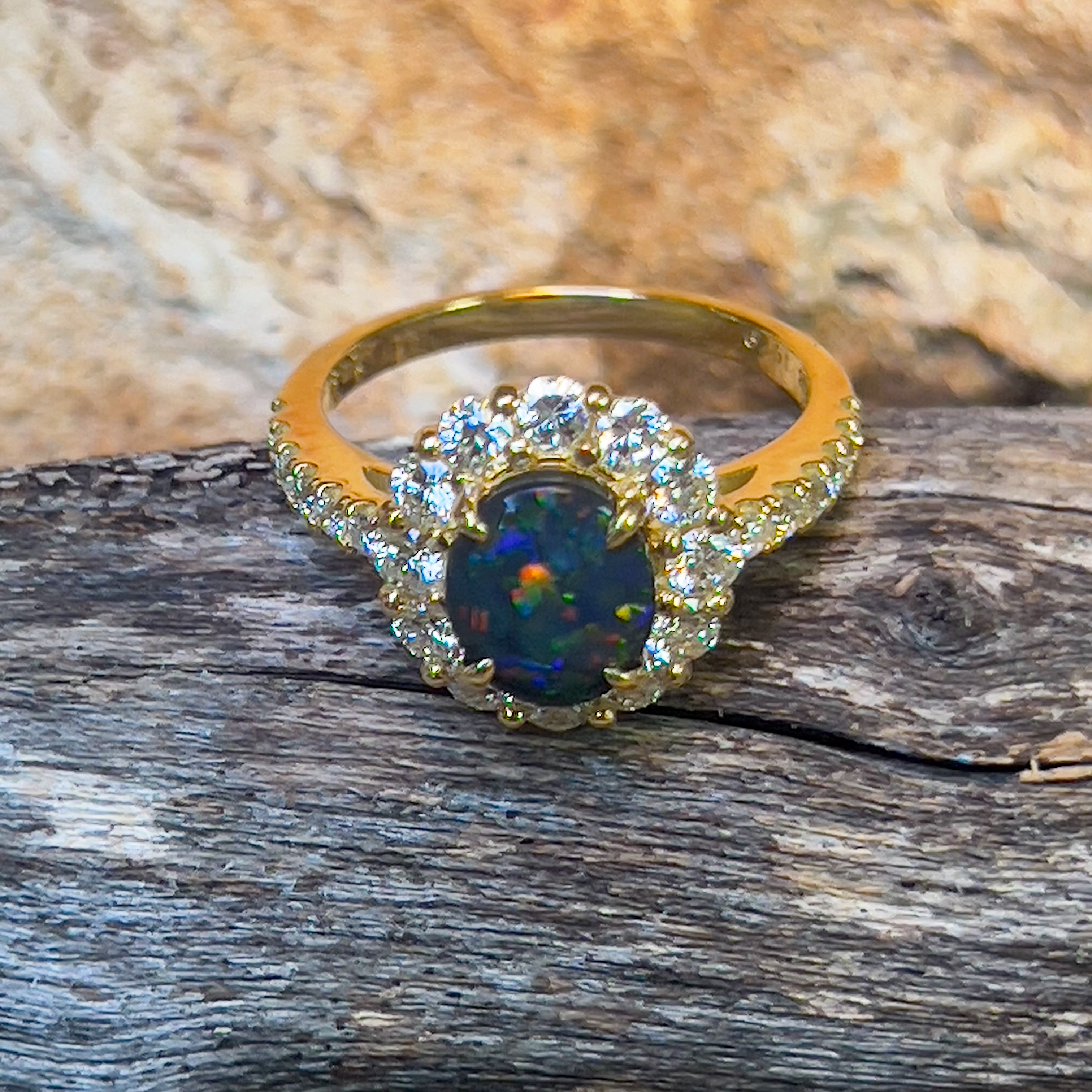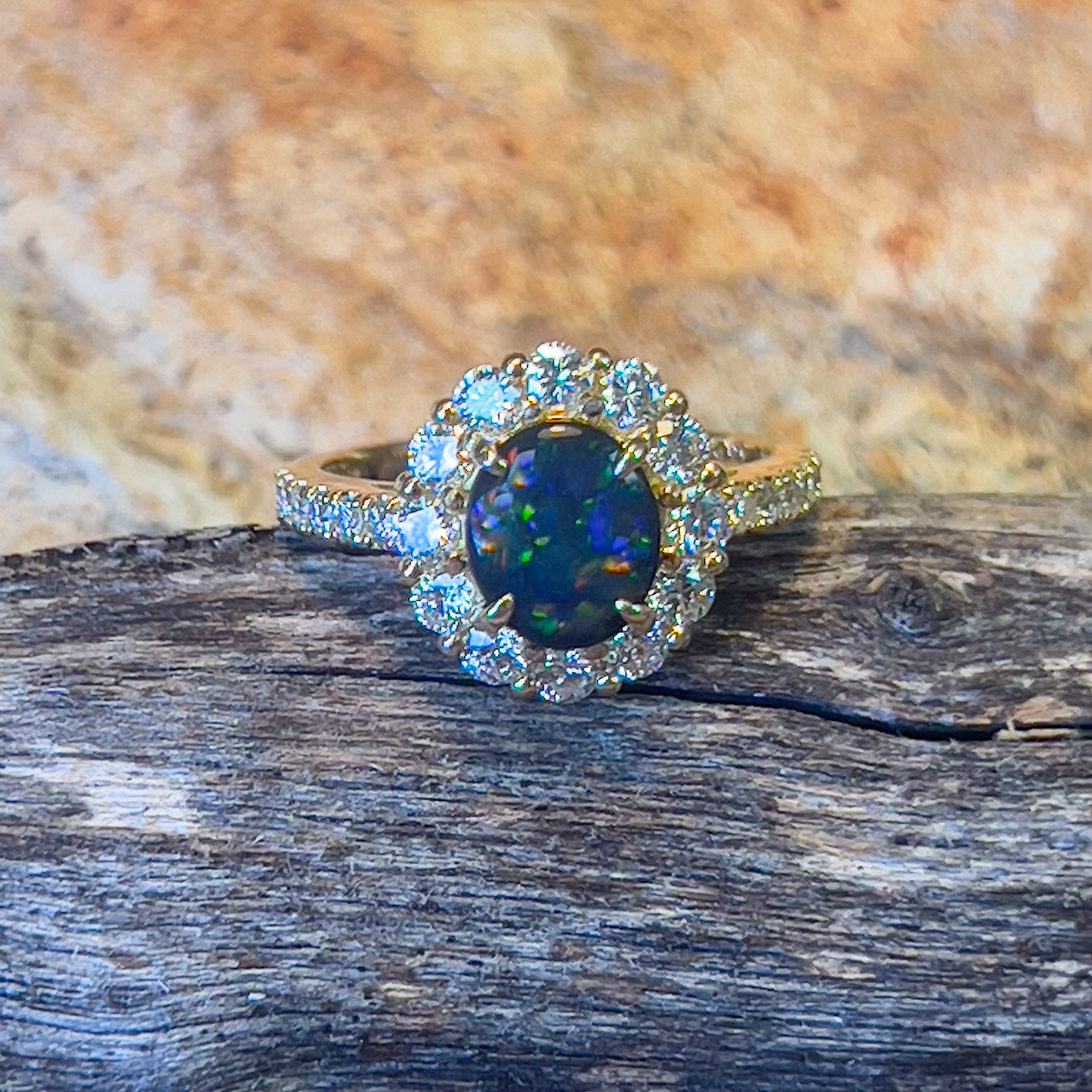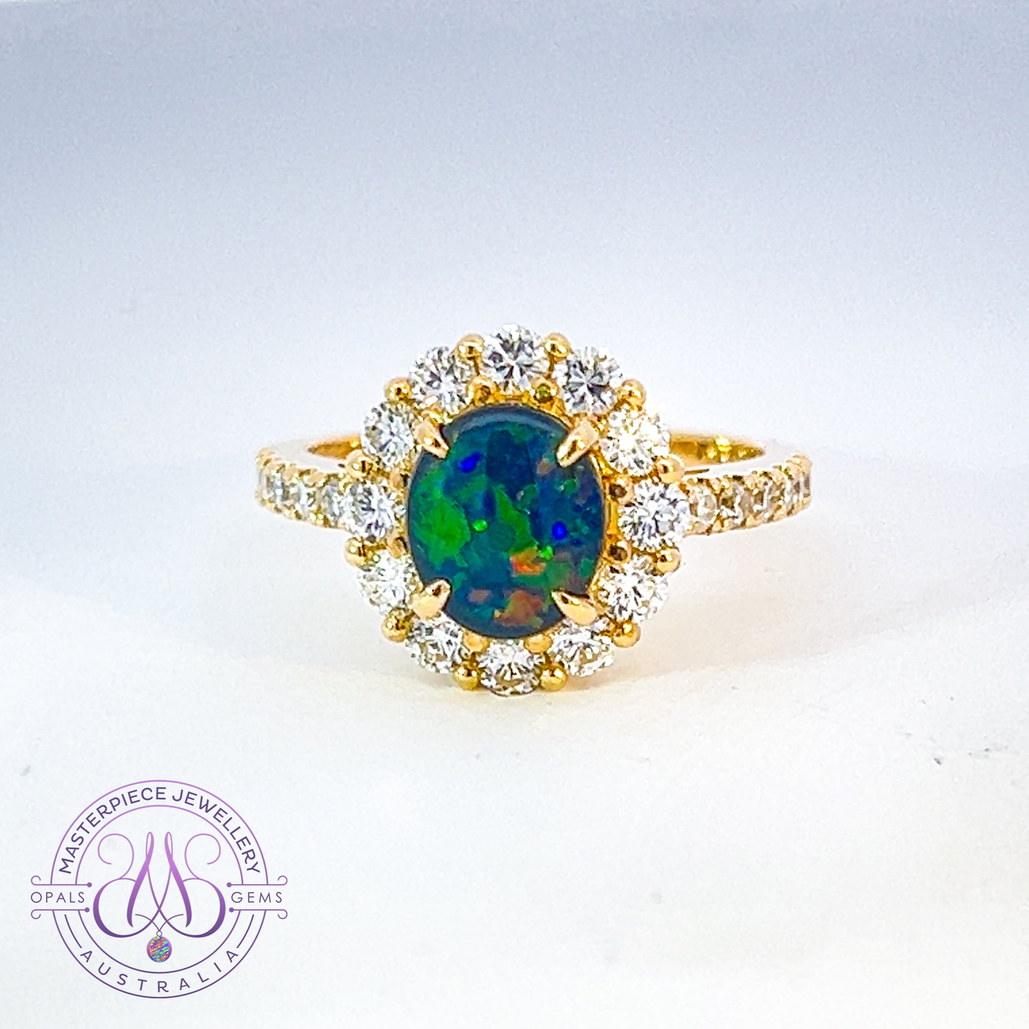 18kt Yellow Gold cluster ring Black Opal 1.03 Diamonds 0.88ct