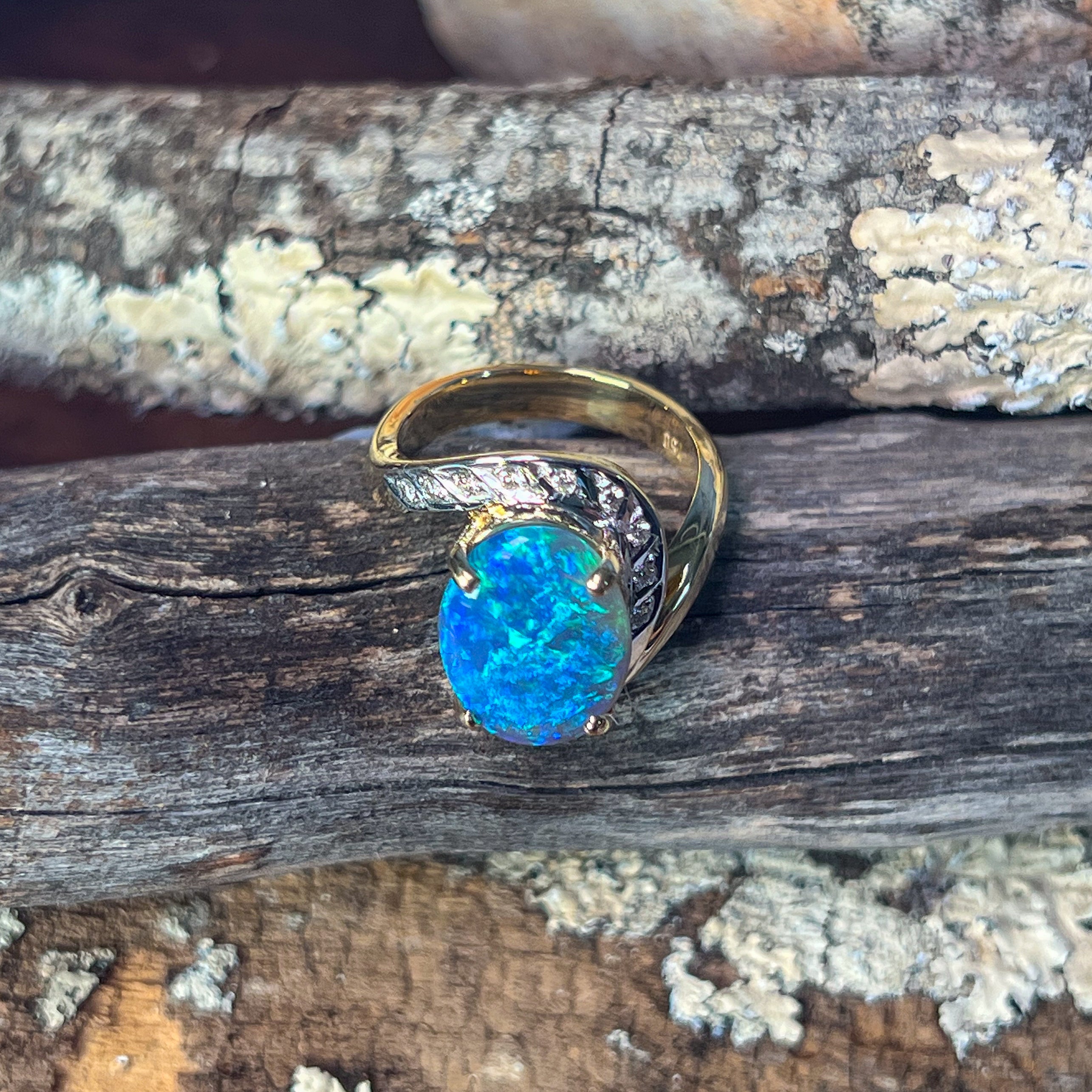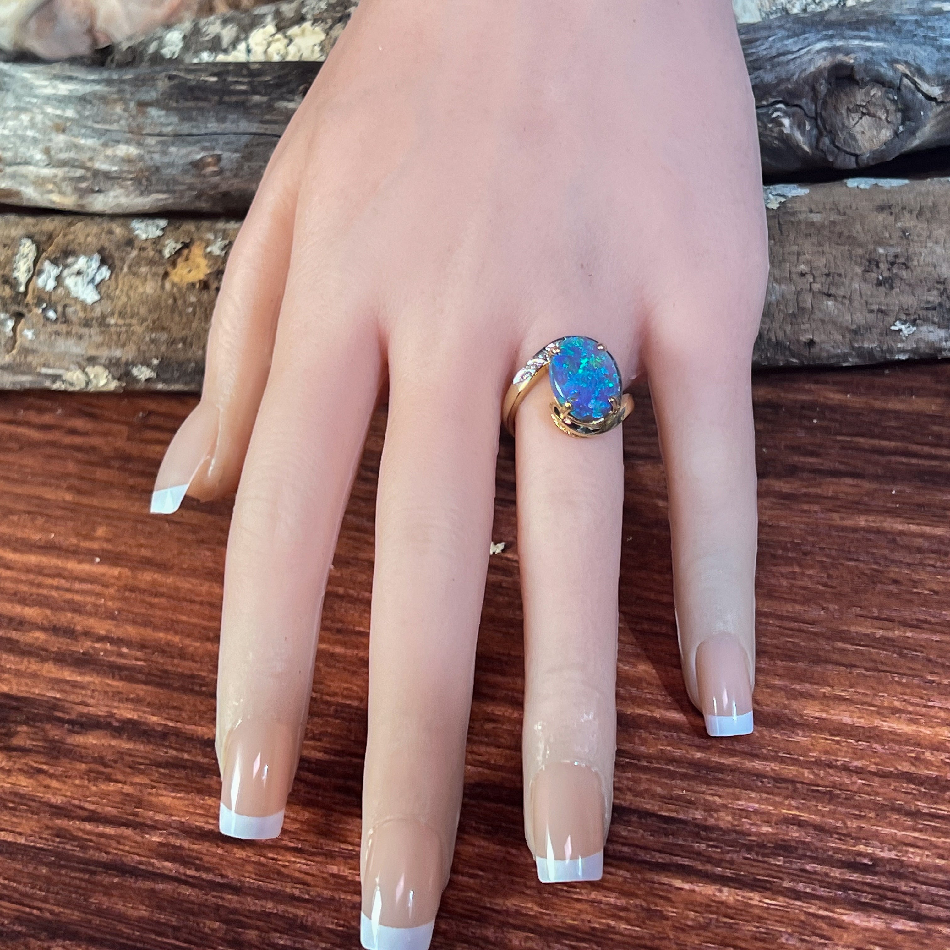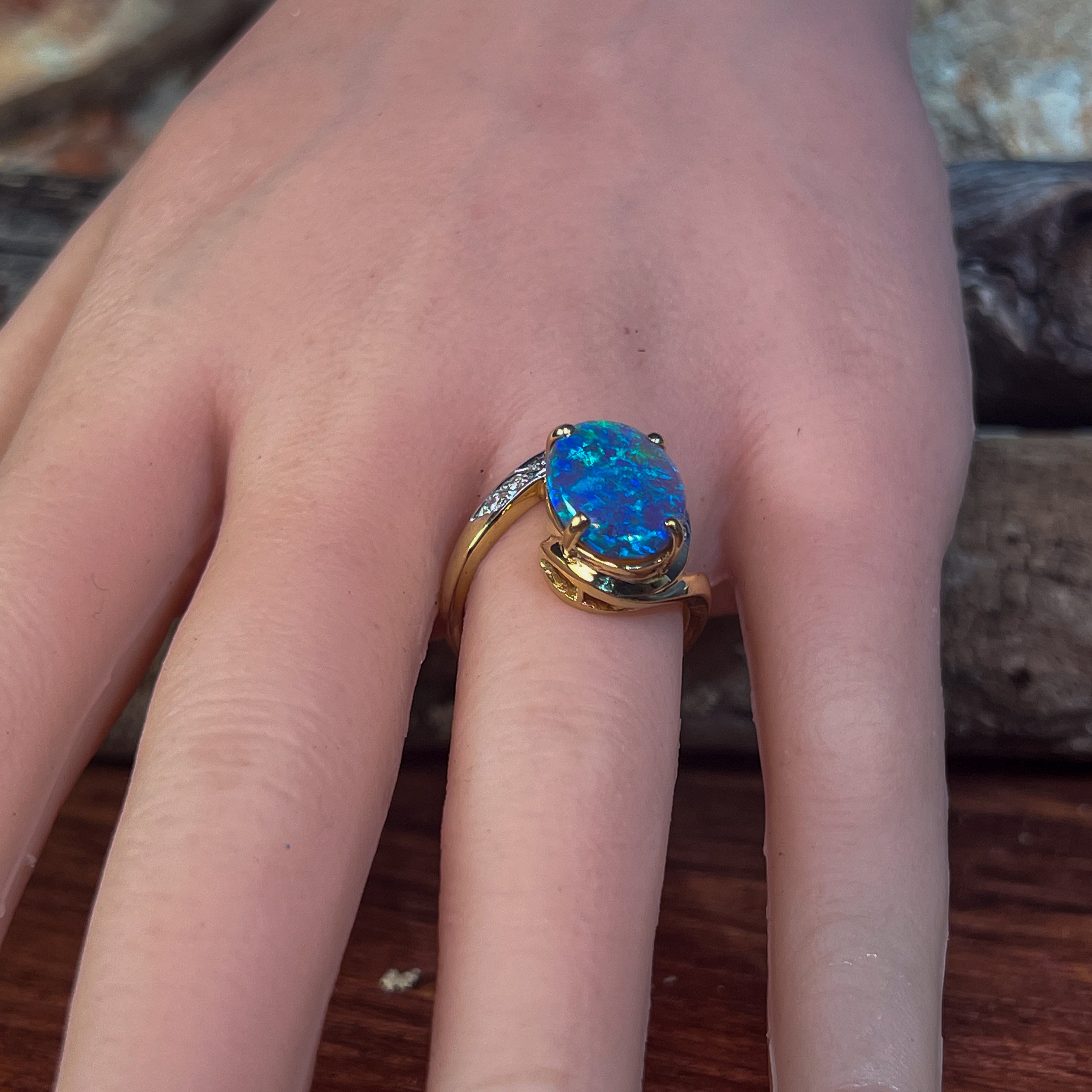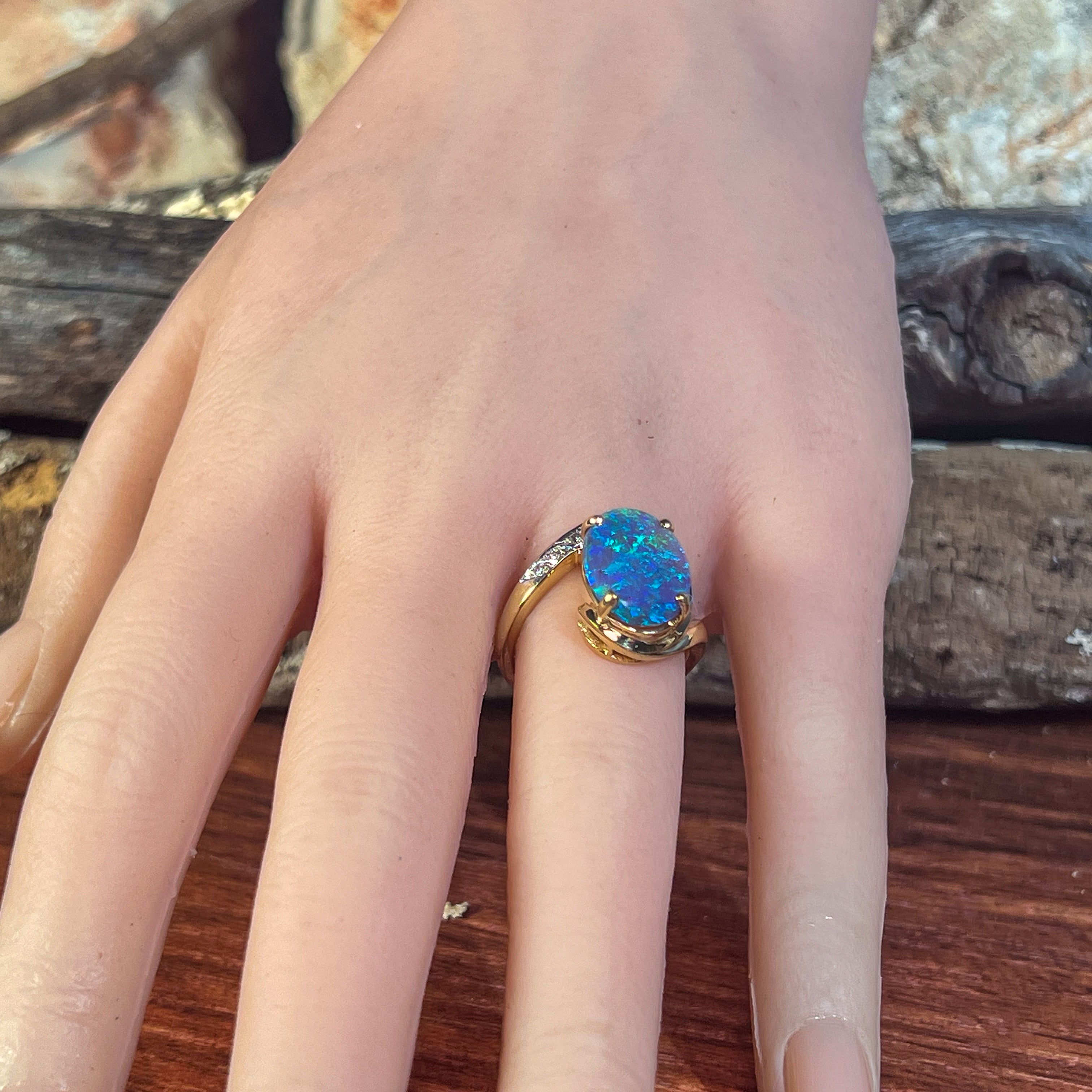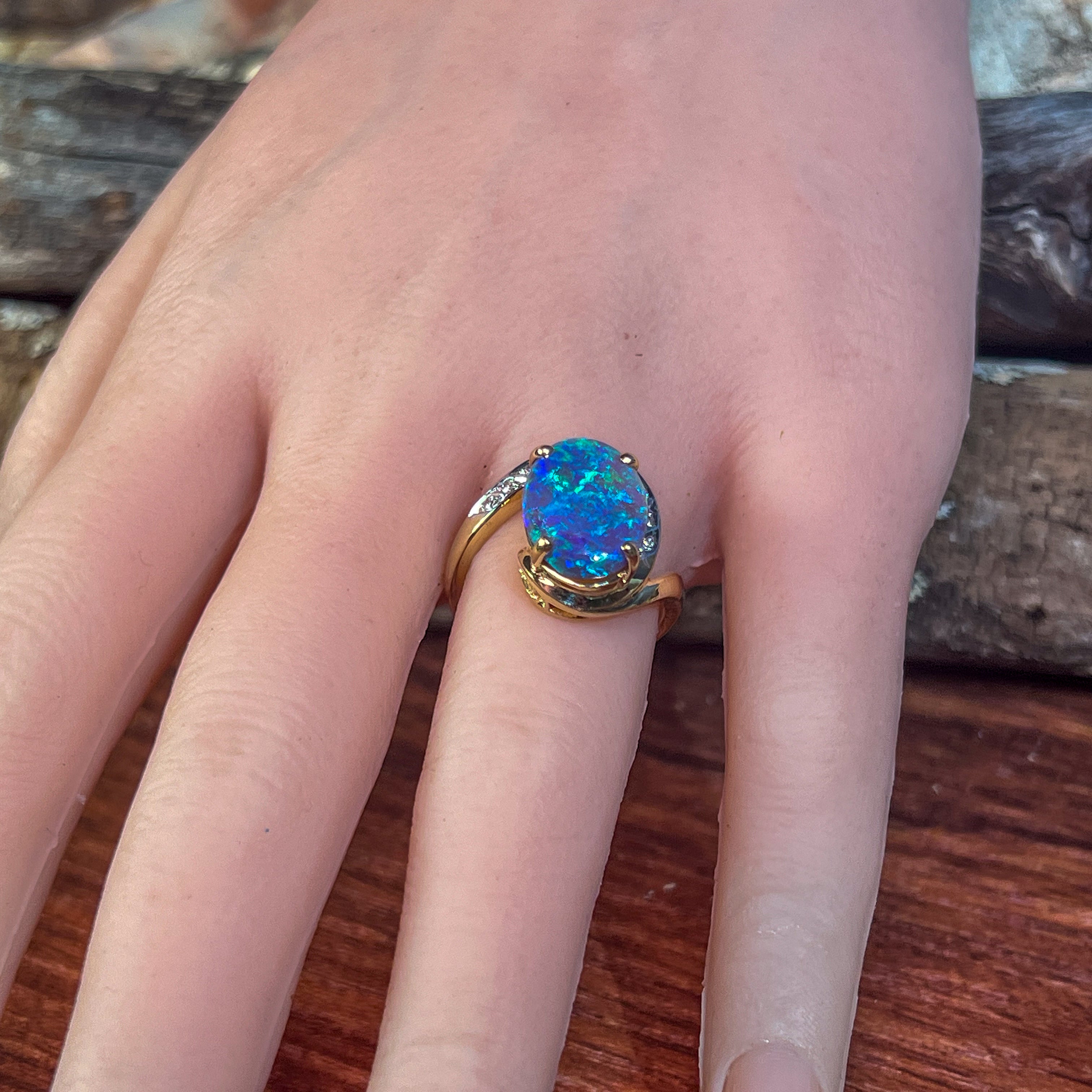 Experience the captivating beauty of our 18kt Yellow Gold cross over style Black Opal ring. Adorned with a striking 3.98ct blue-green 3D Opal, accented by sparkling diamonds, this ring is a true showstopper. Add a touch of elegance and sophistication to any outfit with this stunning piece.
