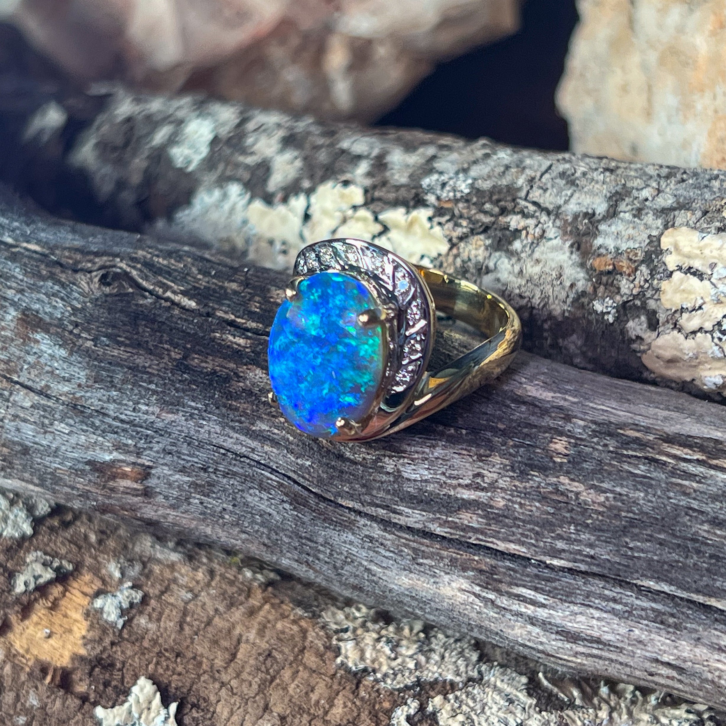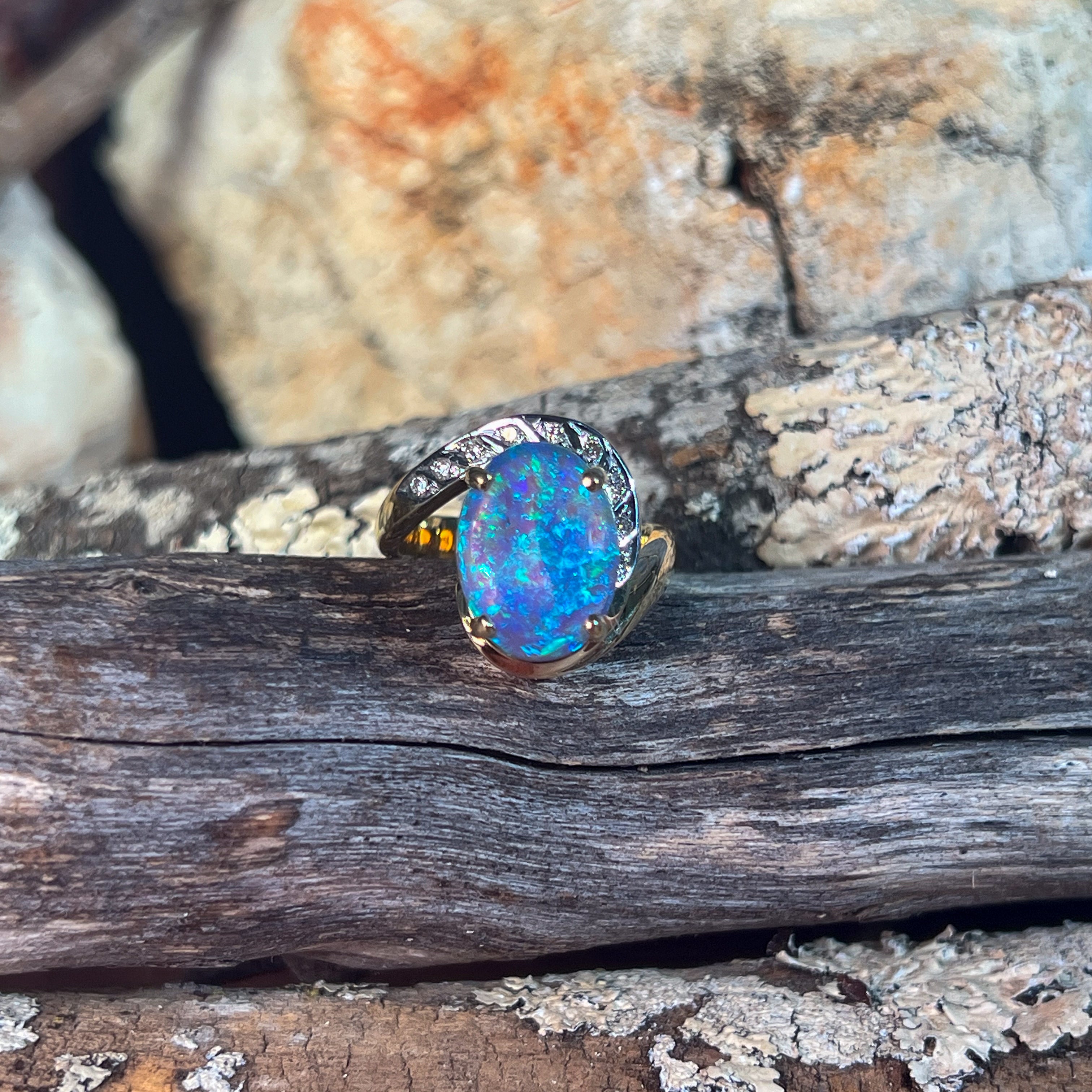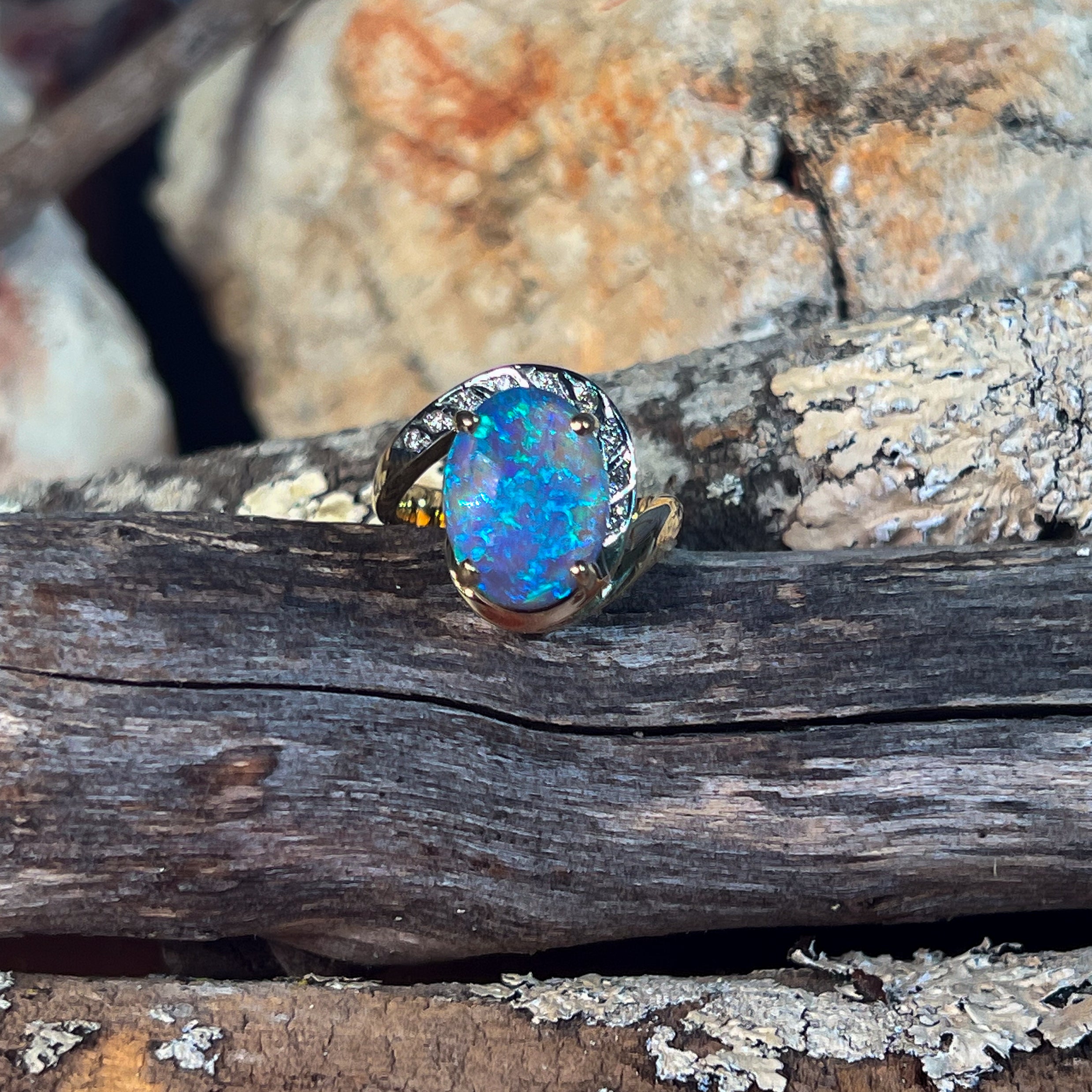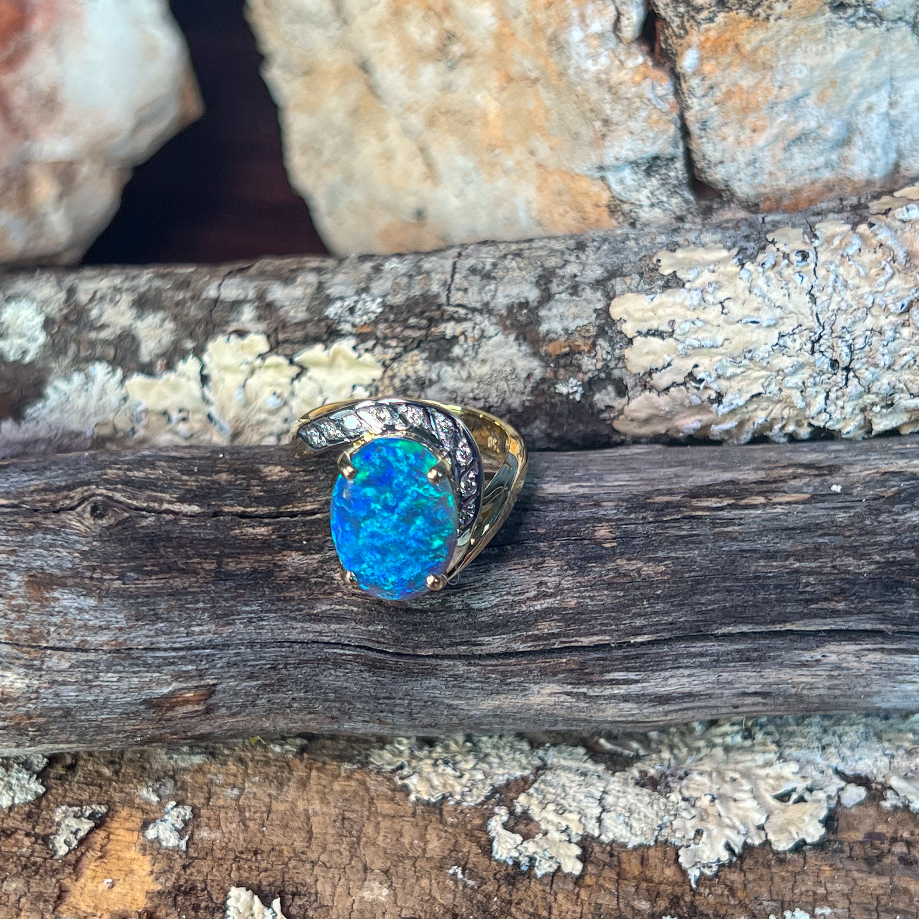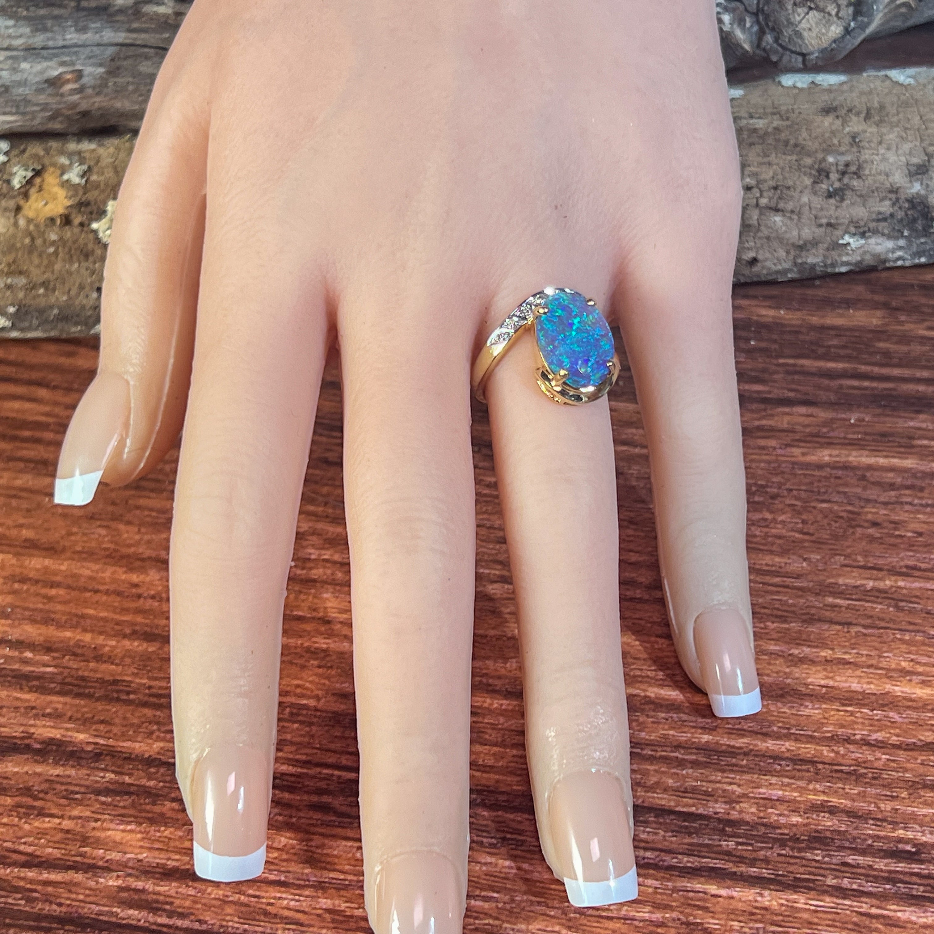 Experience the captivating beauty of our 18kt Yellow Gold cross over style Black Opal ring. Adorned with a striking 3.98ct blue-green 3D Opal, accented by sparkling diamonds, this ring is a true showstopper. Add a touch of elegance and sophistication to any outfit with this stunning piece.