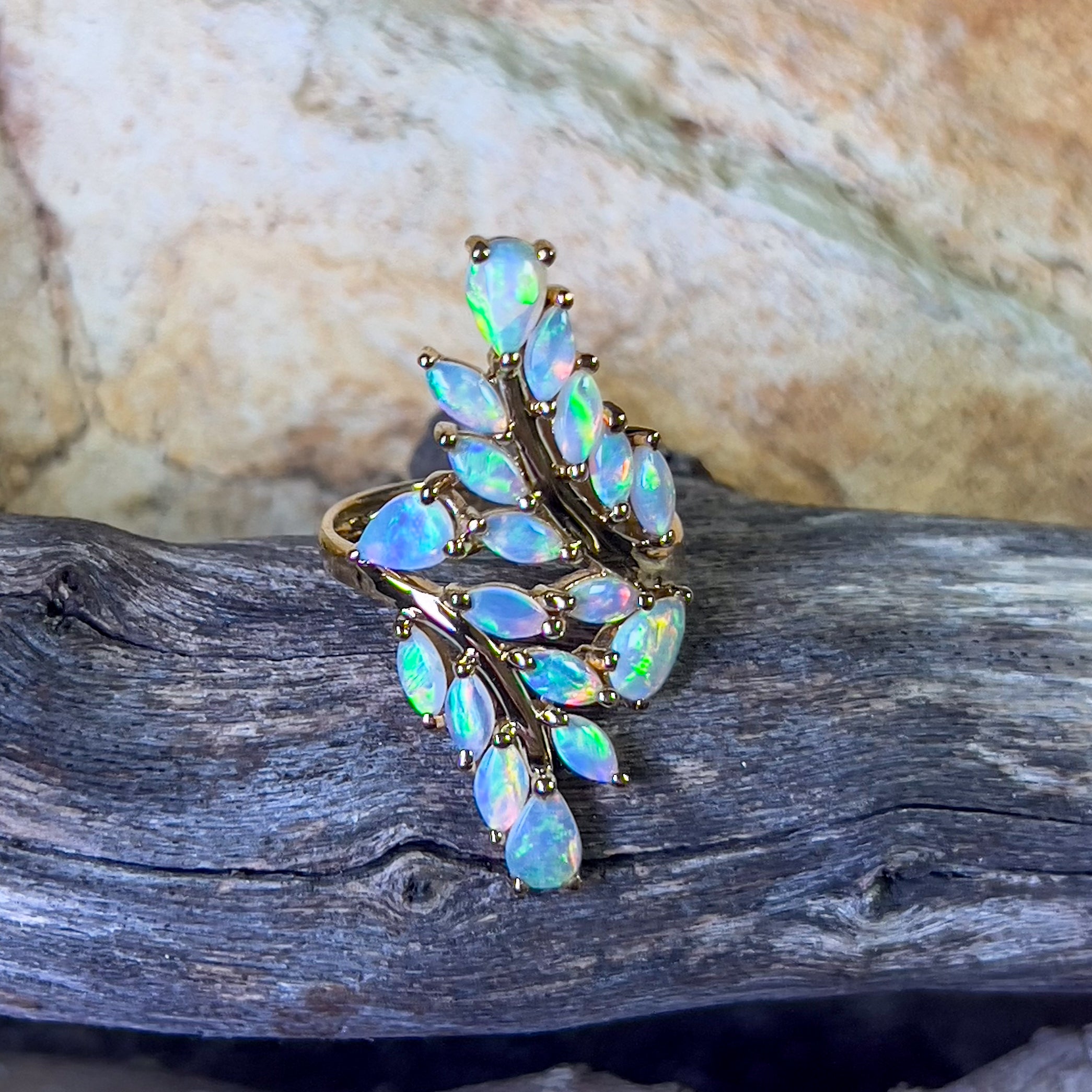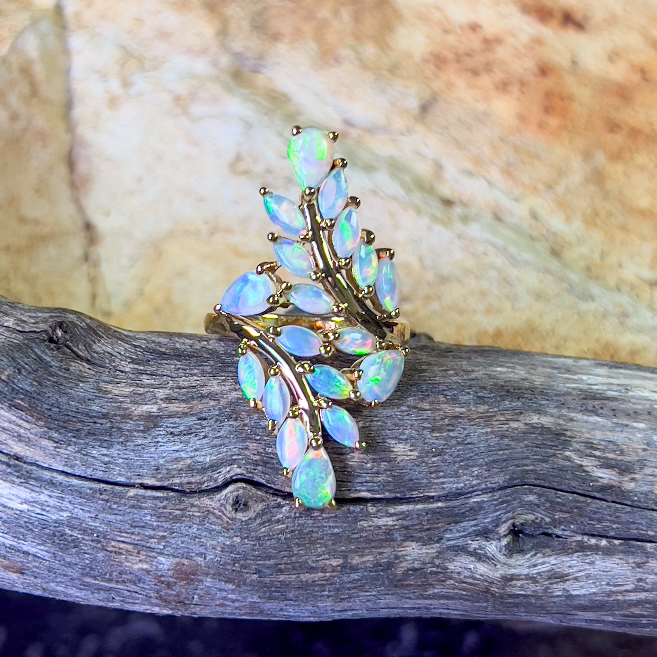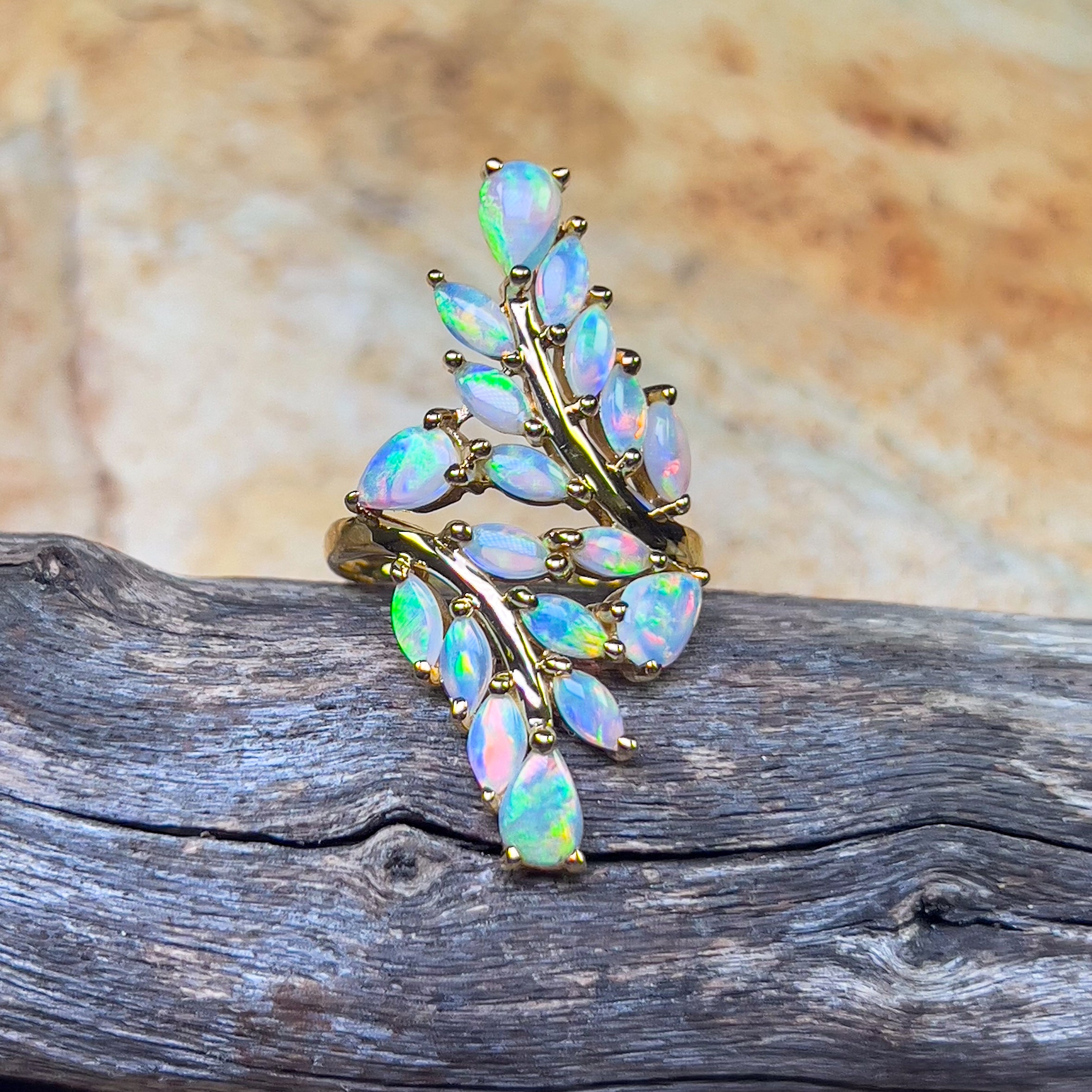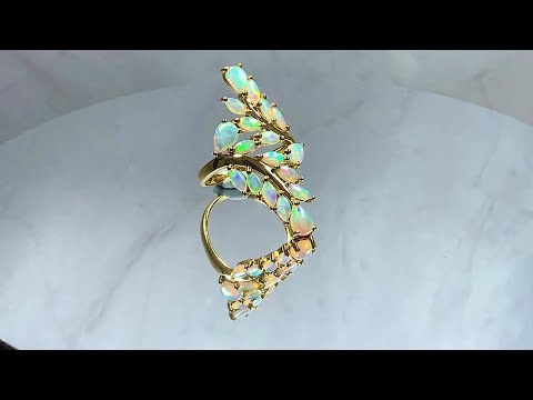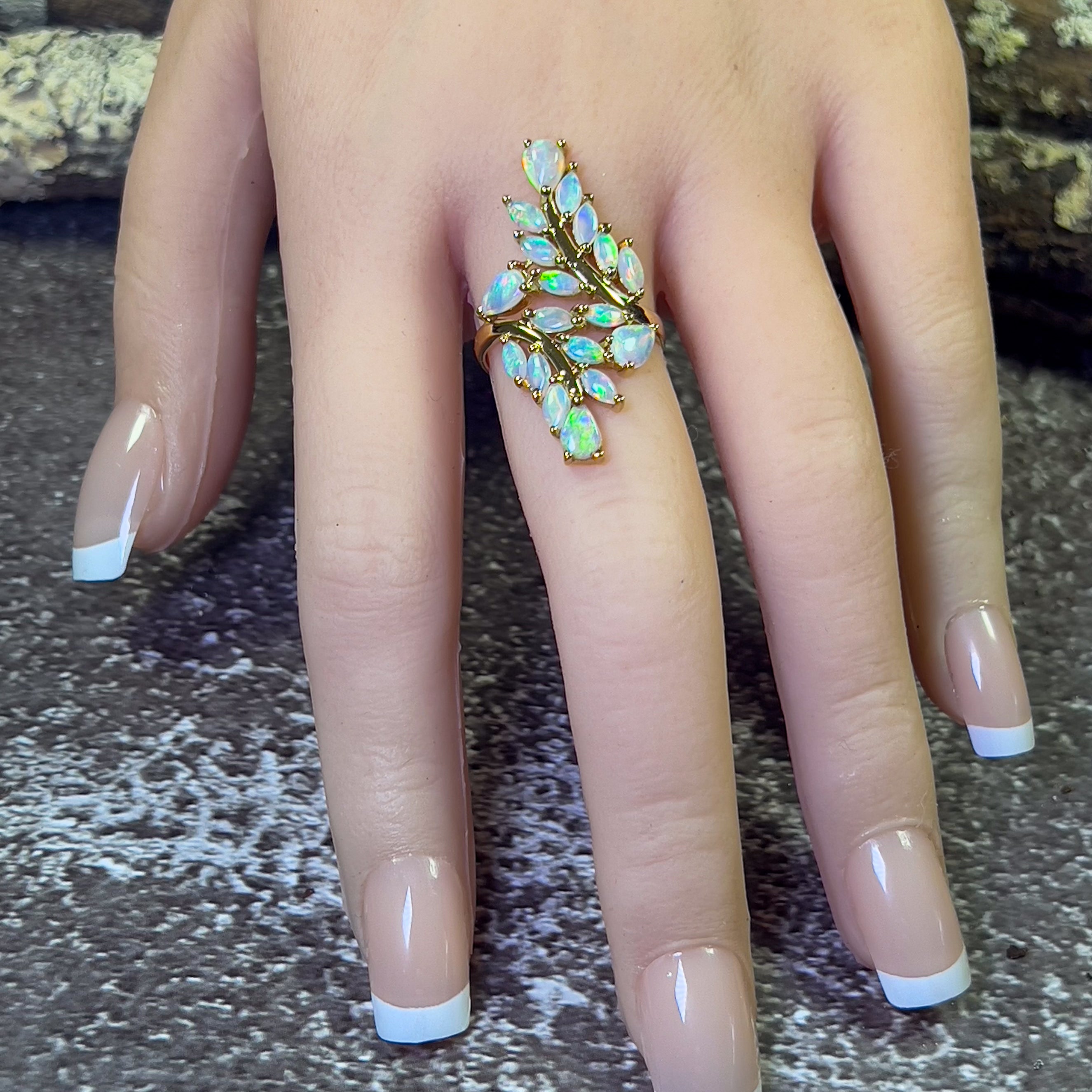 Elevate your style with this stunning 18kt Yellow Gold Crystal Opal leaf motif ring. Featuring a delicate floral design, this statement ring adds a touch of elegance to any look. With its lustrous opal and rich gold, you'll feel confident and radiant all day long.