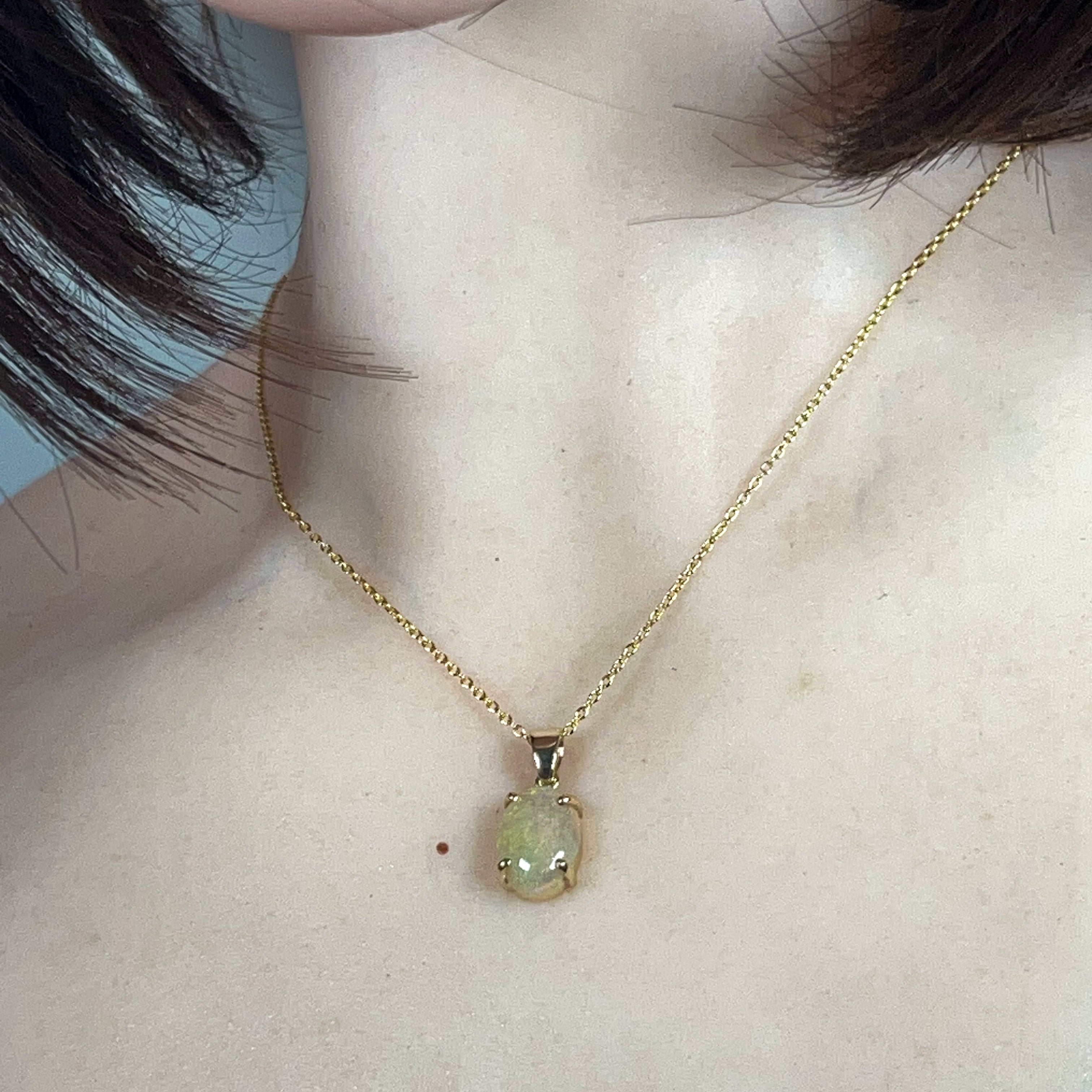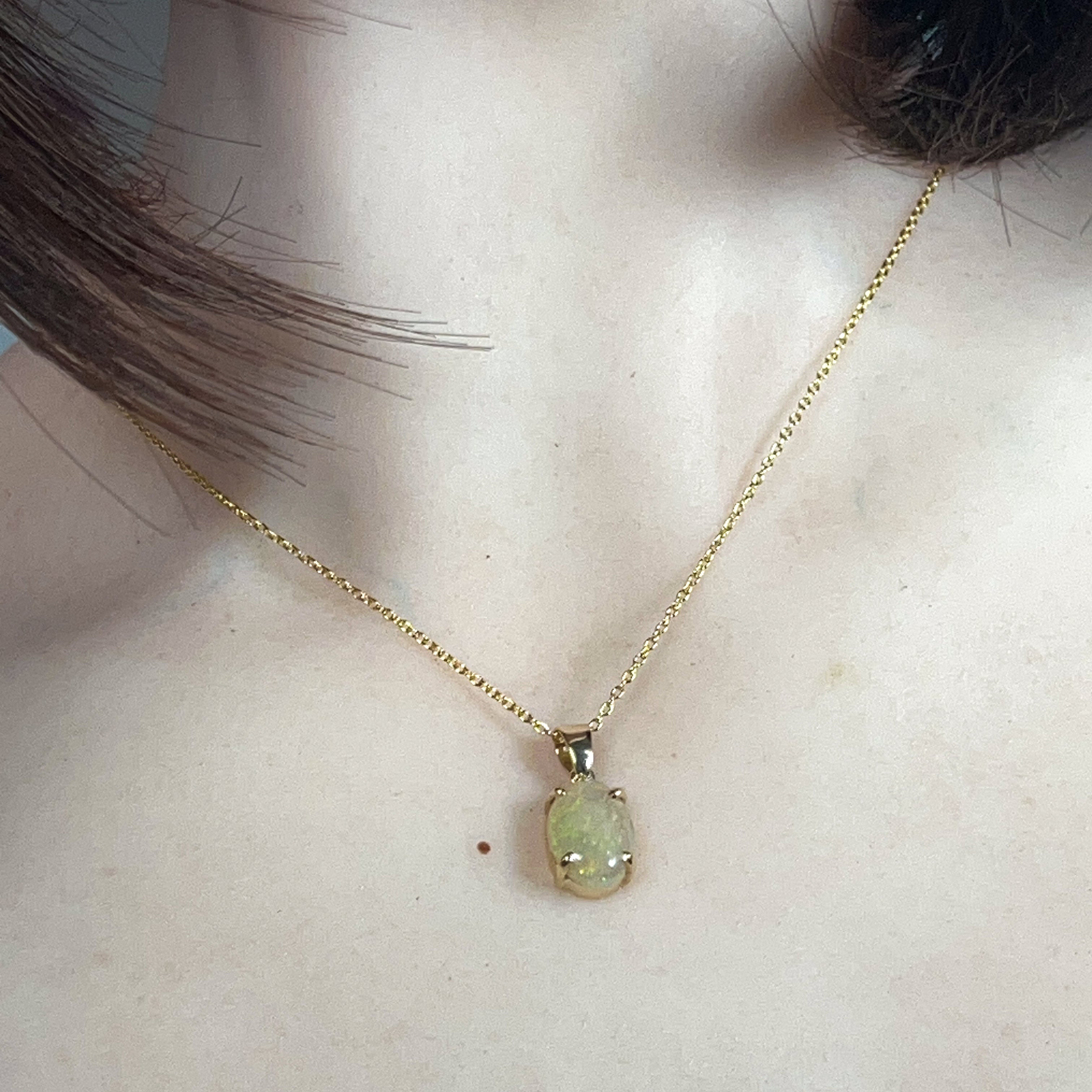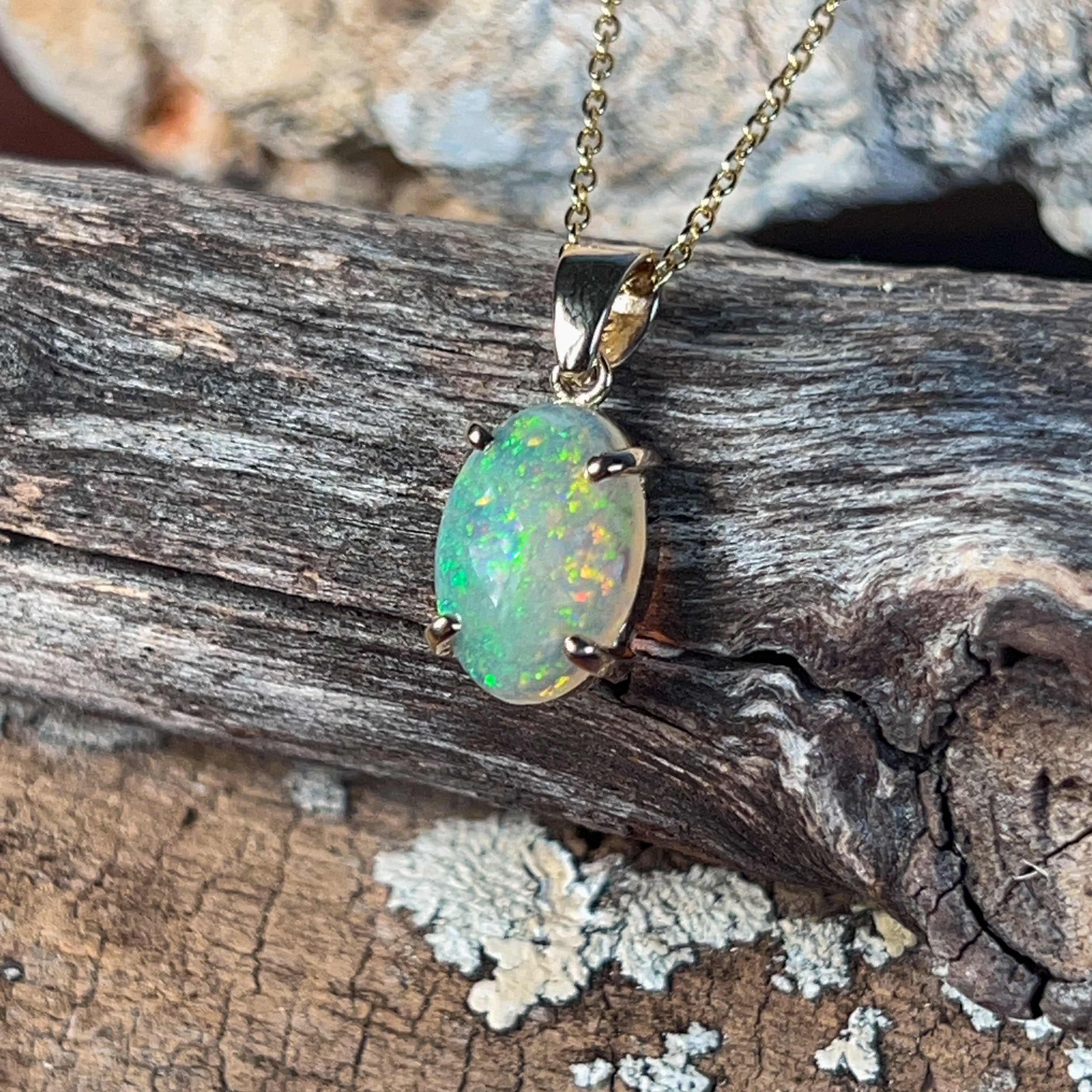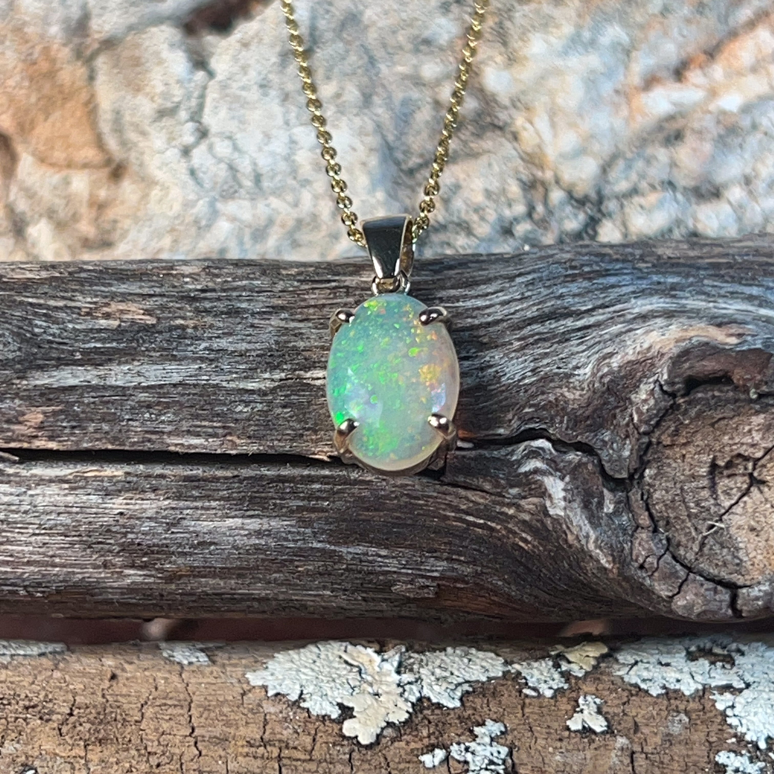 Radiant light opal takes centre stage in this stunning 9kt yellow gold claw setting. At 3.25 carats, this beauty captures the essence of Australian opals with its mesmerising play of colour. The classic claw design showcases the stone's natural brilliance while the warm glow of yellow gold creates an enchanting frame. Perfect for those who appreciate timeless elegance with a touch of opal magic. A piece that's sure to turn heads and spark conversations wherever you go.