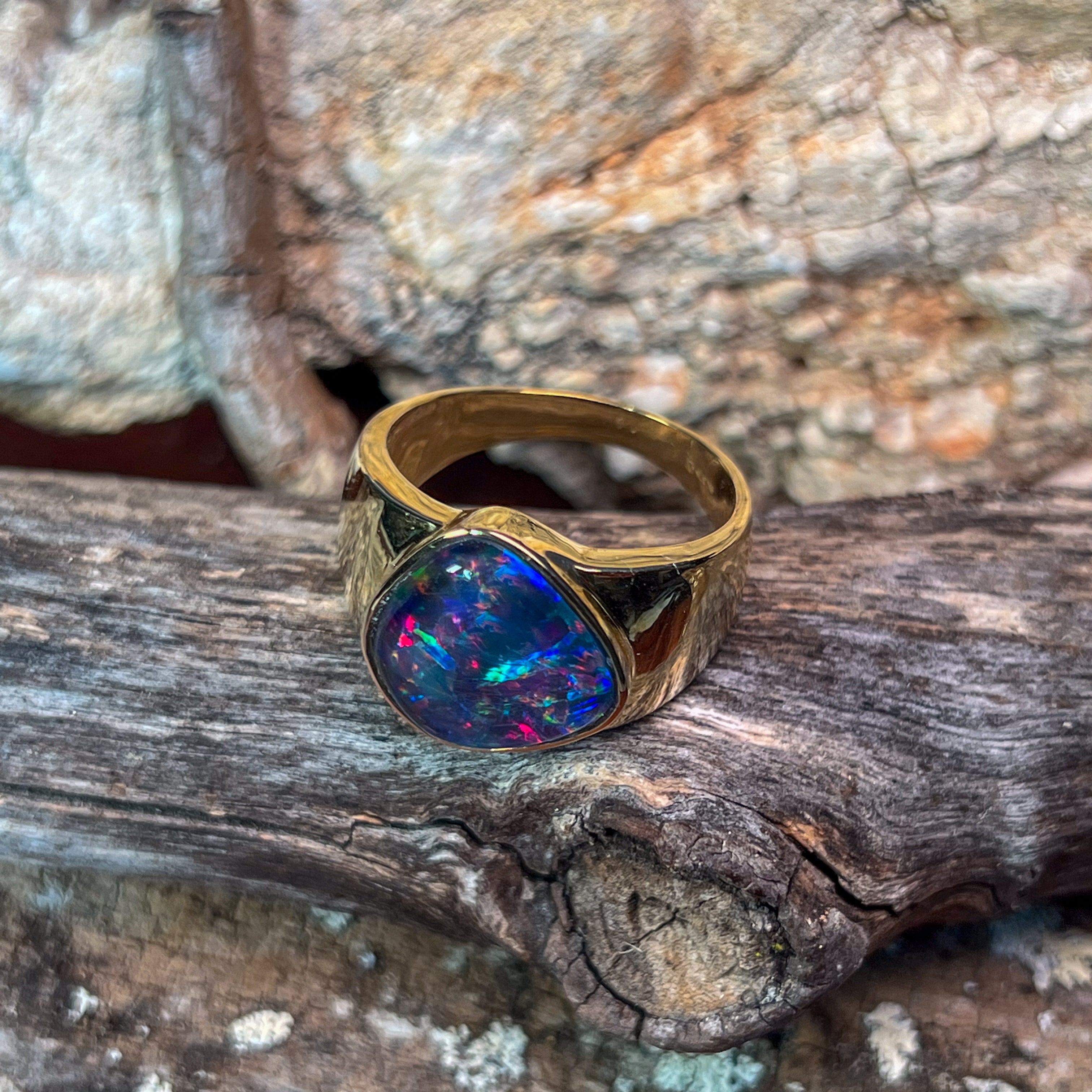 Elevate your style with this 9kt Yellow Gold Freeform Opal Triplet men's ring, designed in a classic signet style. Its bold yet timeless silhouette makes a confident statement, while the unique freeform opal triplet adds vibrant color and depth. Crafted to complement any look, this ring offers lasting elegance and a distinctive edge for the modern gentleman.