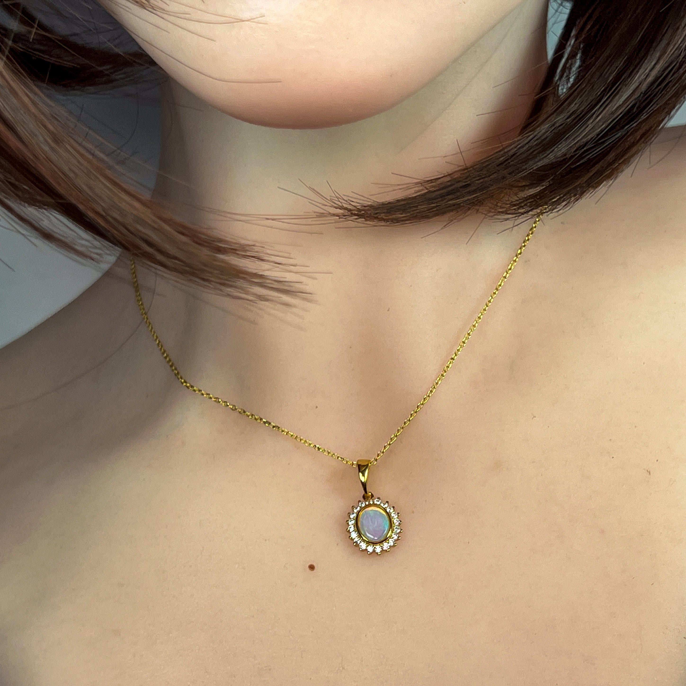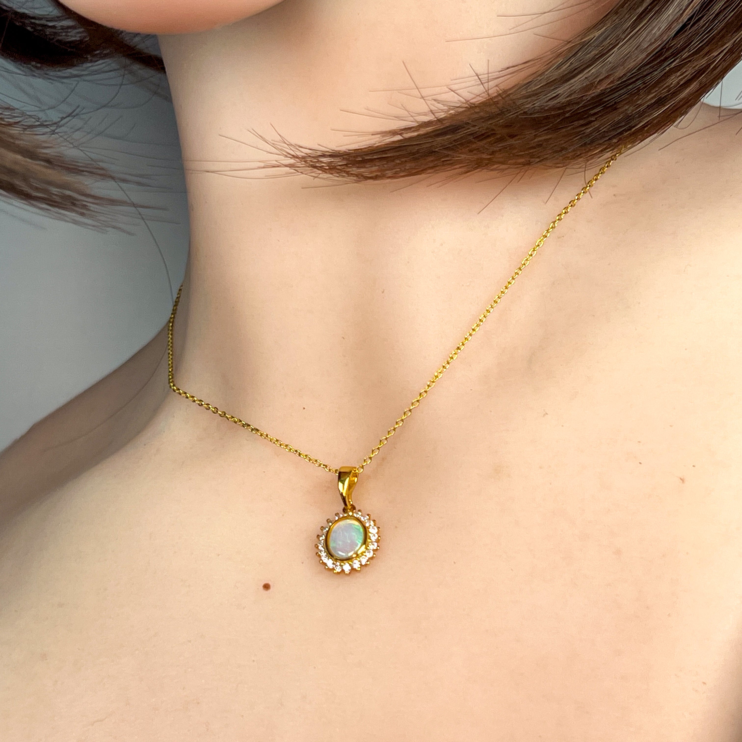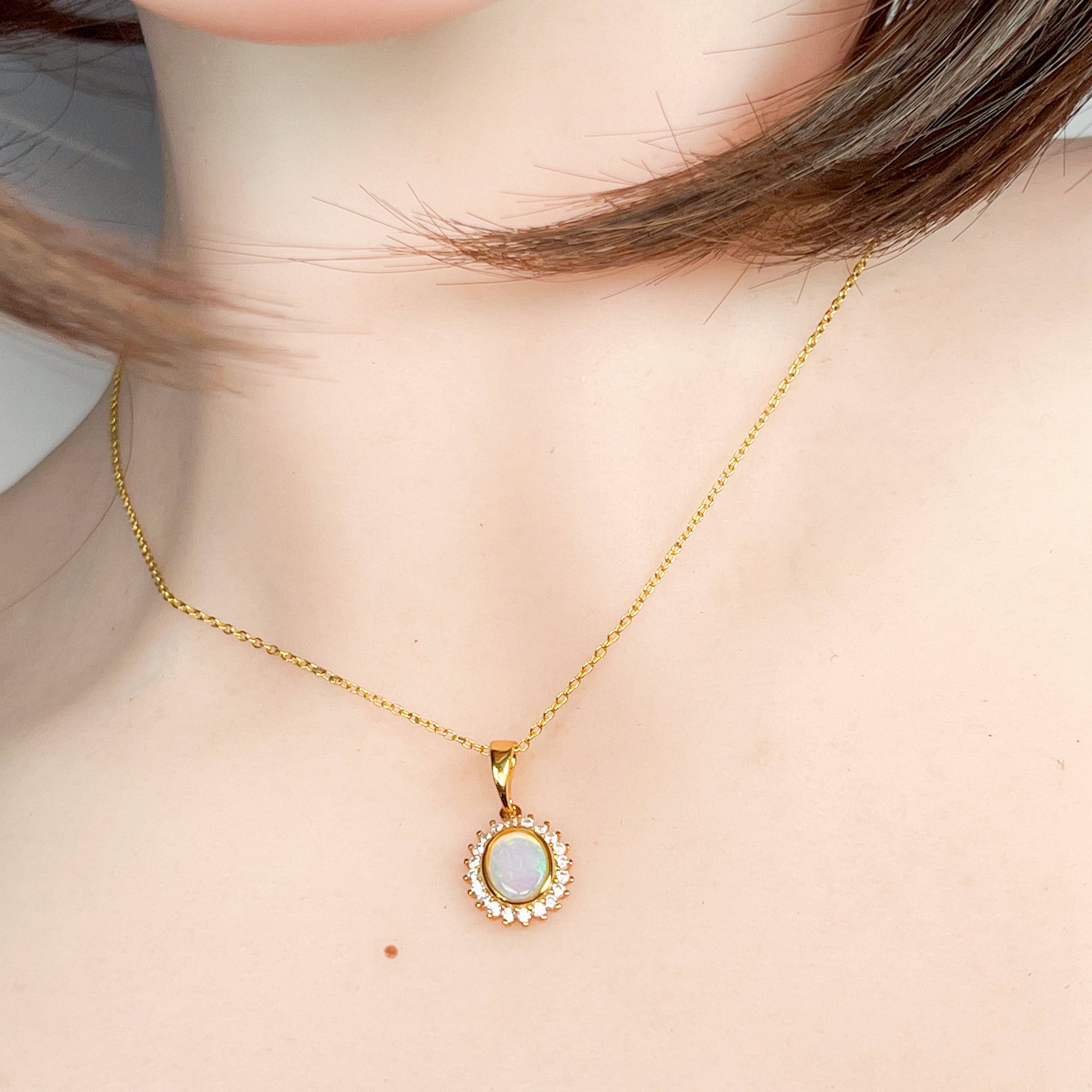 This delicate gold-plated sterling silver pendant features a charming 8x6mm oval opal surrounded by a subtle cluster design. Its dainty size and elegant shimmer make it perfect for adding a touch of refined color and sparkle to any outfit, effortlessly enhancing your everyday look or special occasion ensemble.