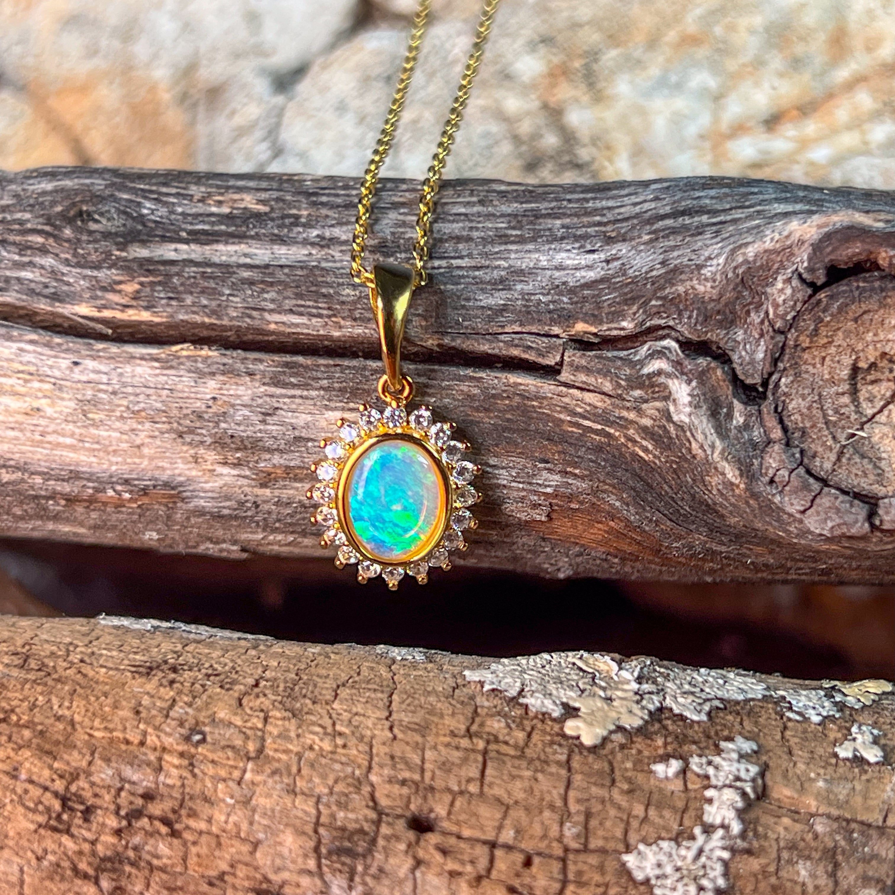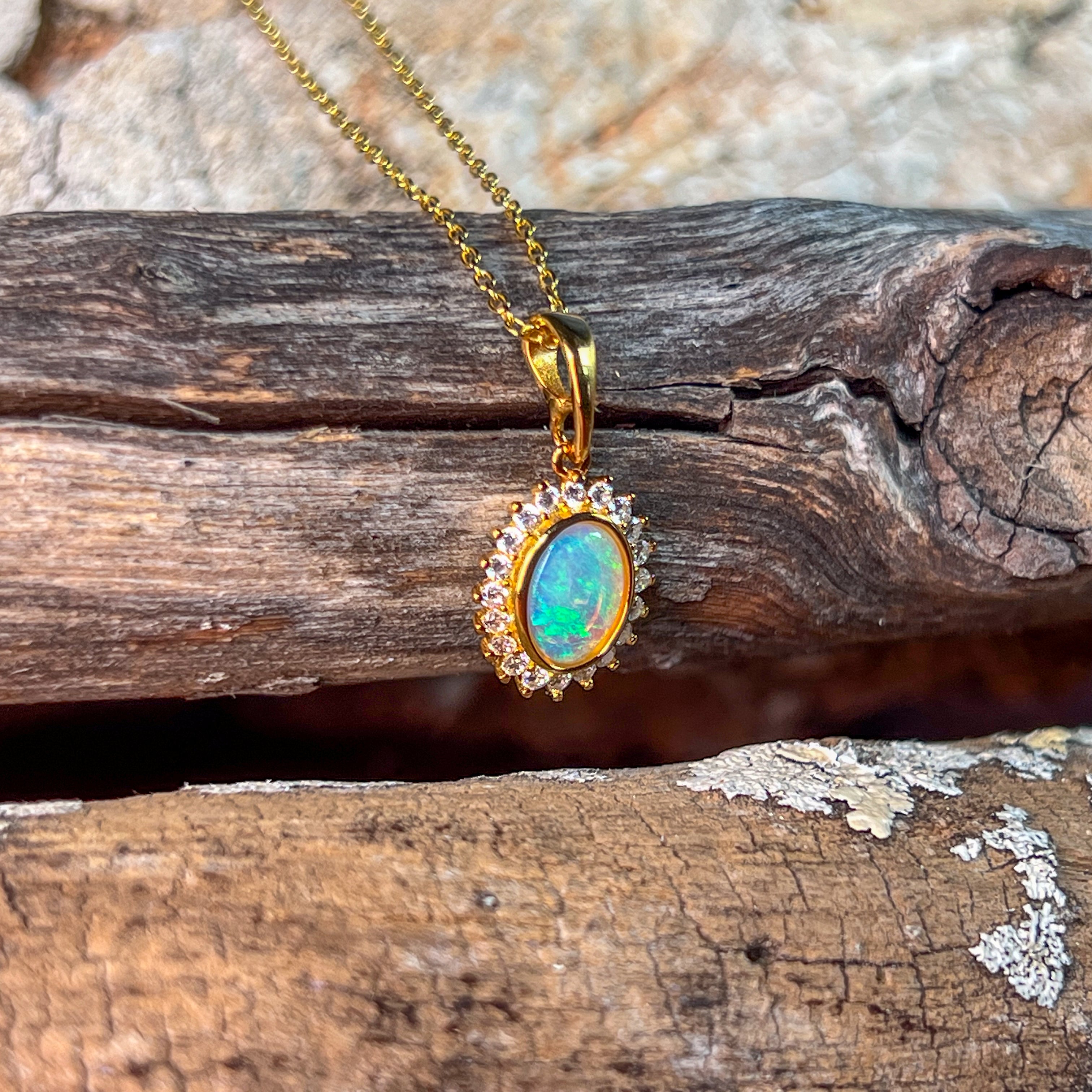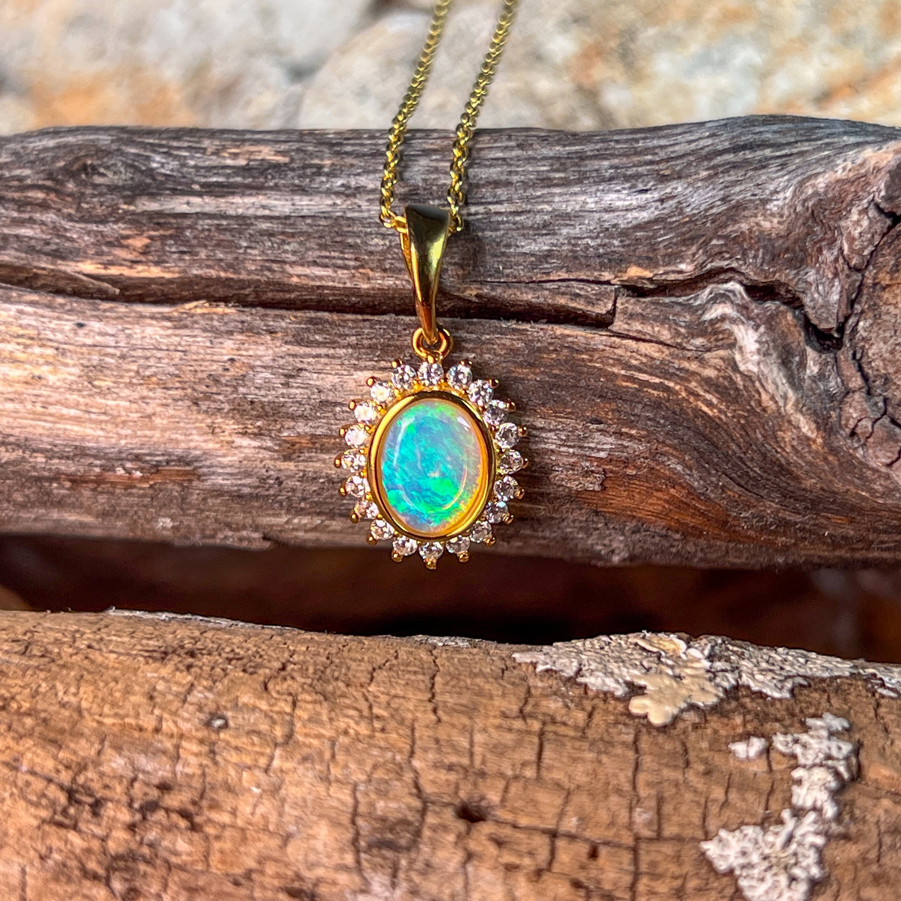 This delicate gold-plated sterling silver pendant features a charming 8x6mm oval opal surrounded by a subtle cluster design. Its dainty size and elegant shimmer make it perfect for adding a touch of refined color and sparkle to any outfit, effortlessly enhancing your everyday look or special occasion ensemble.