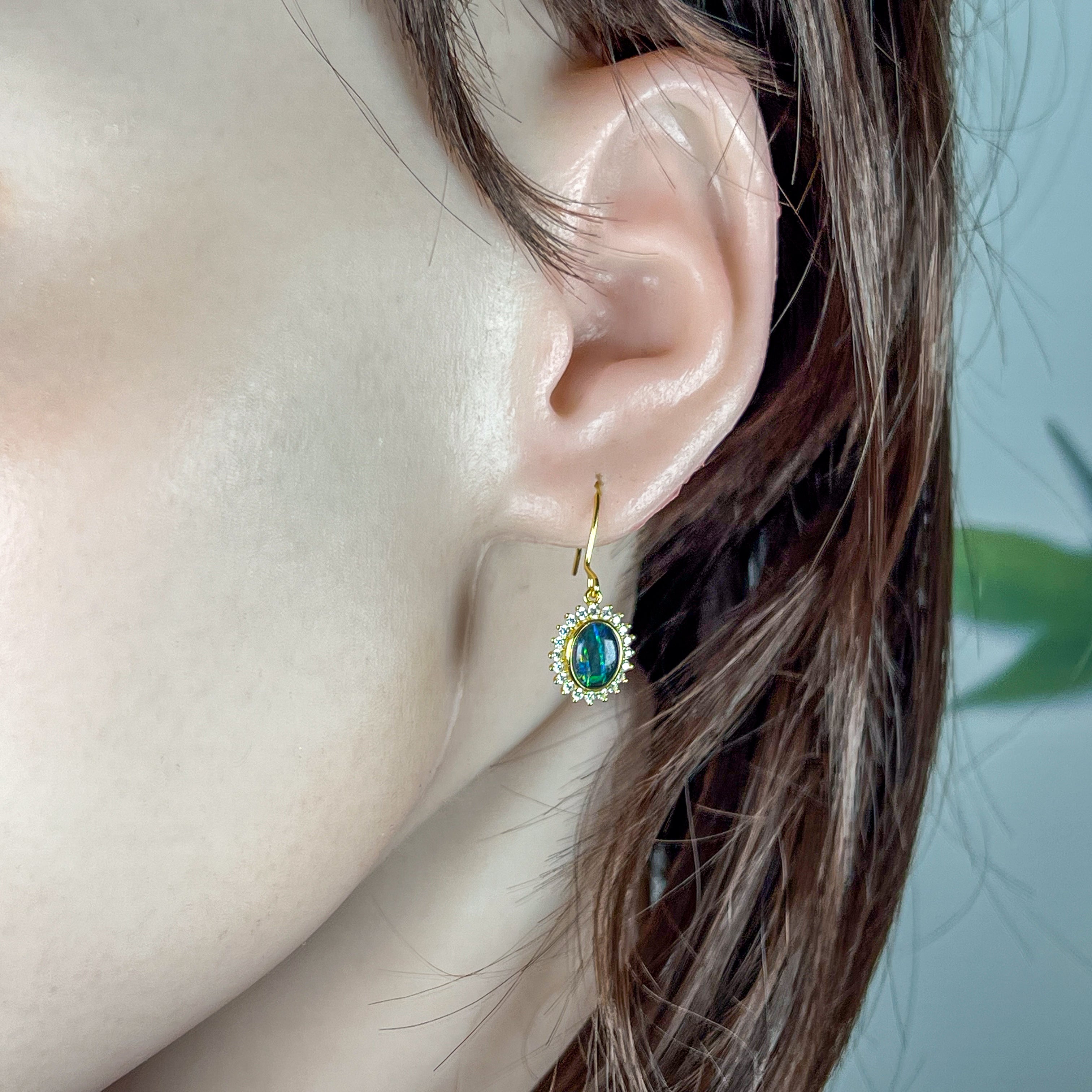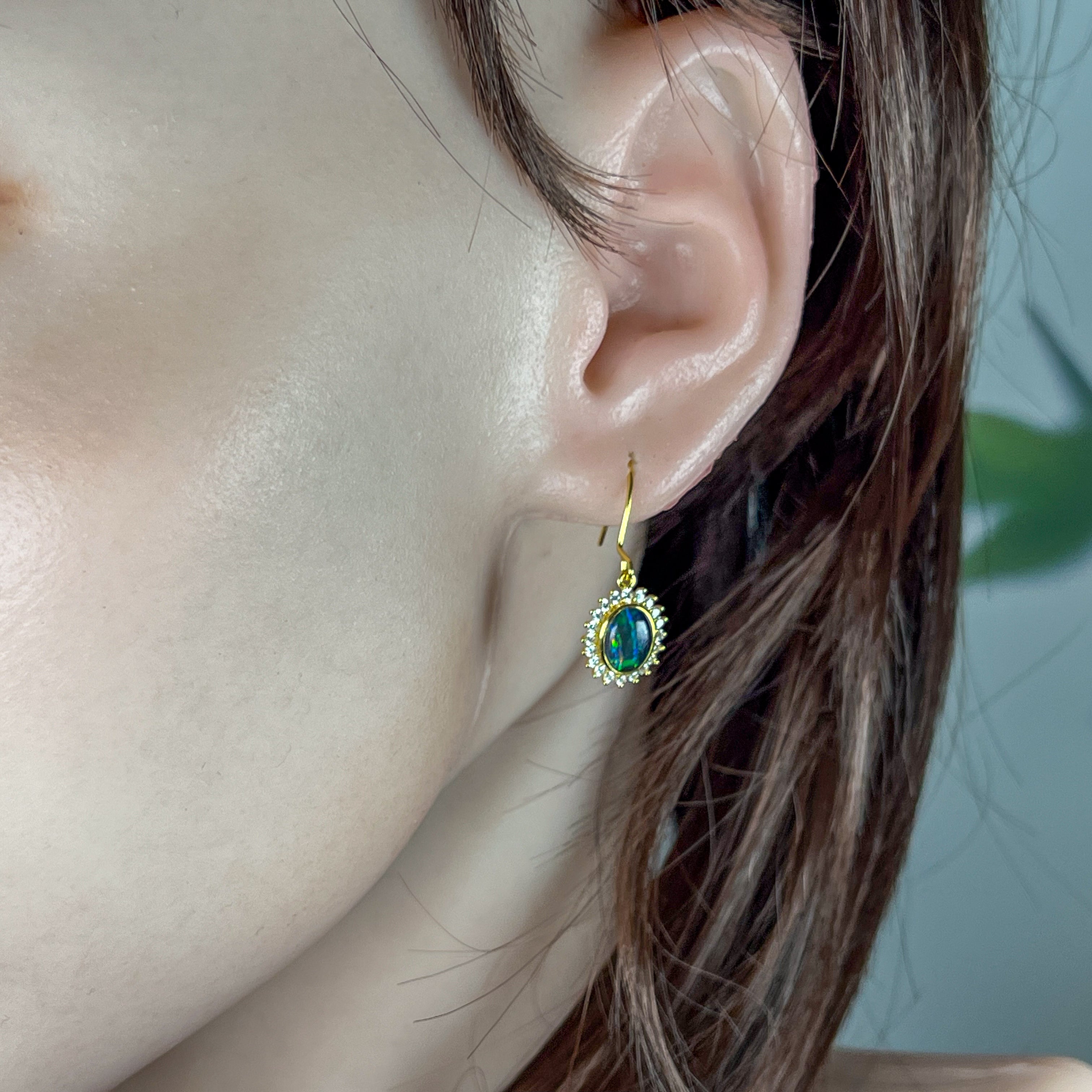 Elevate your style with these Gold Plated Silver dangling Opal cluster earrings, featuring a modern bezel setting that securely frames each vibrant opal. Measuring 8x6mm, their cluster design creates a captivating shimmer, while the hook style offers comfortable, effortless wear. Perfect for adding a touch of elegance to any outfit, these earrings combine contemporary design with timeless charm.