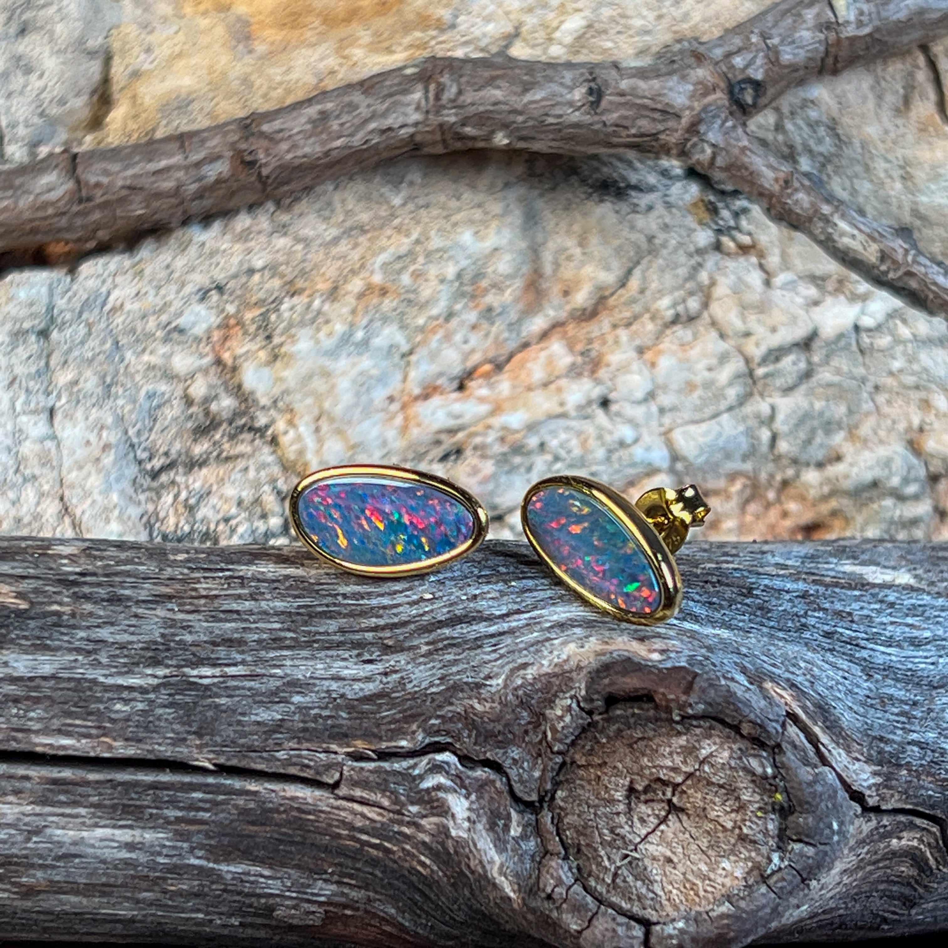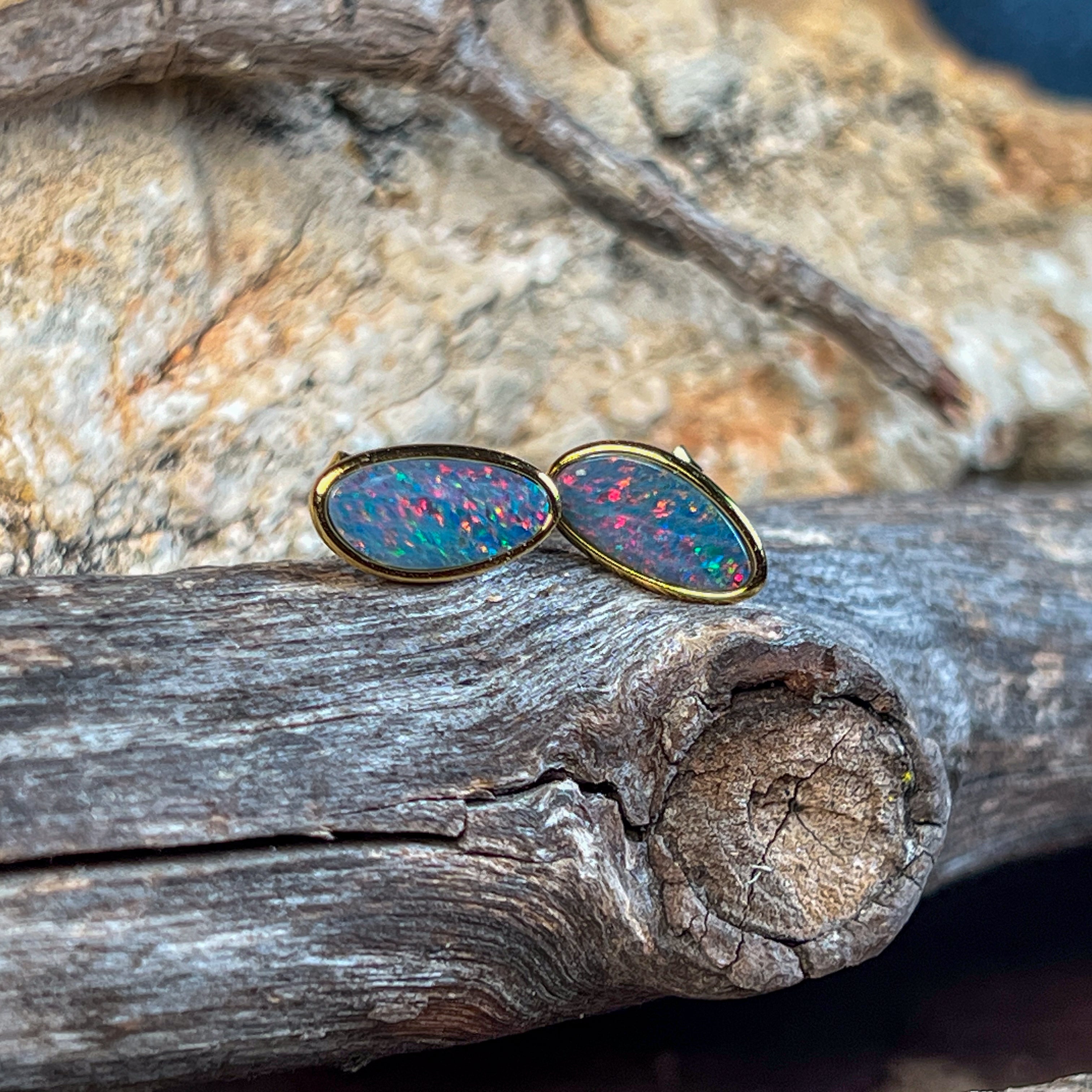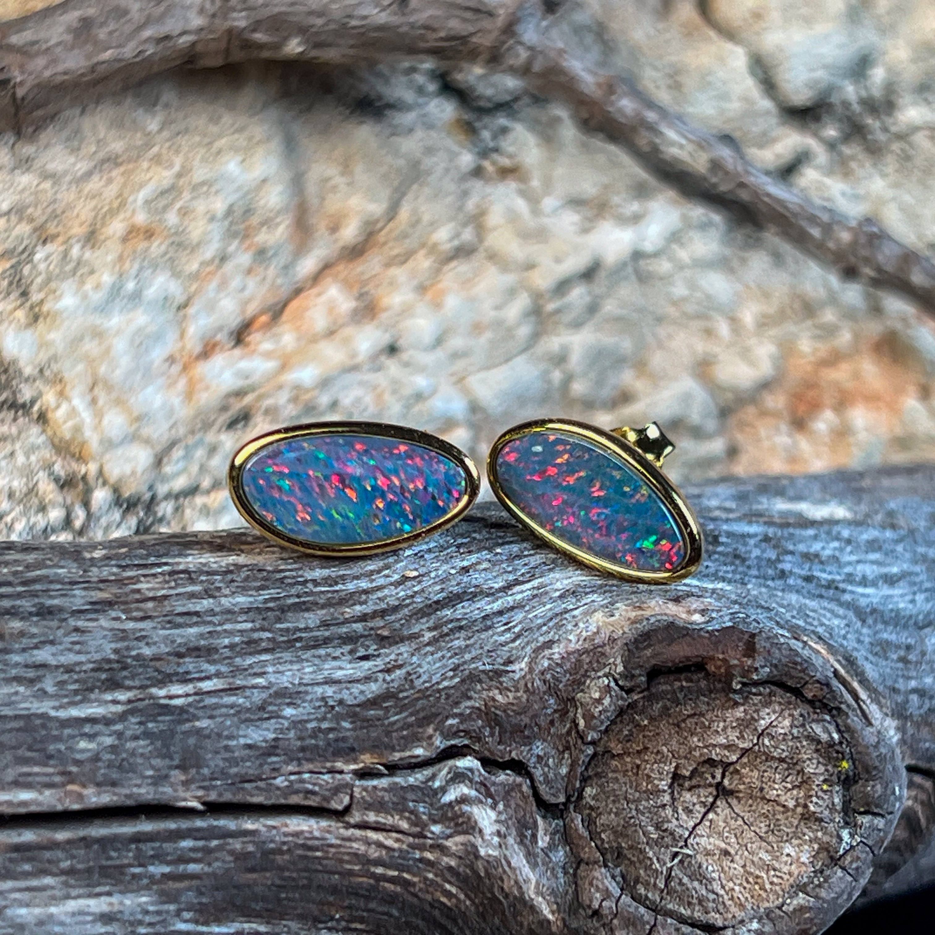 Discover the perfect blend of elegance and affordability with these stunning gold-plated silver opal doublet stud earrings. Each piece features a mesmerizing freeform opal doublet that catches the light beautifully, showcasing nature's most enchanting colours. The luxurious gold plating adds warmth and sophistication, while the secure silver backing ensures lasting comfort for everyday wear. These versatile studs effortlessly transition from casual to formal occasions, making them an essential addition to any jewellery collection. Experience the timeless appeal of opal with a modern twist.