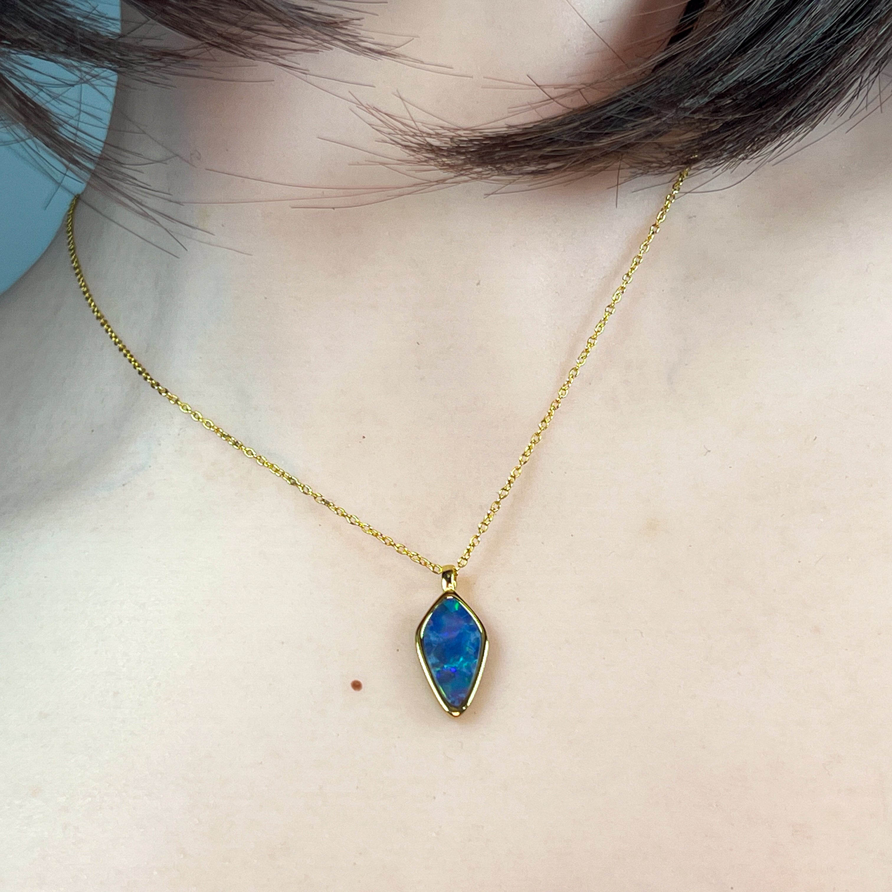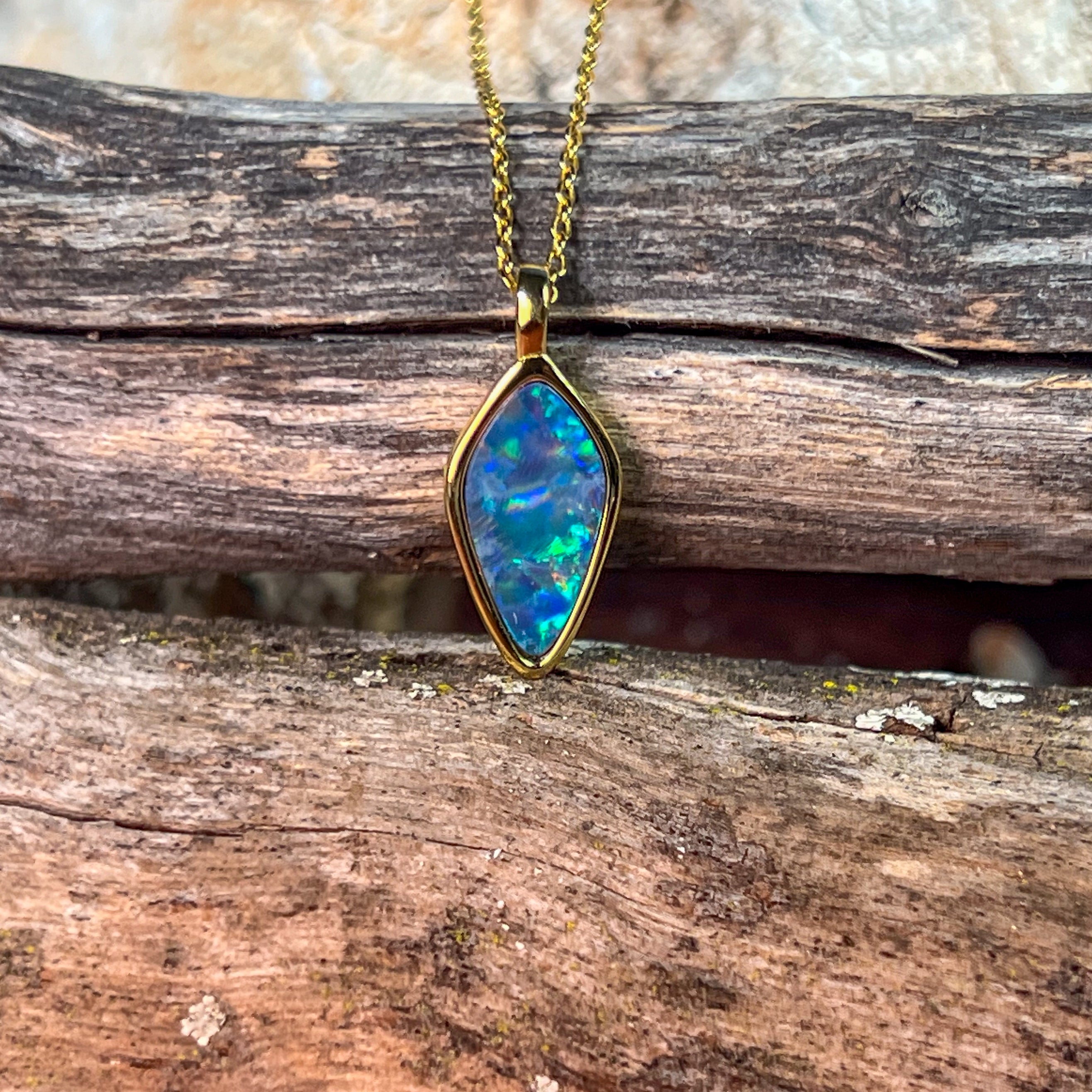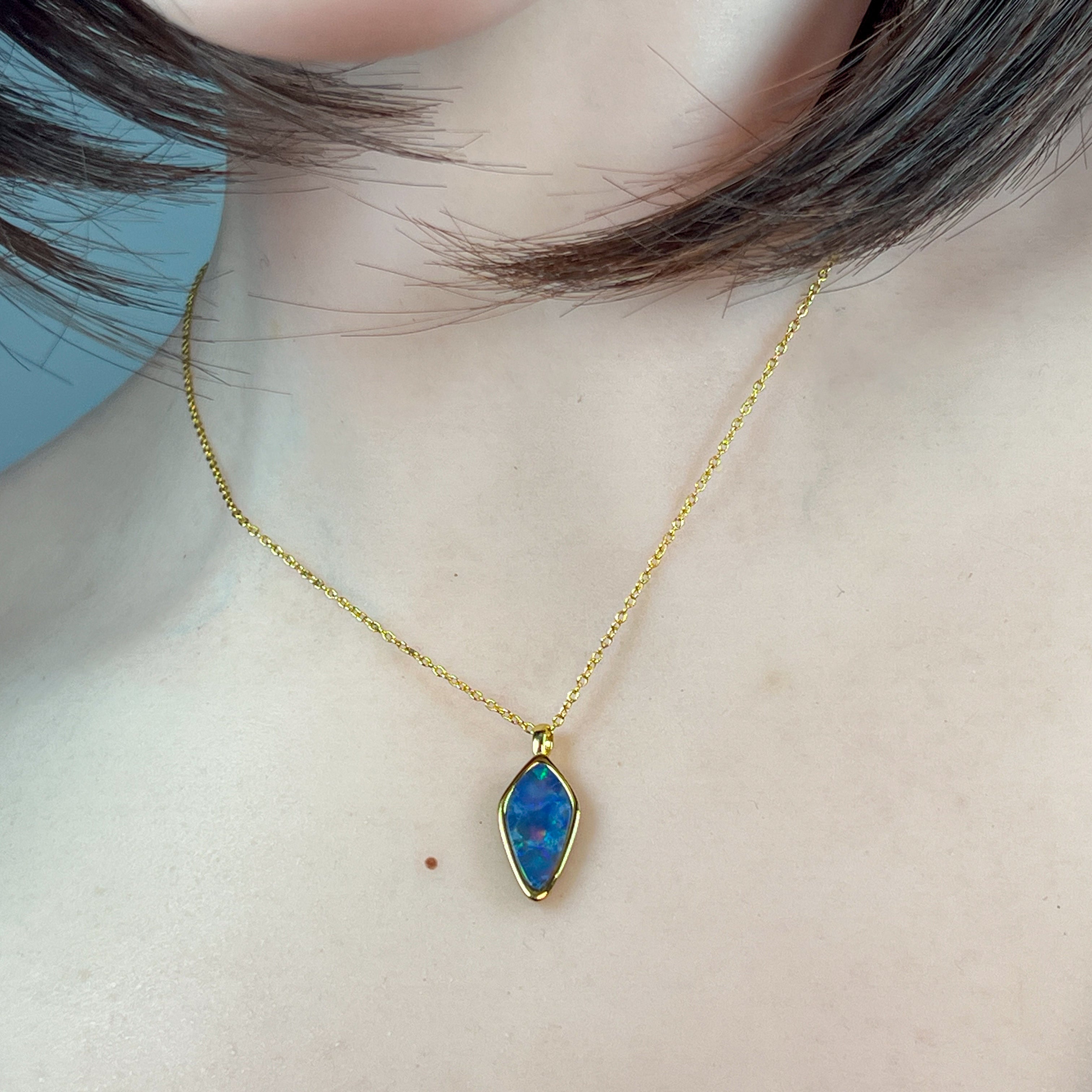 Capture the mesmerizing dance of colour with this stunning kite-shaped opal doublet pendant. Set in gleaming gold-plated silver, this exquisite piece showcases a powerful flash of vibrant hues that shift and shimmer with every movement. The bezel setting cradles the opal securely while allowing light to play across its surface, revealing brilliant blues, greens, and fiery oranges. Perfect for those who crave jewellery that commands attention and sparks conversation, this pendant transforms any outfit into something truly extraordinary.