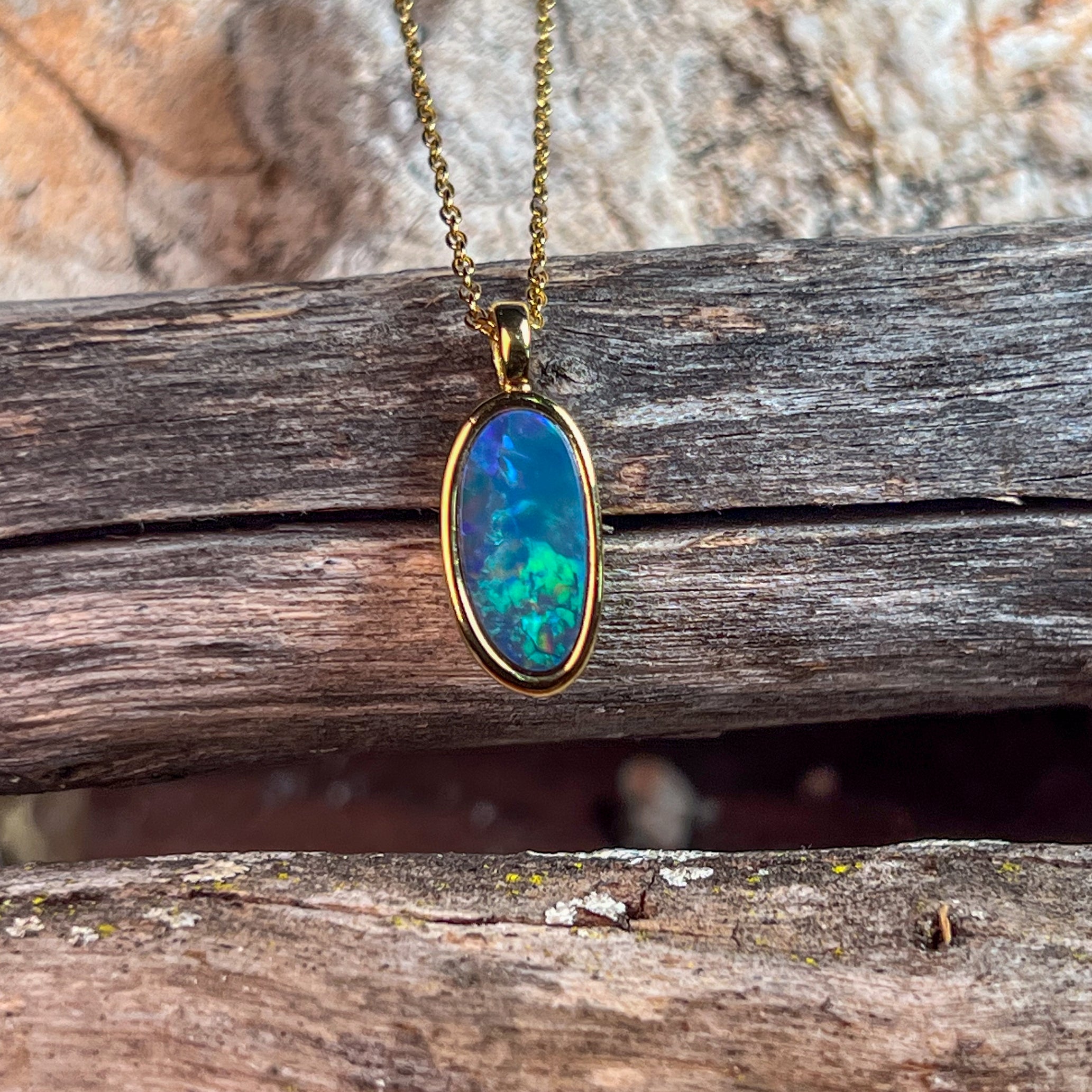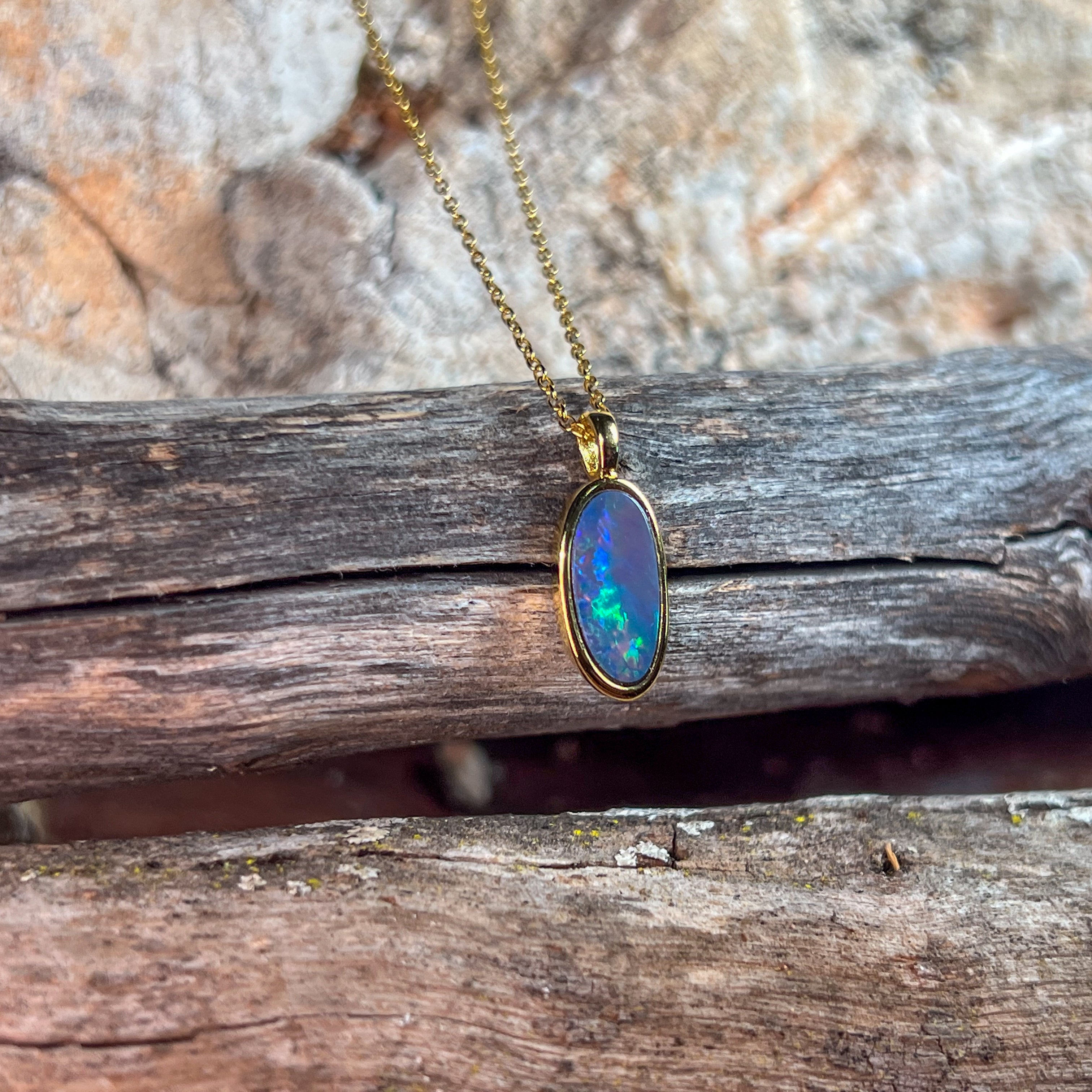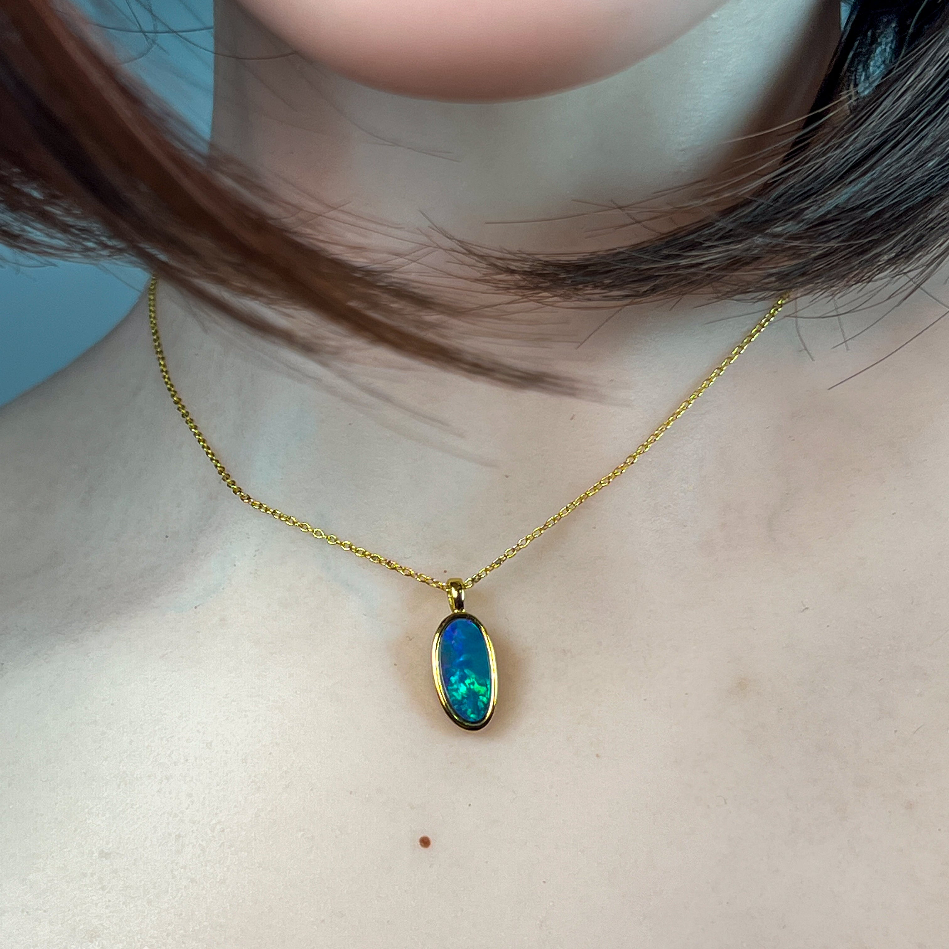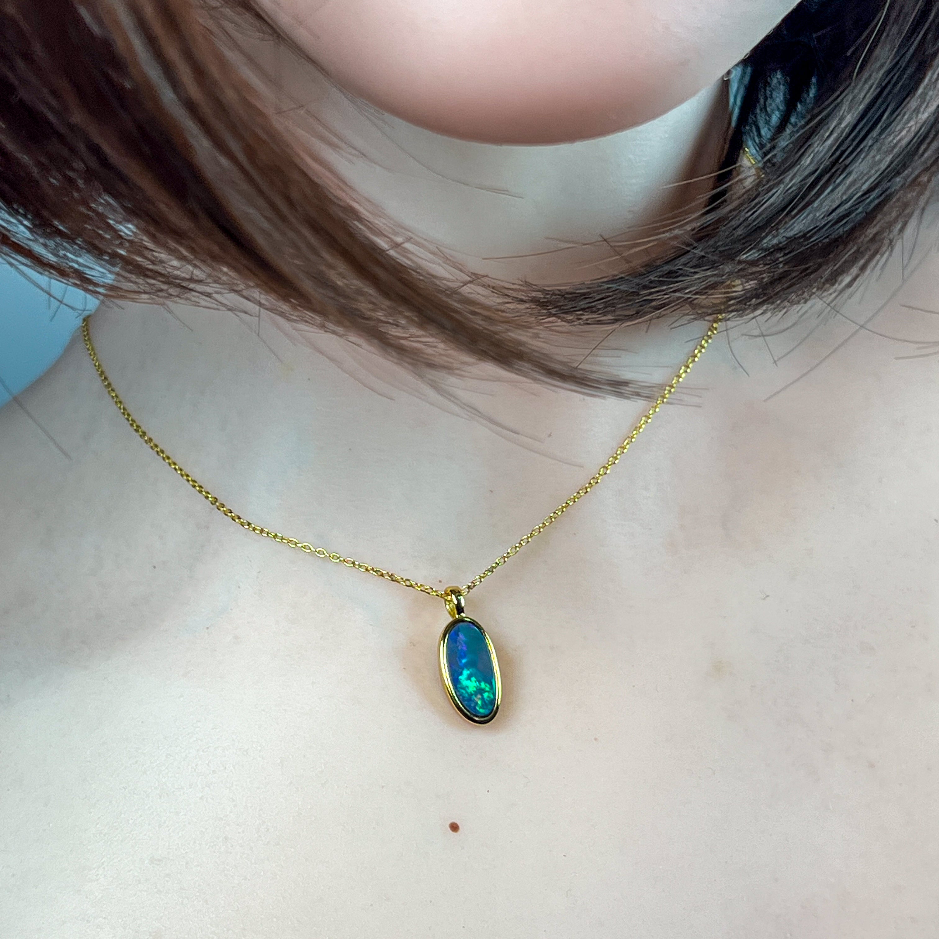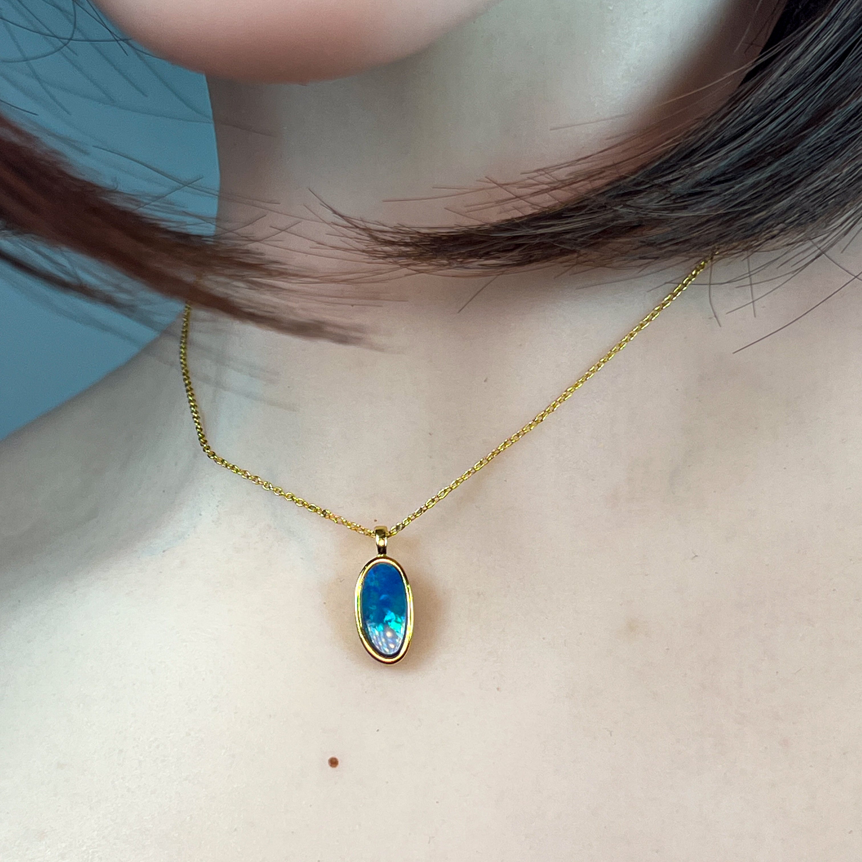 Discover the serene beauty of our Gold Plated Silver Off Oval Opal Doublet Pendant, a stunning piece that captures the mesmerizing sea green hues of nature. This elegant pendant features a carefully selected opal doublet set in lustrous silver with luxurious gold plating, creating a sophisticated contrast that elevates any ensemble. The off-oval shape adds contemporary flair while the opal's natural play-of-colour brings movement and depth to your jewellery collection. Perfect for those seeking a distinctive piece that combines timeless elegance with modern design, this pendant makes an unforgettable statement.
