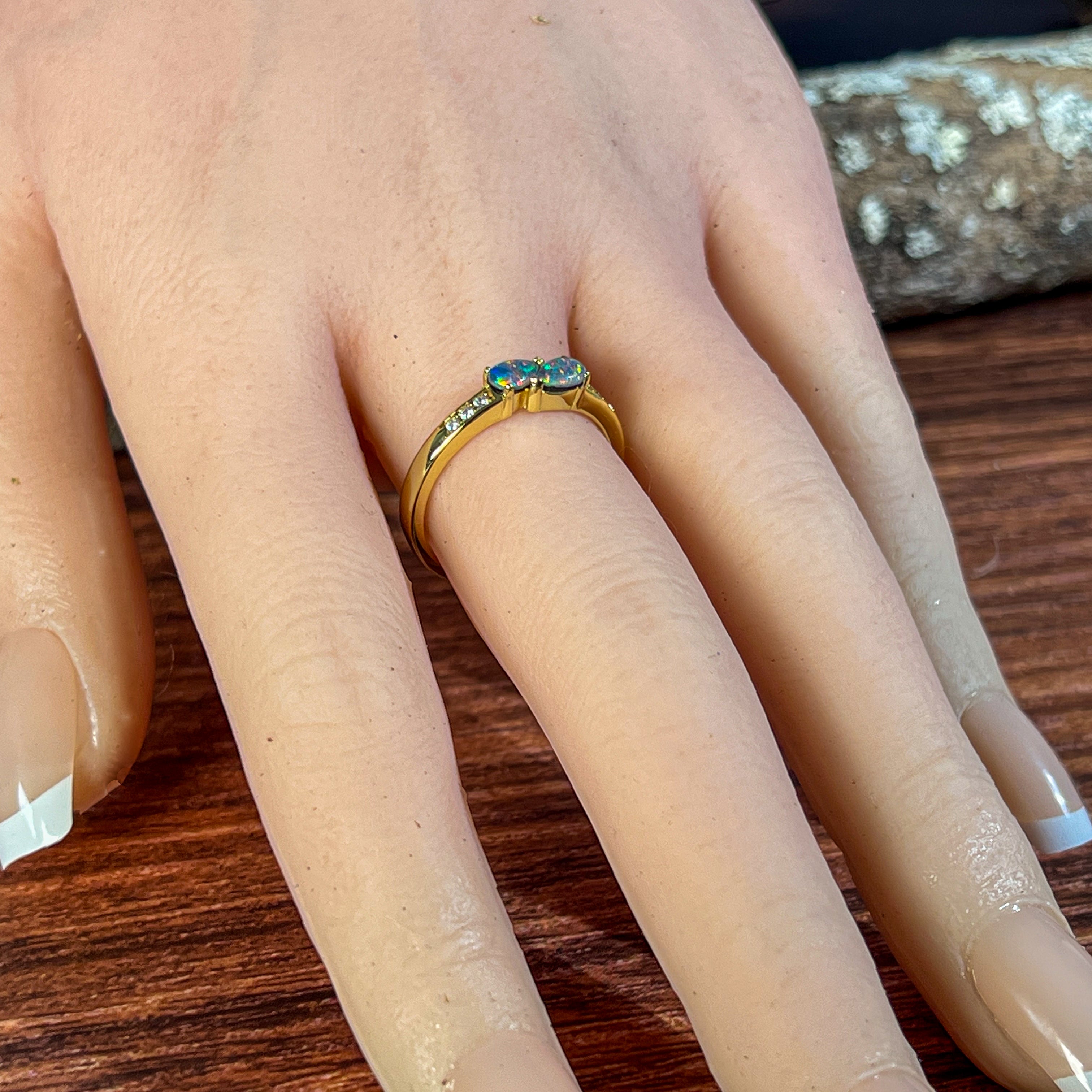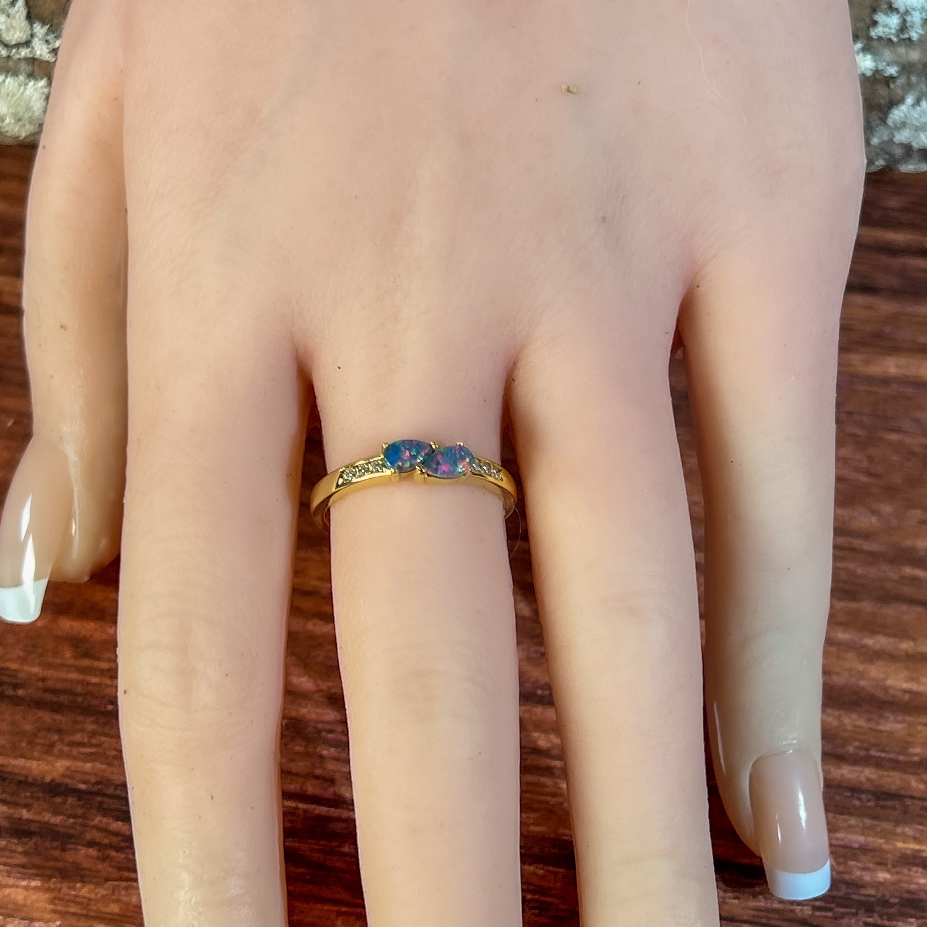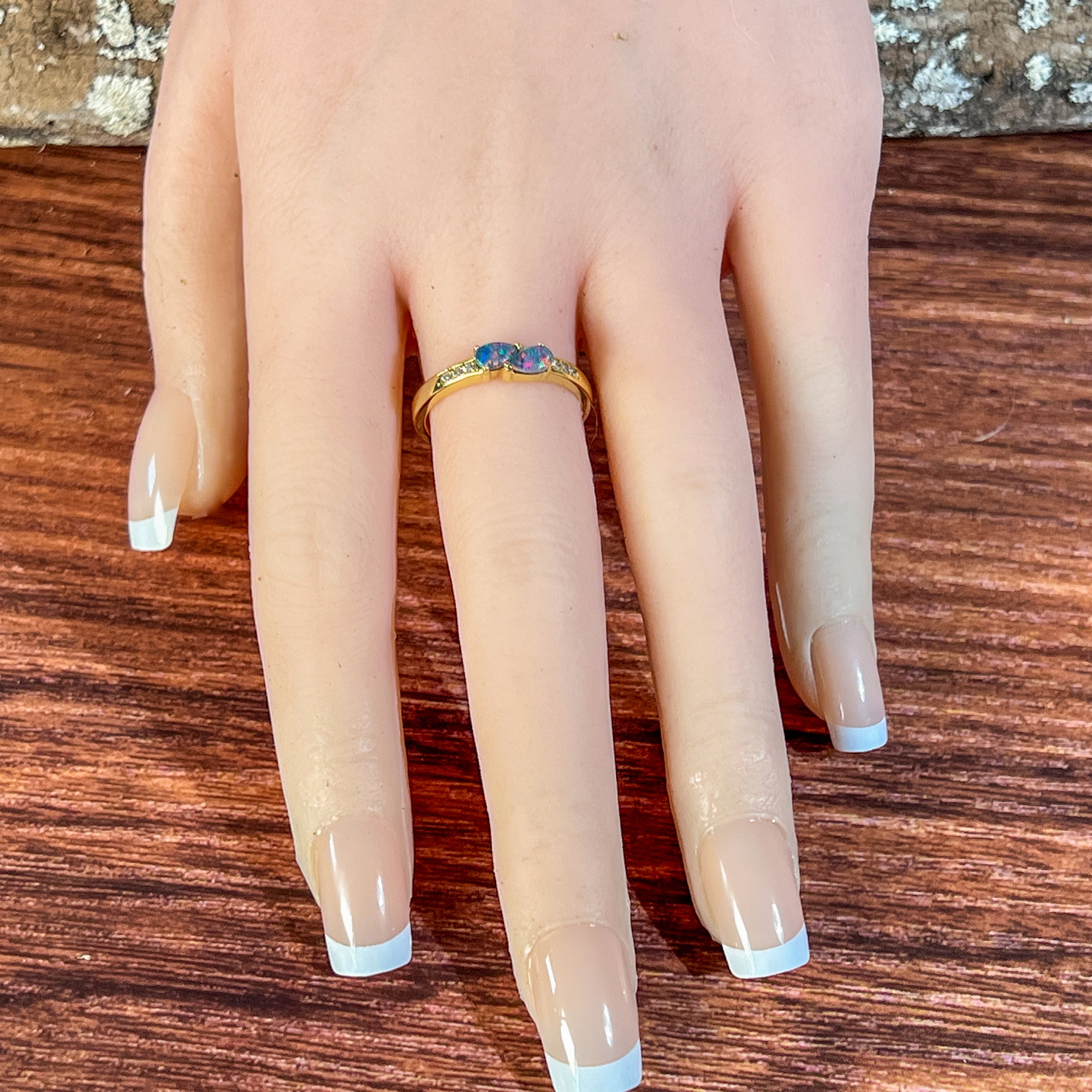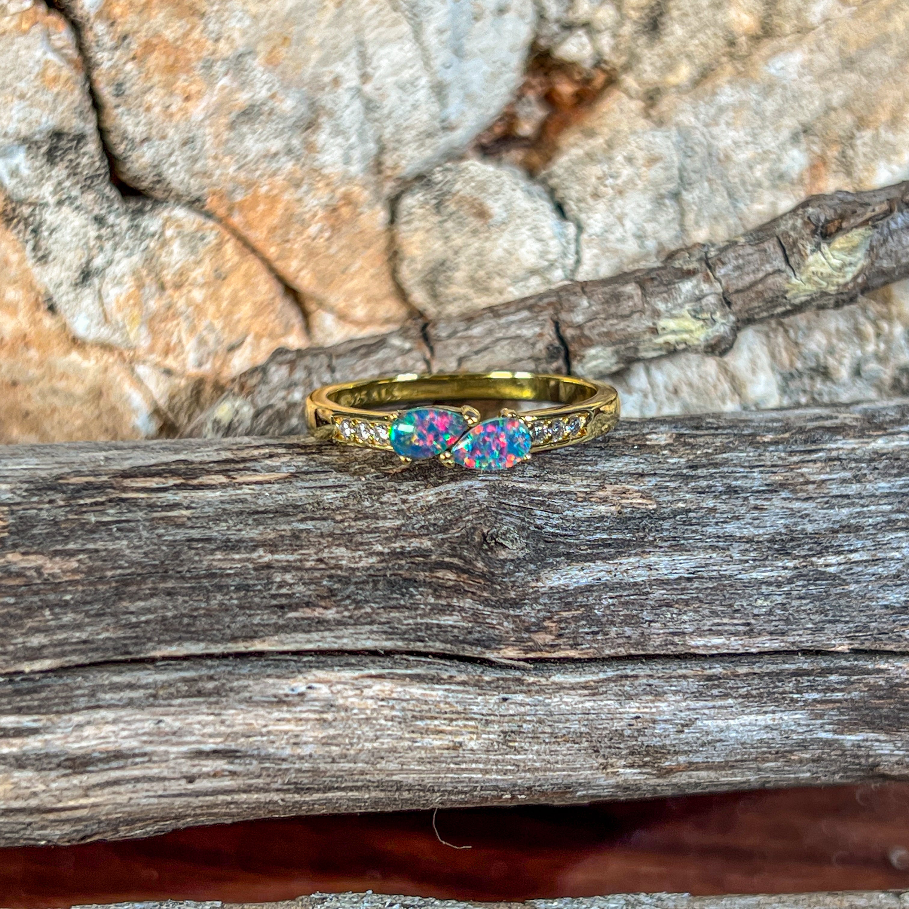 Experience timeless elegance with our Gold plated Silver two pearshape opal triplet 5x3mm ring. The dainty modern design adds a touch of sophistication to any outfit. Feel confident and stylish with this exquisite piece of jewelry.