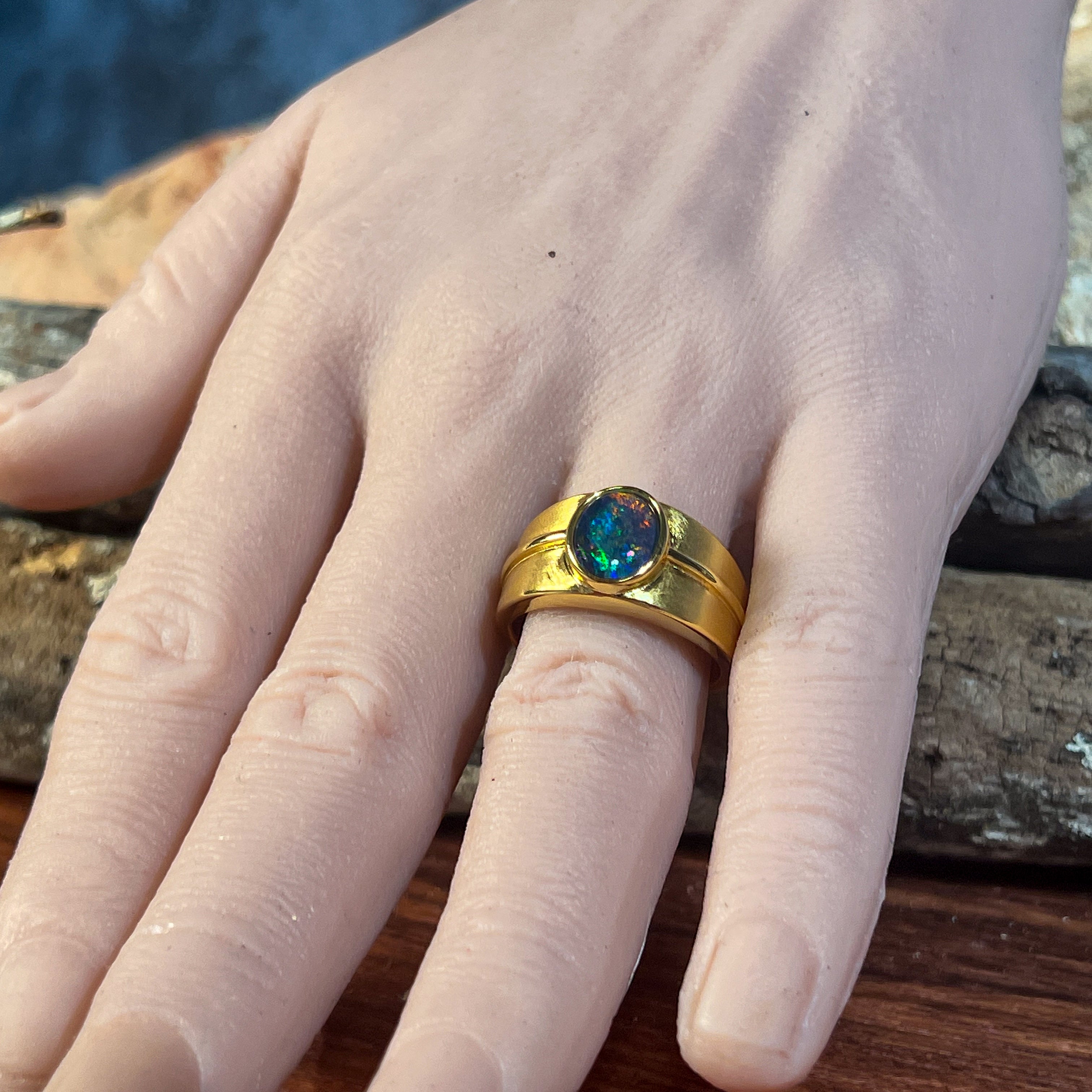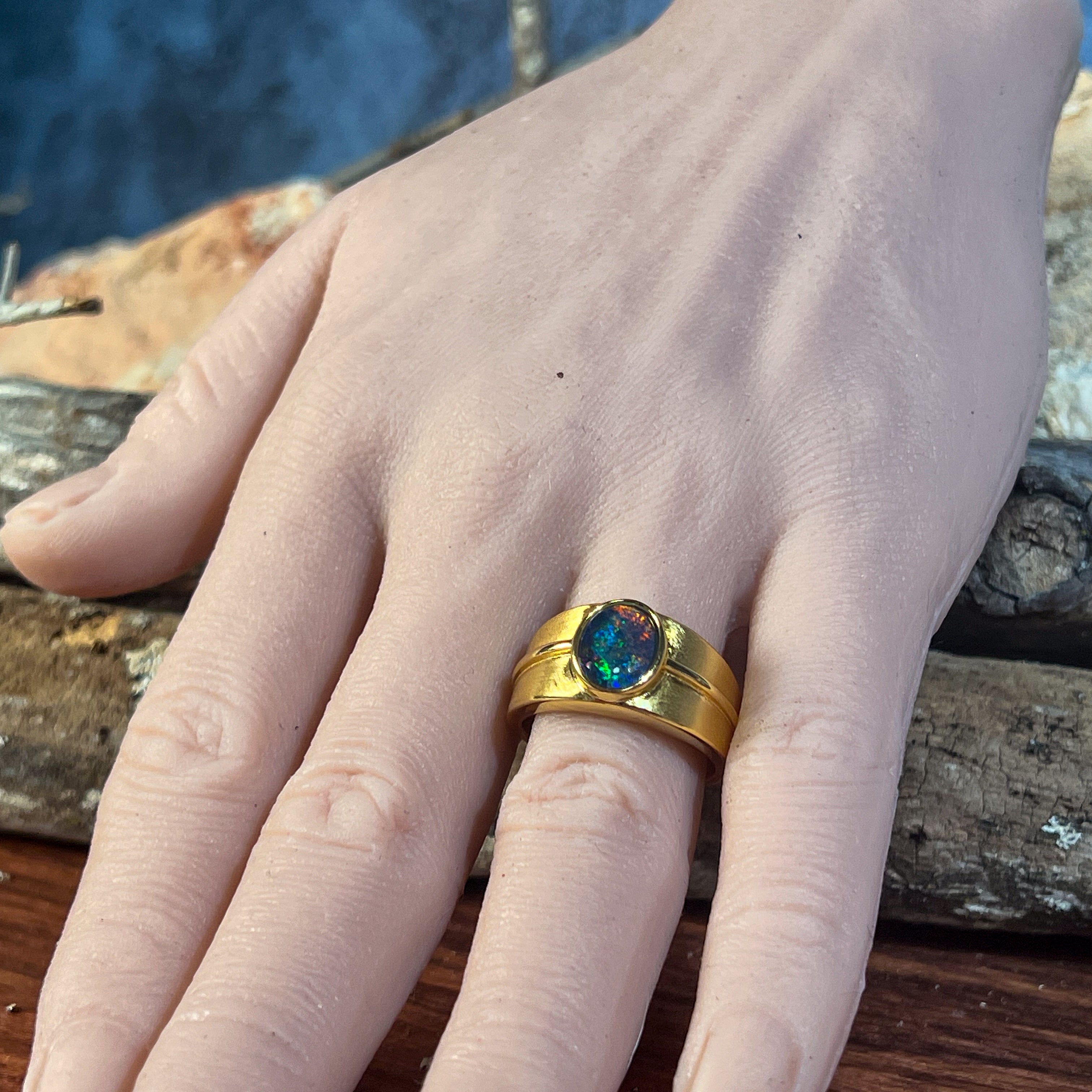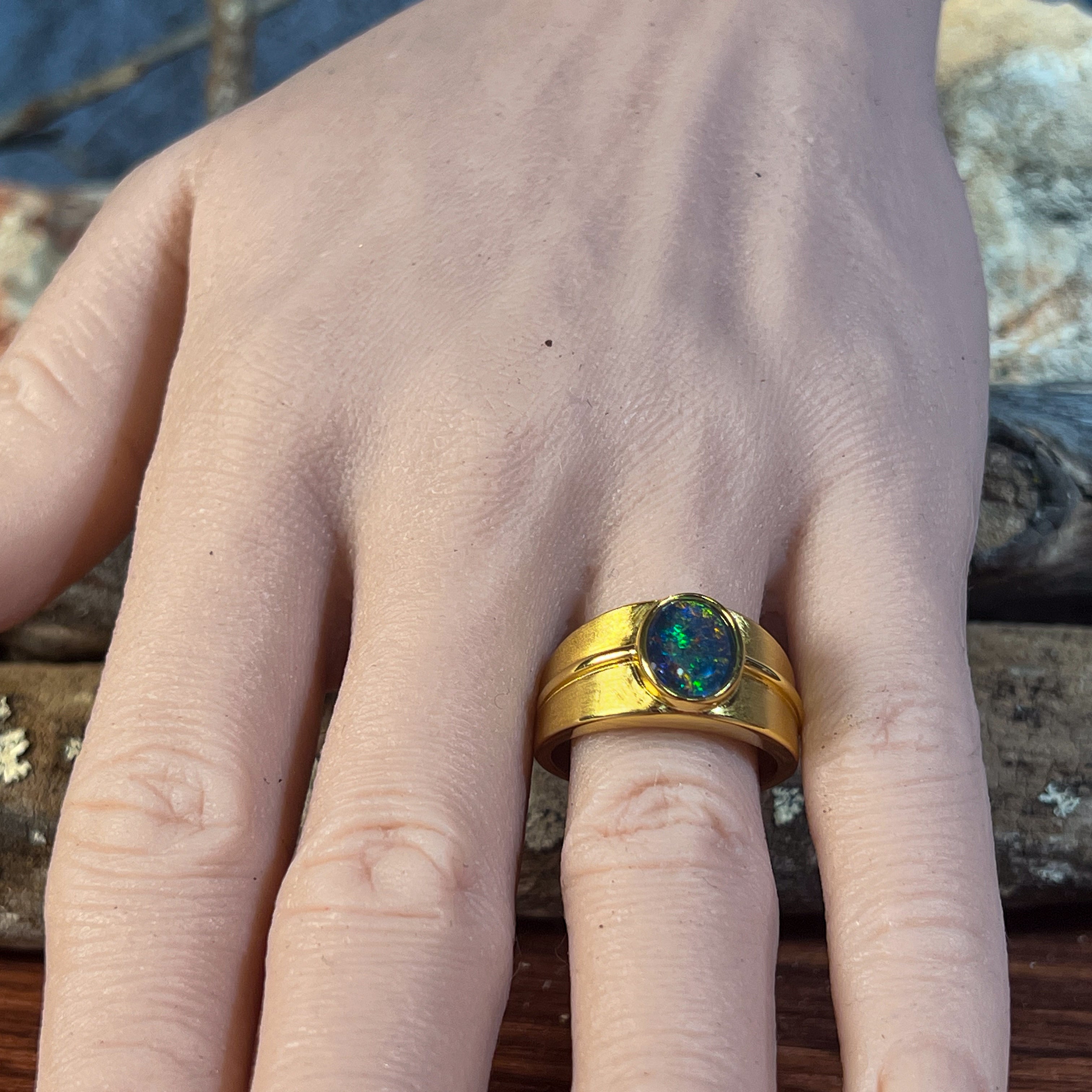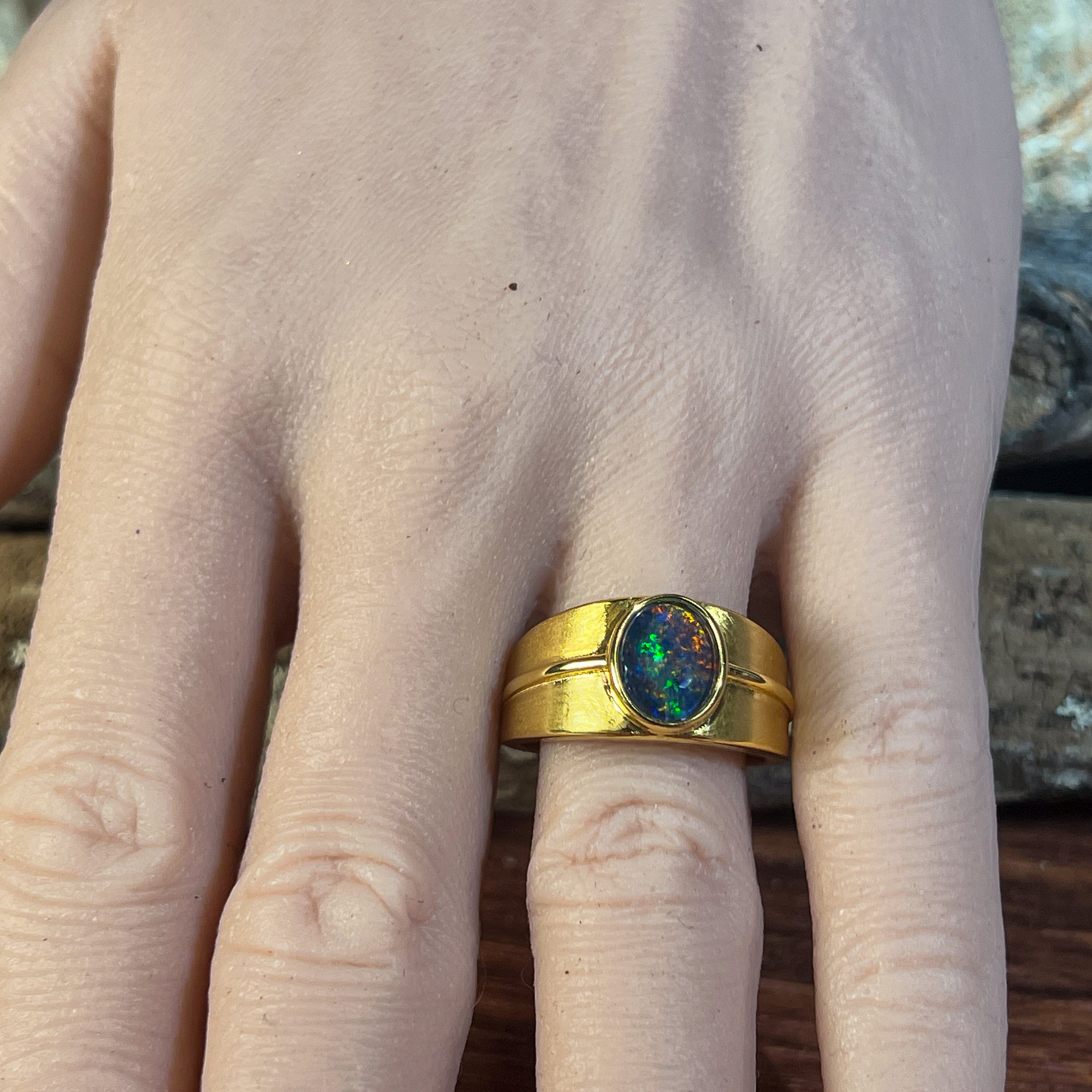 Gold plated Sterling Silver 11x9mm Opal triplet matte finish graduating broad ring