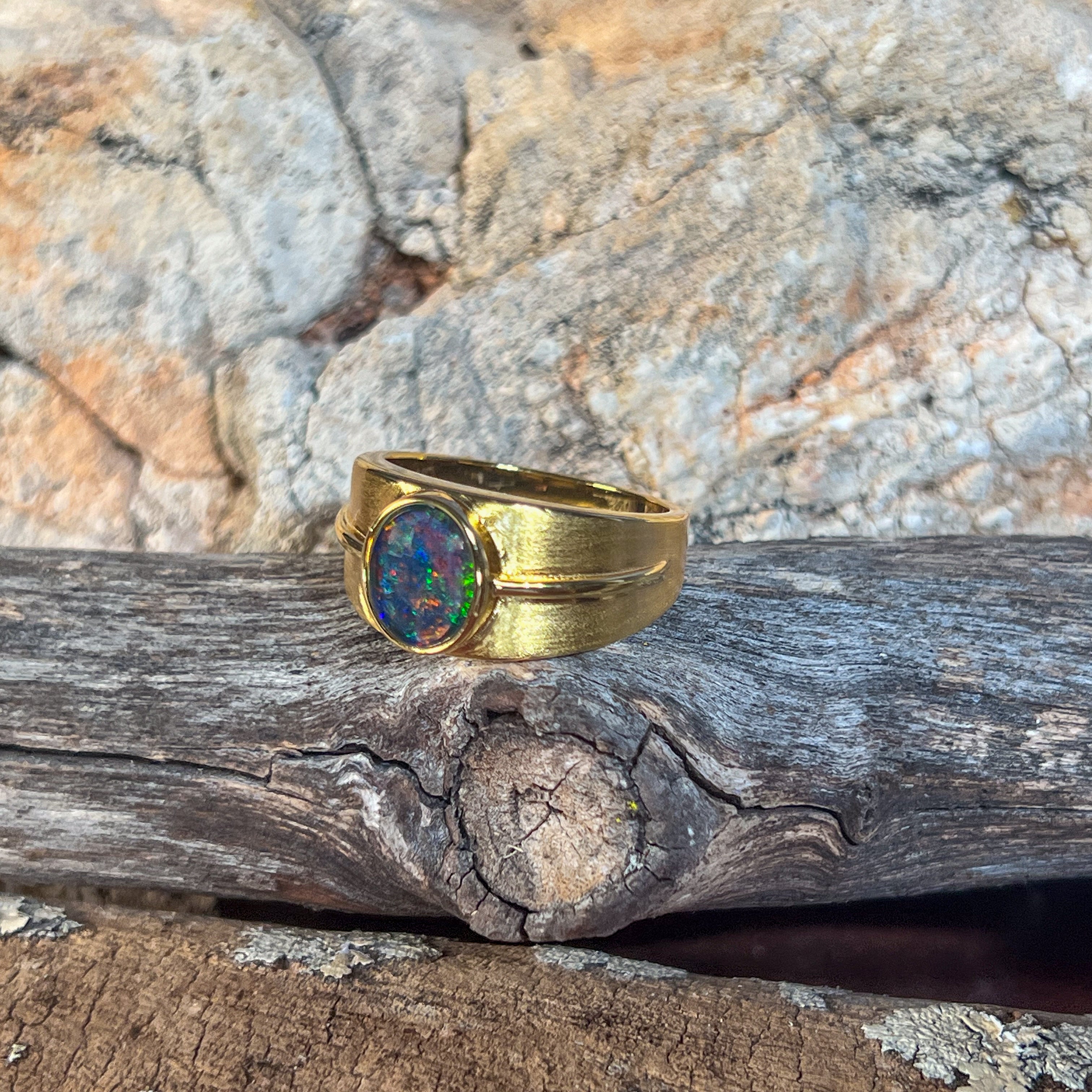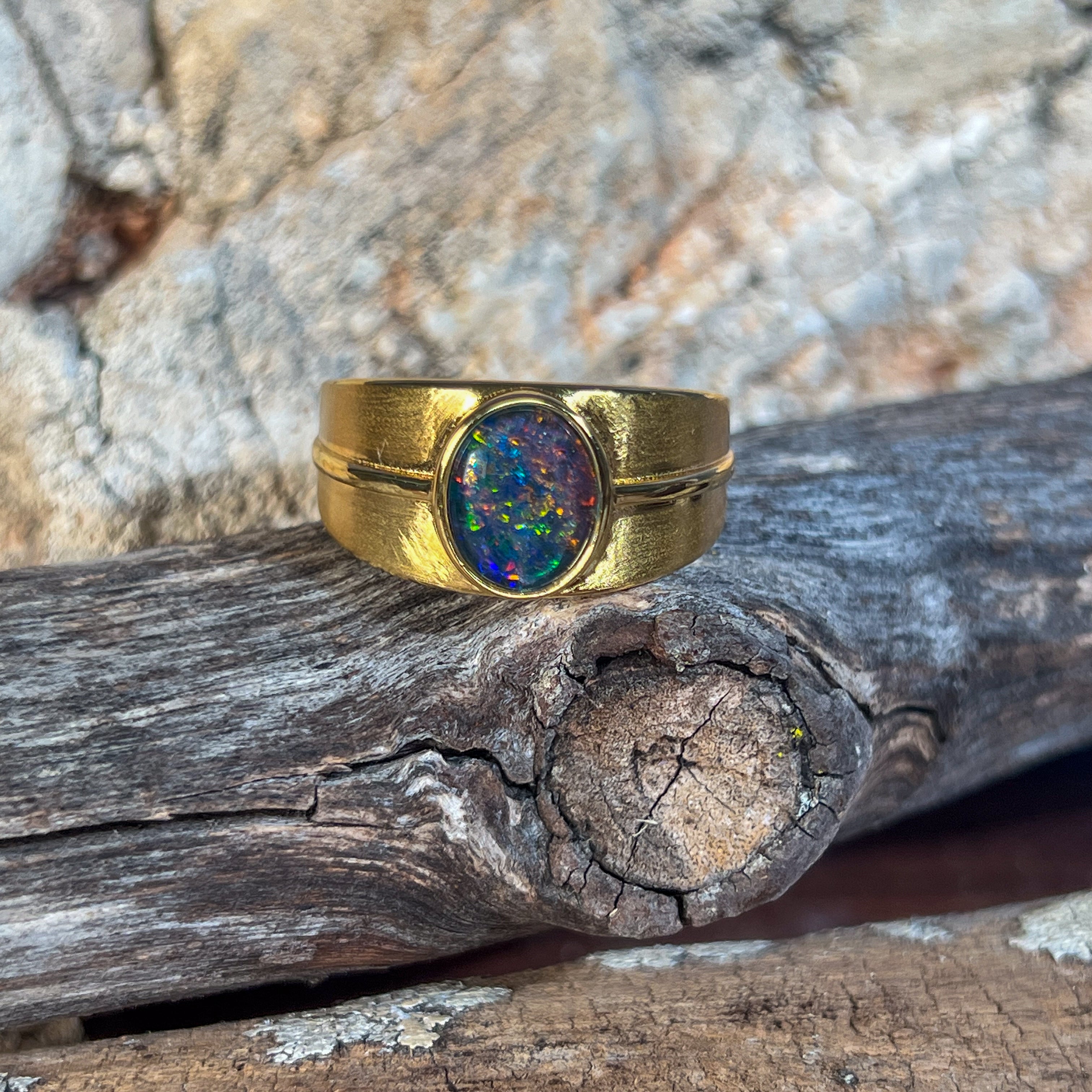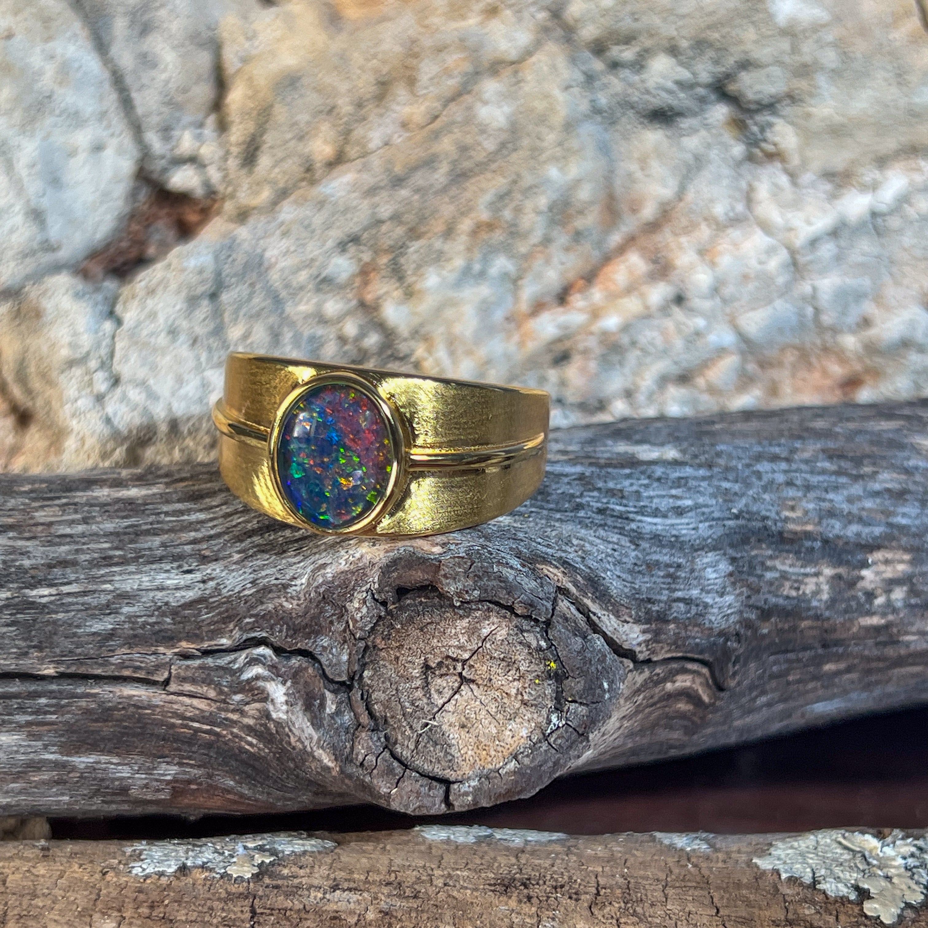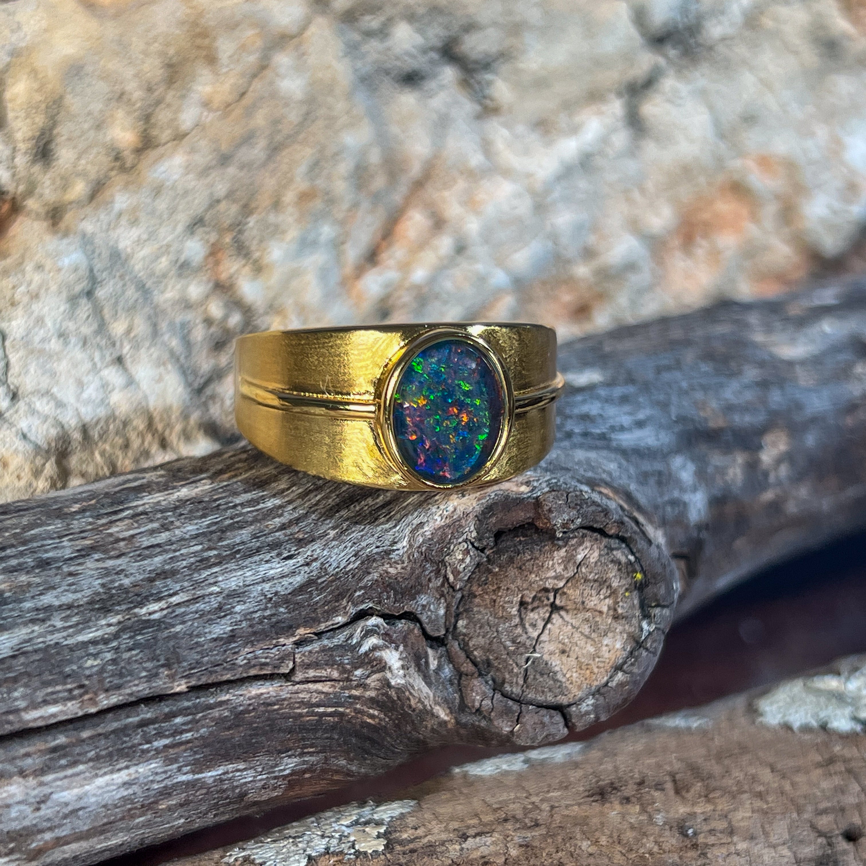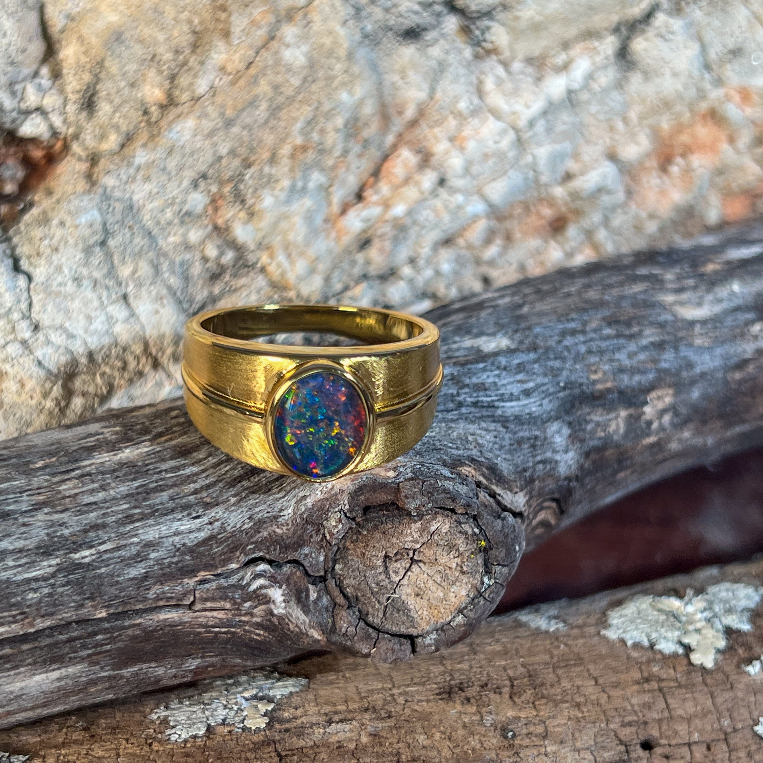 Upgrade your style with our exquisite Gold plated Sterling Silver ring! Featuring a stunning 11x9mm Opal triplet, this GENTS MATTE TAPERING BROAD ring adds a touch of elegance to any outfit. The matte finish gives it a modern edge, making it perfect for any occasion.