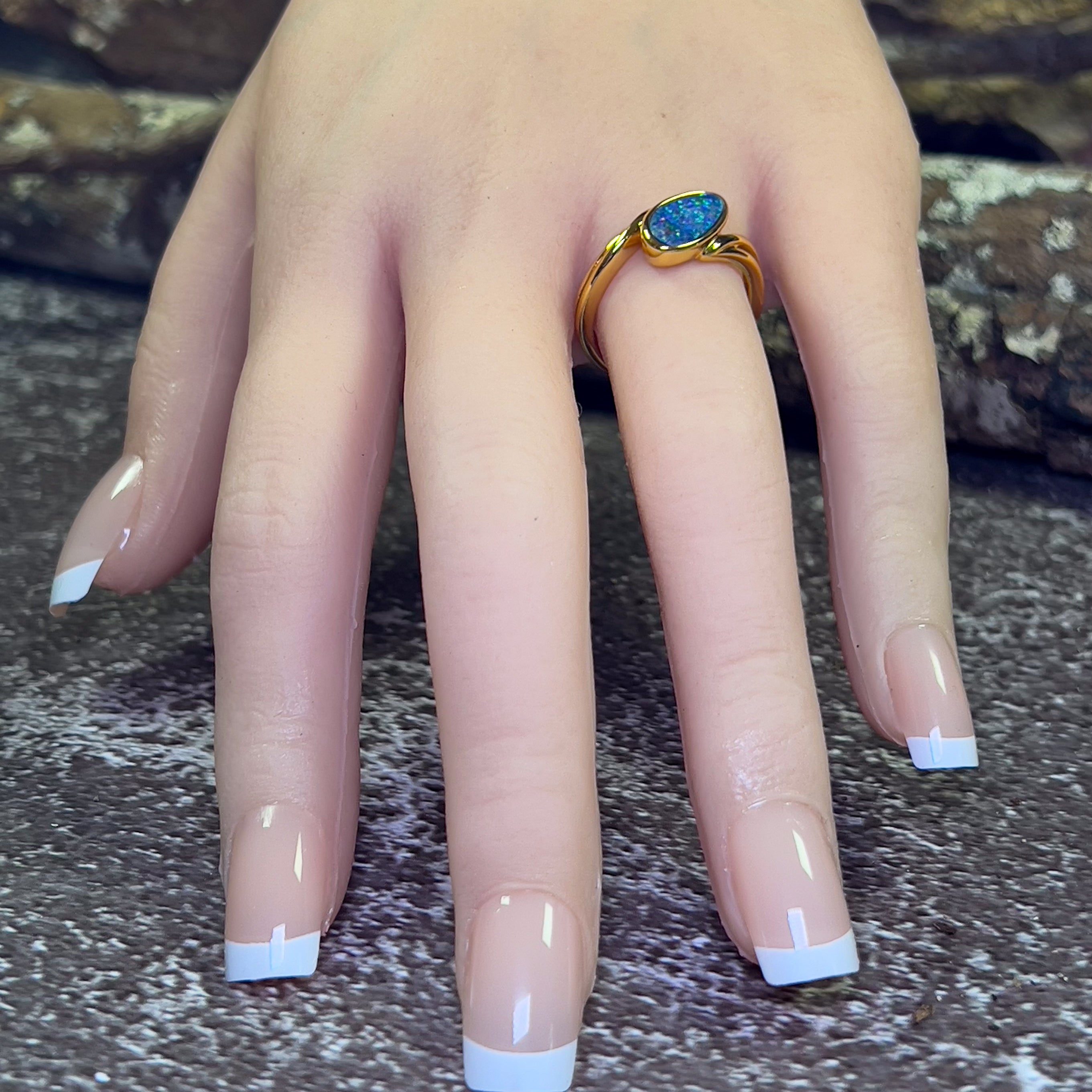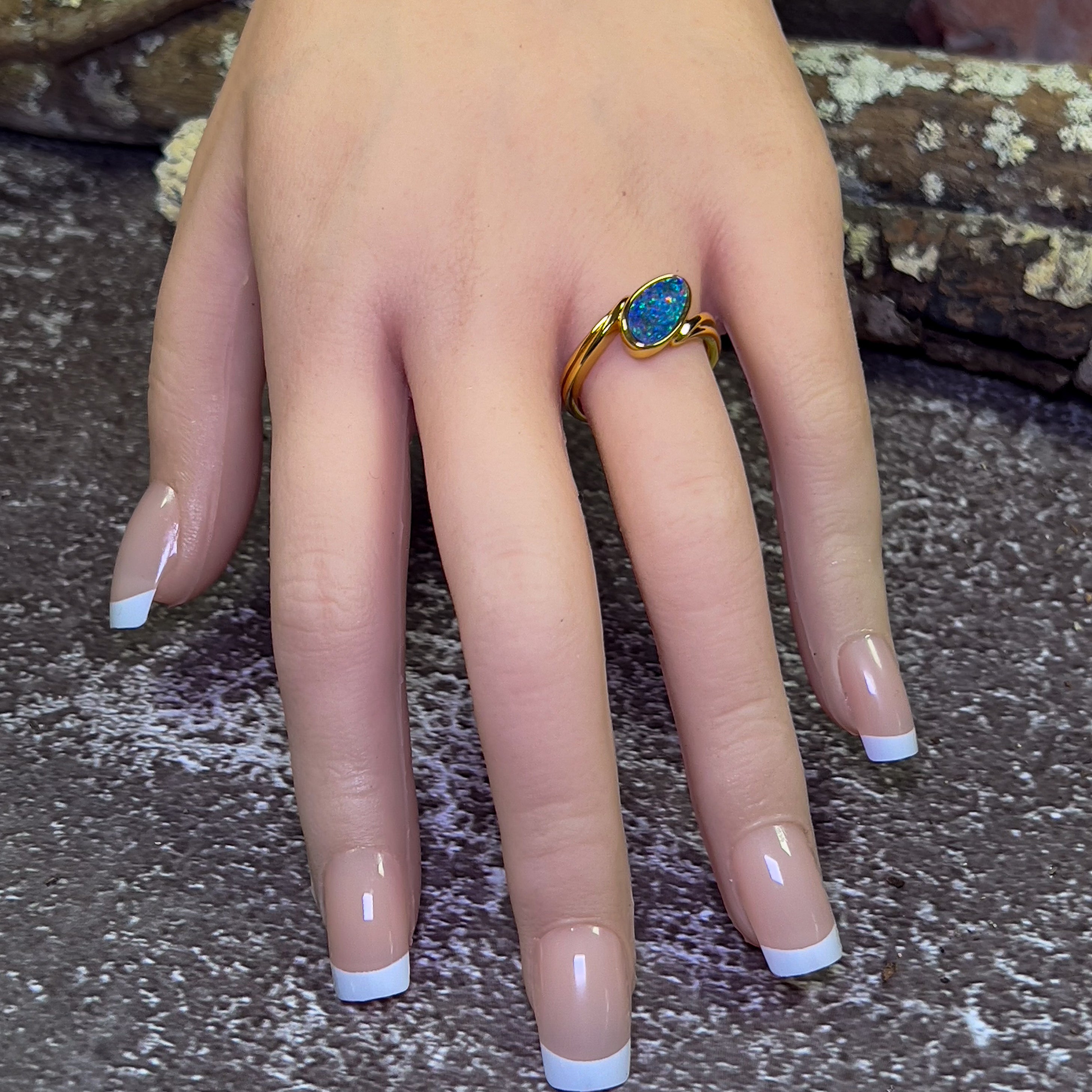 Add an unexpected twist to your jewelry collection with our Gold Plated Sterling Silver Opal doublet ring. This unique piece features a playful crossover style, providing a fun and unconventional touch to any outfit. Upgrade your accessory game with our doublet ring today!