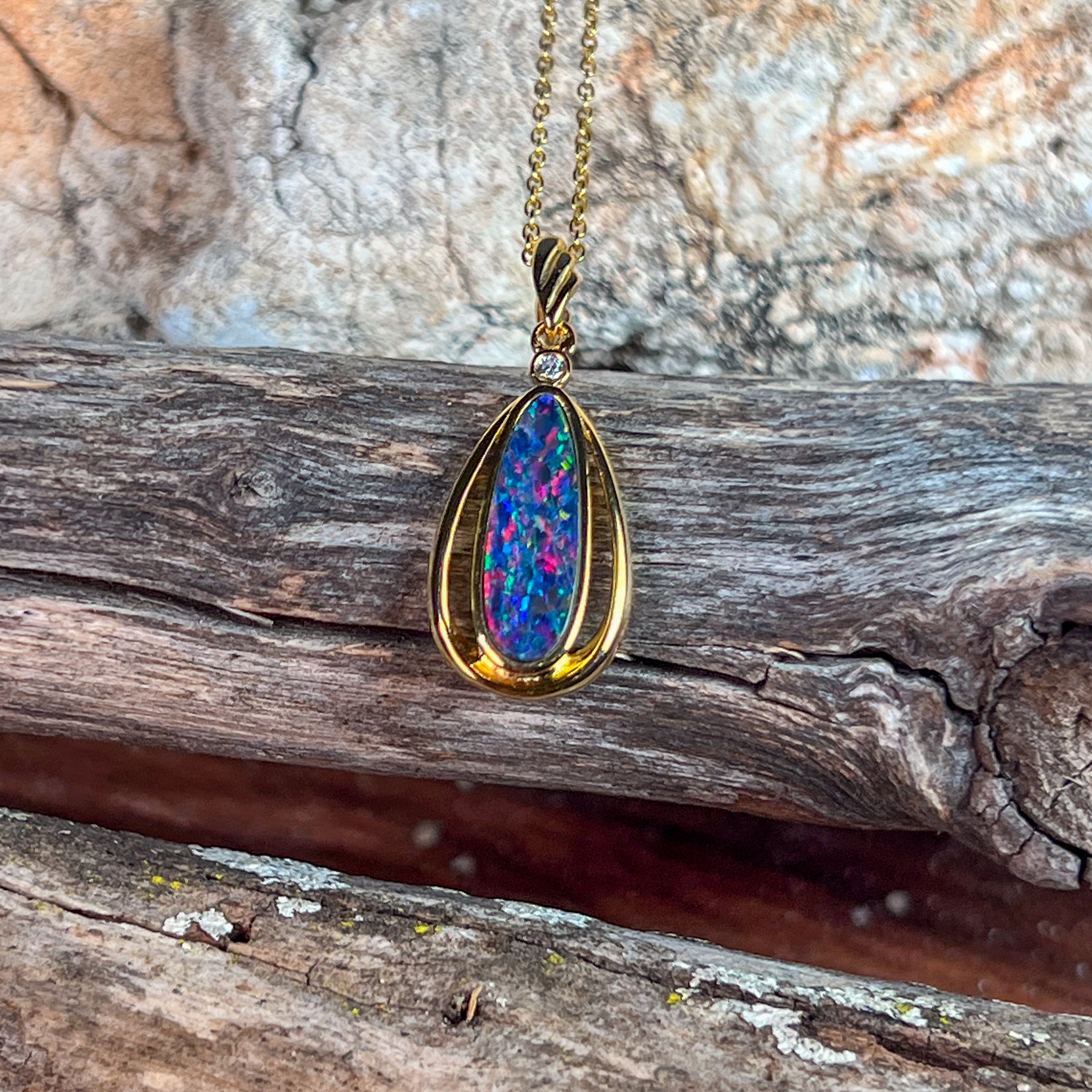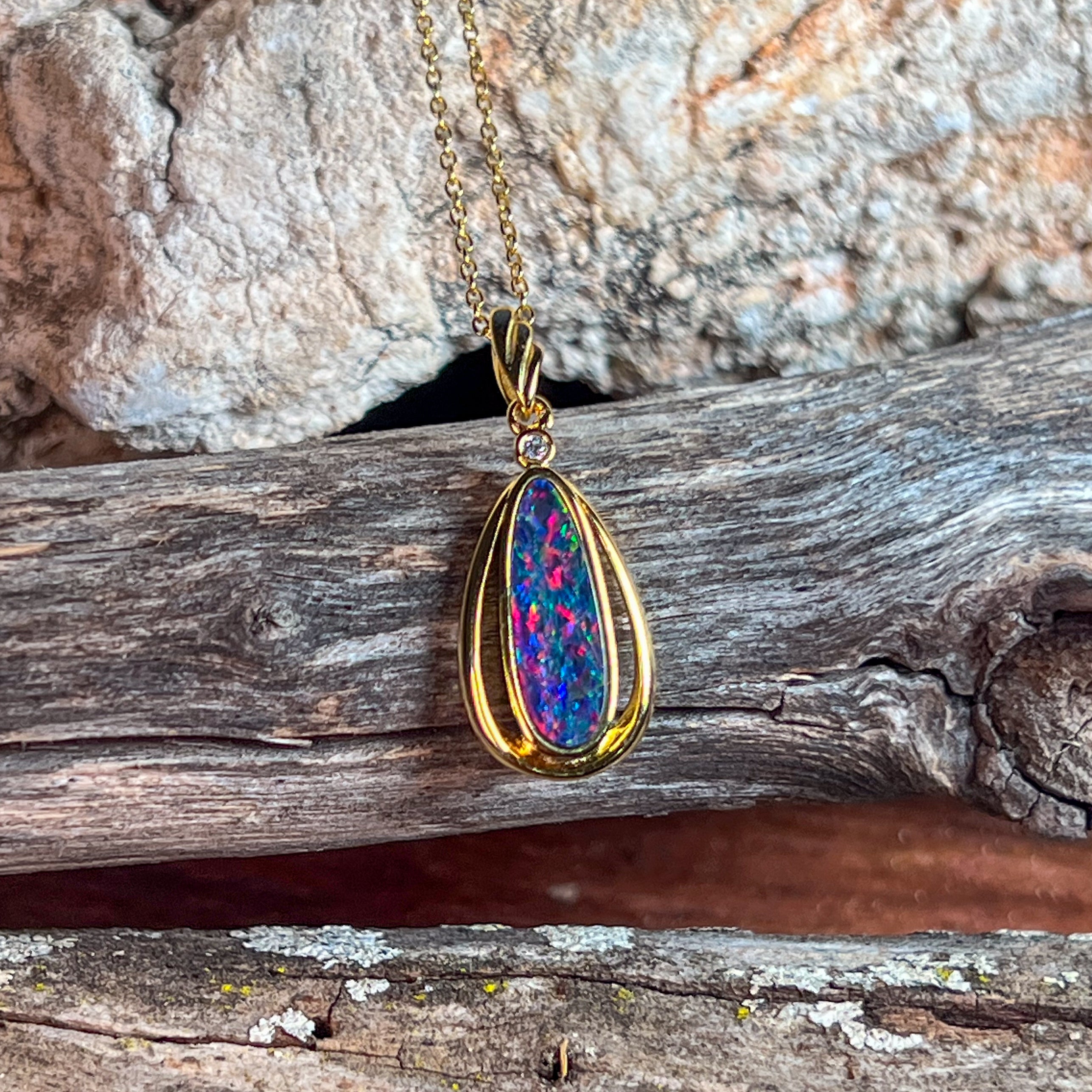 This exquisite opal doublet pendant showcases nature's most captivating colour play in a striking red-blue palette. Crafted from sterling silver with luxurious gold plating, the elongated design creates an elegant silhouette that catches light beautifully. The vibrant opal doublet displays those mesmerising colour shifts that make each piece uniquely yours. Perfect for adding sophistication to any jewellery collection, this pendant combines timeless craftsmanship with the raw beauty of genuine opal. A statement piece that transforms any outfit into something truly extraordinary.