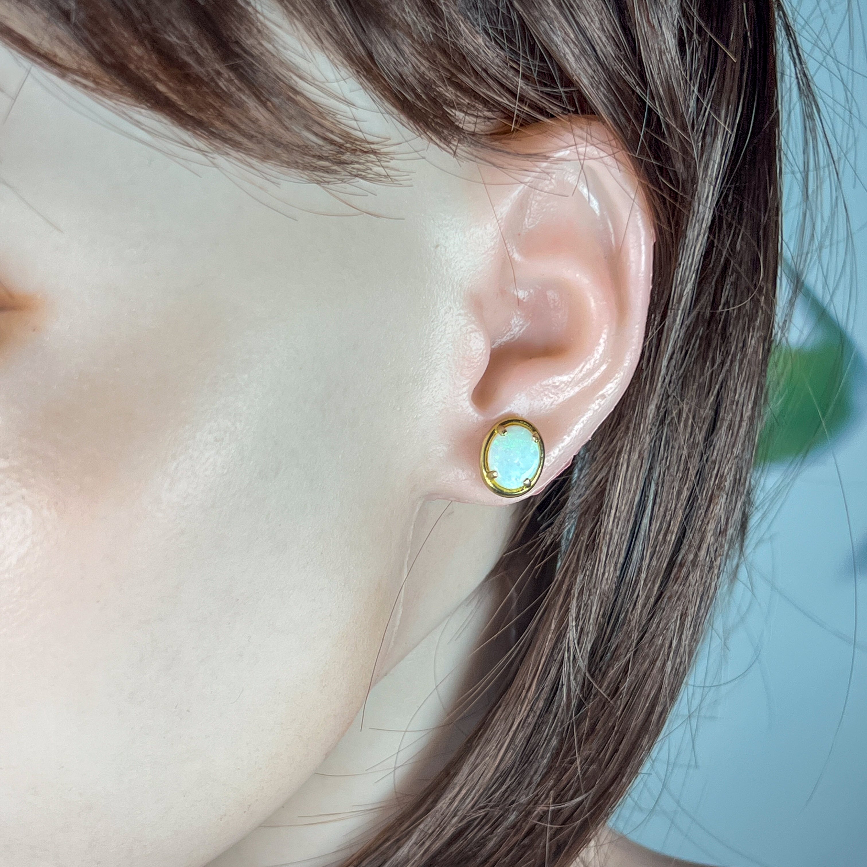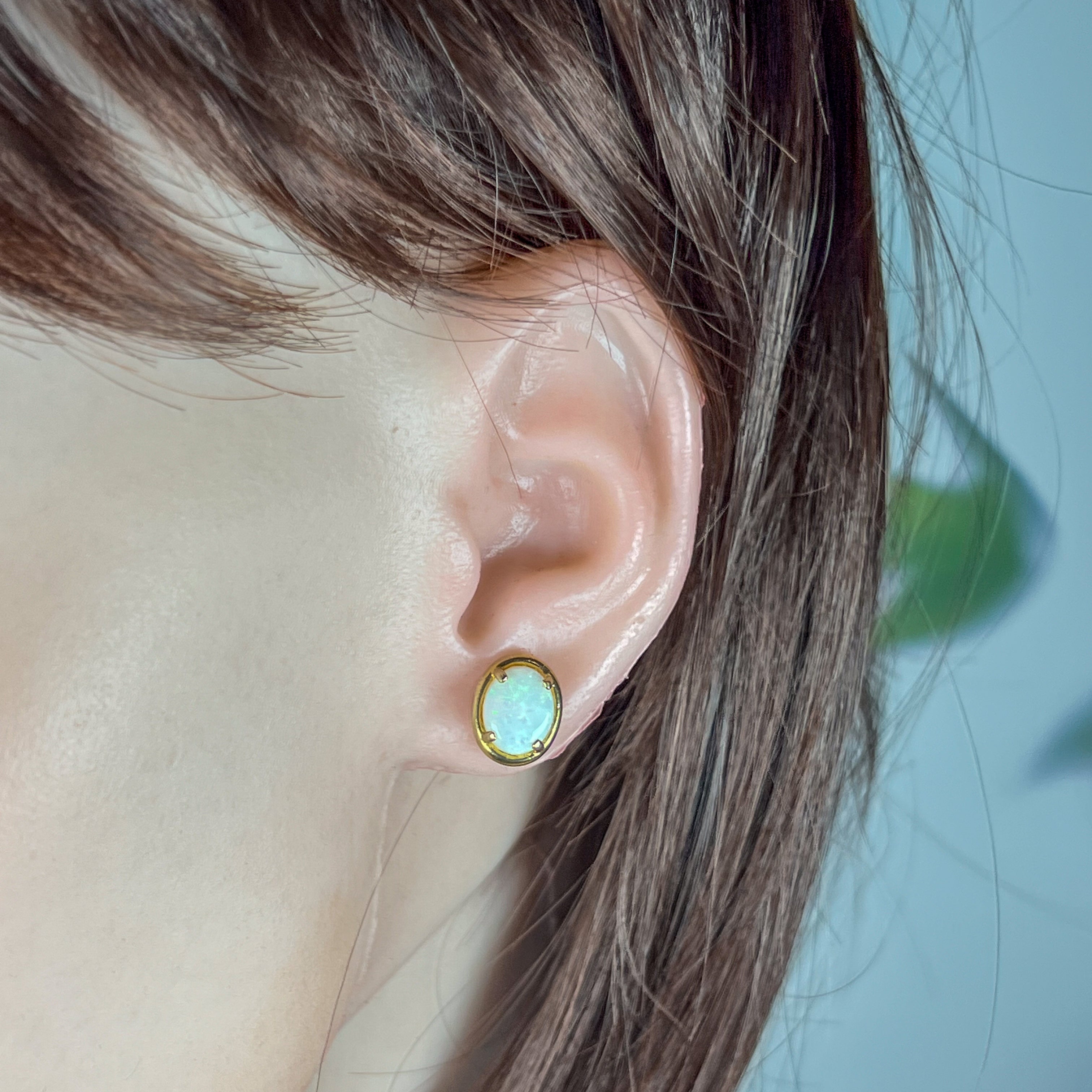 Gold plated Sterling Silver White Opal 10x8mm studs claw set with bezel design studs