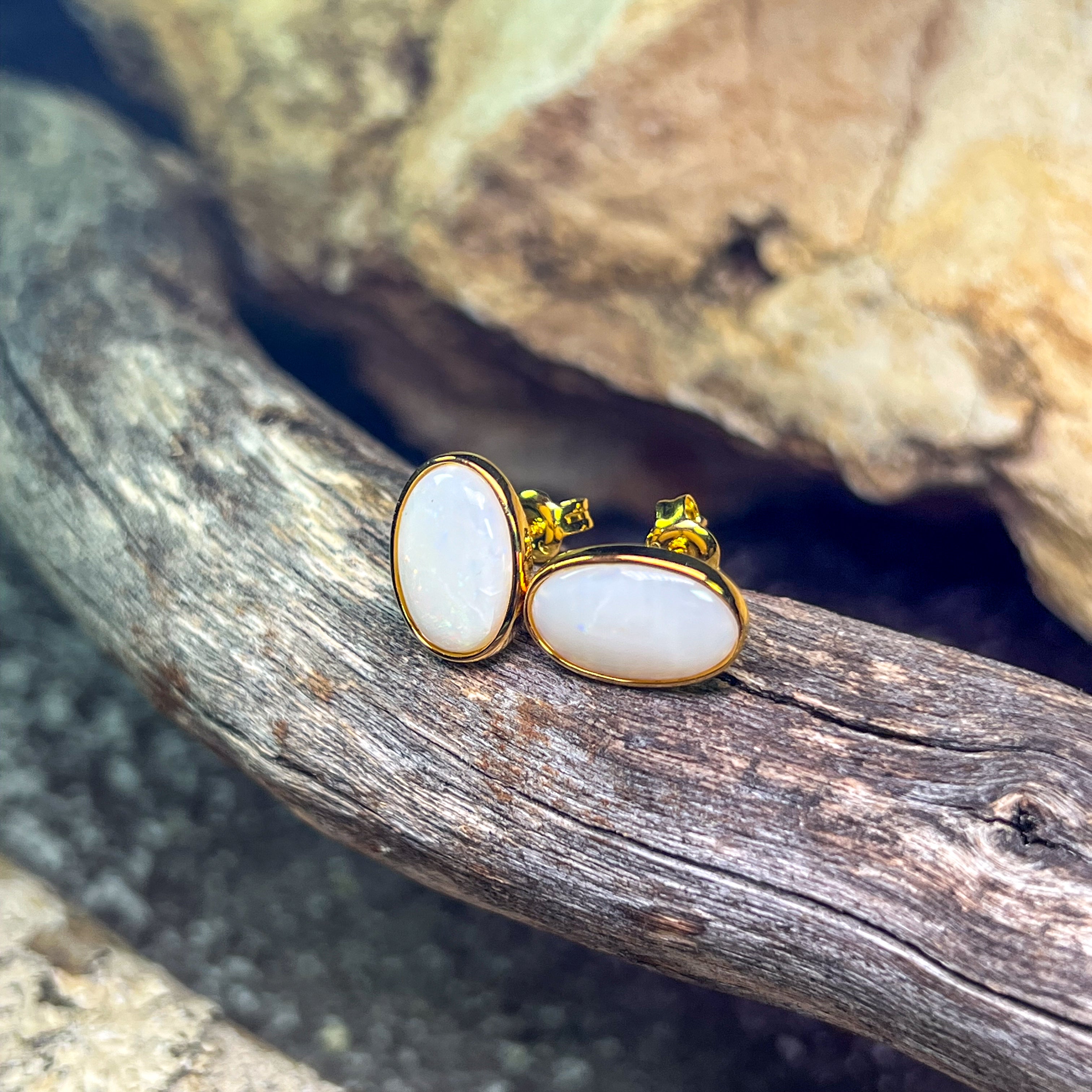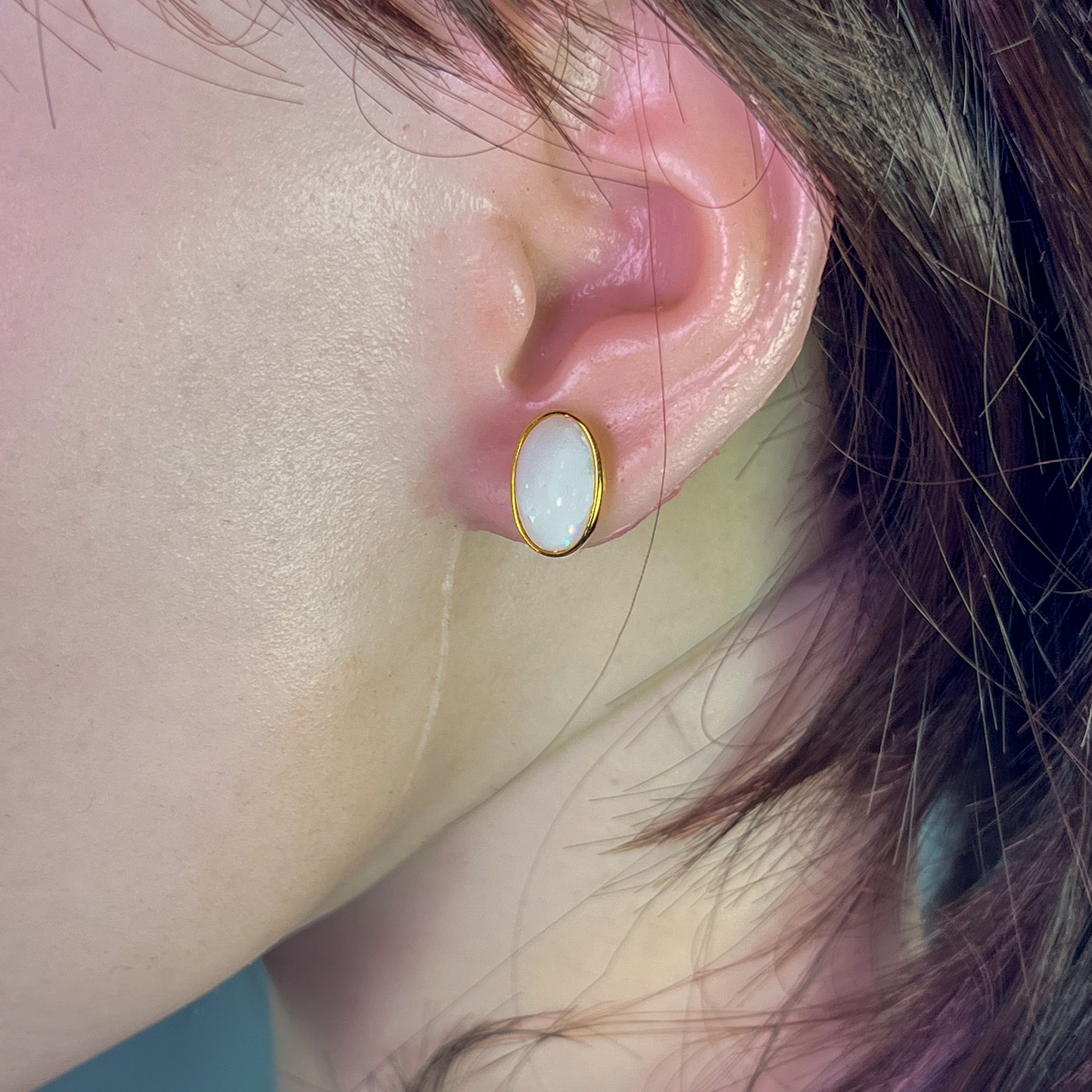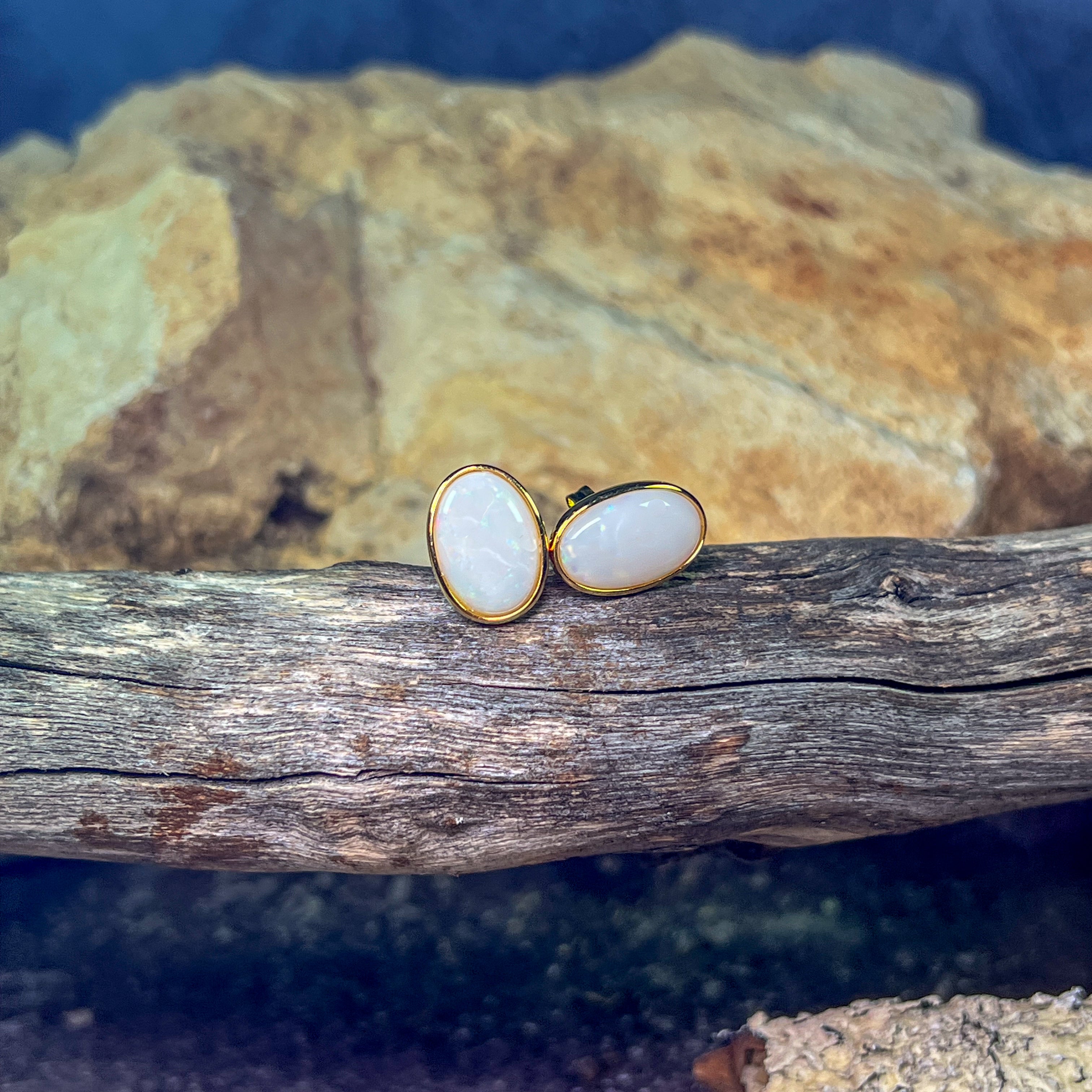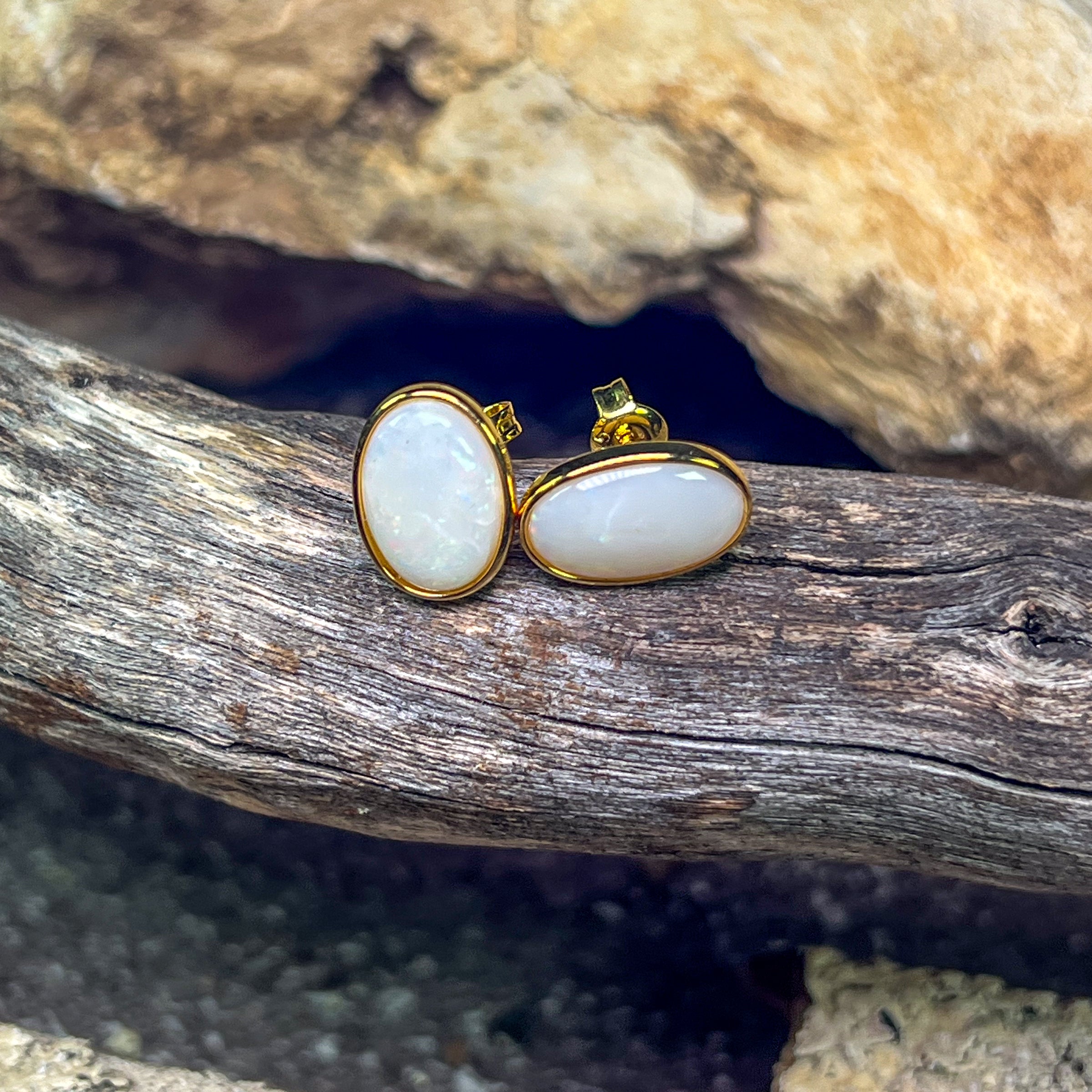 Gold Plated Sterling Silver White Opal bezel set studs 13x8mm