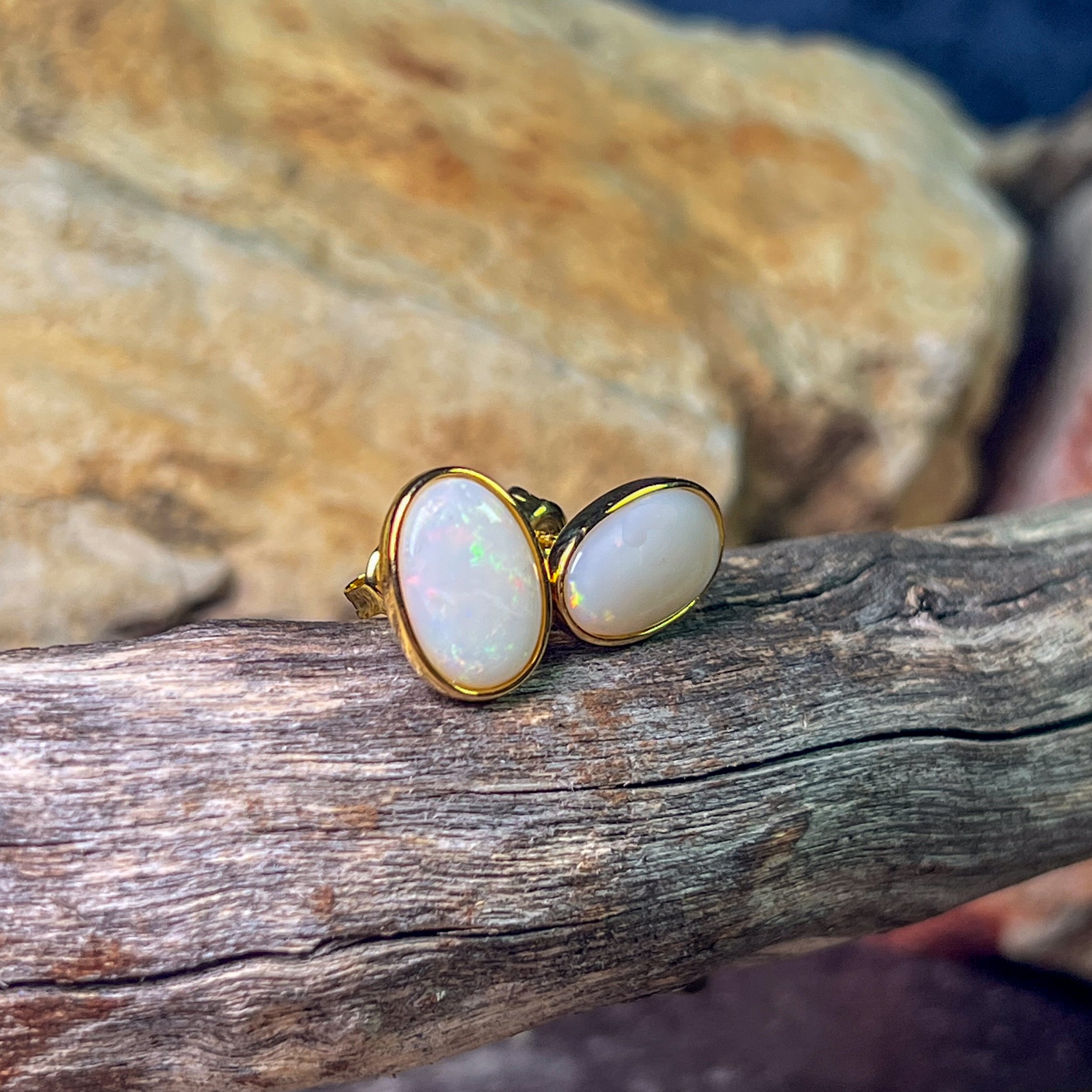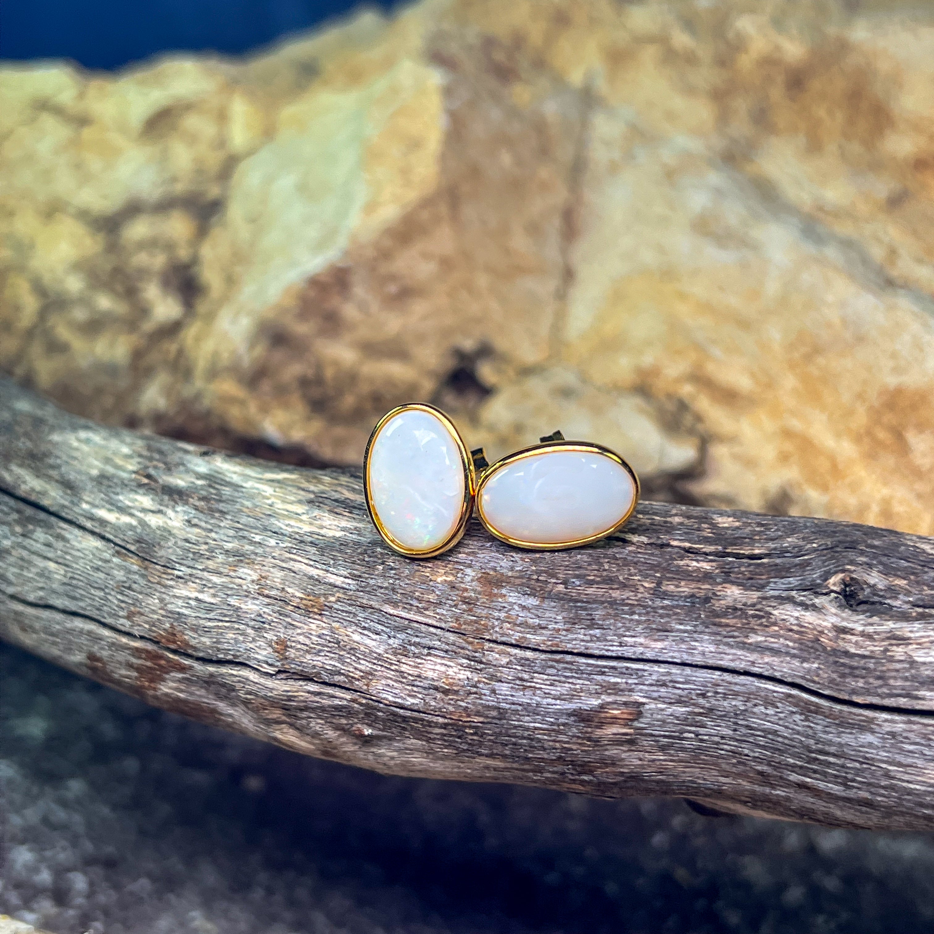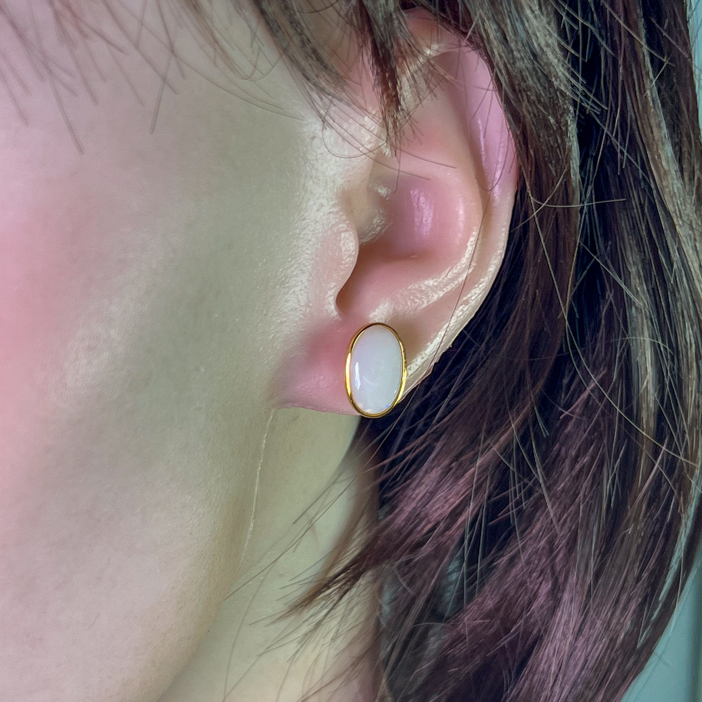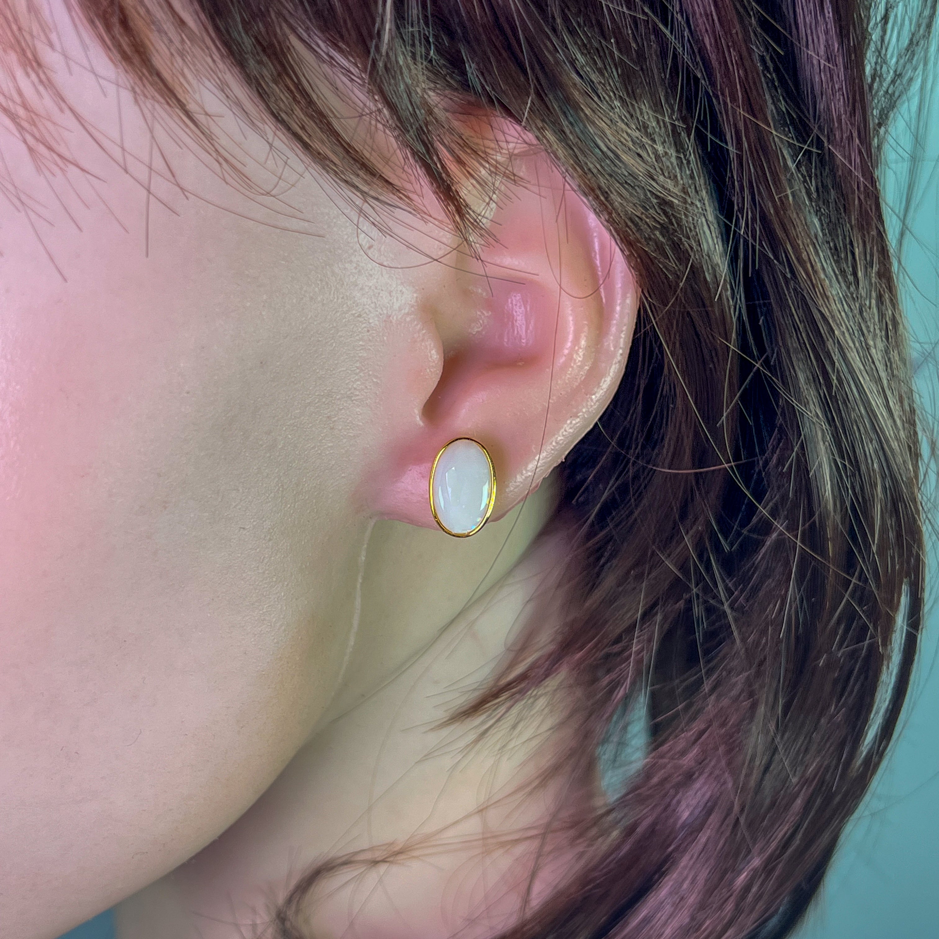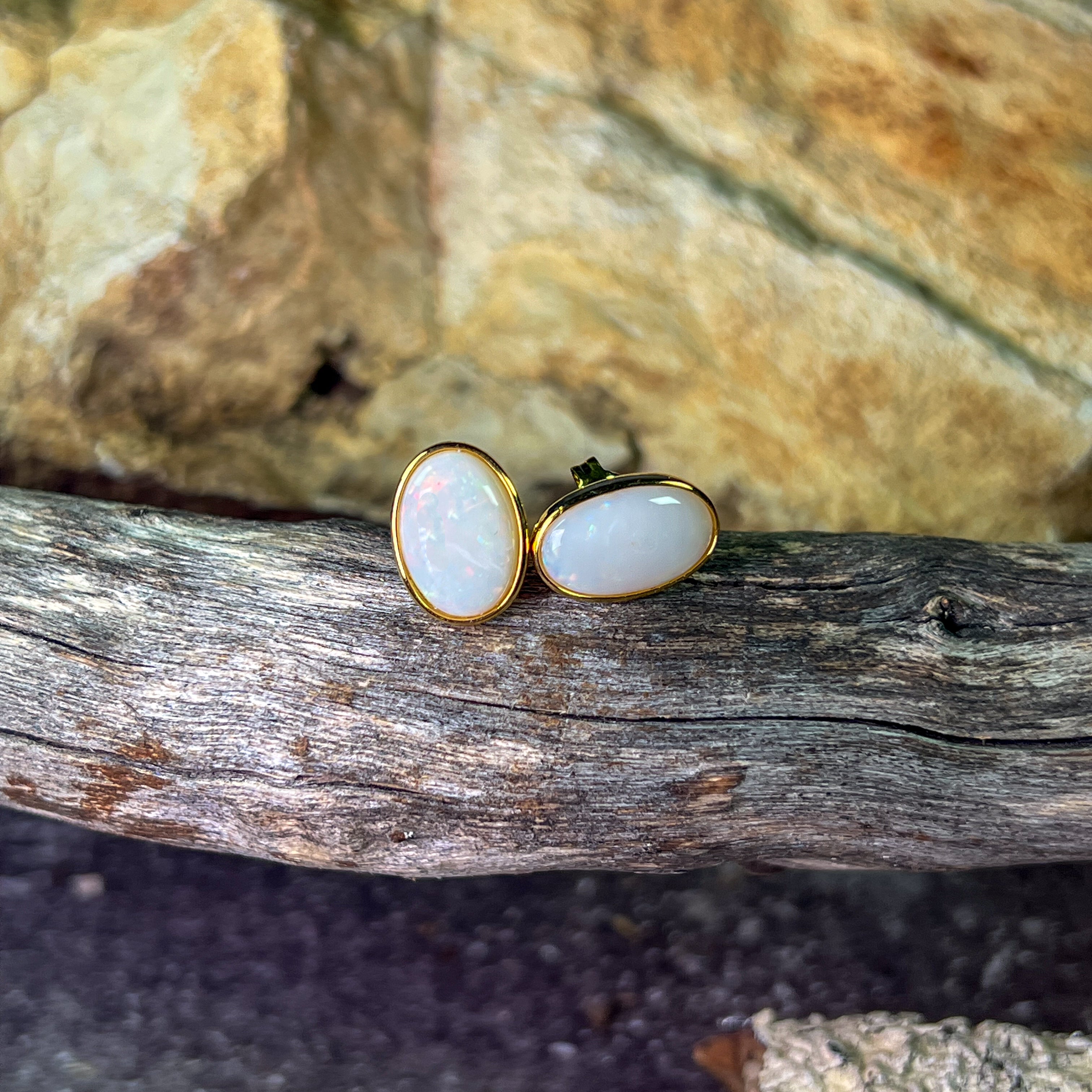 Gold Plated Sterling Silver White Opal bezel set studs 13x8mm