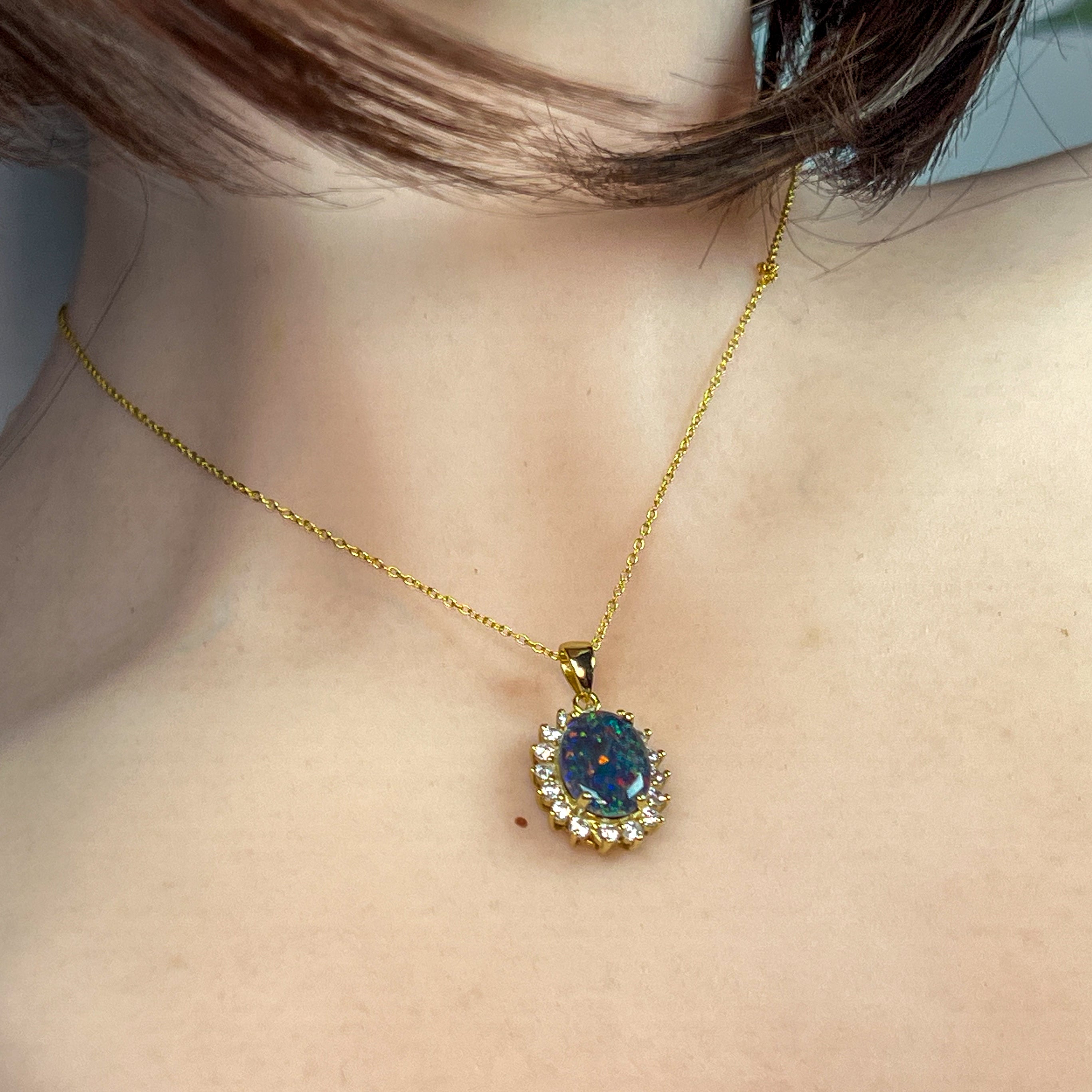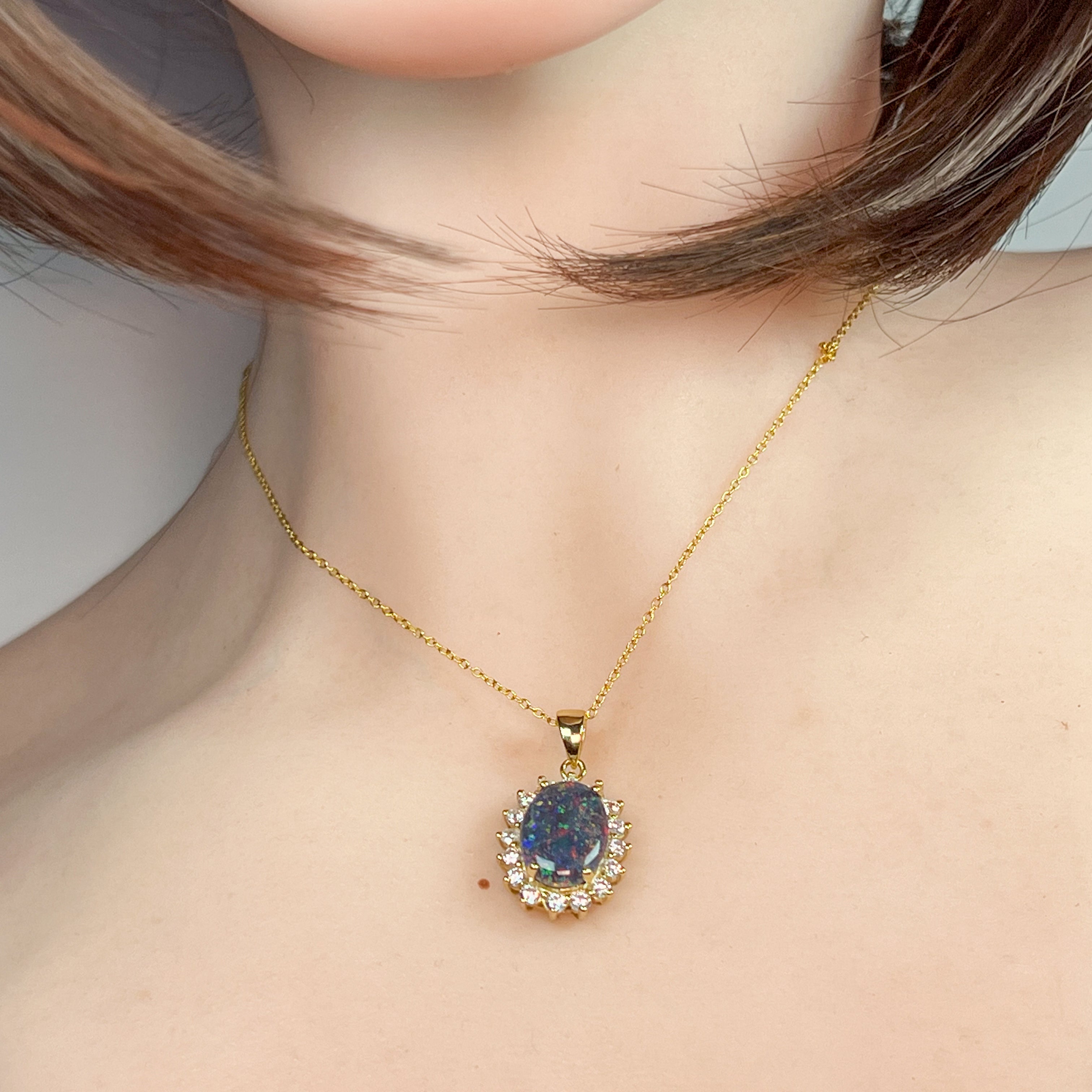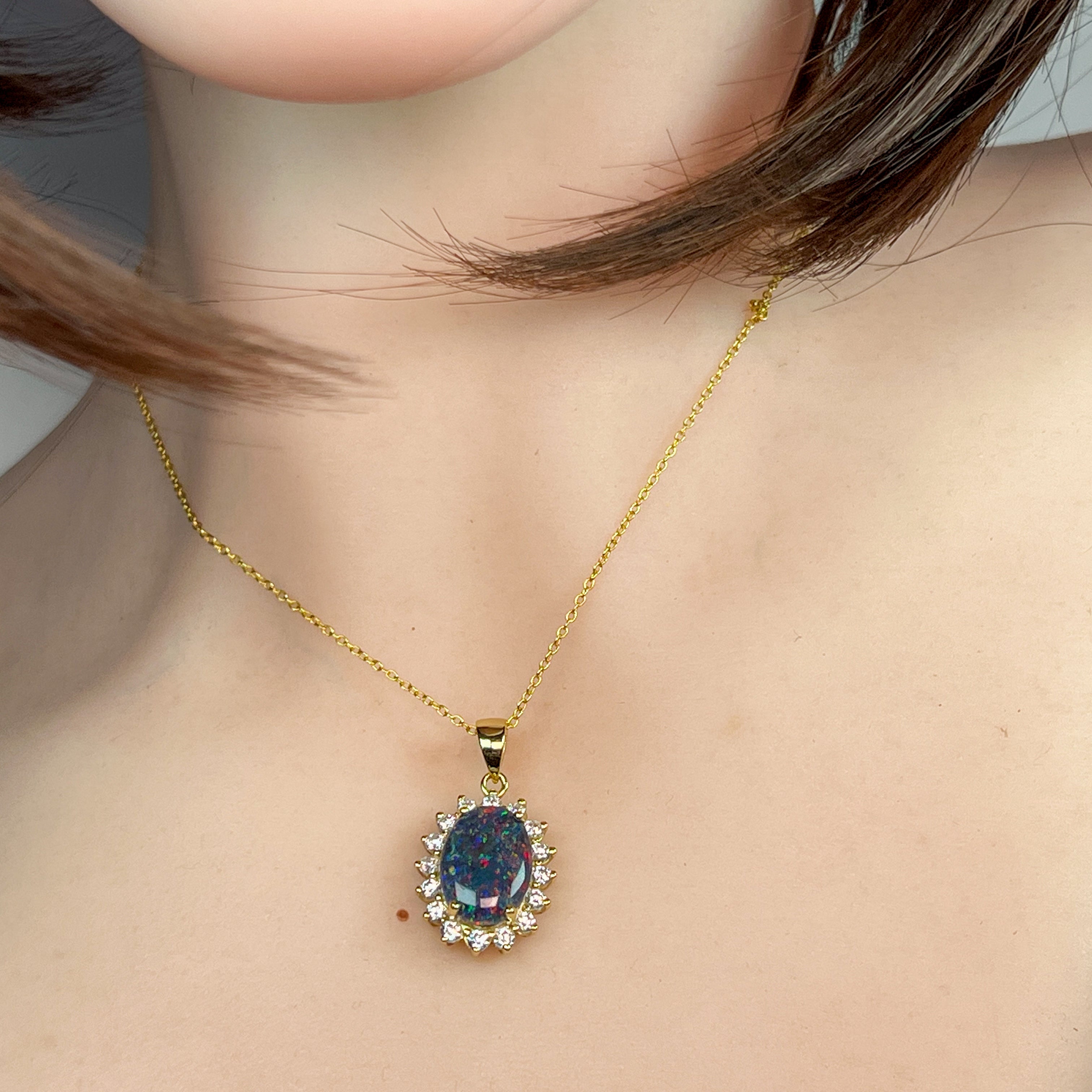 Elevate your style with this stunning gold-plated silver pendant featuring a 14x10mm opal triplet cluster. Its classic design highlights the opal’s vibrant play of colors, creating a timeless piece that adds elegance to any outfit. Perfect for special occasions or daily wear, this pendant combines sophistication with durability for lasting beauty.