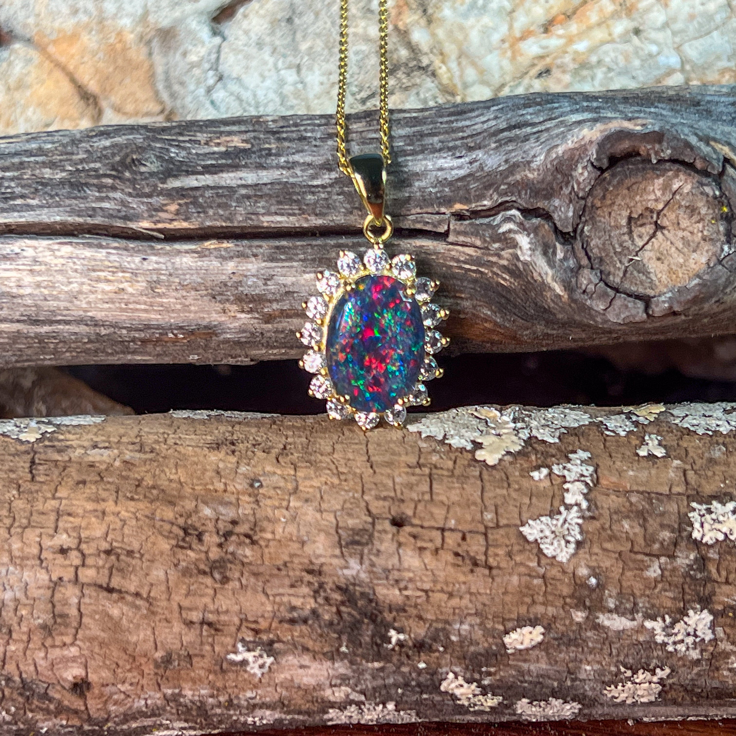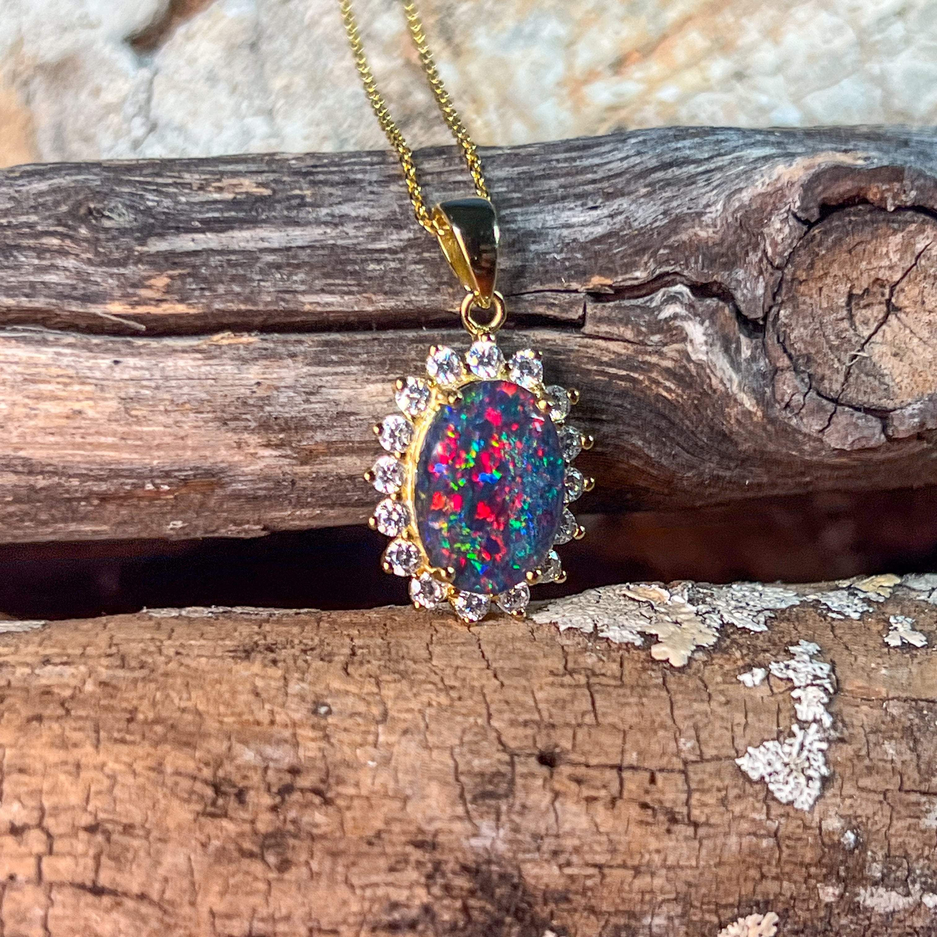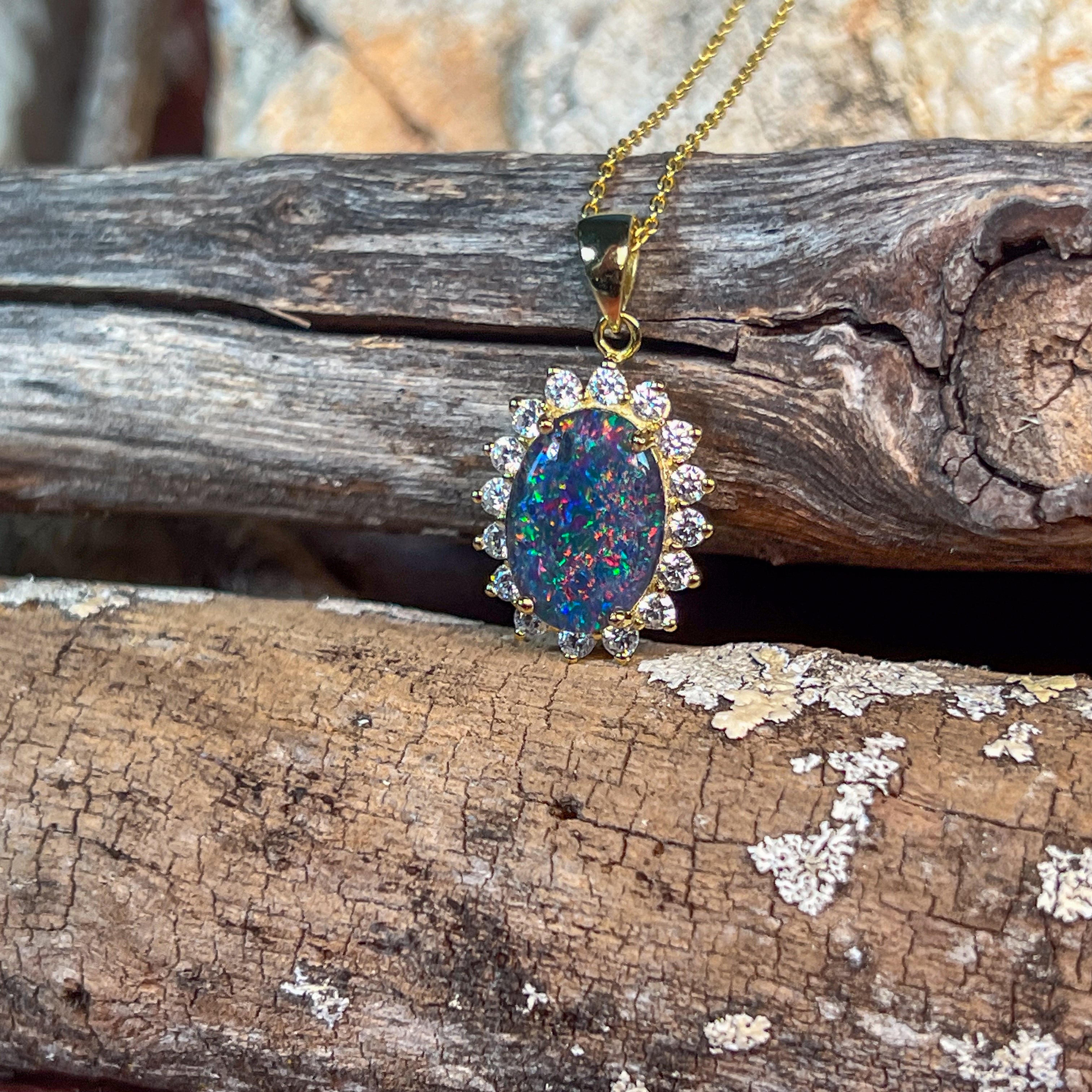 Elevate your style with this stunning gold-plated silver pendant featuring a 14x10mm opal triplet cluster. Its classic design highlights the opal’s vibrant play of colors, creating a timeless piece that adds elegance to any outfit. Perfect for special occasions or daily wear, this pendant combines sophistication with durability for lasting beauty.