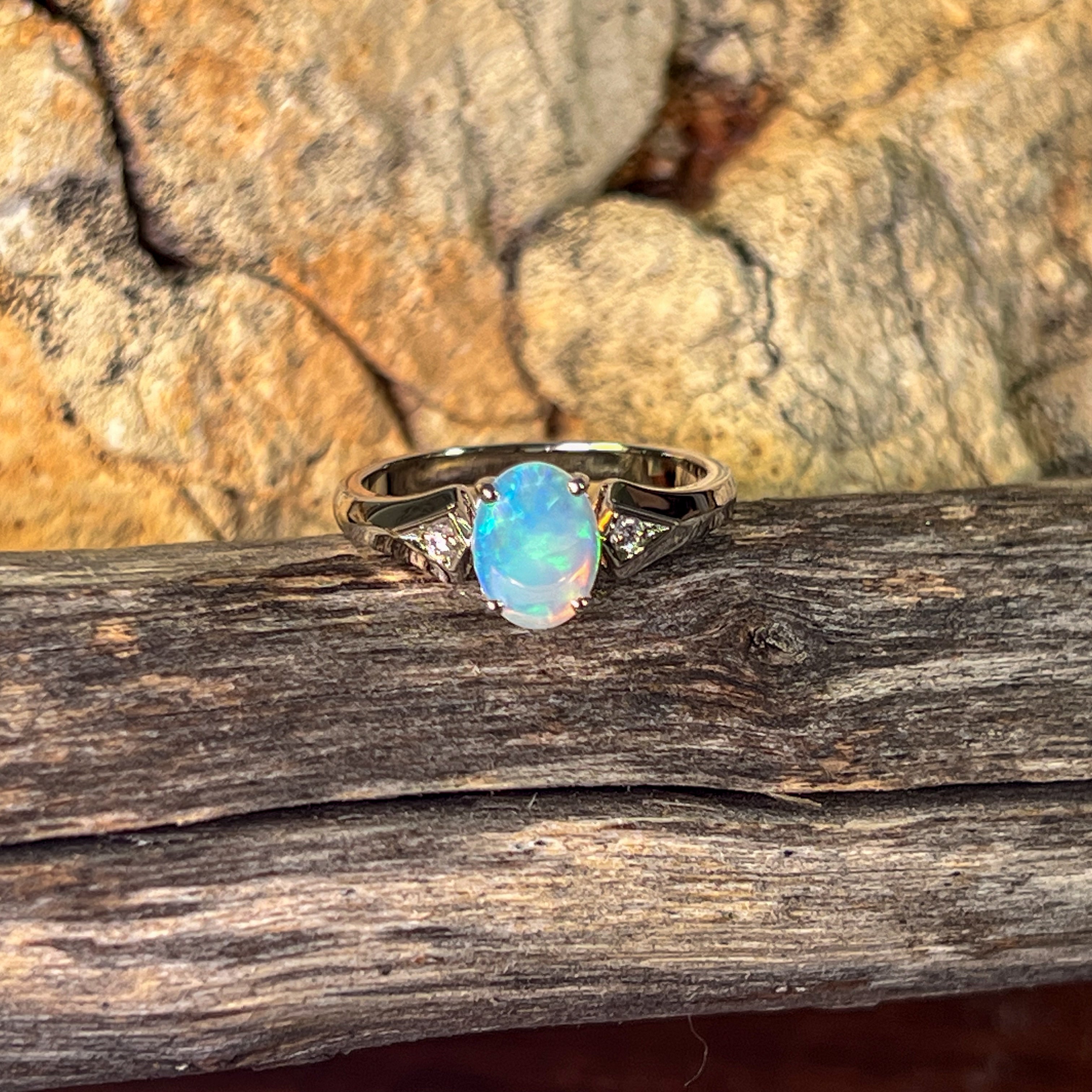 Discover the timeless elegance of our One Sterling Silver 8x6mm Light Opal and side cz ring. This modern minimalist design showcases a beautiful opal stone and sparkling cz accents, making it the perfect addition to any outfit. Elevate your style with this stunning piece that exudes sophistication and beauty.