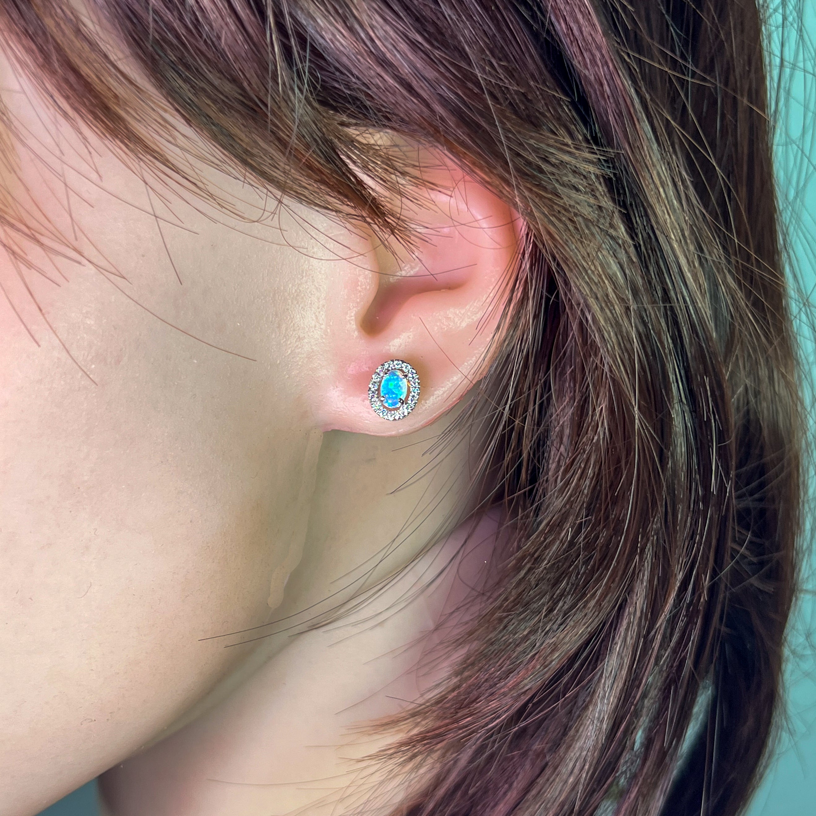 Indulge in timeless elegance with our Pair of 18kt White Gold halo Opal and diamond studs. The classic modern halo design showcases the mesmerizing opal gemstone surrounded by sparkling diamonds. Elevate any outfit and make a sophisticated statement with these luxurious earrings.