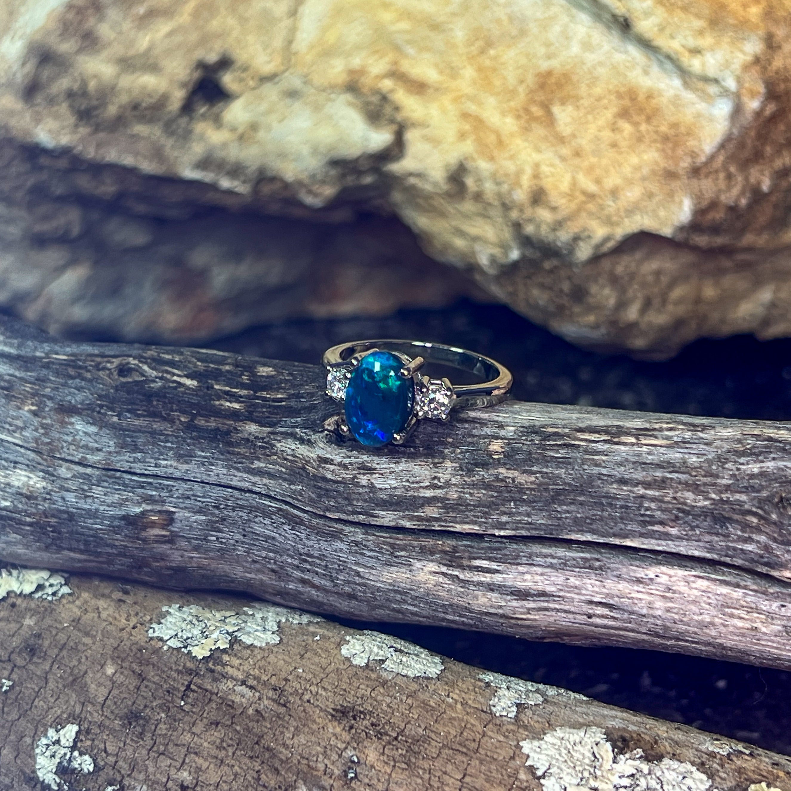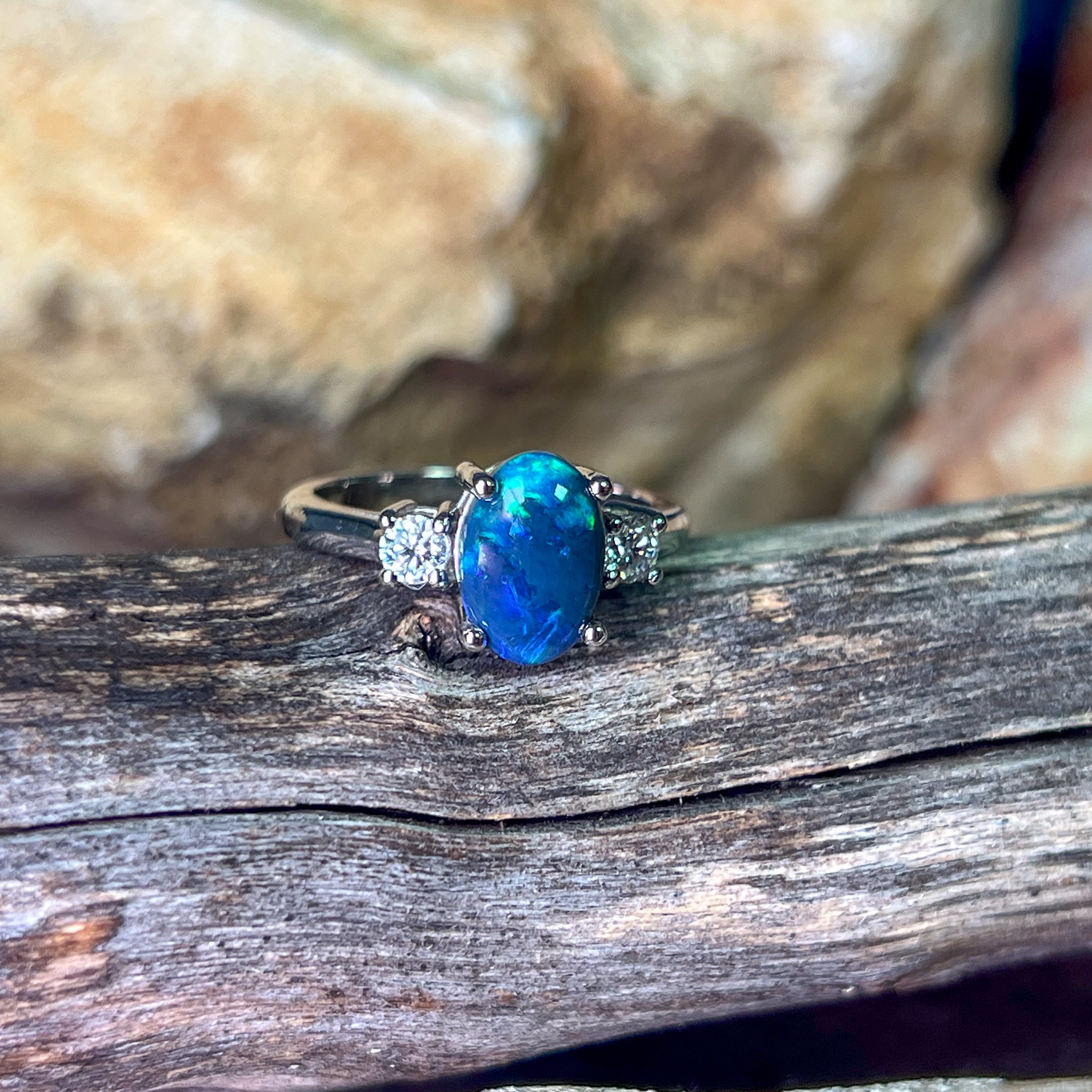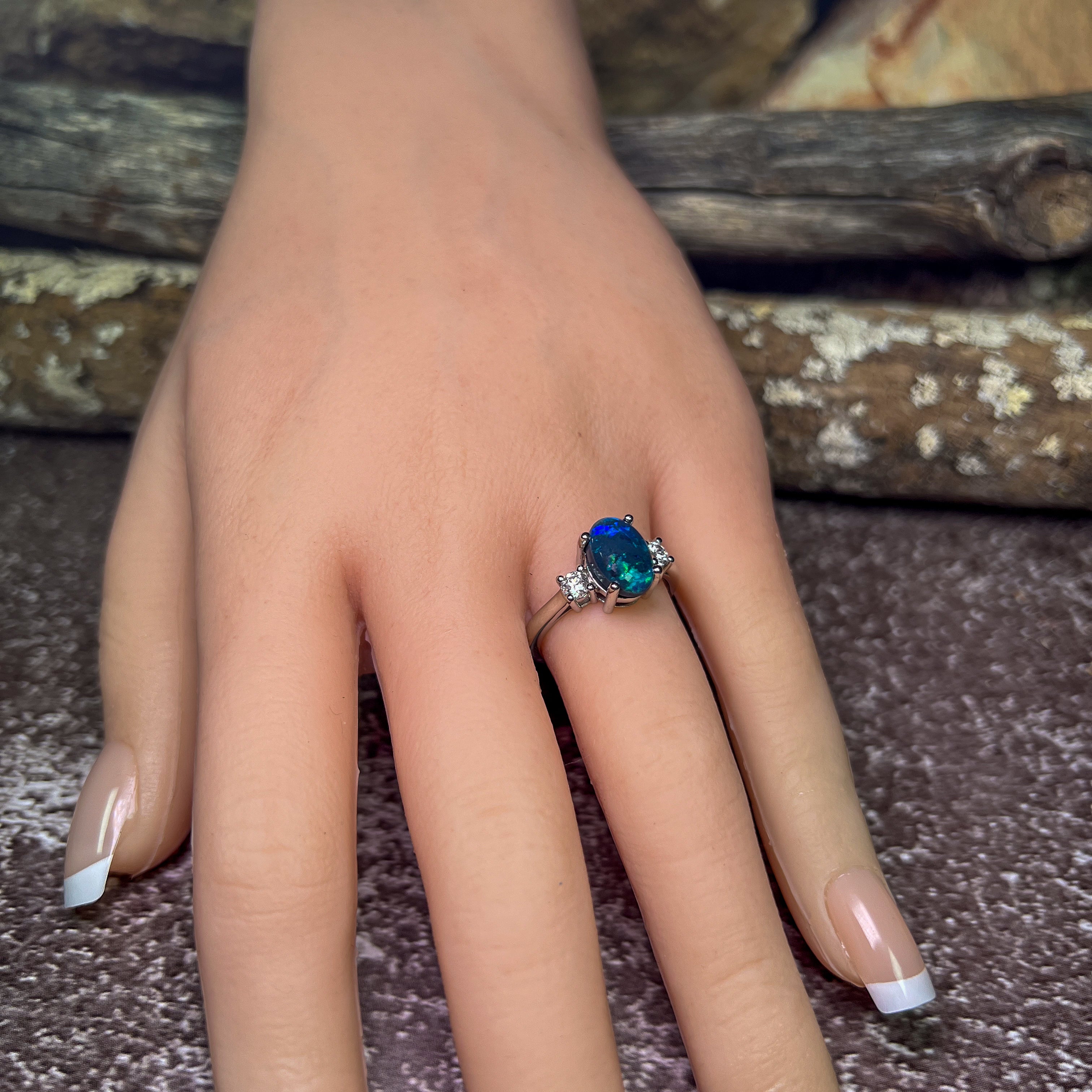 Experience the luxury and opulence of our Platinum Black Opal and Diamond trilogy ring. Featuring a stunning deep ocean Blue opal, this trilogy design will take your breath away. Elevate your engagement with a touch of elegance.