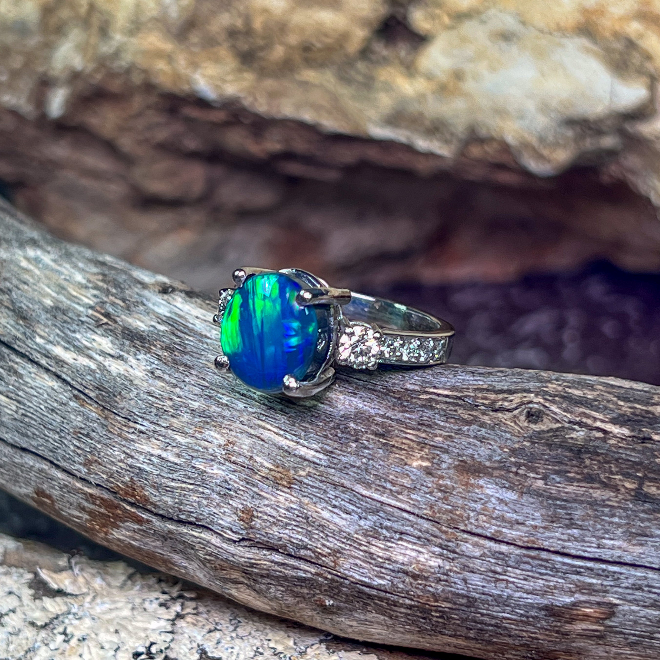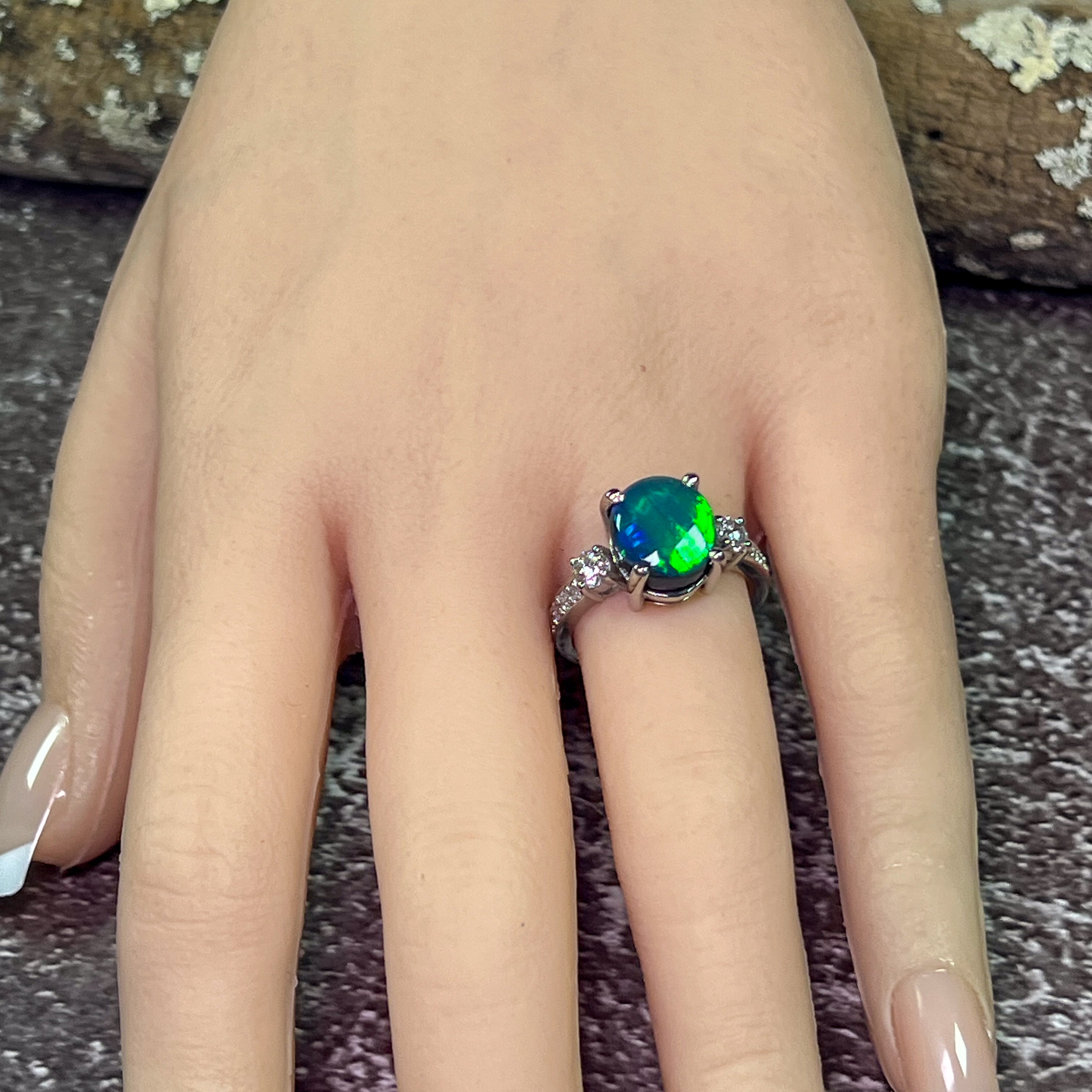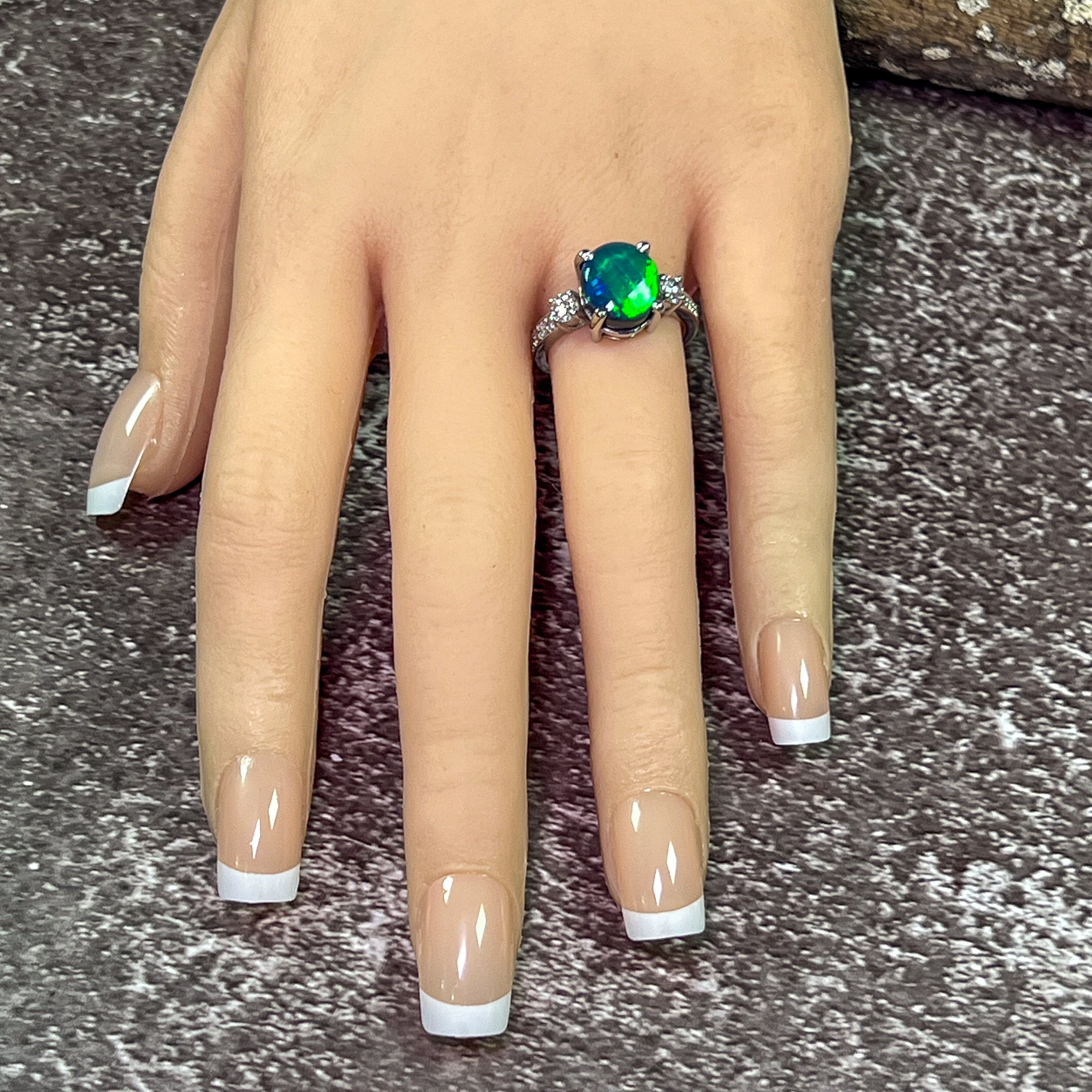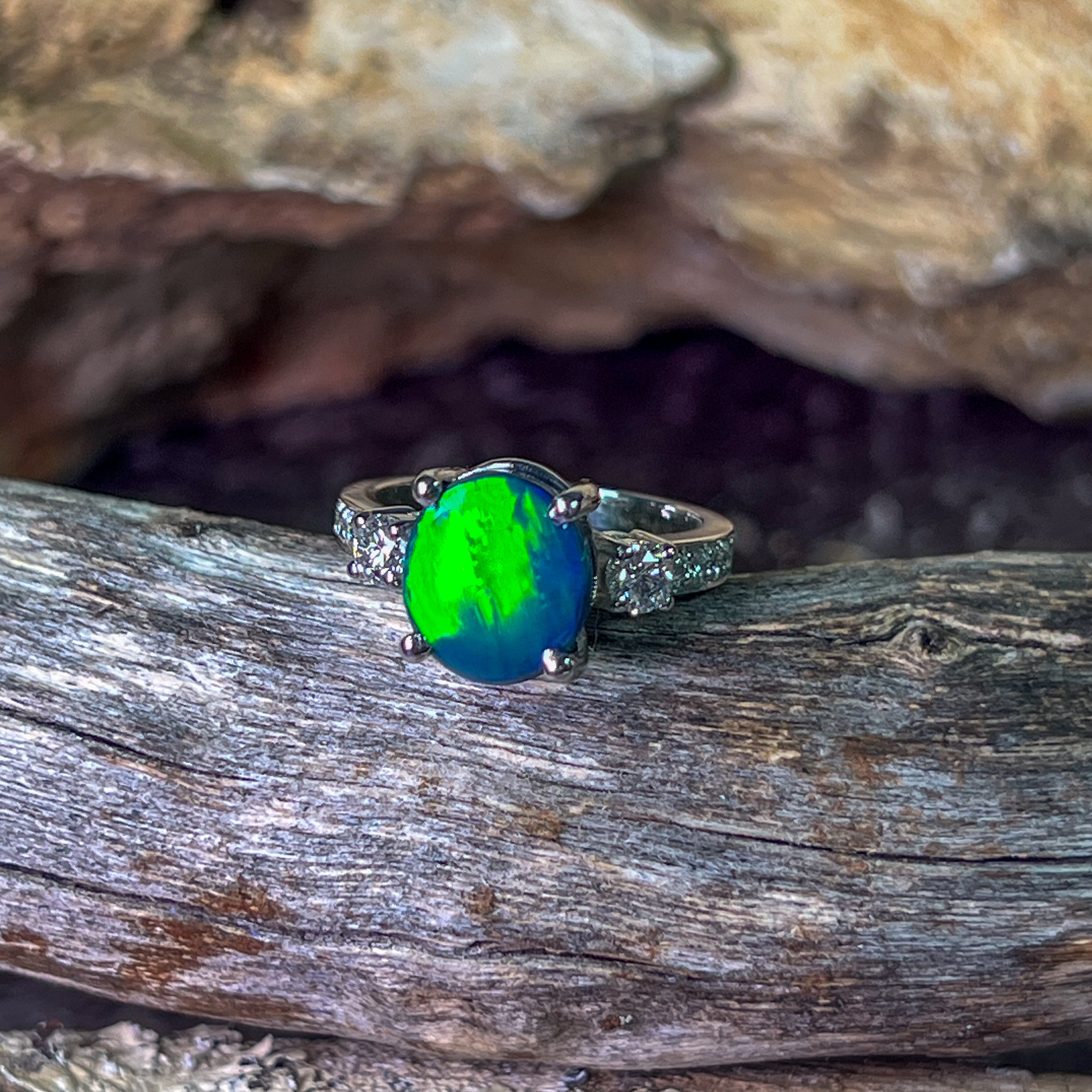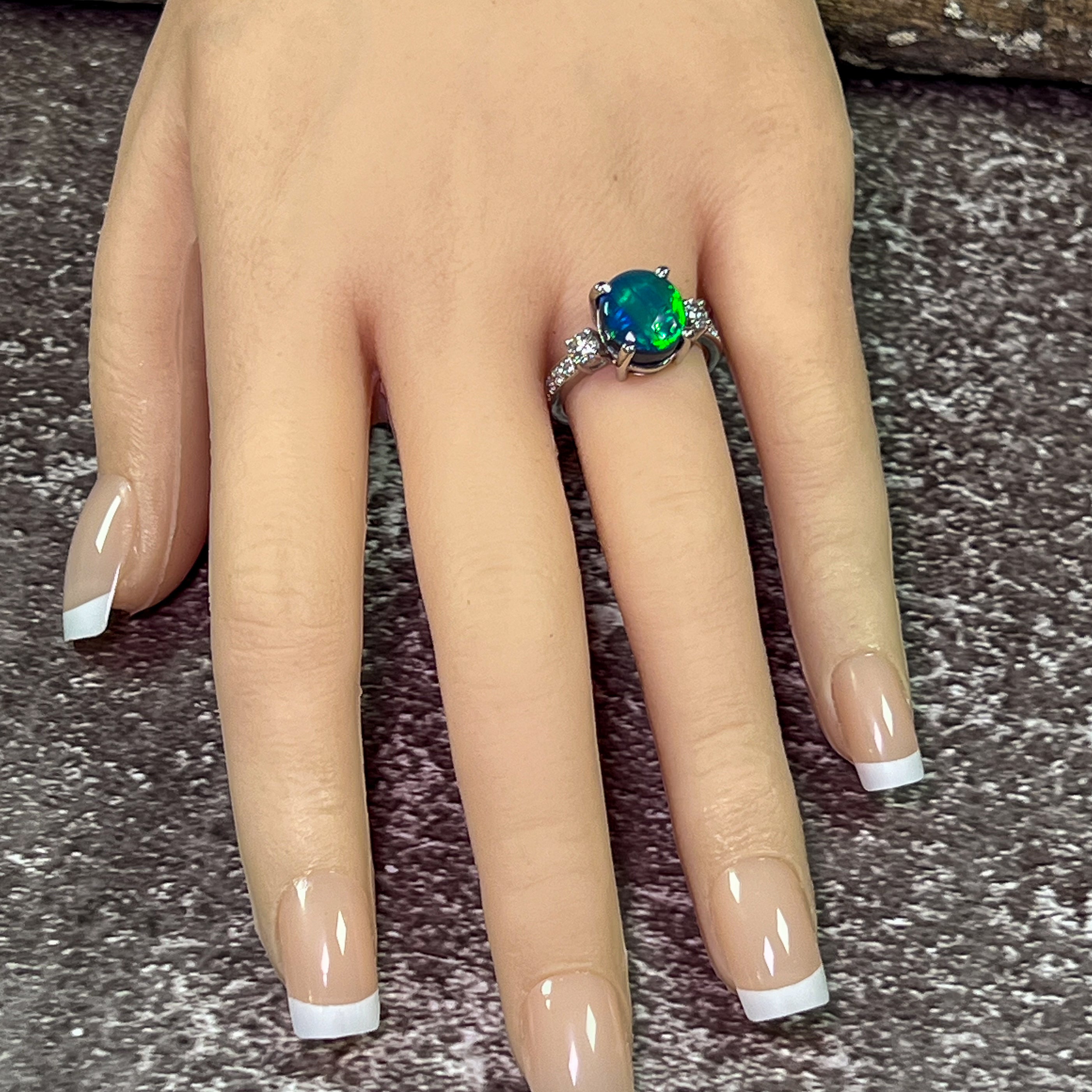 Indulge in luxury with our Platinum Black Opal green flash and diamond ring. With its strong green flash and thick Black Opal stone, this statement ring is the epitome of elegance. Add a touch of sophistication to any outfit with this exclusive piece.