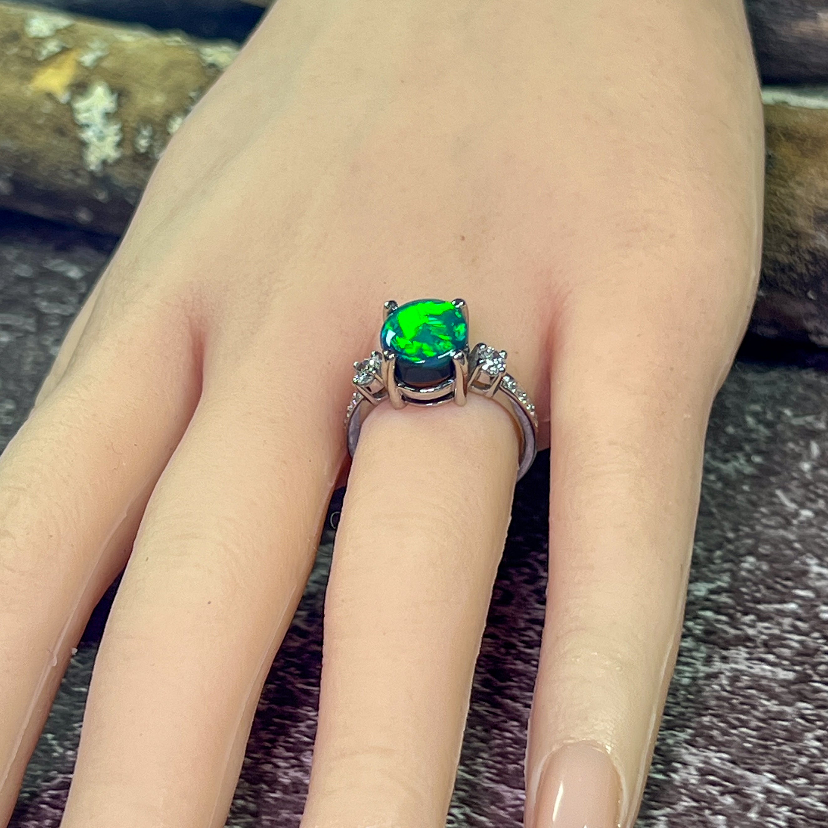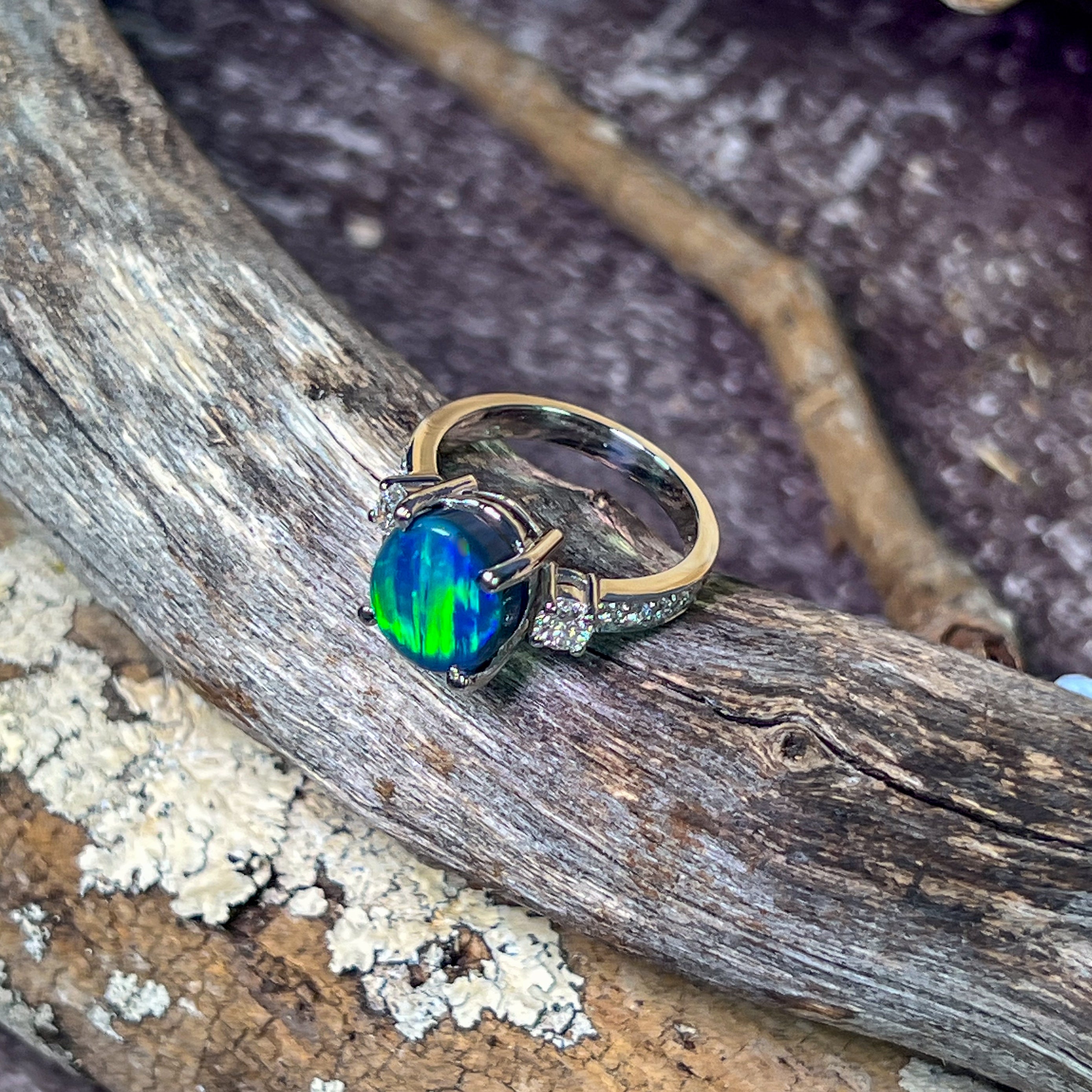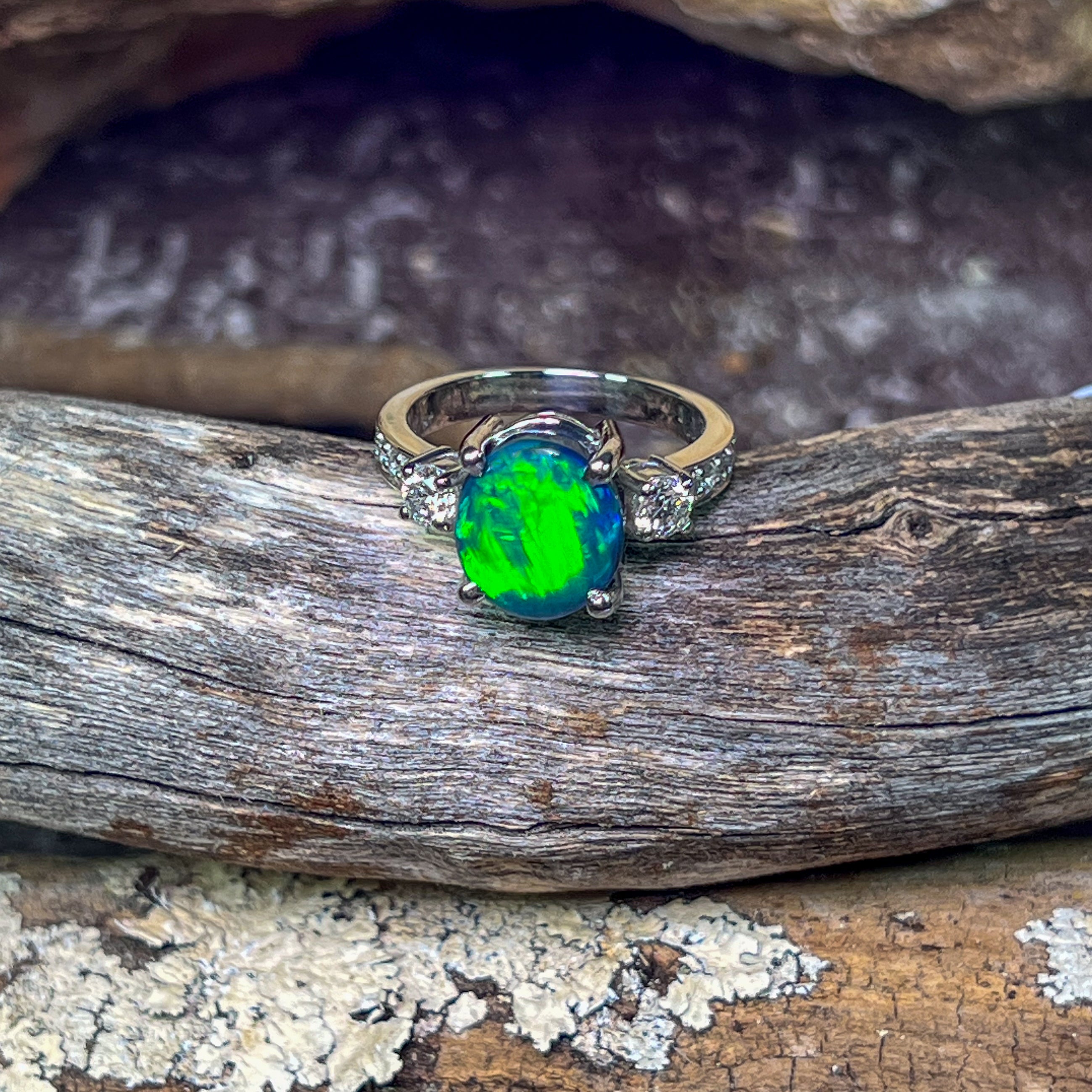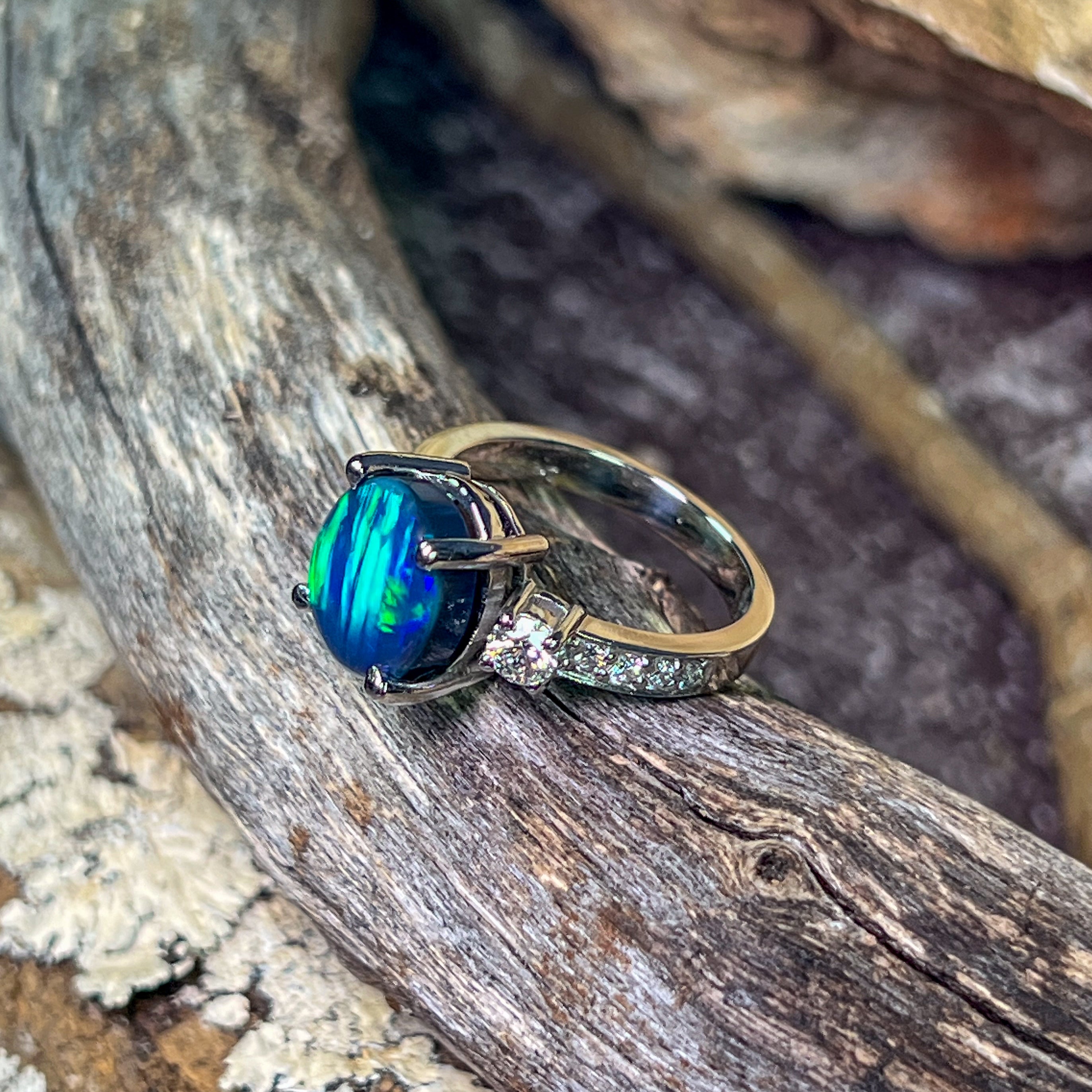 Indulge in luxury with our Platinum Black Opal green flash and diamond ring. With its strong green flash and thick Black Opal stone, this statement ring is the epitome of elegance. Add a touch of sophistication to any outfit with this exclusive piece.