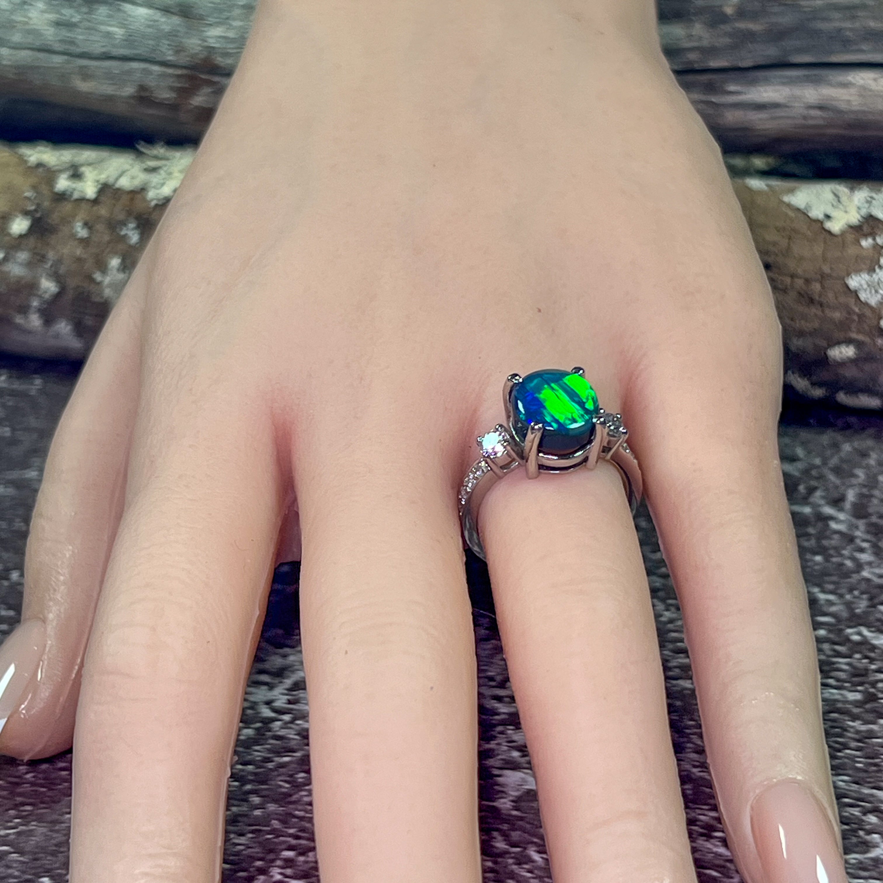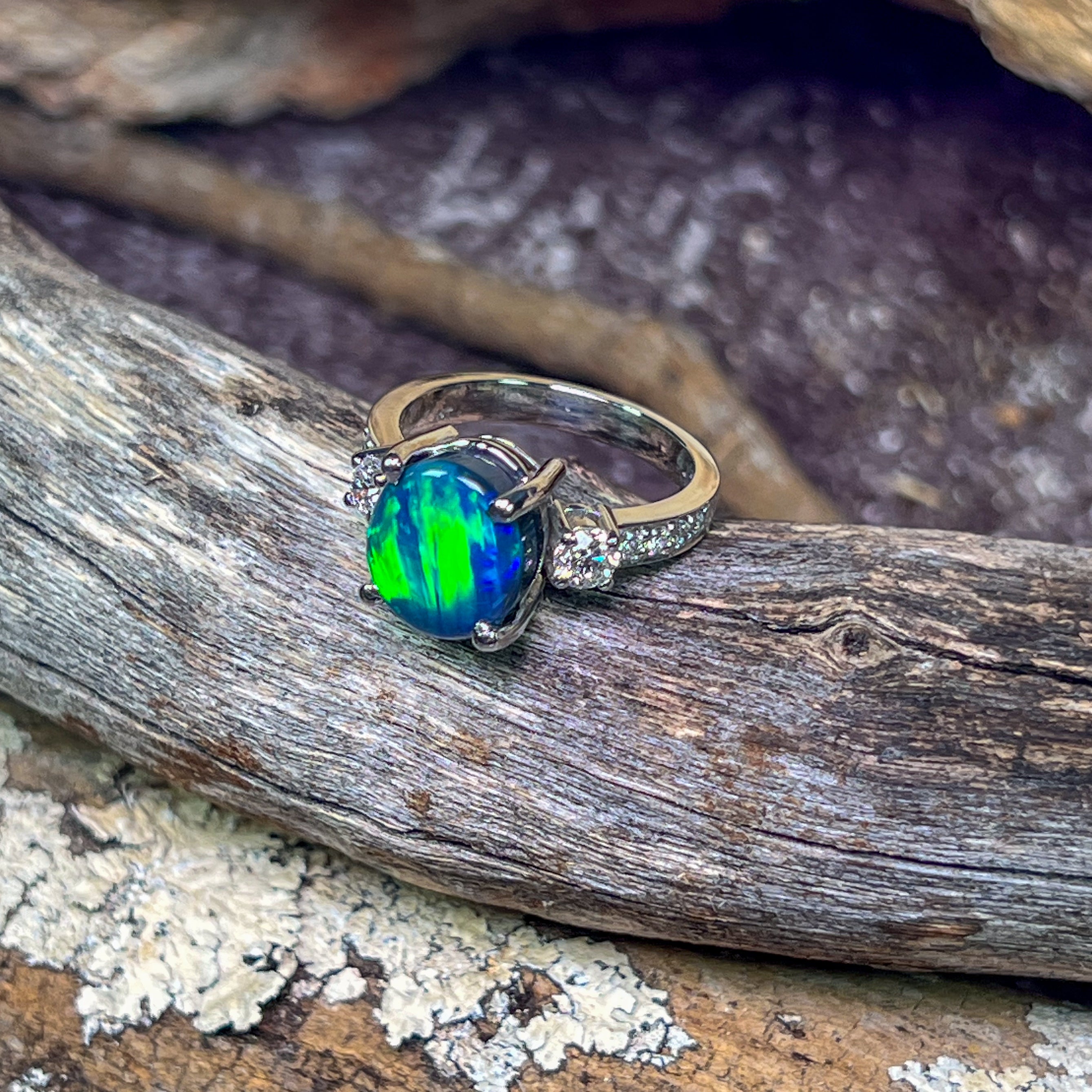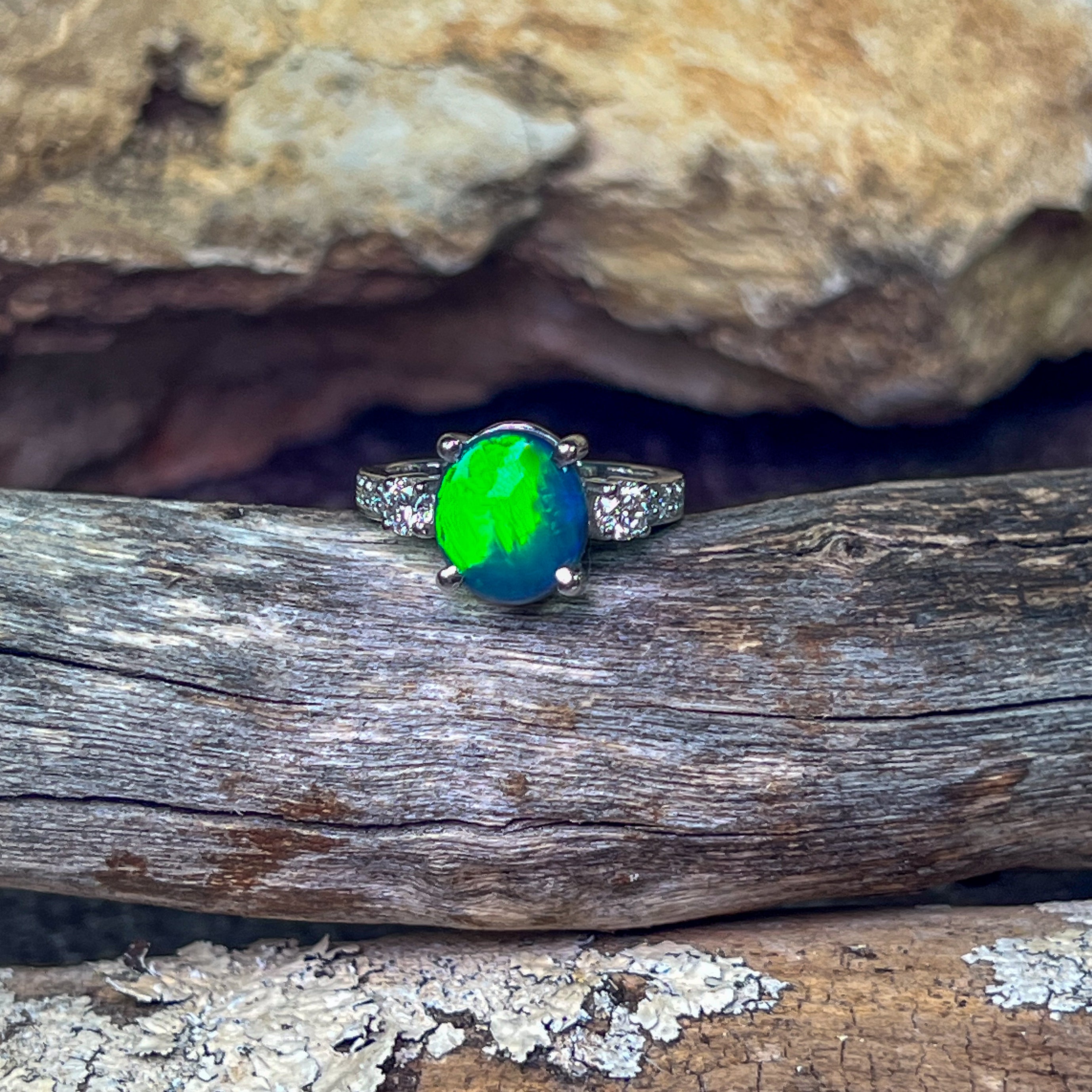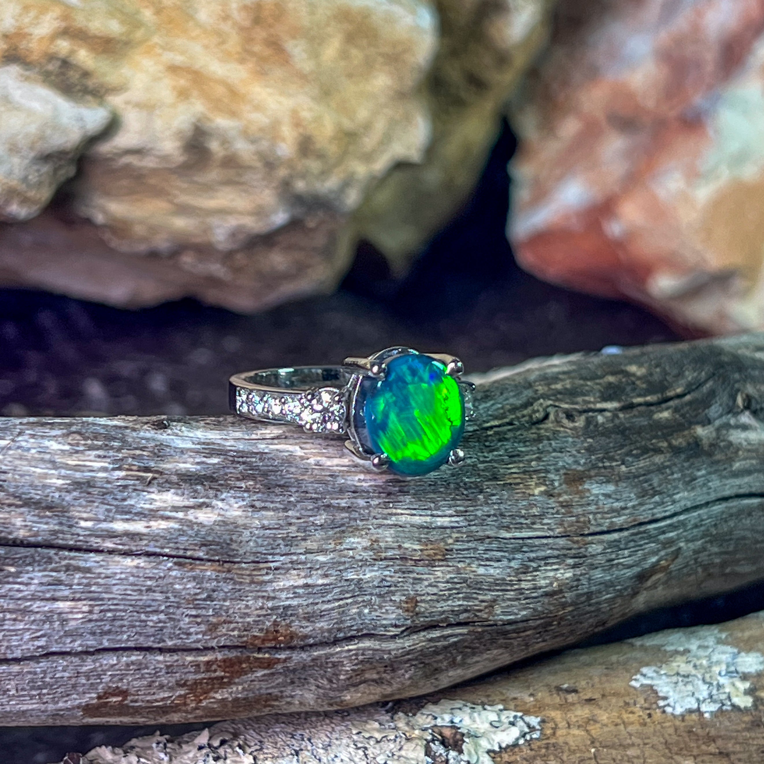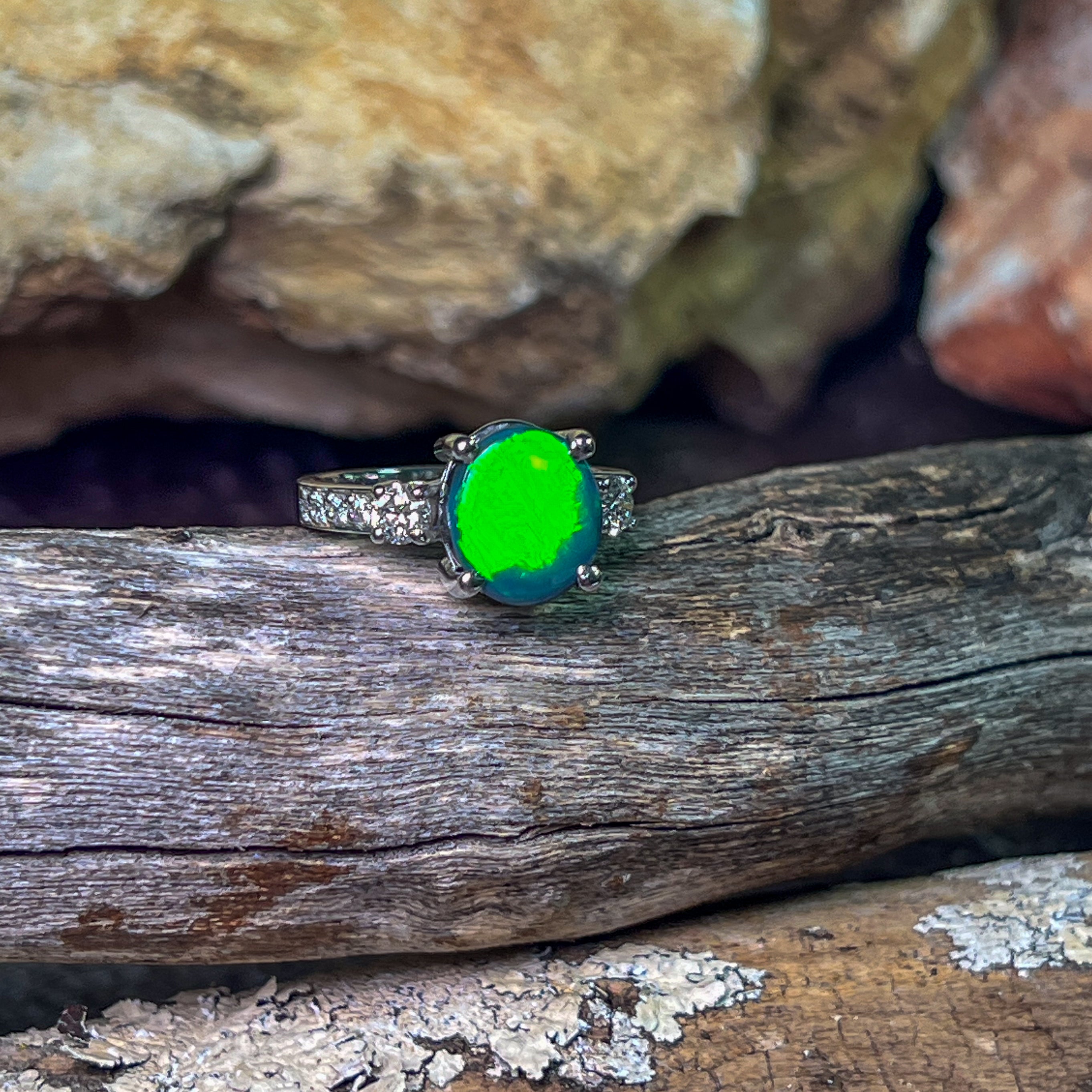 Indulge in luxury with our Platinum Black Opal green flash and diamond ring. With its strong green flash and thick Black Opal stone, this statement ring is the epitome of elegance. Add a touch of sophistication to any outfit with this exclusive piece.