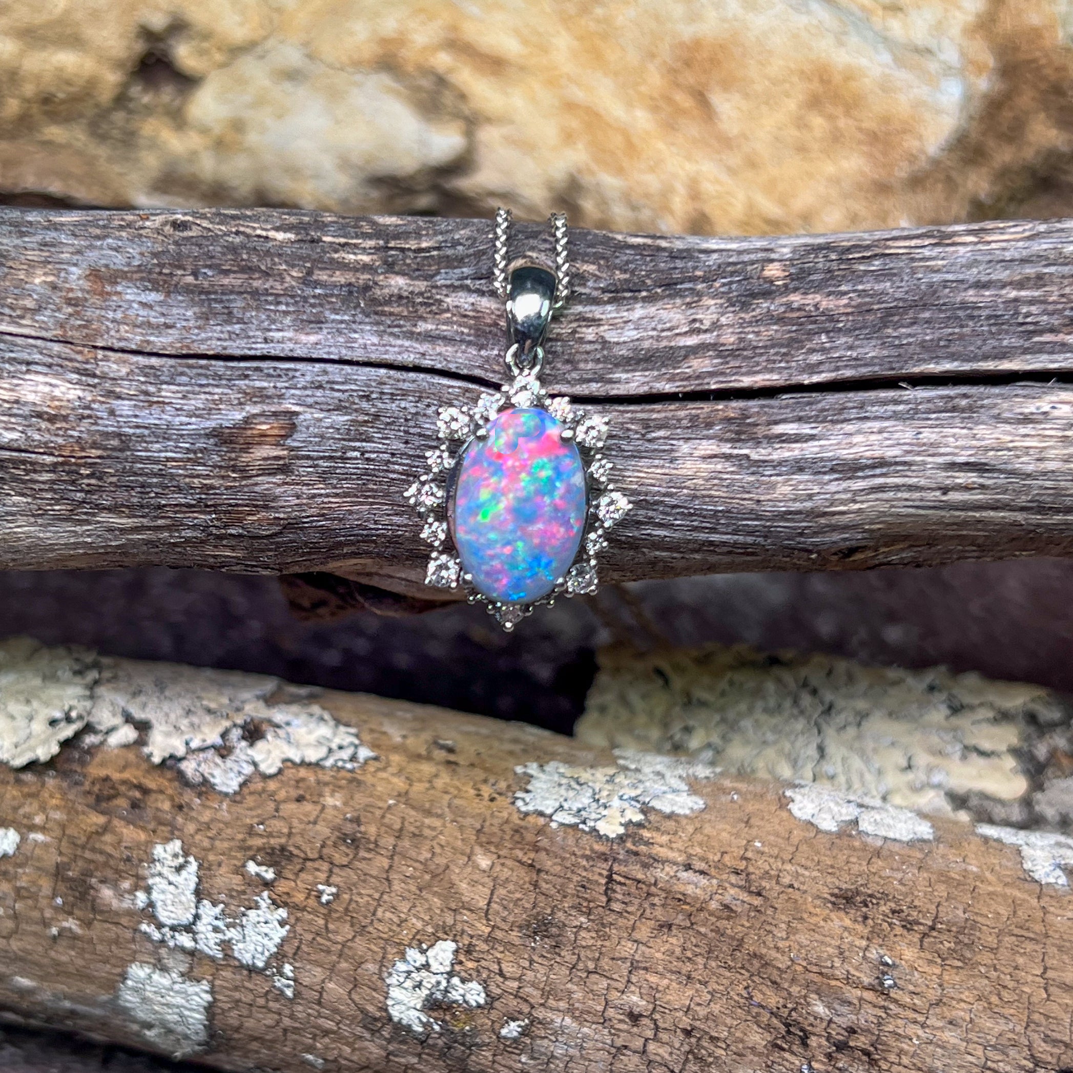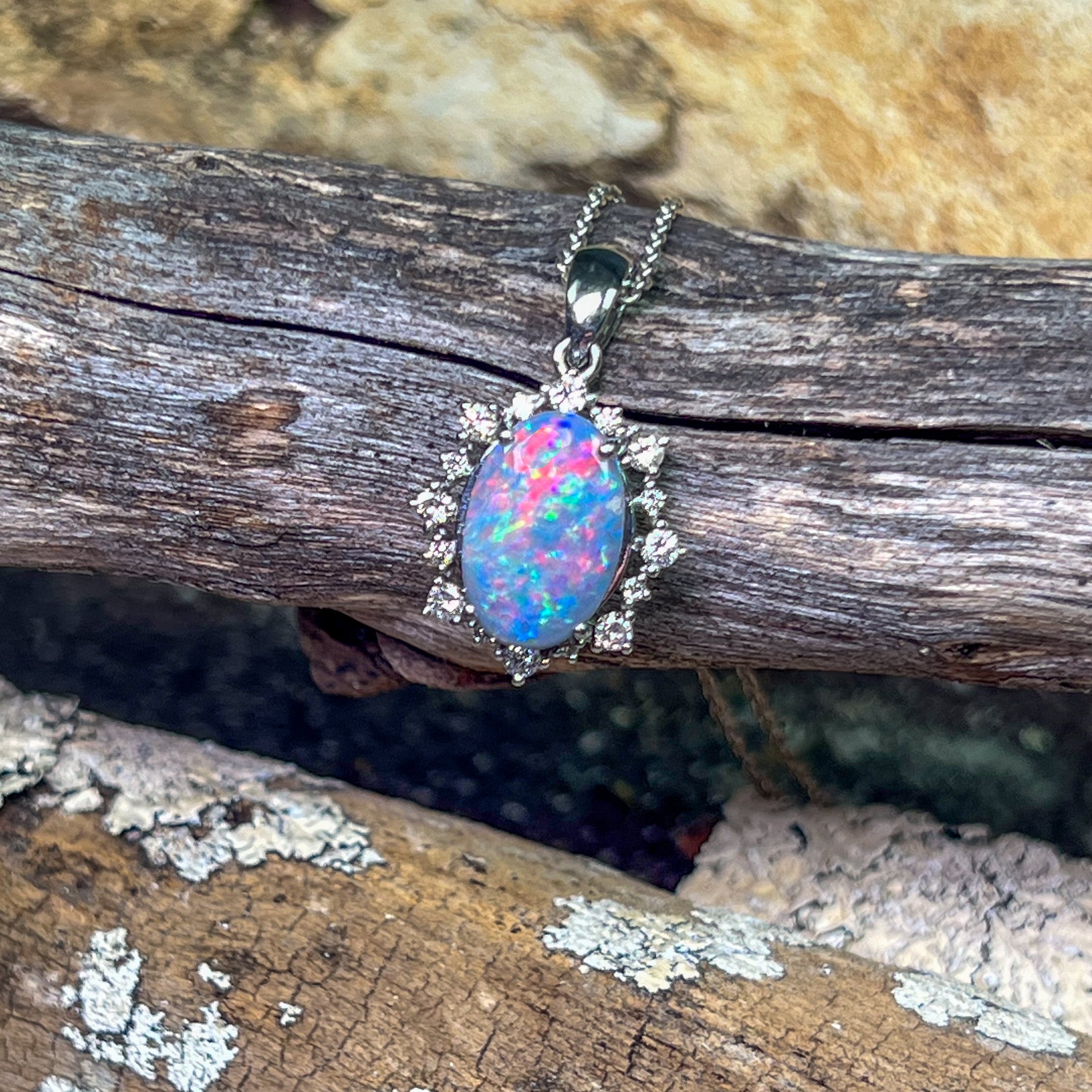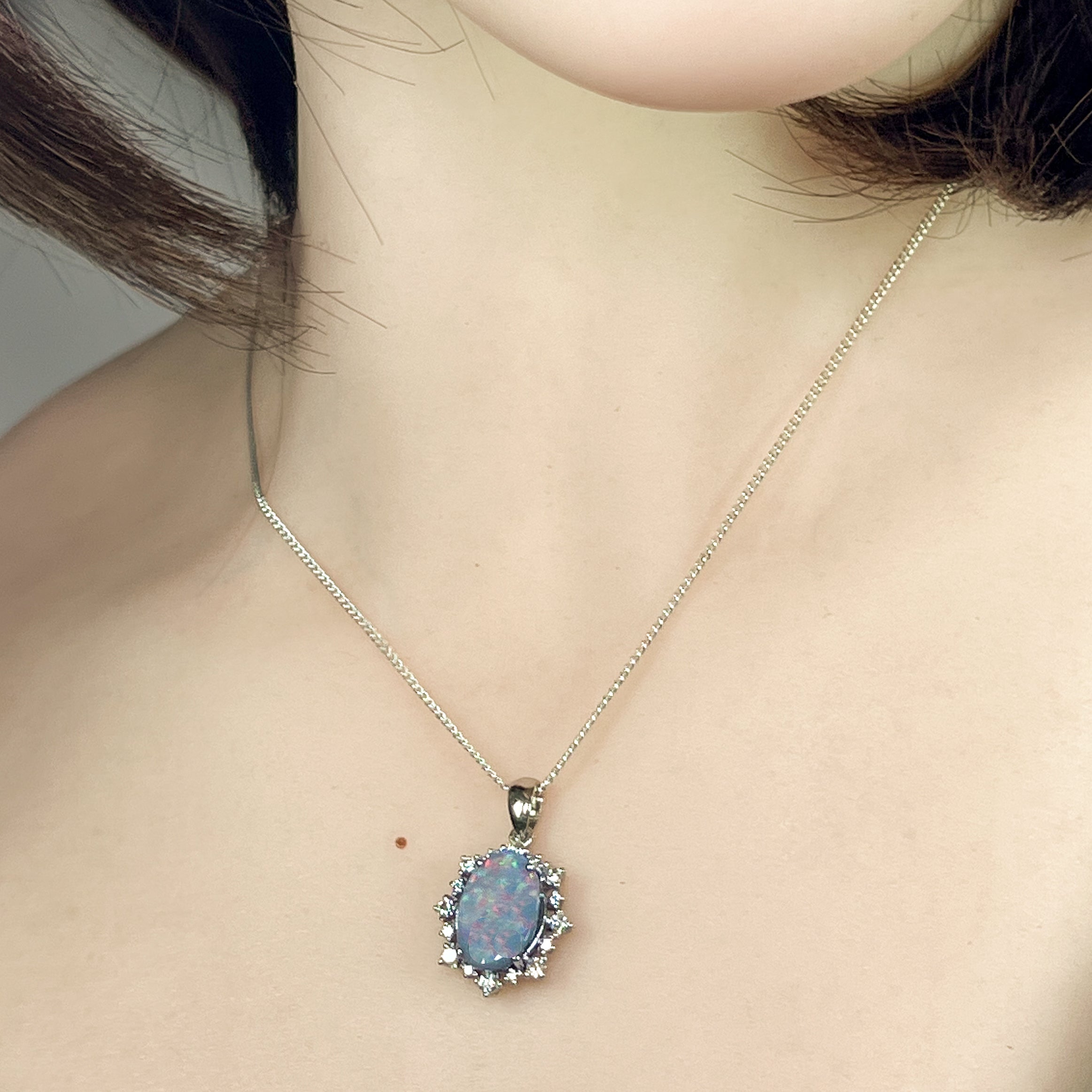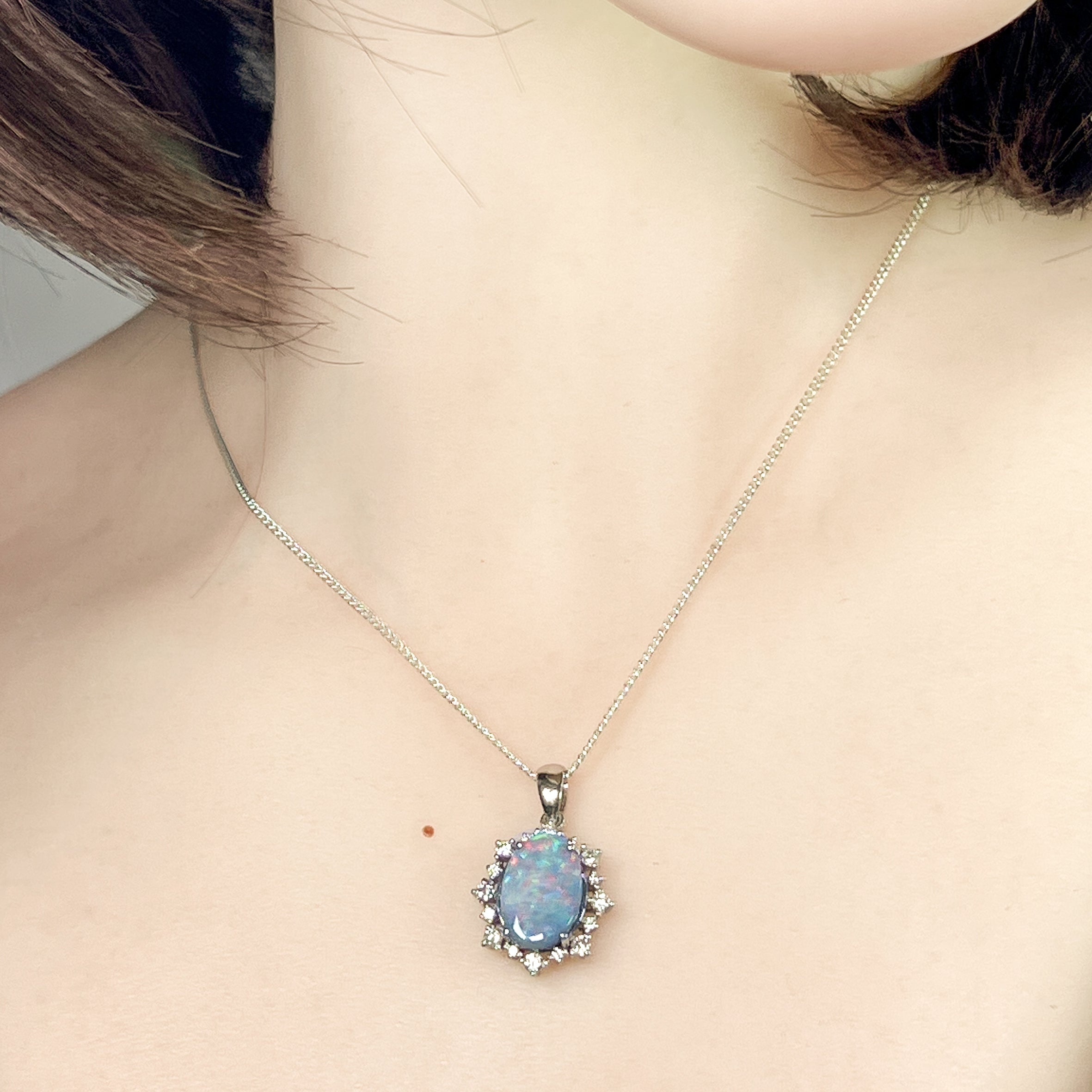 Indulge in the beauty of the Black Opal fine jewellery set in our Platinum Halo pendant. The mesmerizing opalescent hues, coupled with radiant diamonds, make for a luxurious piece that exudes sophistication. Elevate any outfit with this exclusive and timeless accessory.